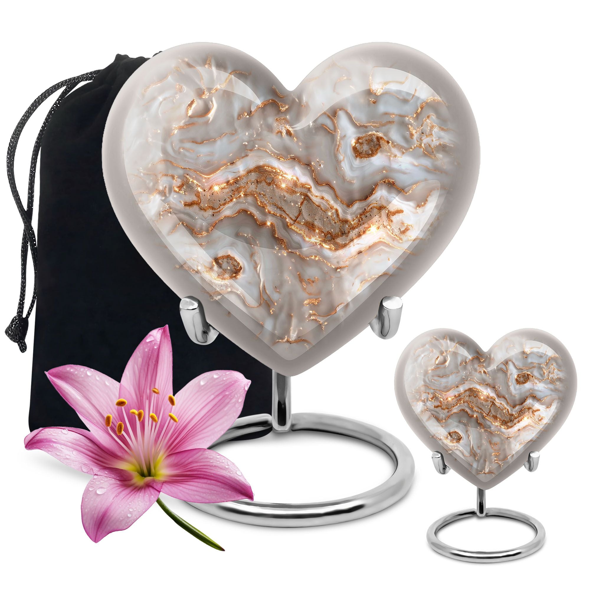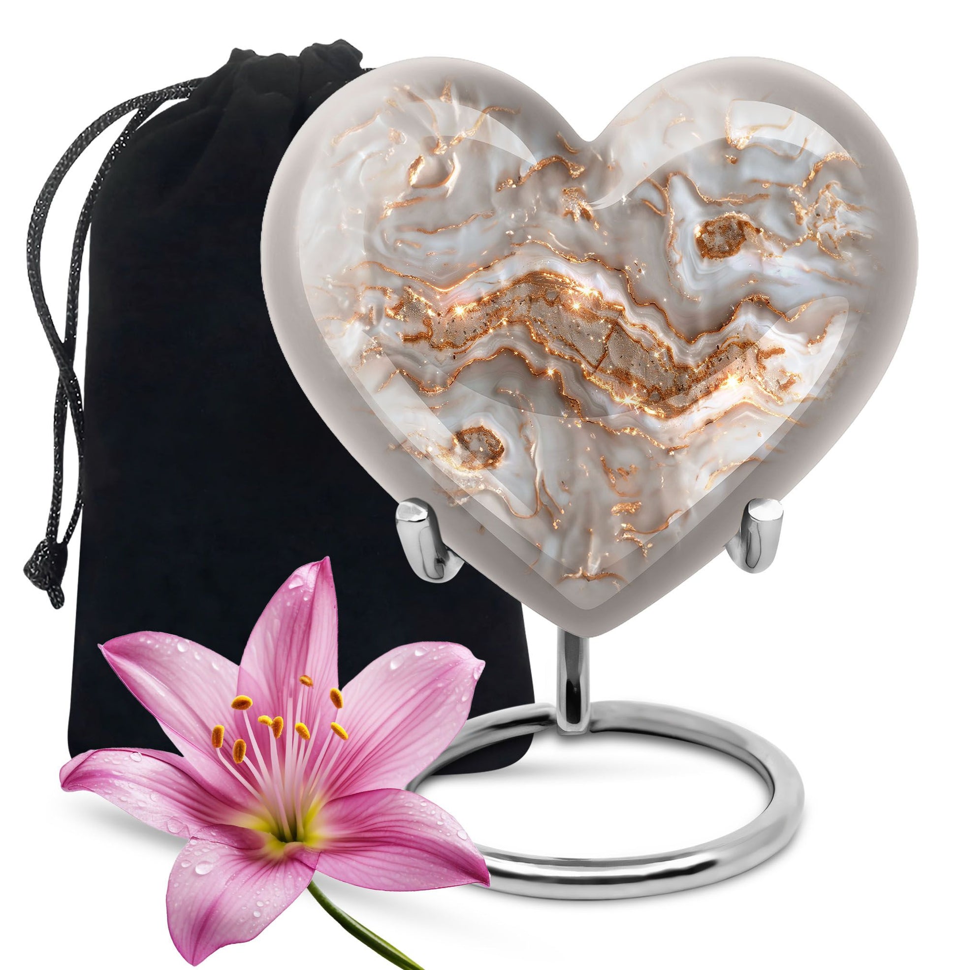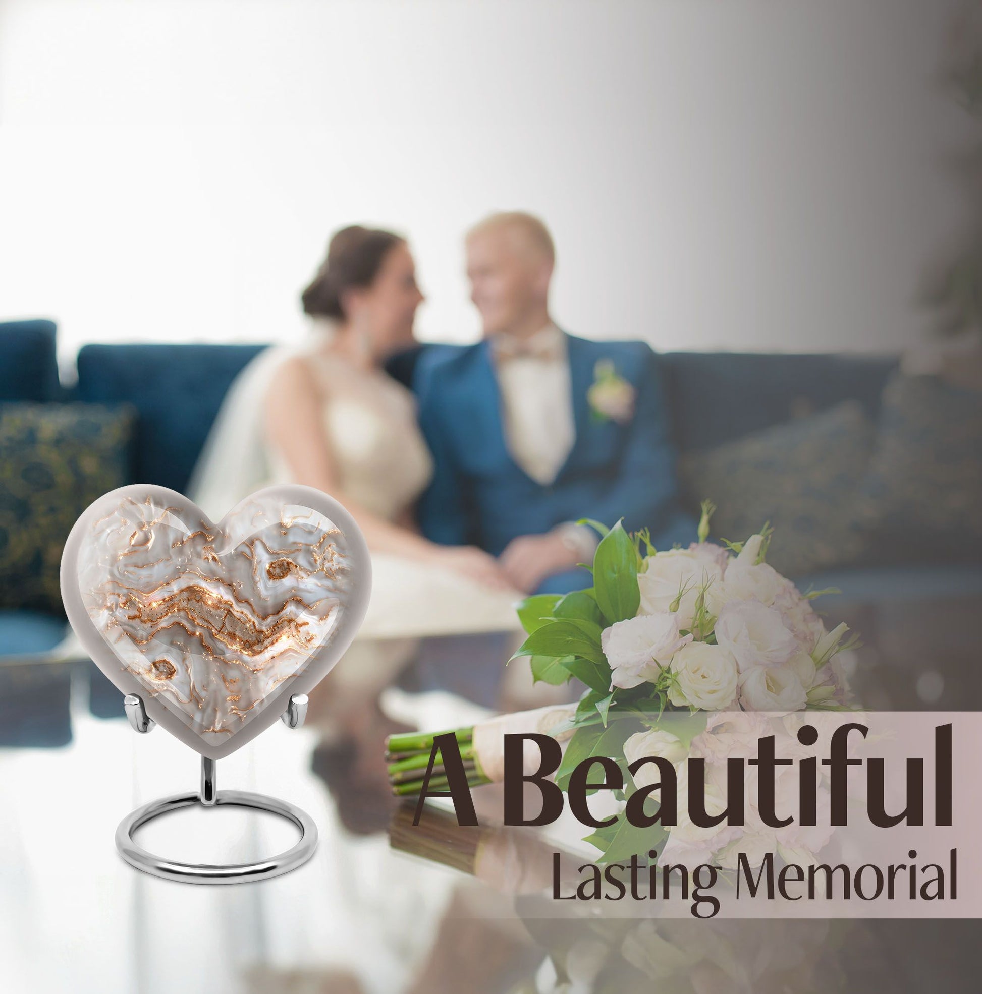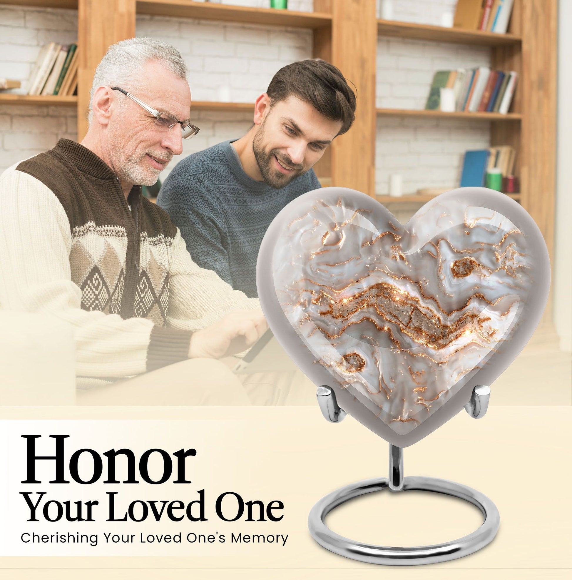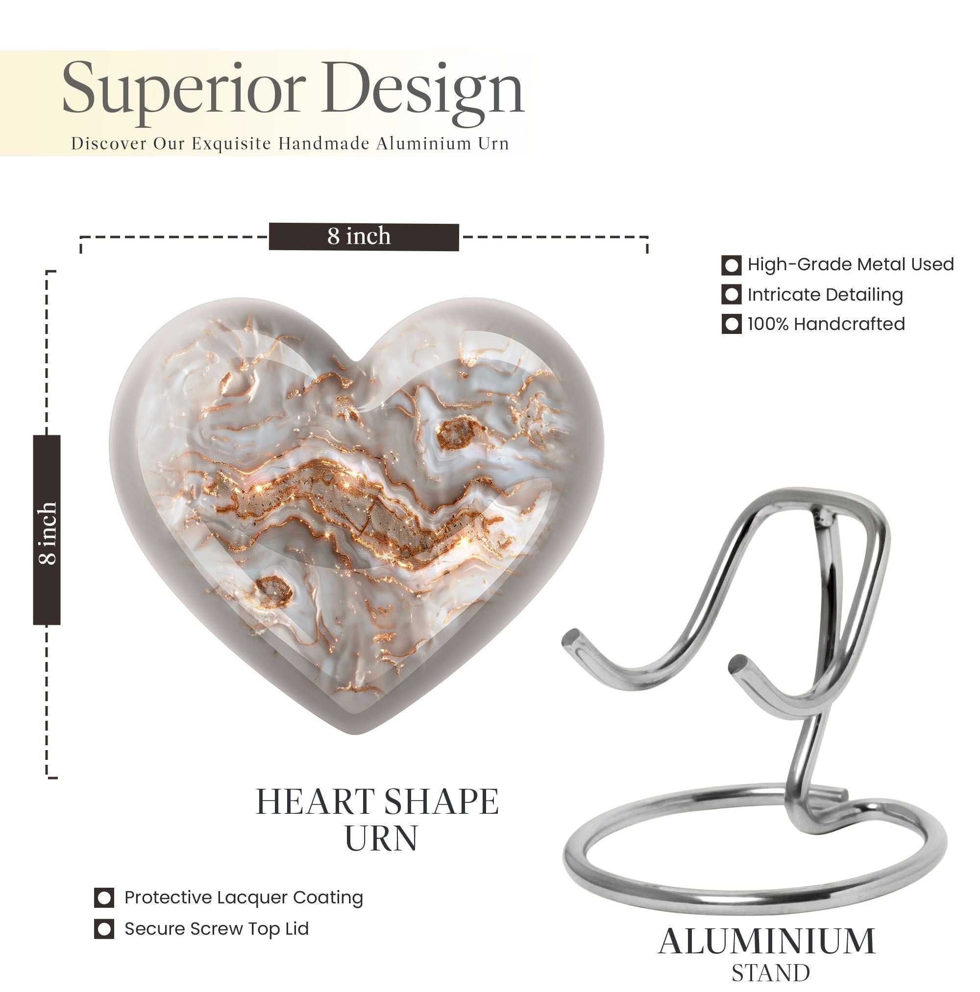 Enshrine your loved ones with an ethereal final resting place with this Colourful Swirl Urn. Crafted meticulously from fine-quality aluminum, this large urn for adult men conveys a sense of comforting warmth with its abstract theme heart urn design. This cremation dad urn measures 10 inches in height, fitting perfectly into its weight bracket of a moderate 3.3 pounds. It boasts a commendable capacity to hold up to 200 cubic inches of ashes, ample space to serve its purpose seamlessly. The urn also offers a personal touch with an option to customize with engraved names, truly making it a dedicated memorial. The urn arrives with a commodious velvet pouch for containment of ashes. This human urn amalgamates affordability and inherent respect, transcending the usual constraints of memorial urns. With its iridescent metal sheen, the visualization of the urn echoes a beautifully poignant celebration of life and love, eternally sustained.