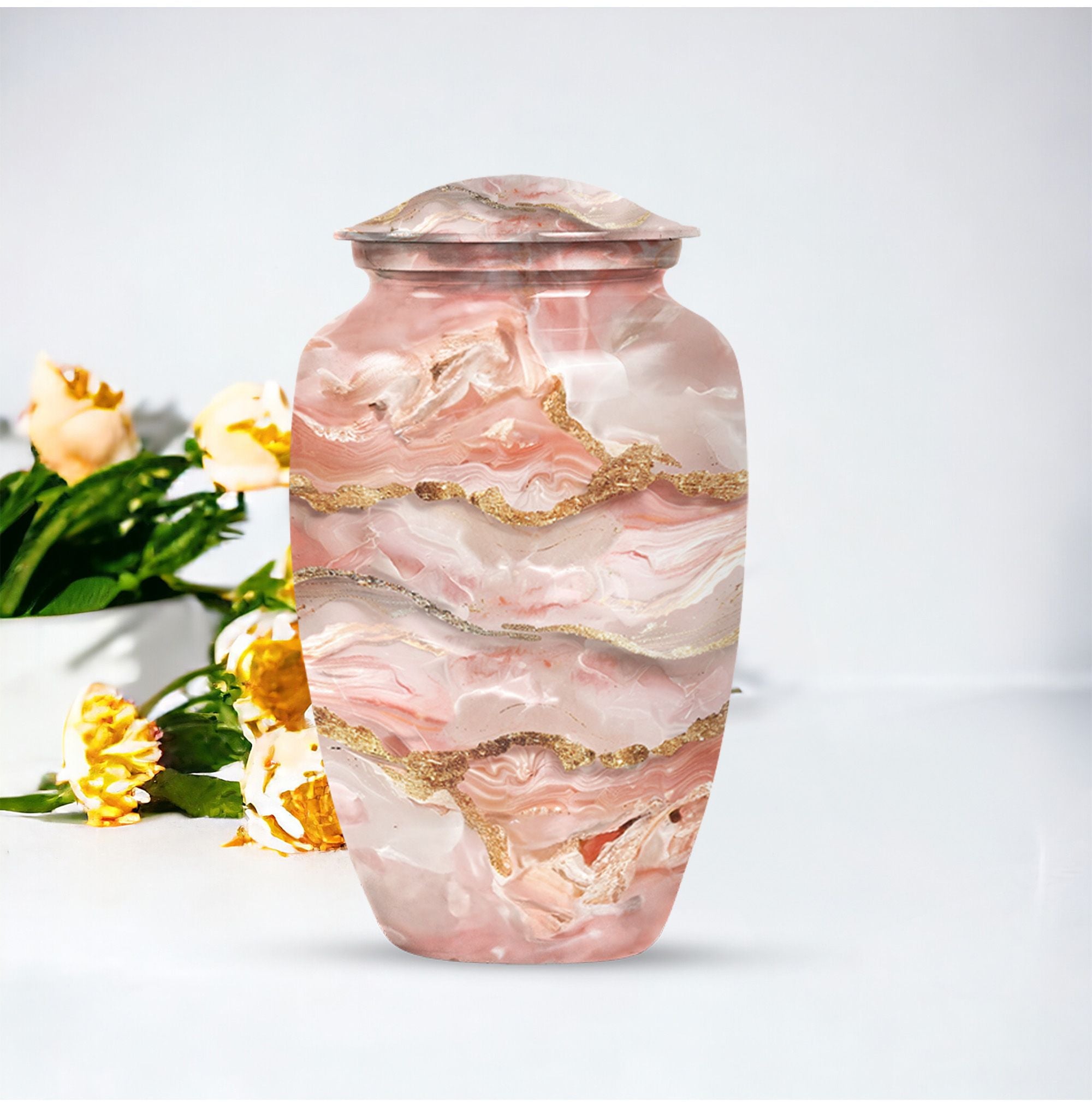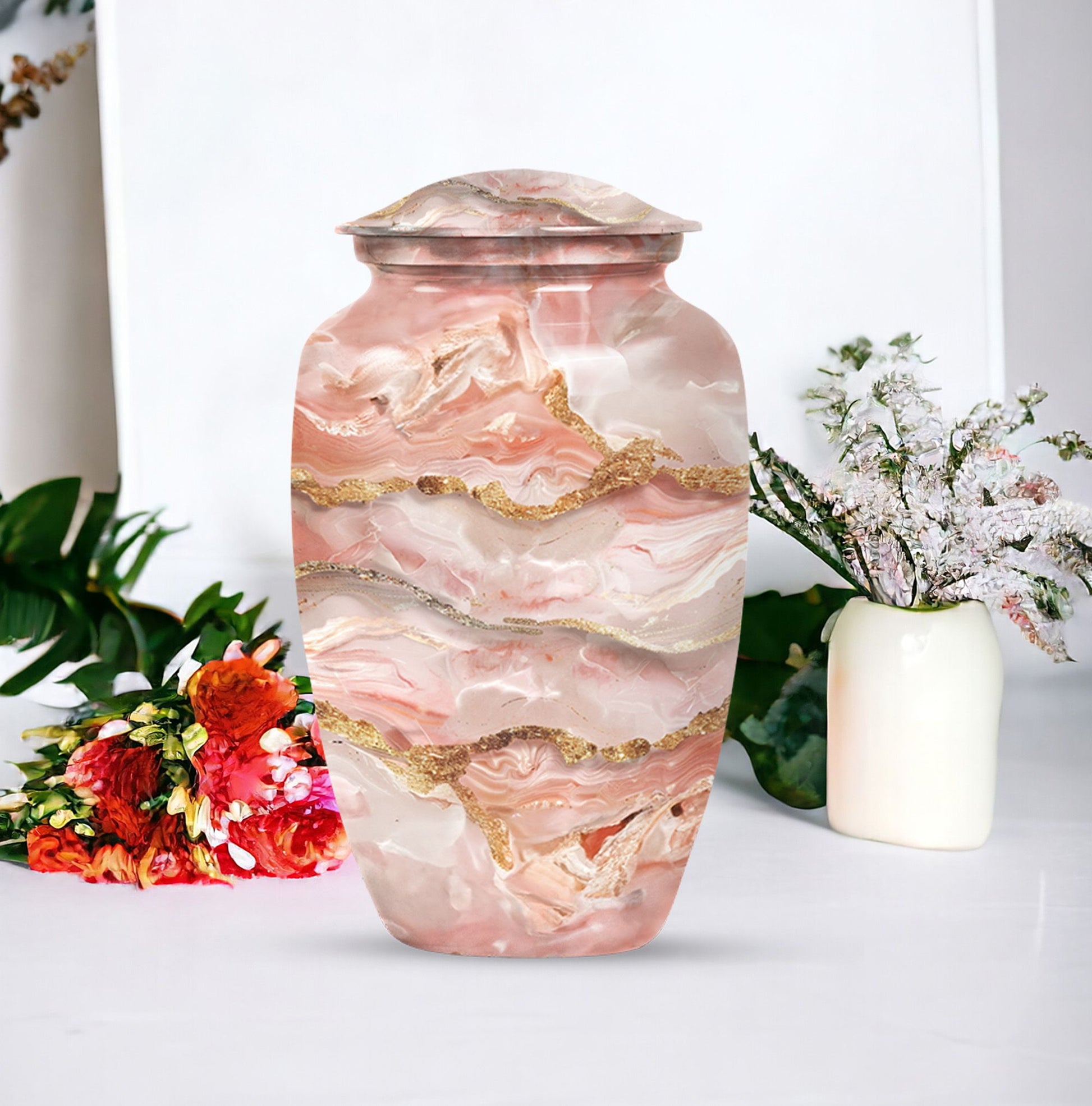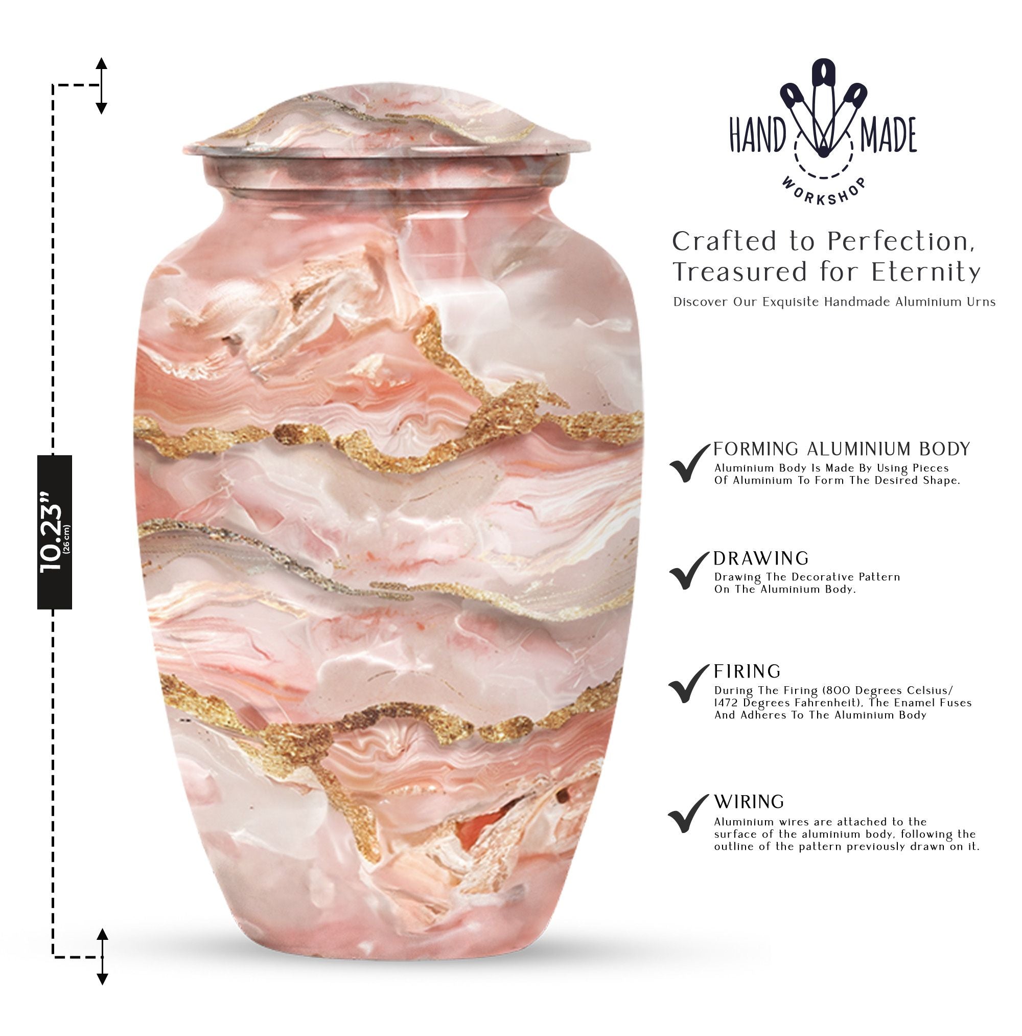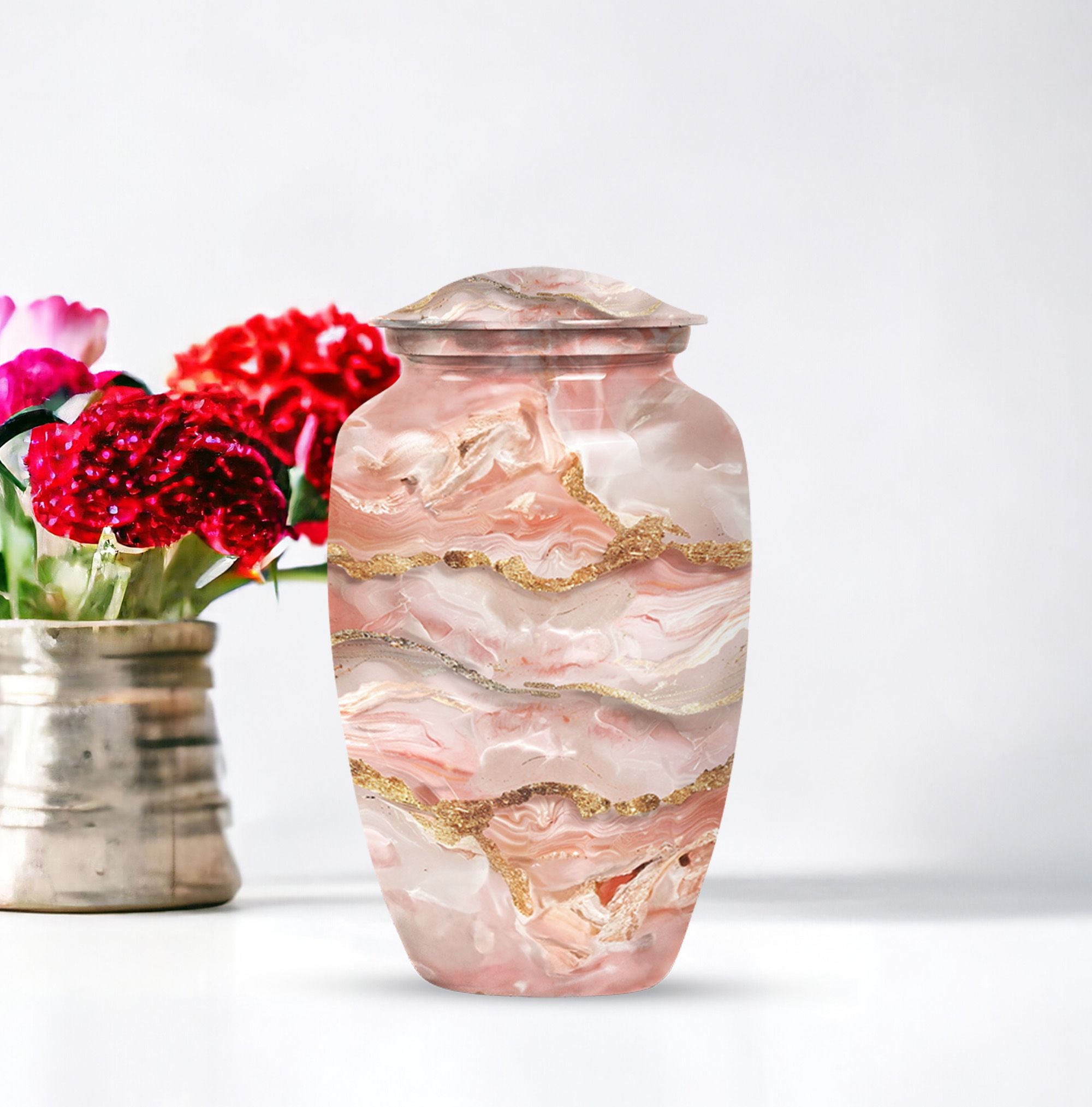 Experience the sublime blend of thoughtful craftmanship and a unique abstract theme with our 'Colourful Swirl Urn'. Made from resilient aluminium, this 10-inch Large Urn weighs just 3.3 pounds, making it easy to handle yet robust. The burial medium size urn, encased with a surreal swirl of colors, holds a significant capacity of 200 cubic inches. This commemorative relic is not just a 'memorial urn', it symbolizes a lasting tribute to loved ones. We offer the ability to customize the urn by engraving the names of your loved ones, creating a heartfelt personal touch to this ceremonial keepsake. Additionally, a velvet pouch is included in the package for containing the ashes securely. Eluding artistic vibes, this urn adds a unique touch to any memorial ceremony. This urn could be a pick for cremation urns for women or adults, featuring a perfect assortment of value and sentiment. Also, the product presents itself as a perfect choice for 'metal urns for burial in ground large'.