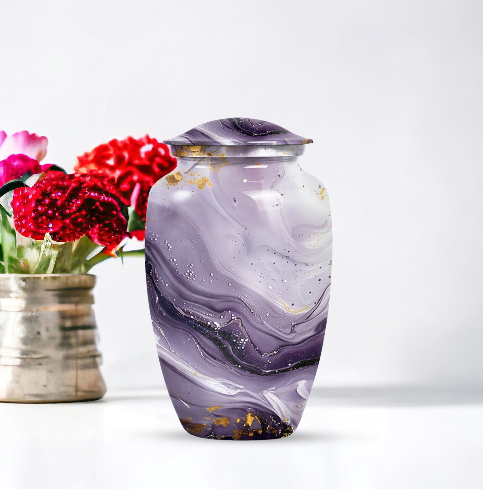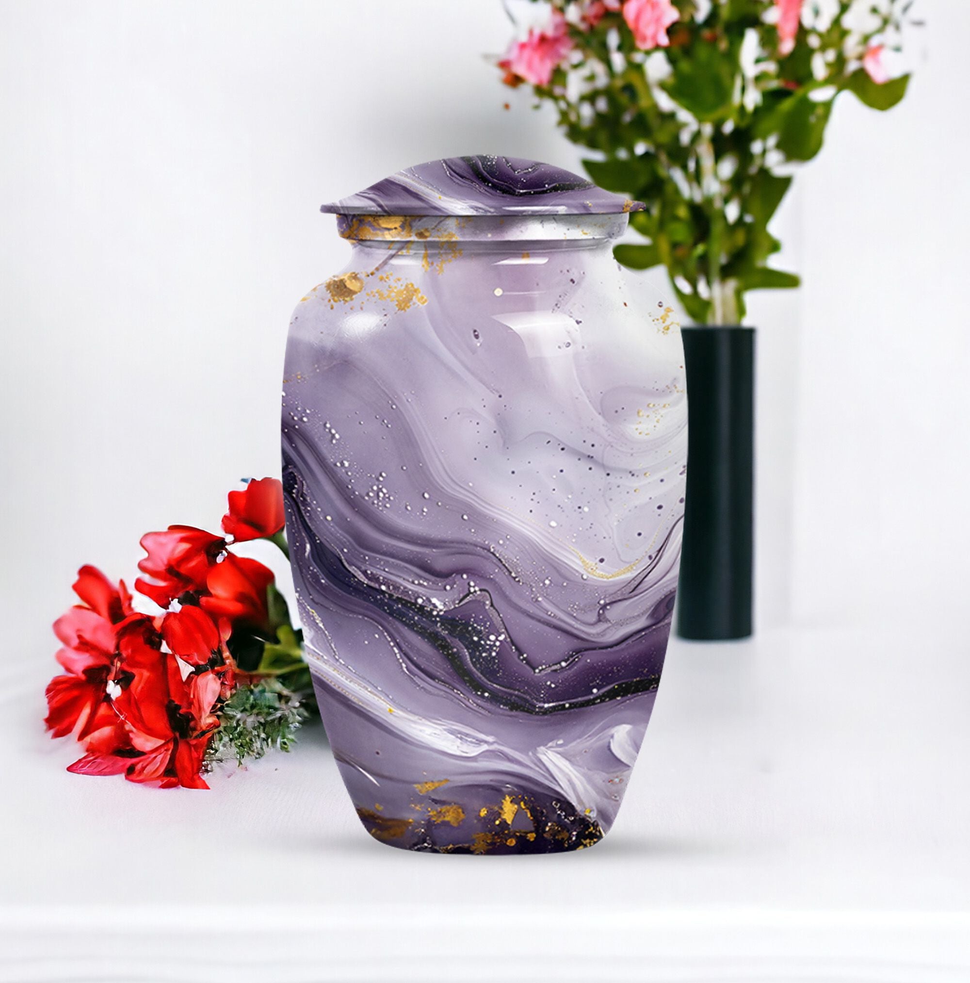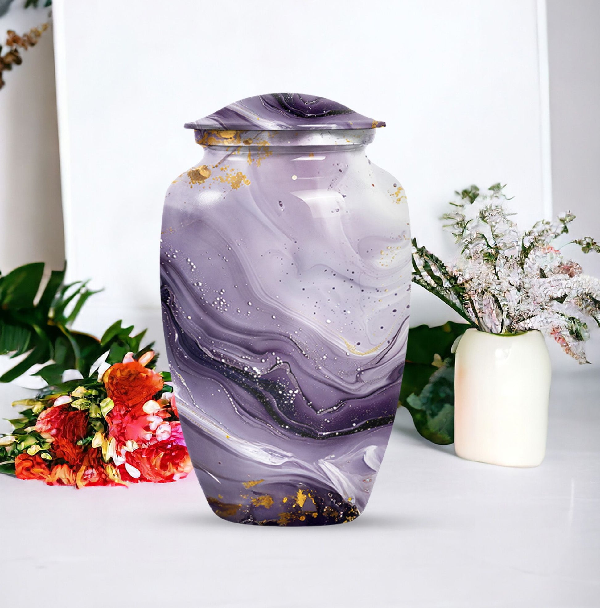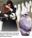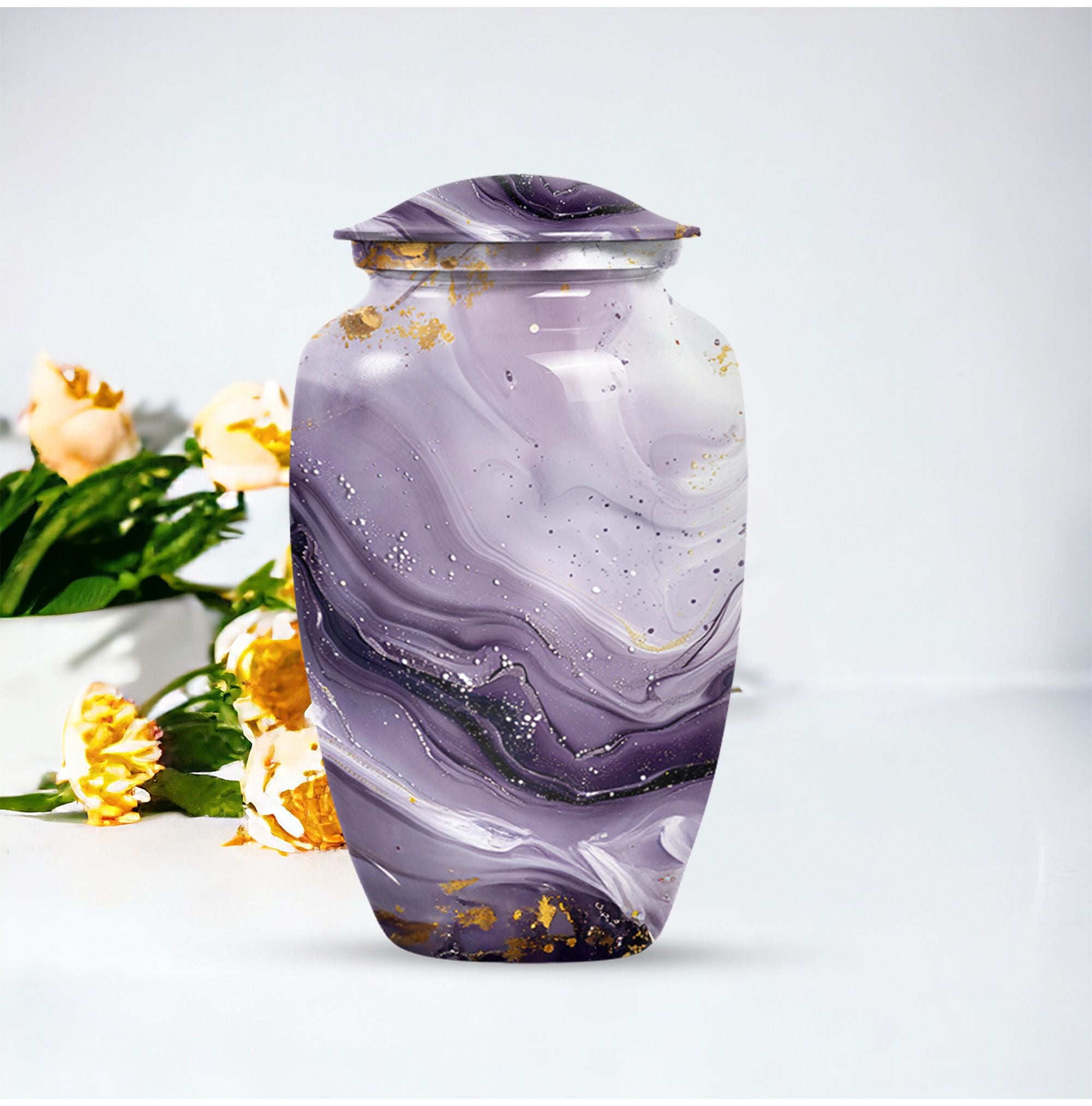 Honoring a departed loved one should resonate with their distinctive personality and spirit. Our Colourful Swirl urn, a 10-Inch Abstract themed large funeral urn for ashes, does just that. It renders a celebratory and timeless memorial with its vibrant theme and classic urn style. Skillfully crafted from aluminium, this piece weighs a sturdy 3.3 pounds and has a 200 cubic-inch capacity to hold the ash securely. Personalize this cremation urn with engraved names to create a truly unique memorial. It encompasses a 10-inch height dimension making it a fitting tribute to your loved one. The urn comes equipped with a velvet pouch for the respectful containment of ashes, underscoring our commitment to providing quality memorial human urns. Our traditional urn serves as a touching tribute to your loved one using materials crafted to stand the test of time. This urn is more than an inanimate burial item; it's a vibrant echo of a fulfilled life.