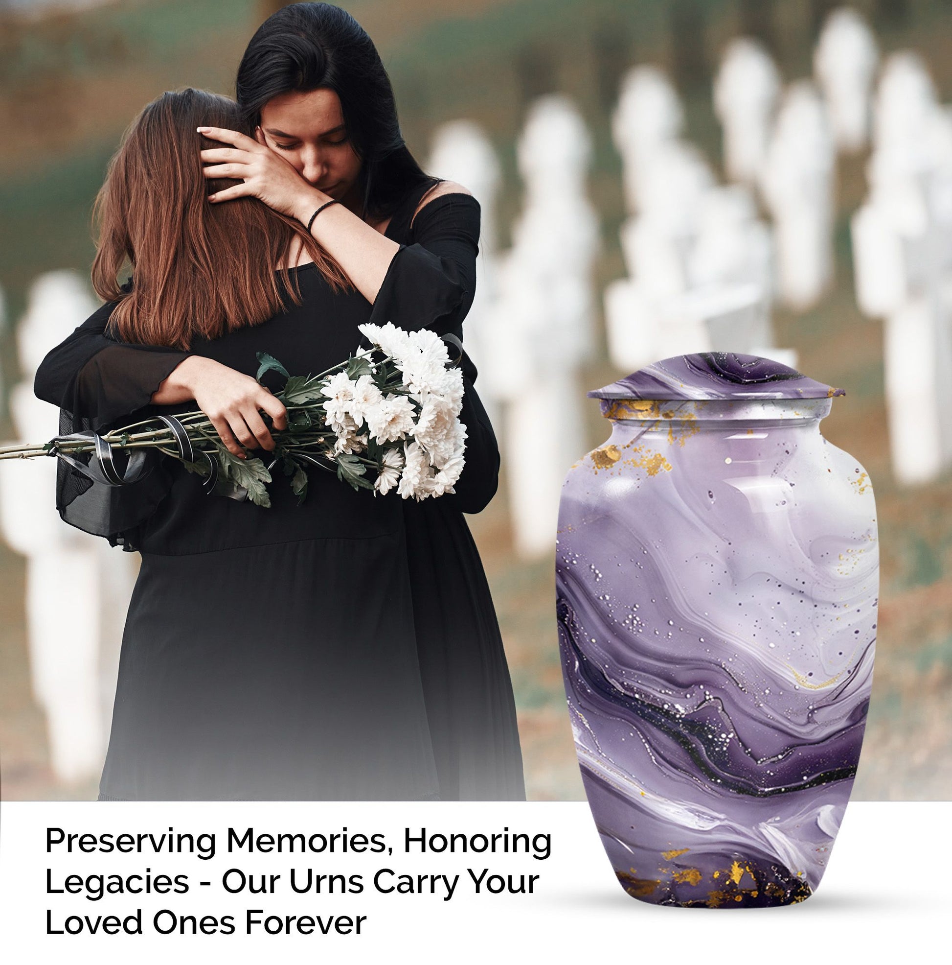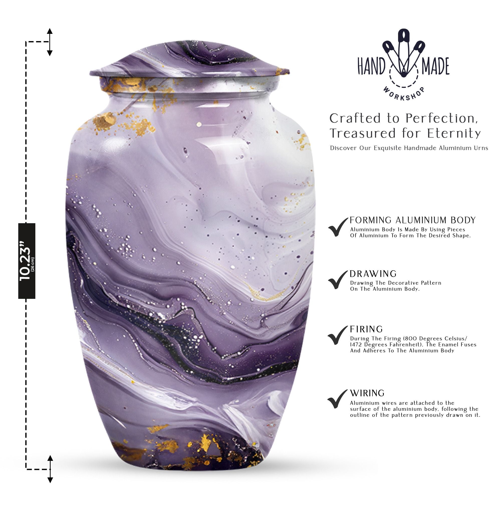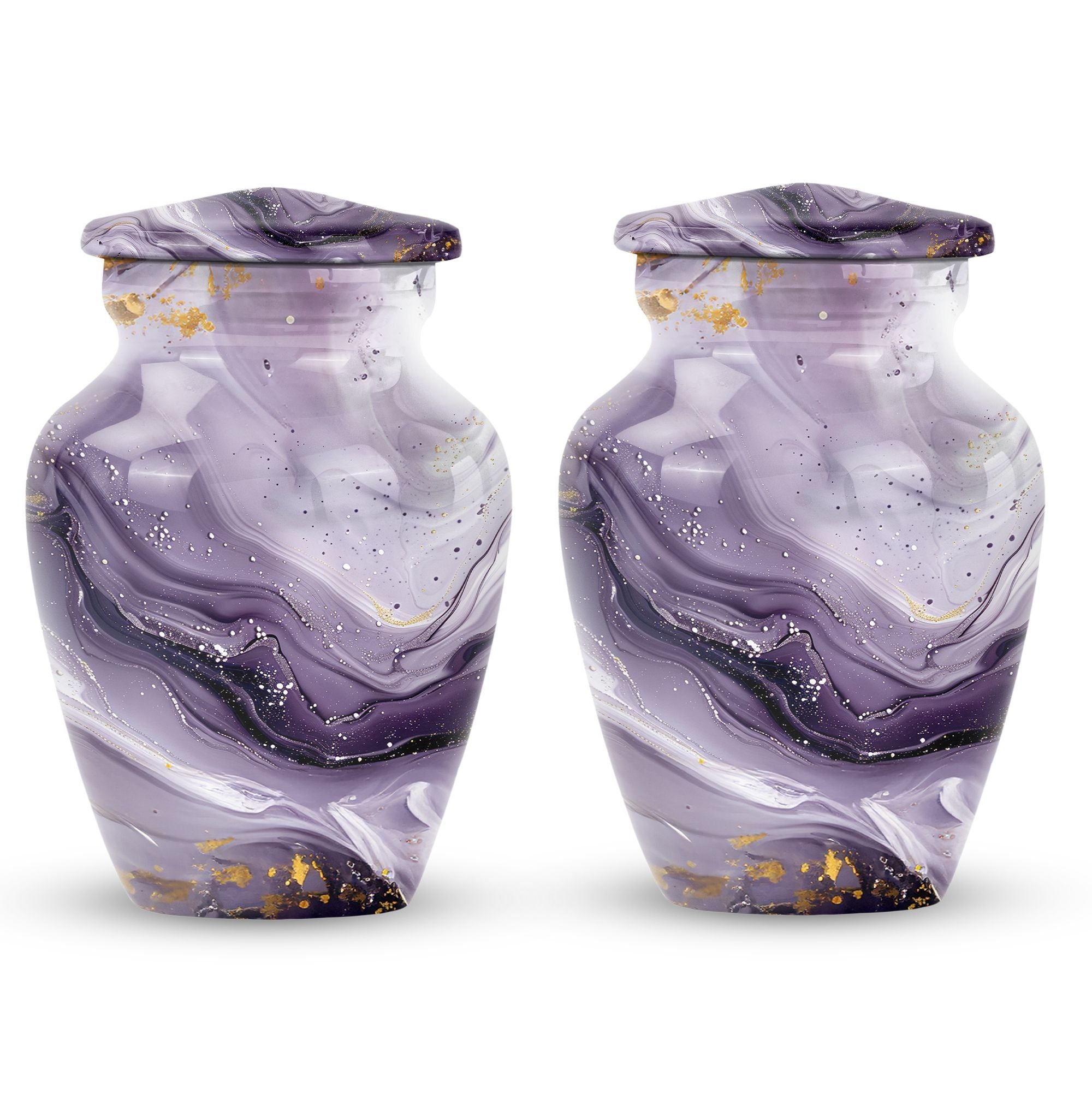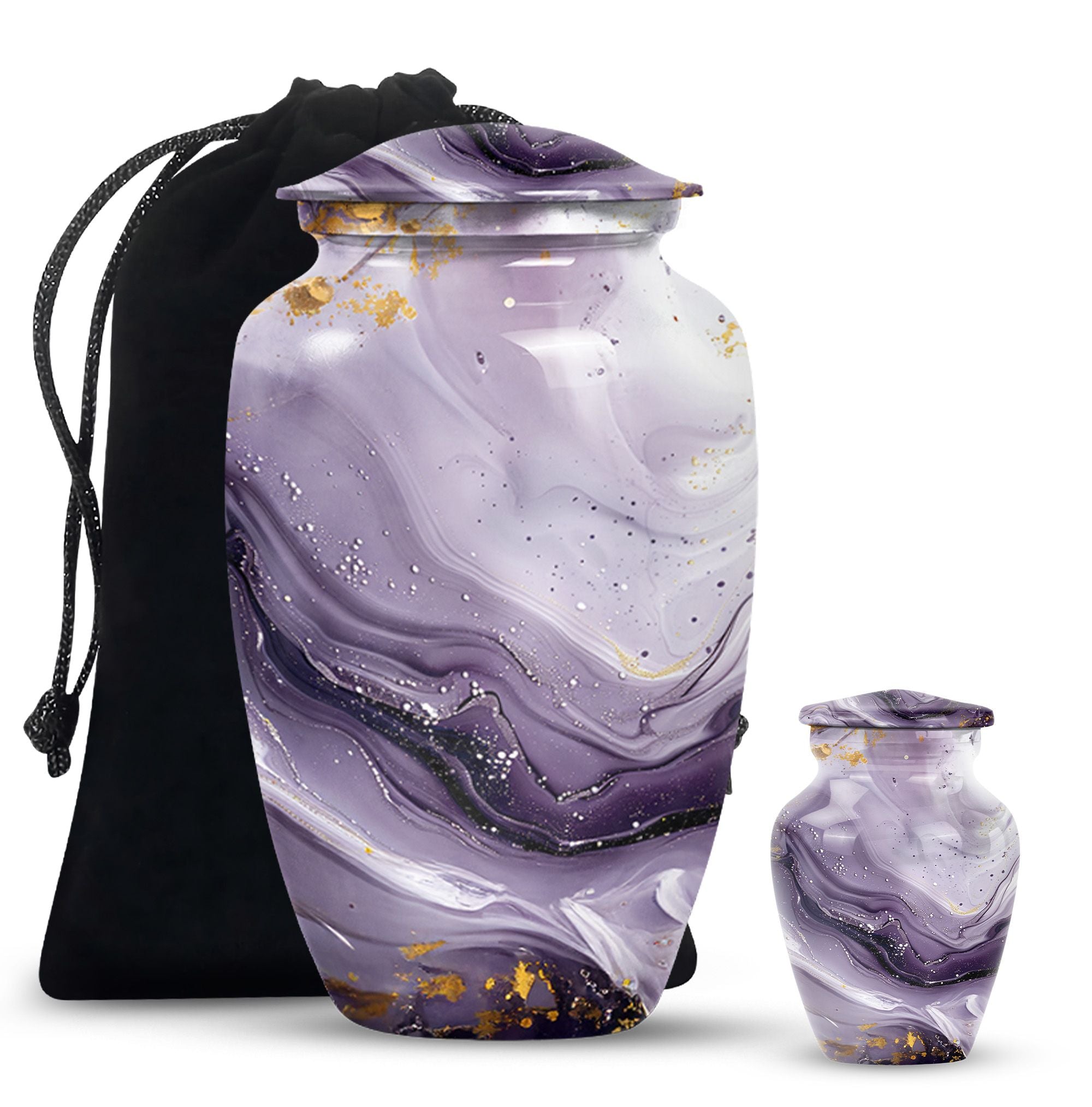 Honoring a departed loved one should resonate with their distinctive personality and spirit. Our Colourful Swirl urn, a 10-Inch Abstract themed large funeral urn for ashes, does just that. It renders a celebratory and timeless memorial with its vibrant theme and classic urn style. Skillfully crafted from aluminium, this piece weighs a sturdy 3.3 pounds and has a 200 cubic-inch capacity to hold the ash securely. Personalize this cremation urn with engraved names to create a truly unique memorial. It encompasses a 10-inch height dimension making it a fitting tribute to your loved one. The urn comes equipped with a velvet pouch for the respectful containment of ashes, underscoring our commitment to providing quality memorial human urns. Our traditional urn serves as a touching tribute to your loved one using materials crafted to stand the test of time. This urn is more than an inanimate burial item; it's a vibrant echo of a fulfilled life.