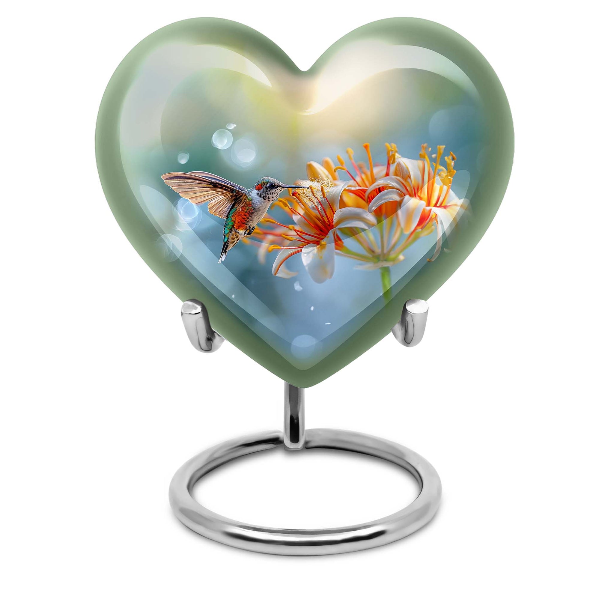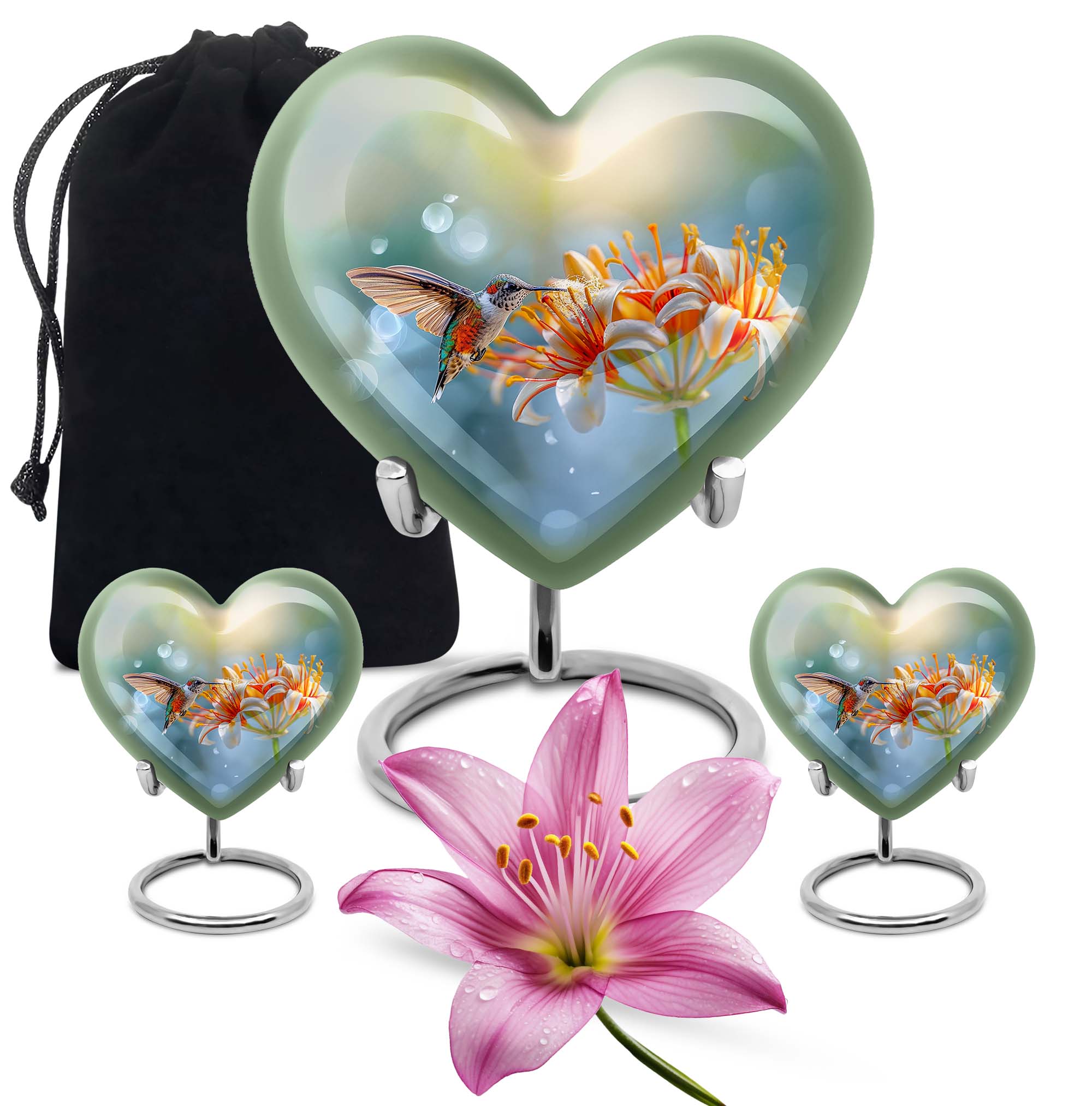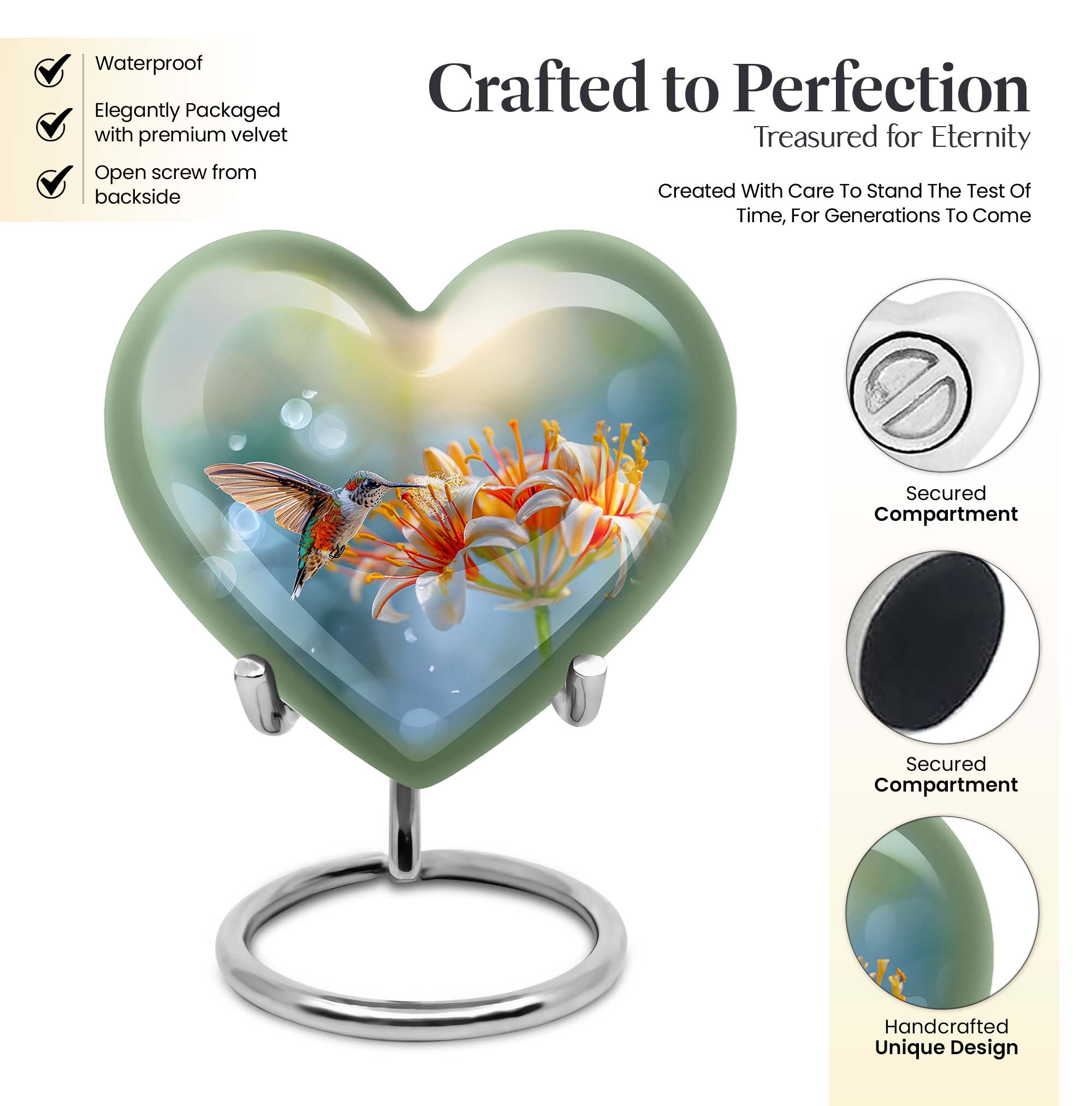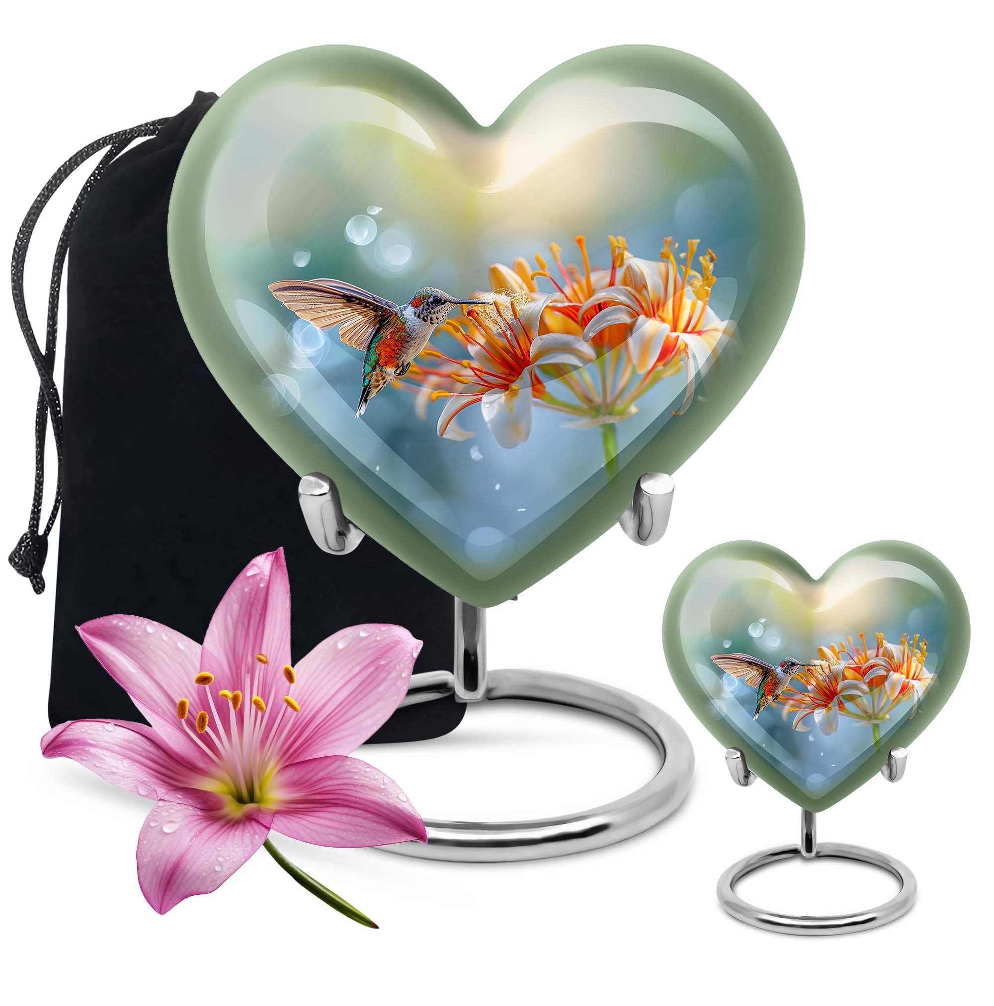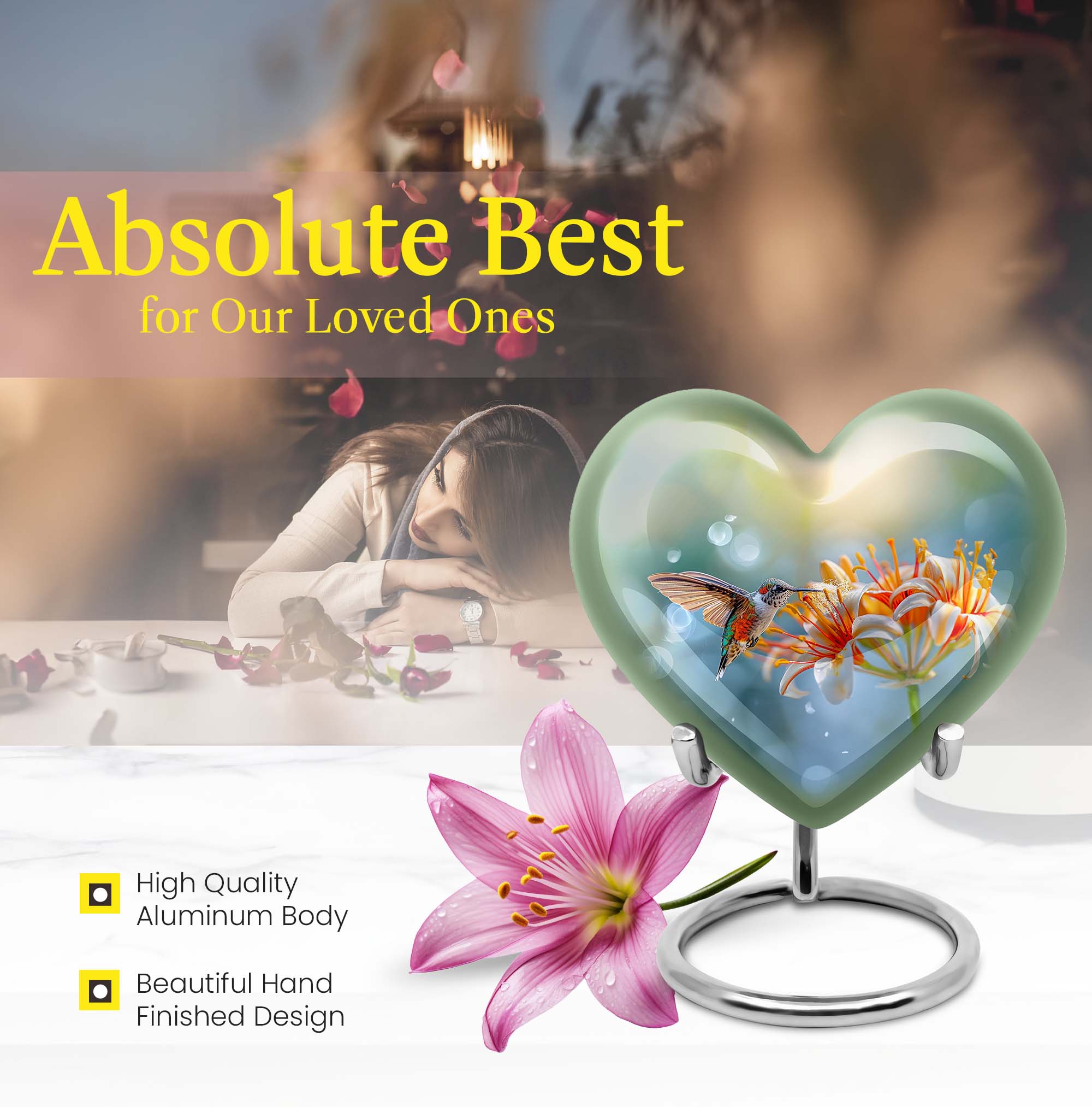 Discover our meticulously crafted, aluminium Humming Bird Urn; a dignified resting place for your loved one's ashes. Measuring 10 inches in height and weighing 3.3 pounds, this urn designed for adults, wraps elegantly in a velvet pouch, ensuring the containment of ashes. Its large size provides a 200 cubic inches capacity, ideal for preserving cremation ashes. Reflecting an abstract theme and a Heart Urn design, we have gone all out to create a piece that not only resonates a burial tradition but also brings personal contentment. For an added touch, personalize this cremation urn with engraved names, fostering cherished memories. Hand-picked keywords that encompass this product are 'humming bird urn,' 'burial urns for cremation ashes,' and 'cremation urn for human ashes.' Tagging this product with phrases such as 'cremation urn,' 'burial,' and 'urns' will provide convenience in locating this timeless keepsake online. The strength, beauty, and timelessness of this aluminium cremation urns make it a worthy selection for memorial ceremonies.