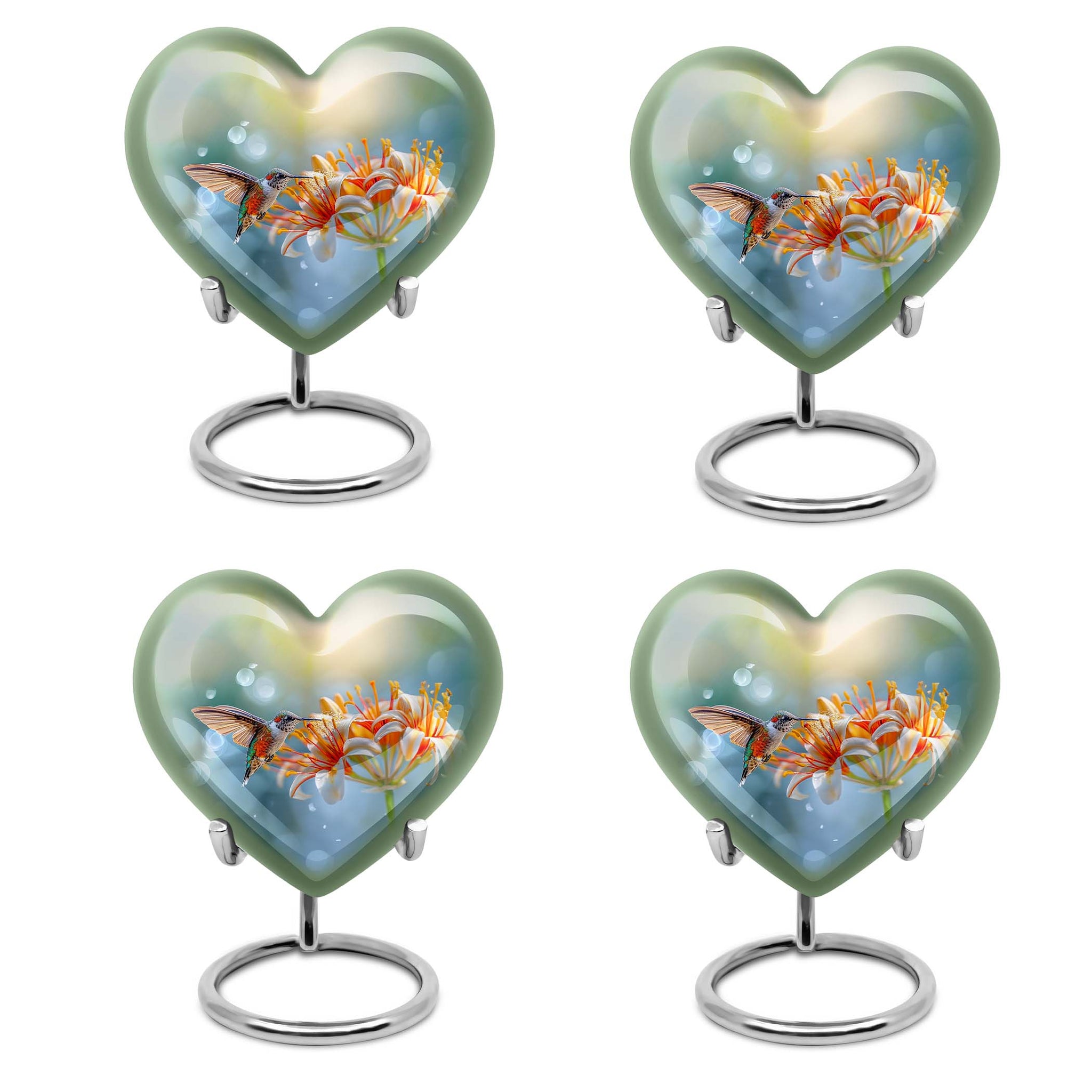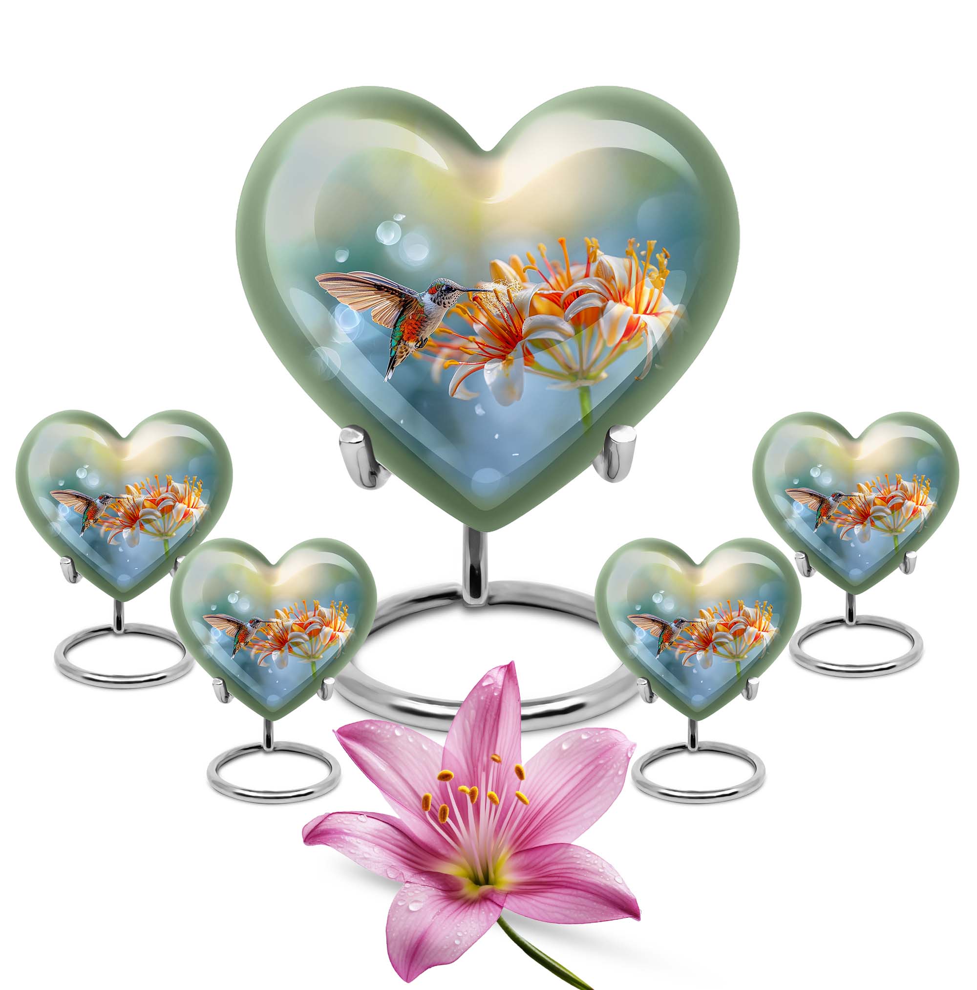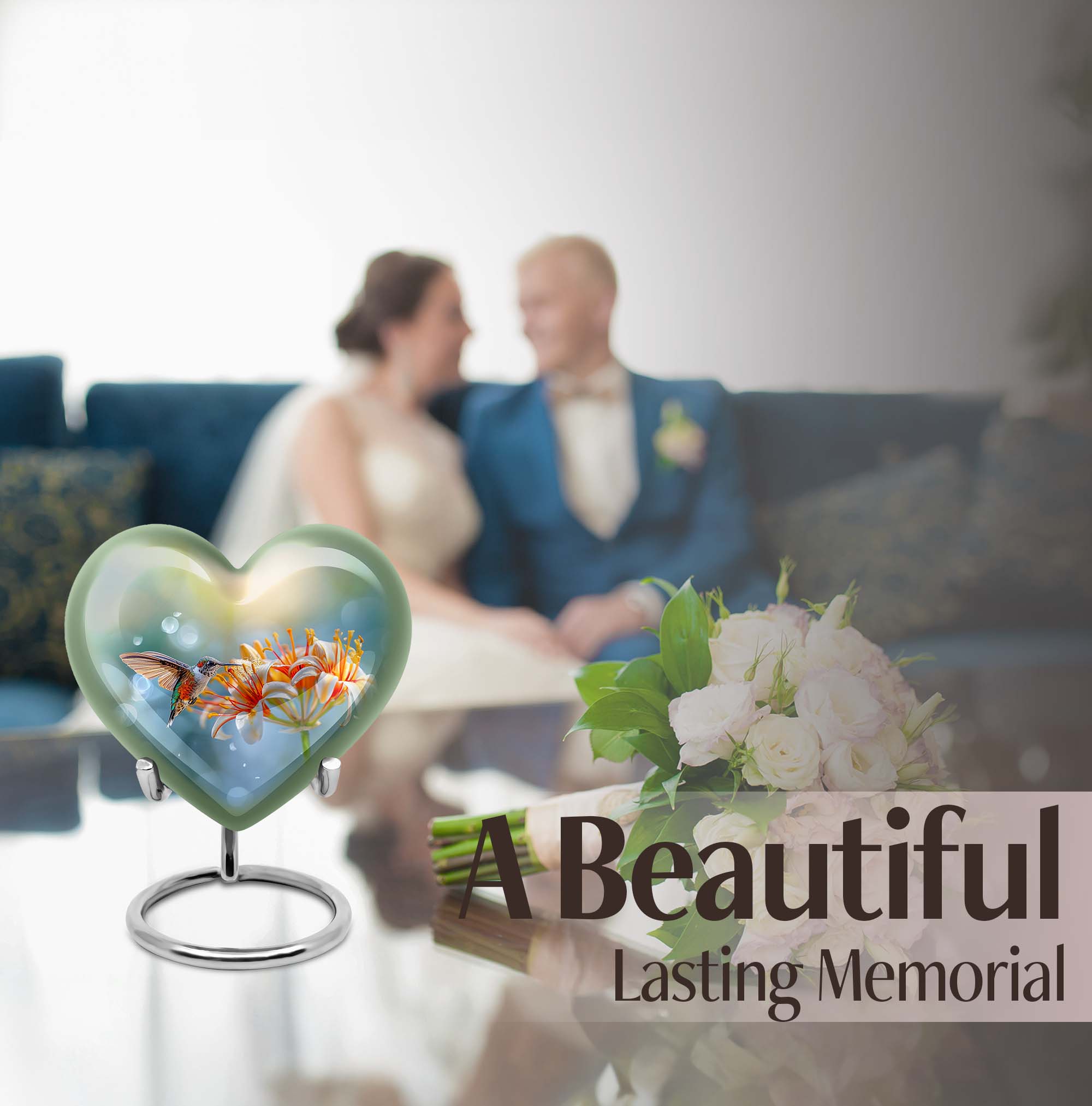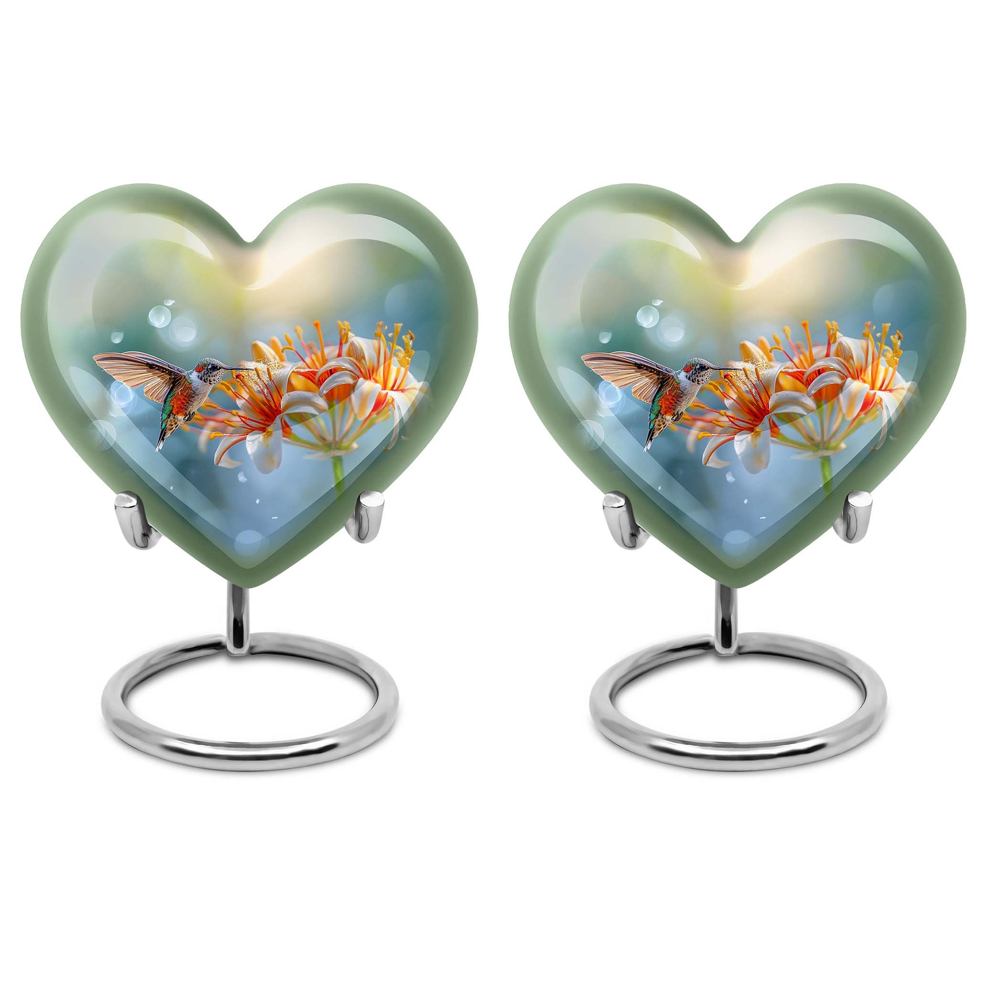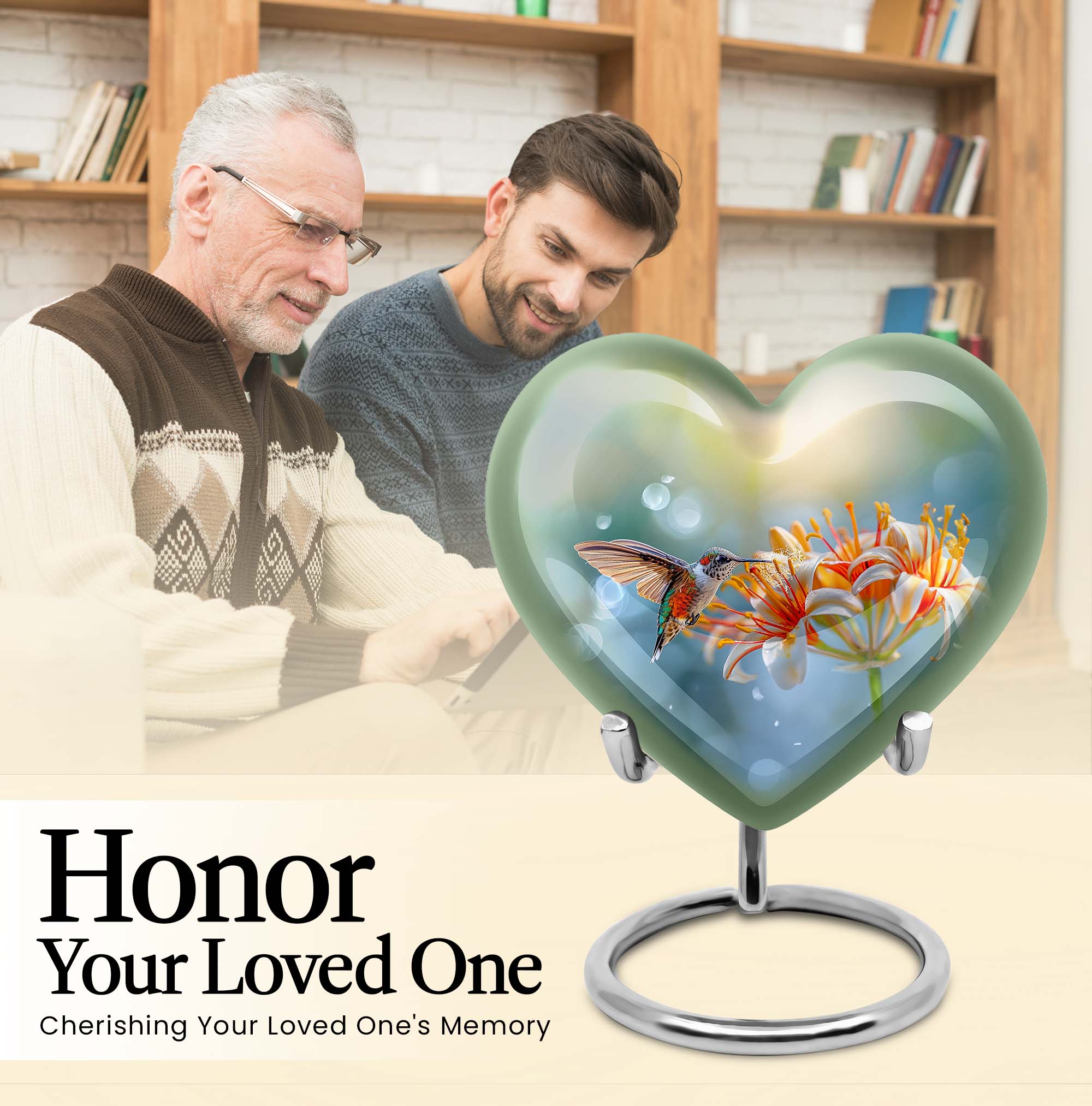 Discover our meticulously crafted, aluminium Humming Bird Urn; a dignified resting place for your loved one's ashes. Measuring 10 inches in height and weighing 3.3 pounds, this urn designed for adults, wraps elegantly in a velvet pouch, ensuring the containment of ashes. Its large size provides a 200 cubic inches capacity, ideal for preserving cremation ashes. Reflecting an abstract theme and a Heart Urn design, we have gone all out to create a piece that not only resonates a burial tradition but also brings personal contentment. For an added touch, personalize this cremation urn with engraved names, fostering cherished memories. Hand-picked keywords that encompass this product are 'humming bird urn,' 'burial urns for cremation ashes,' and 'cremation urn for human ashes.' Tagging this product with phrases such as 'cremation urn,' 'burial,' and 'urns' will provide convenience in locating this timeless keepsake online. The strength, beauty, and timelessness of this aluminium cremation urns make it a worthy selection for memorial ceremonies.