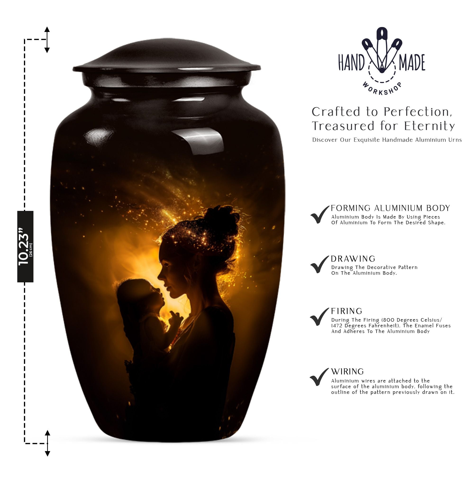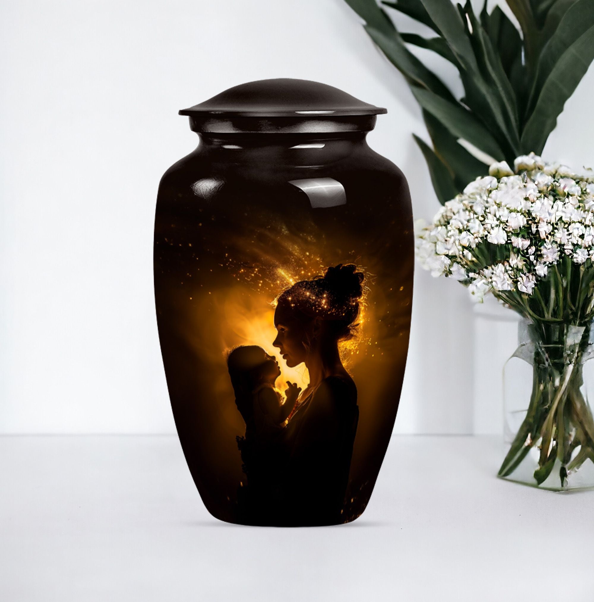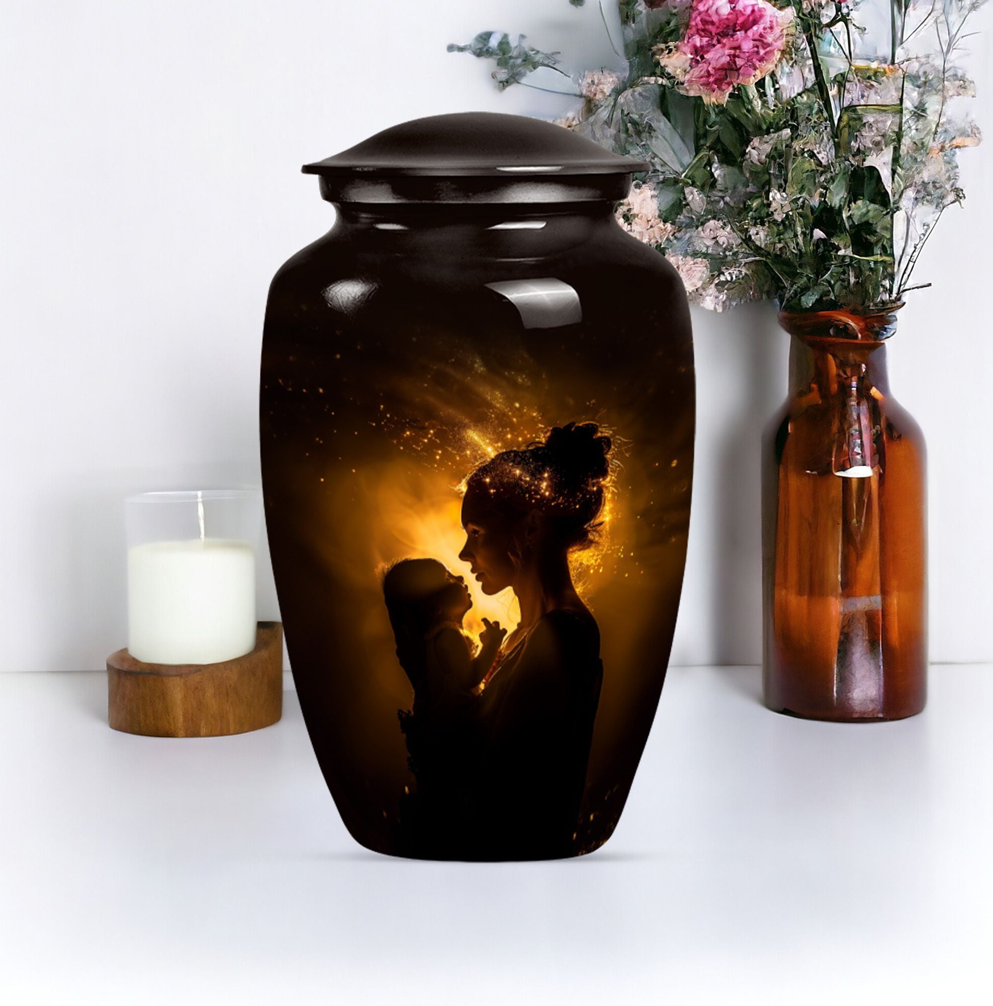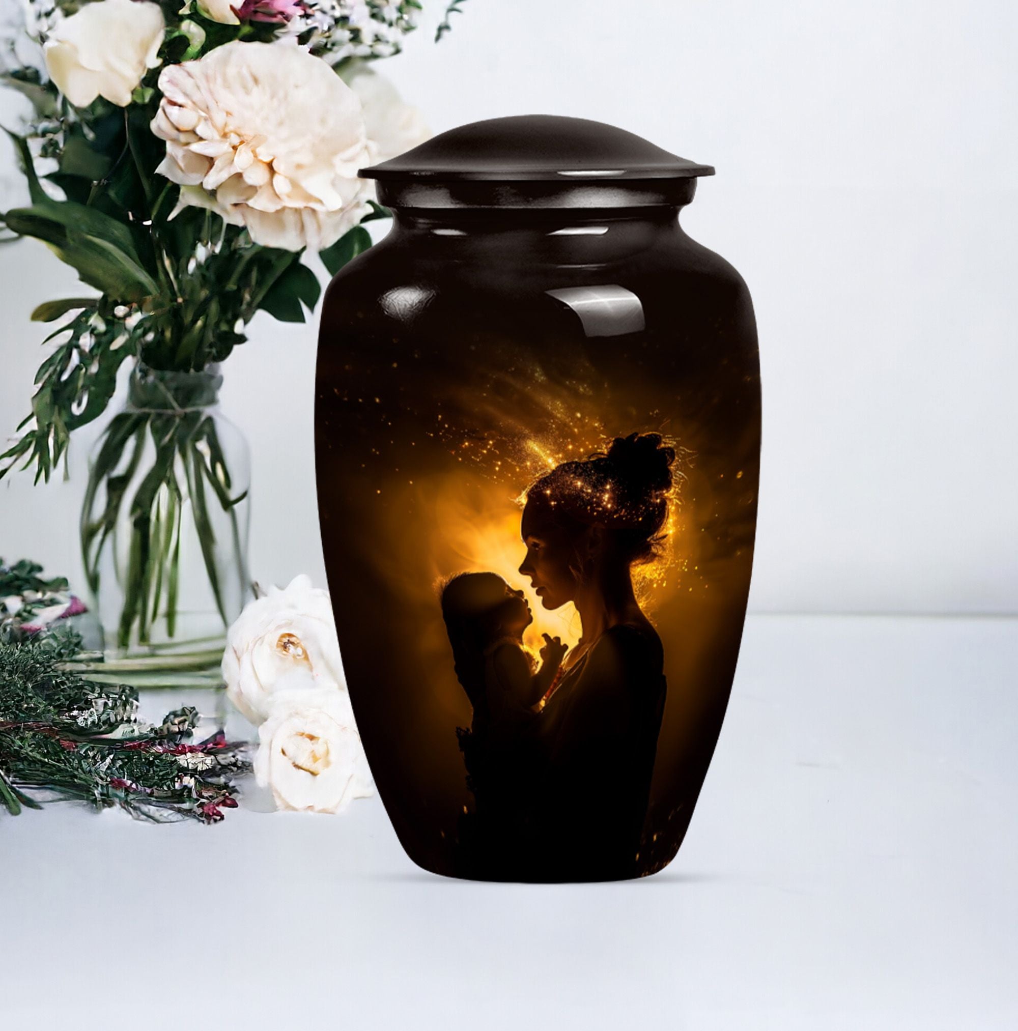 Emanating unconditional affection, our 10-inch 'Mother Love Urn' and 'Funeral Urns for Adult Male Dad' is indeed a poignant symbol of remembrance. With a paramount urbanity, this abstract-themed large urn offers an exquisite final rest place for precious remains. Meticulously finalized in Aluminium, its tangible sturdiness ensures durability while its accommodations stand at a generous 200 cubic inches. The supplemental weight of 3.3 pounds resonates with a feeling of warmth and closeness anytime you wish to hold onto it. Offered with a velvet pouch, it gently confines the ashes, safeguarding your cherished memories. For a more intimate touch, avail the advantage of our offered personalization service, enabling you to engrave names as a tribute to your loved ones. Ideal for those looking for 'memorial urns' or 'cremation urns', our product resonates with the heart-piercing emotions of a farewell and offers a meaningful way to preserve the essence of your dear departed.