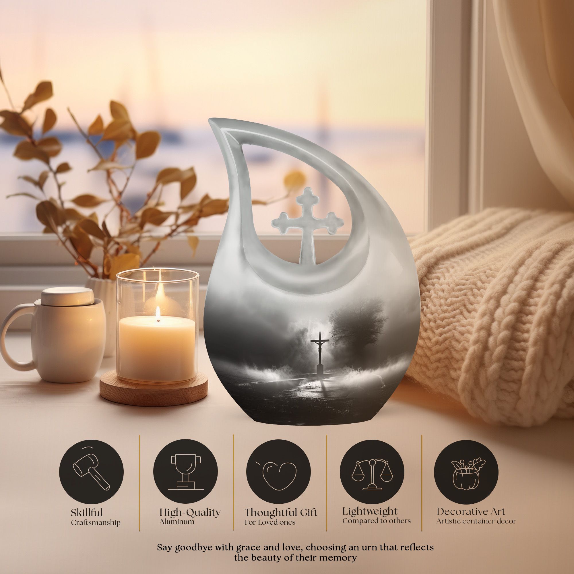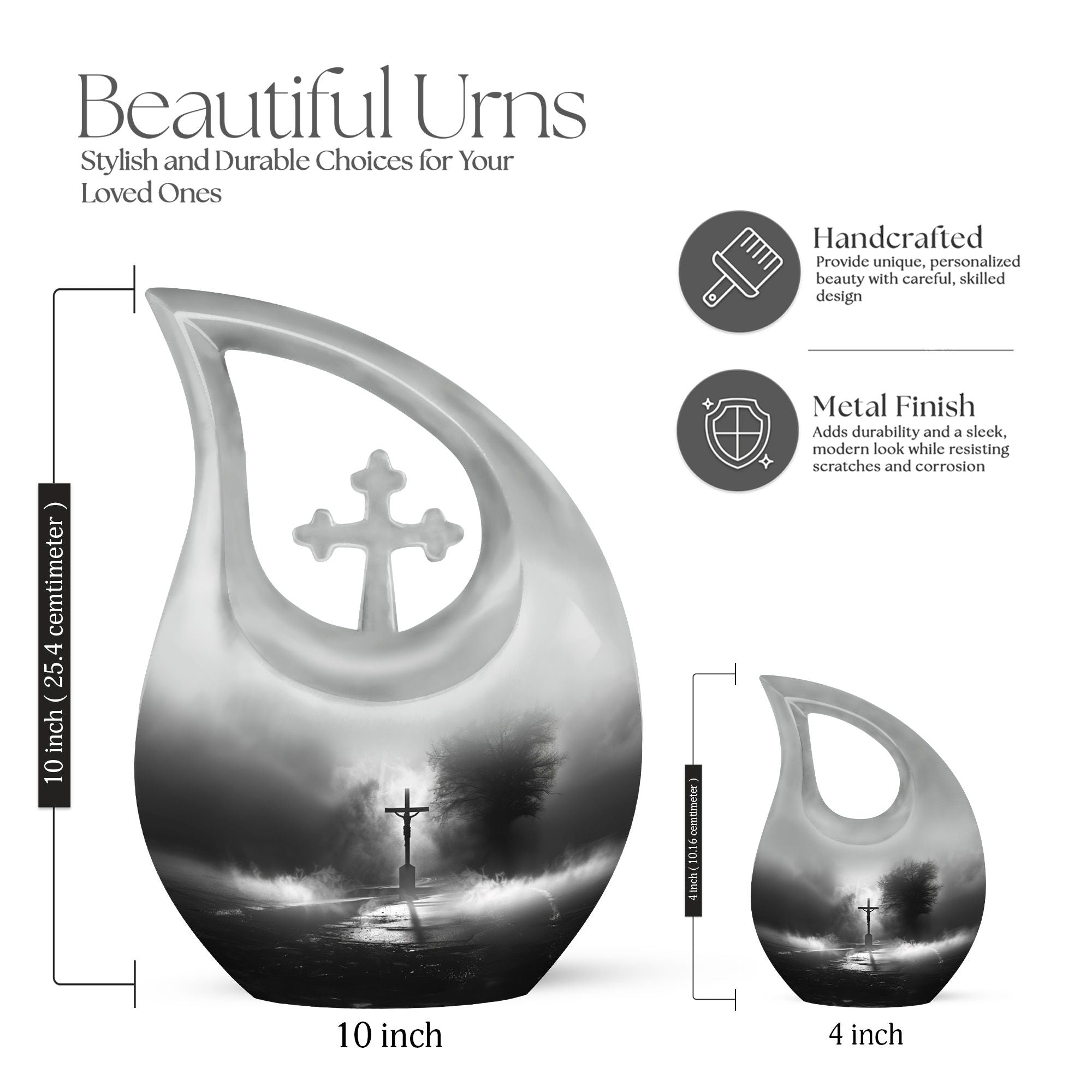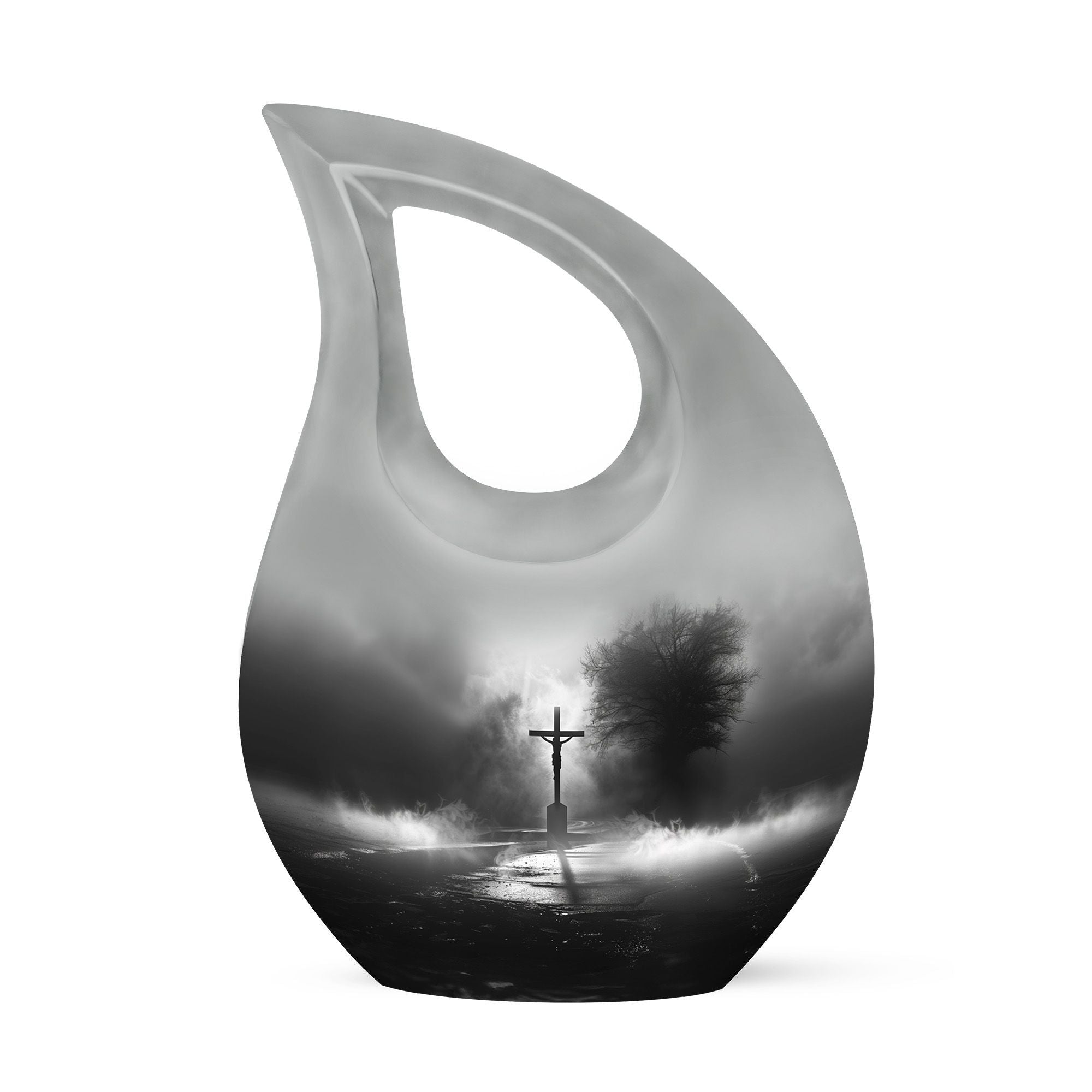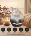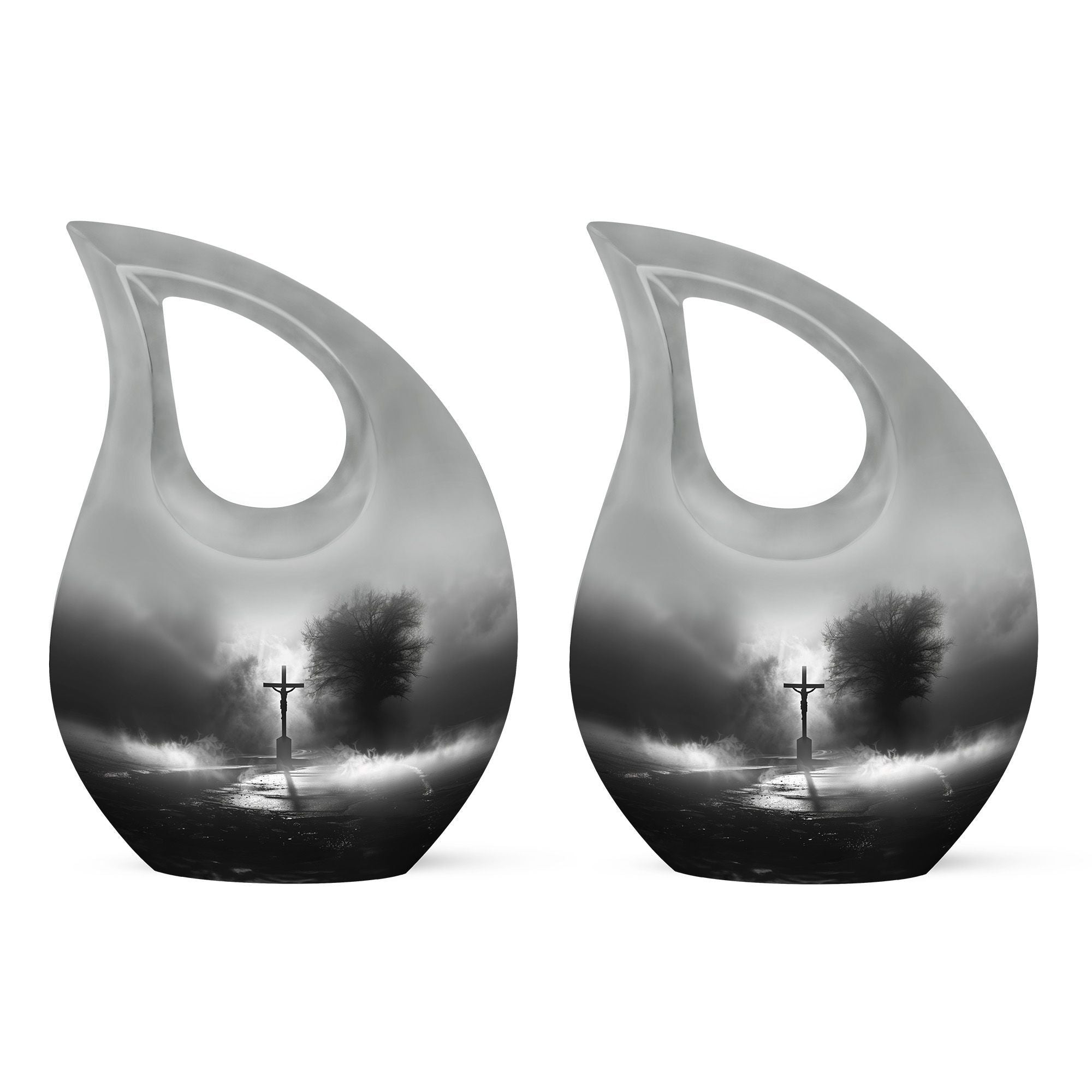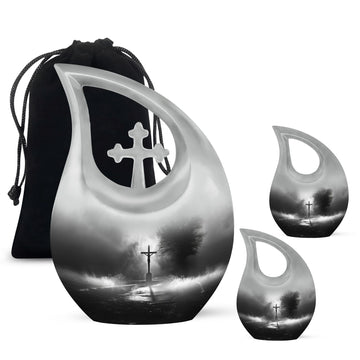 Experience the profound sense of reverence and peace with our precious Jesus Themed 10-inch aluminium urn. This solemn and dignified cremation keepsake, with its impressive Cross Drop design, serves as a respectful remembrance of your loved one. Weighing in at a solid 3.3 pounds and measuring 10 inches in height, it offers a substantial capacity of up to 200 cubic inches. Each large urn comes with a thoughtful velvet pouch, ideal for secure containment of the ashes. To make this memorial urn even more special, you can personalize it with engraved names, adding an exceptional touch to the tribute. This exquisite cremation urn, aside from being a fitting tribute to your loved one's memory, also serves as a beautiful decorative piece. Notably suitable for use as small urns for human ashes or keepsake urns for human ashes, it can also be used depending on other requirements, be it urns for cremation ashes or as a meaningful item among the wide array of cremation urns for sale.