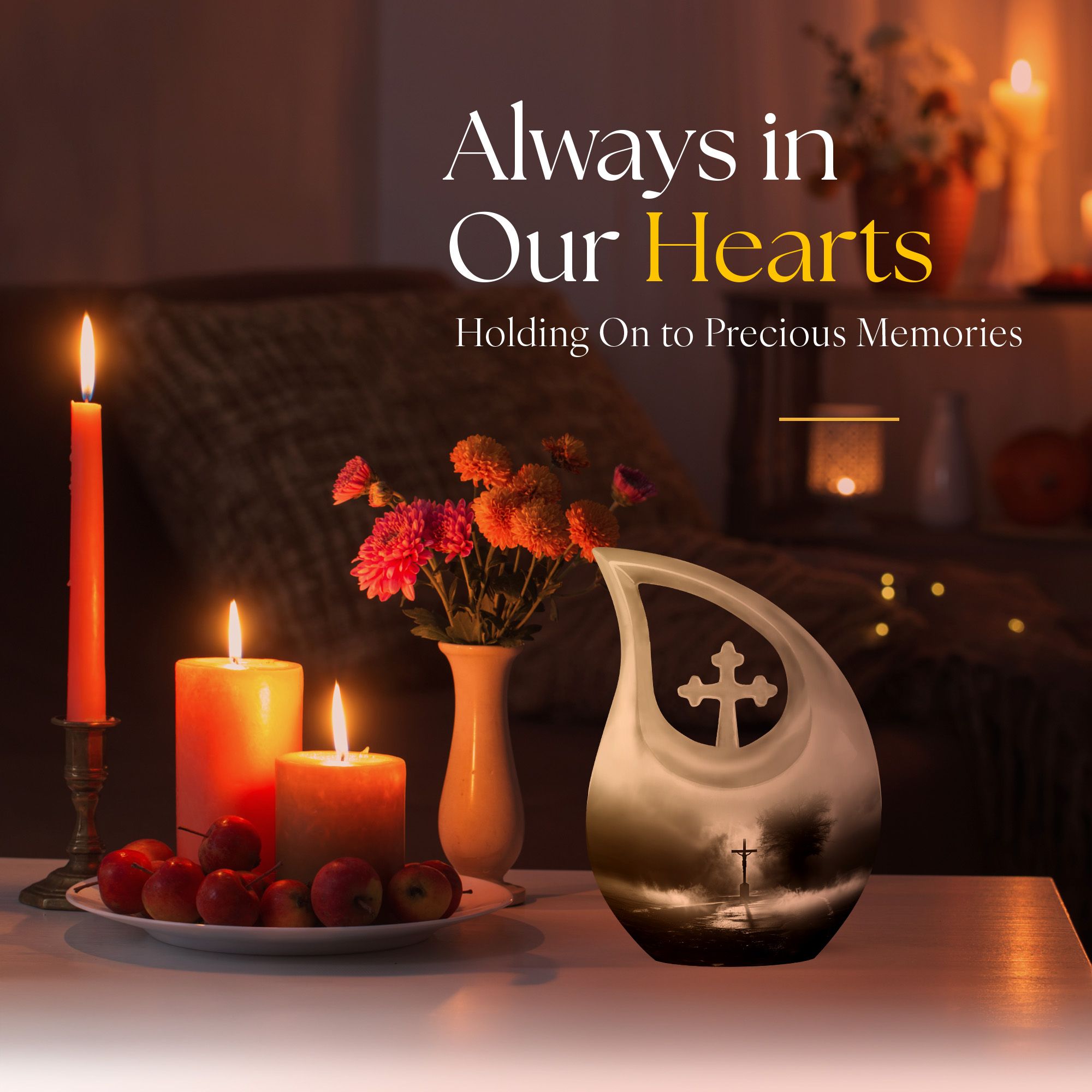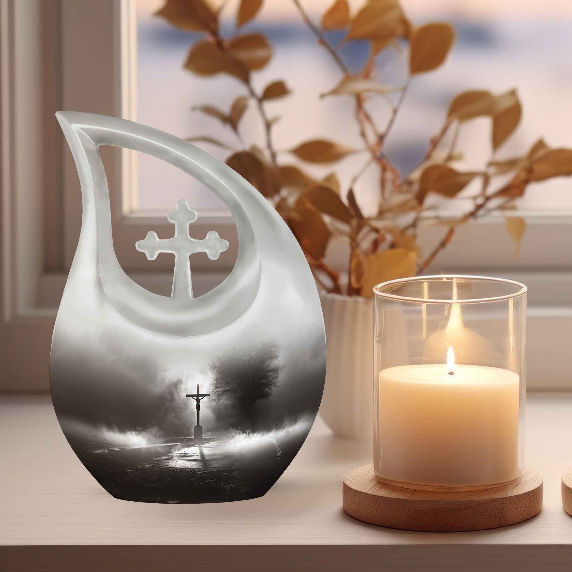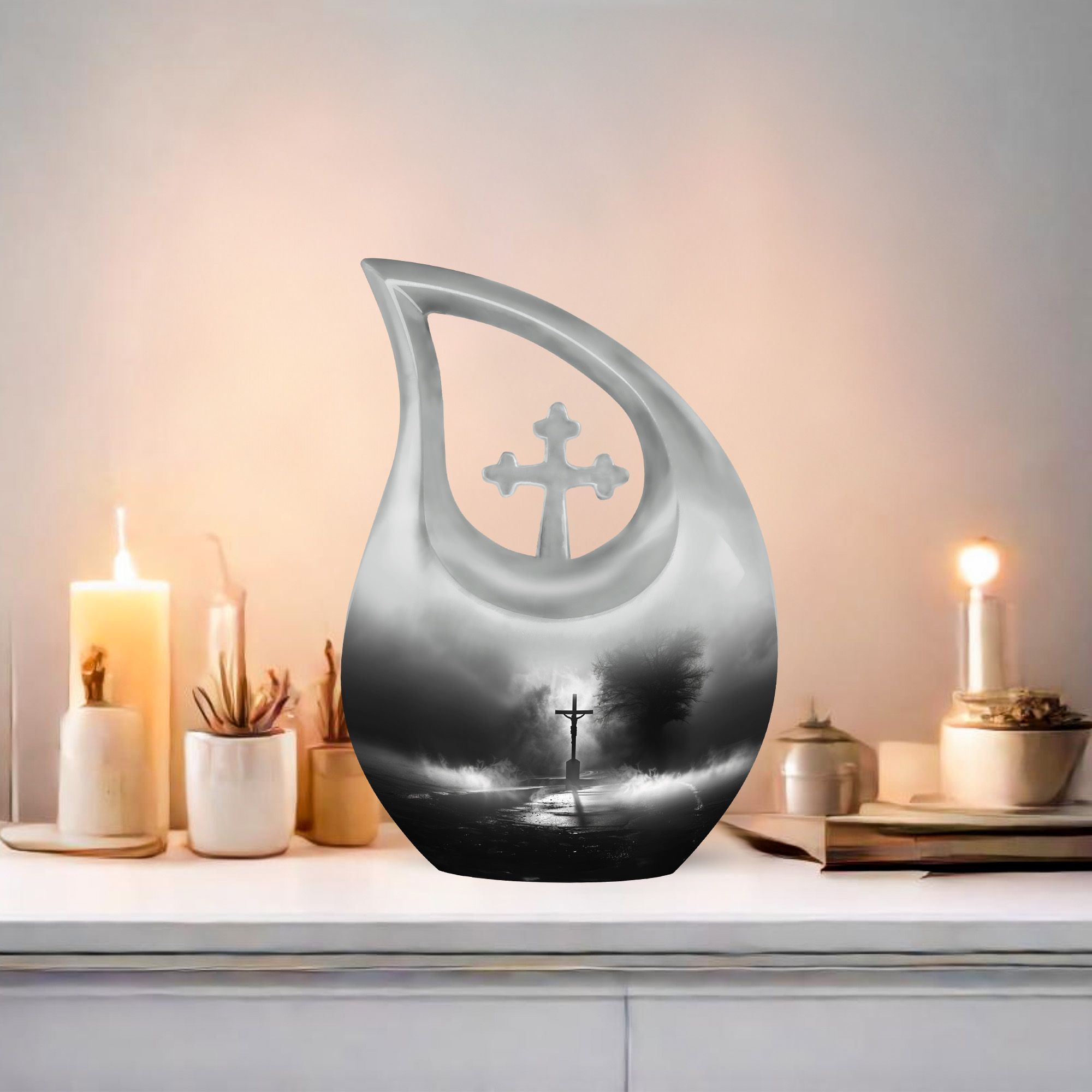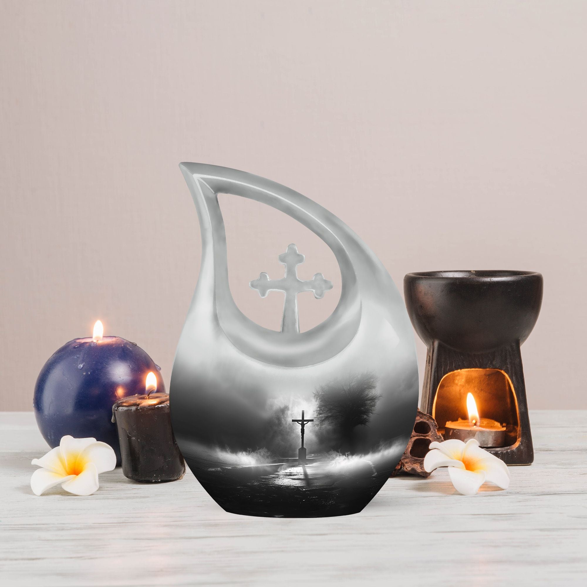 Experience the profound sense of reverence and peace with our precious Jesus Themed 10-inch aluminium urn. This solemn and dignified cremation keepsake, with its impressive Cross Drop design, serves as a respectful remembrance of your loved one. Weighing in at a solid 3.3 pounds and measuring 10 inches in height, it offers a substantial capacity of up to 200 cubic inches. Each large urn comes with a thoughtful velvet pouch, ideal for secure containment of the ashes. To make this memorial urn even more special, you can personalize it with engraved names, adding an exceptional touch to the tribute. This exquisite cremation urn, aside from being a fitting tribute to your loved one's memory, also serves as a beautiful decorative piece. Notably suitable for use as small urns for human ashes or keepsake urns for human ashes, it can also be used depending on other requirements, be it urns for cremation ashes or as a meaningful item among the wide array of cremation urns for sale.