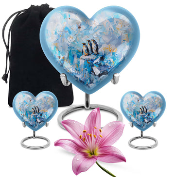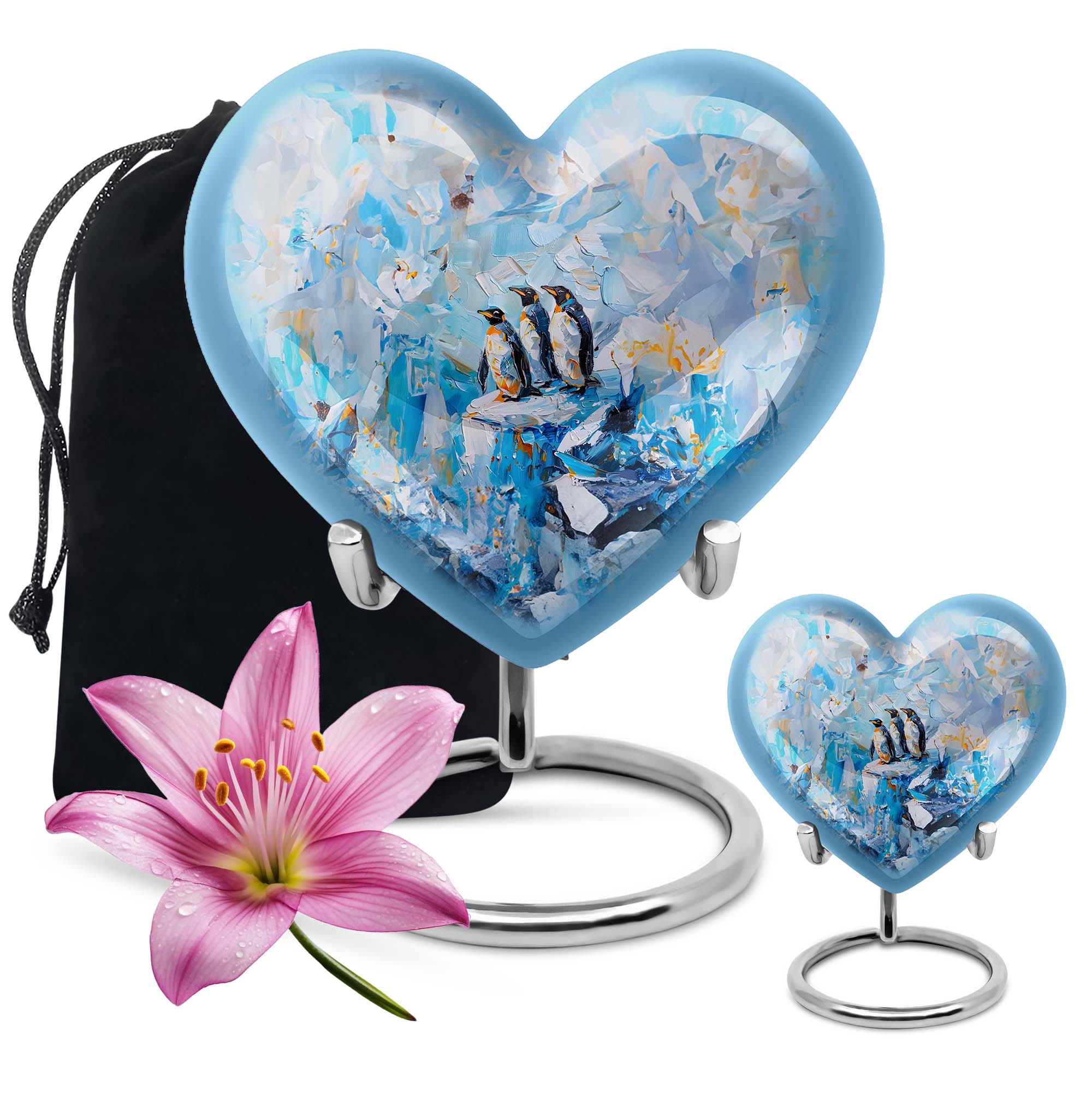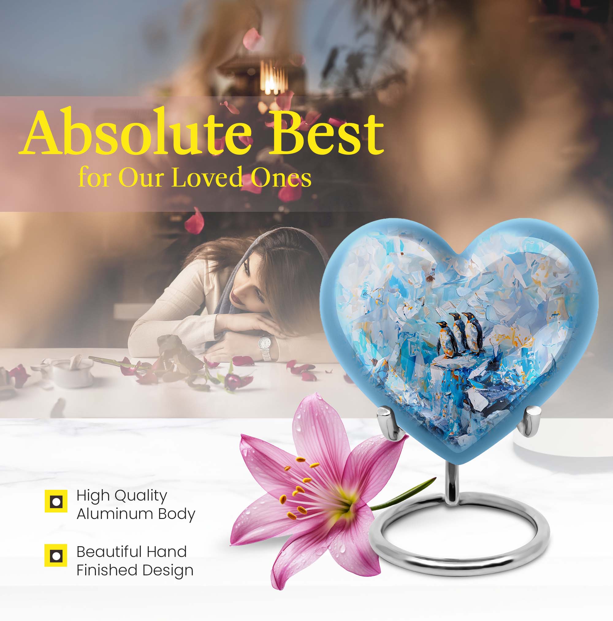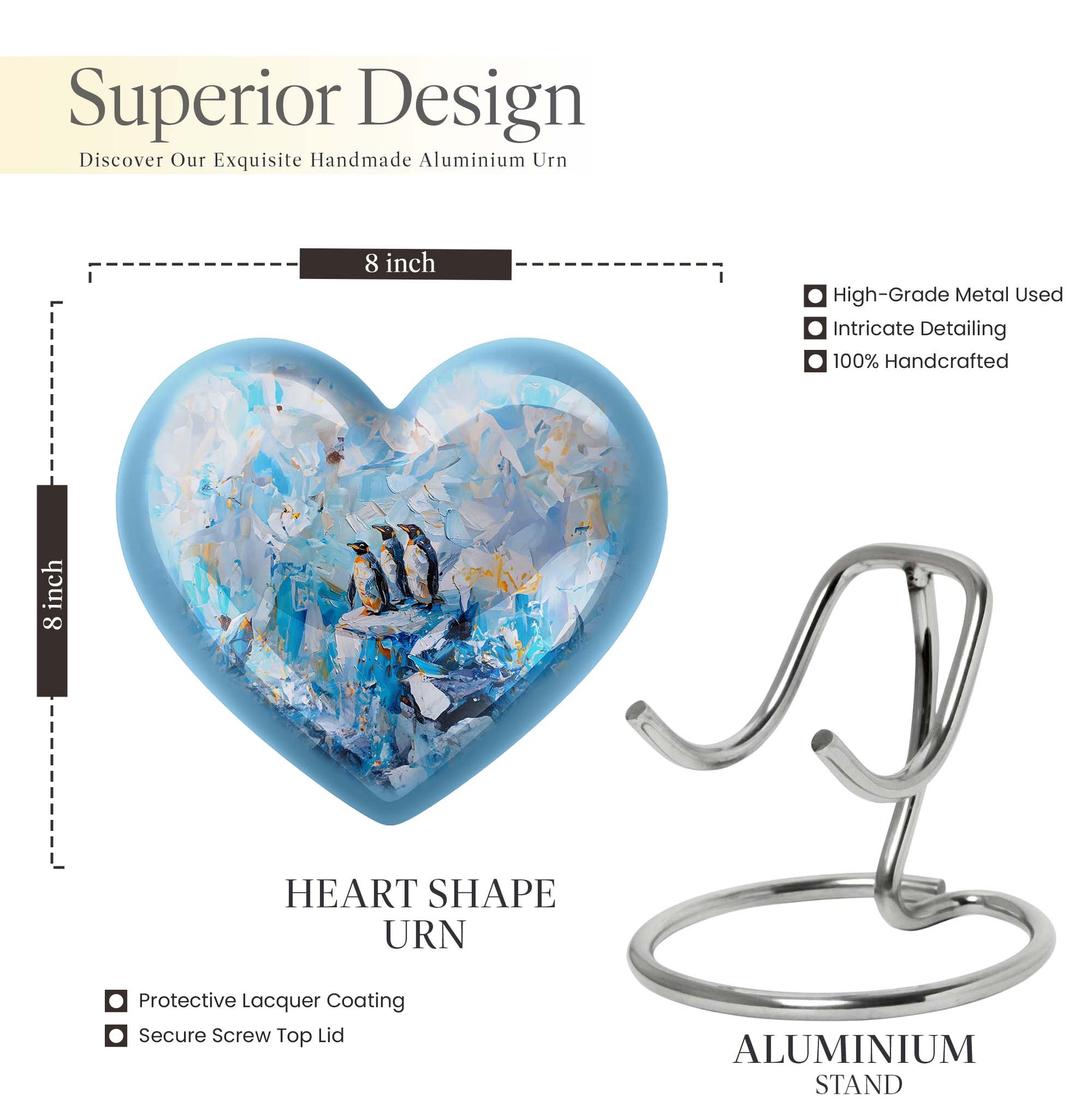 Embrace memories while setting spirits free with our exquisite Penguin Urn, precisely crafted for coalescing elegance with emotions. Engineered from robust aluminium alloy, this funeral urn for ashes for men demonstrates not just the memorialization of a life well-lived, but also a beautiful homage. The 10-inch large urn showcases an intricate butterfly-themed heart design, symbolizing transition, and transformation. Its 200 cubic inch capacity generously accommodates ashes, can be tucked away securely in the included velvet pouch. With a weight of 3.3 pounds, this cremation urn exhibits stability and permanency. Personalize with engraved names and make this unique penguin urn truly your own. Honoring individuals through time-honoured traditional urns, human burial urns, and memorial human urns for ashes. Let us bring comfort to your cherished remembrances.