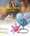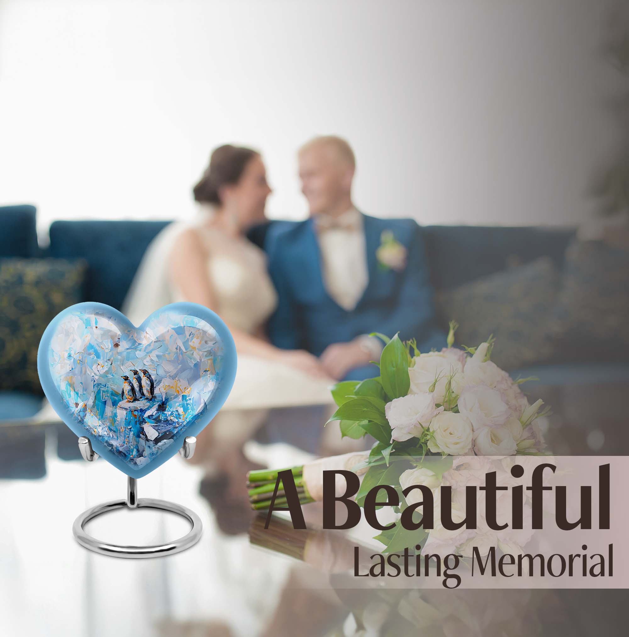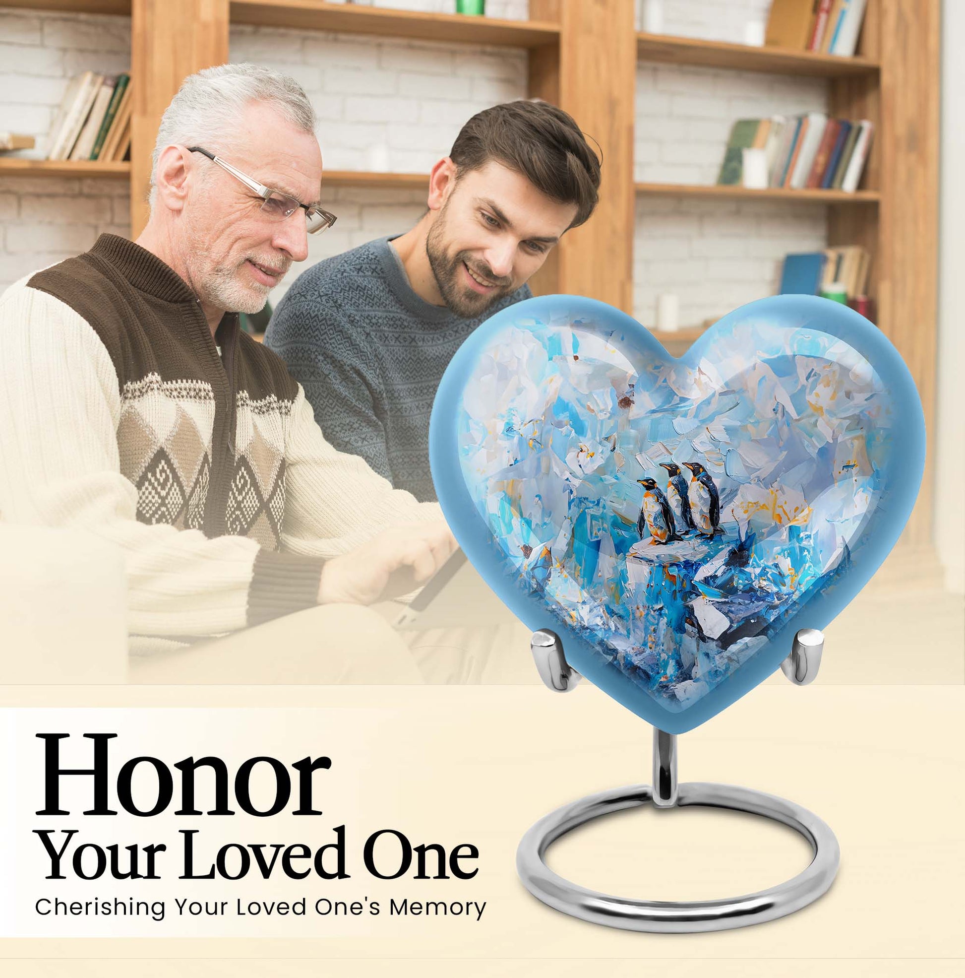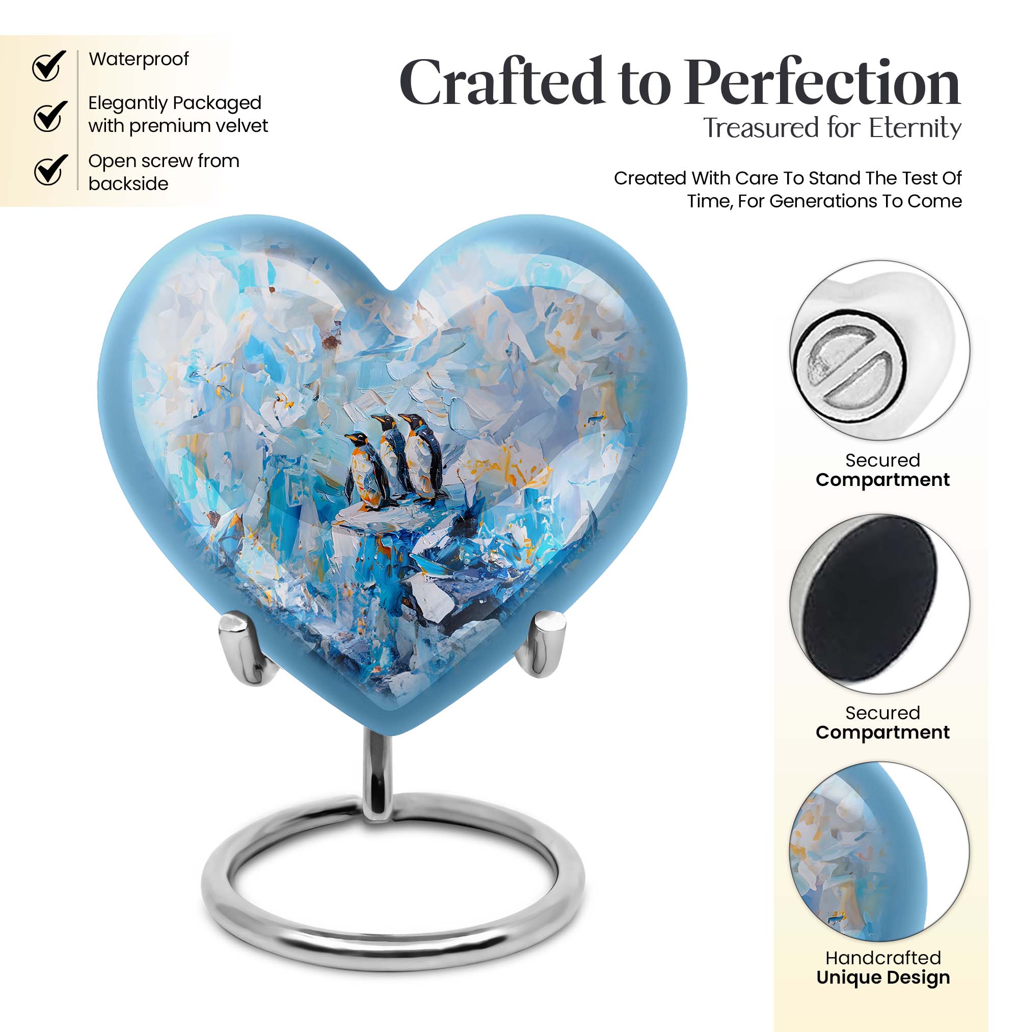 Embrace memories while setting spirits free with our exquisite Penguin Urn, precisely crafted for coalescing elegance with emotions. Engineered from robust aluminium alloy, this funeral urn for ashes for men demonstrates not just the memorialization of a life well-lived, but also a beautiful homage. The 10-inch large urn showcases an intricate butterfly-themed heart design, symbolizing transition, and transformation. Its 200 cubic inch capacity generously accommodates ashes, can be tucked away securely in the included velvet pouch. With a weight of 3.3 pounds, this cremation urn exhibits stability and permanency. Personalize with engraved names and make this unique penguin urn truly your own. Honoring individuals through time-honoured traditional urns, human burial urns, and memorial human urns for ashes. Let us bring comfort to your cherished remembrances.
