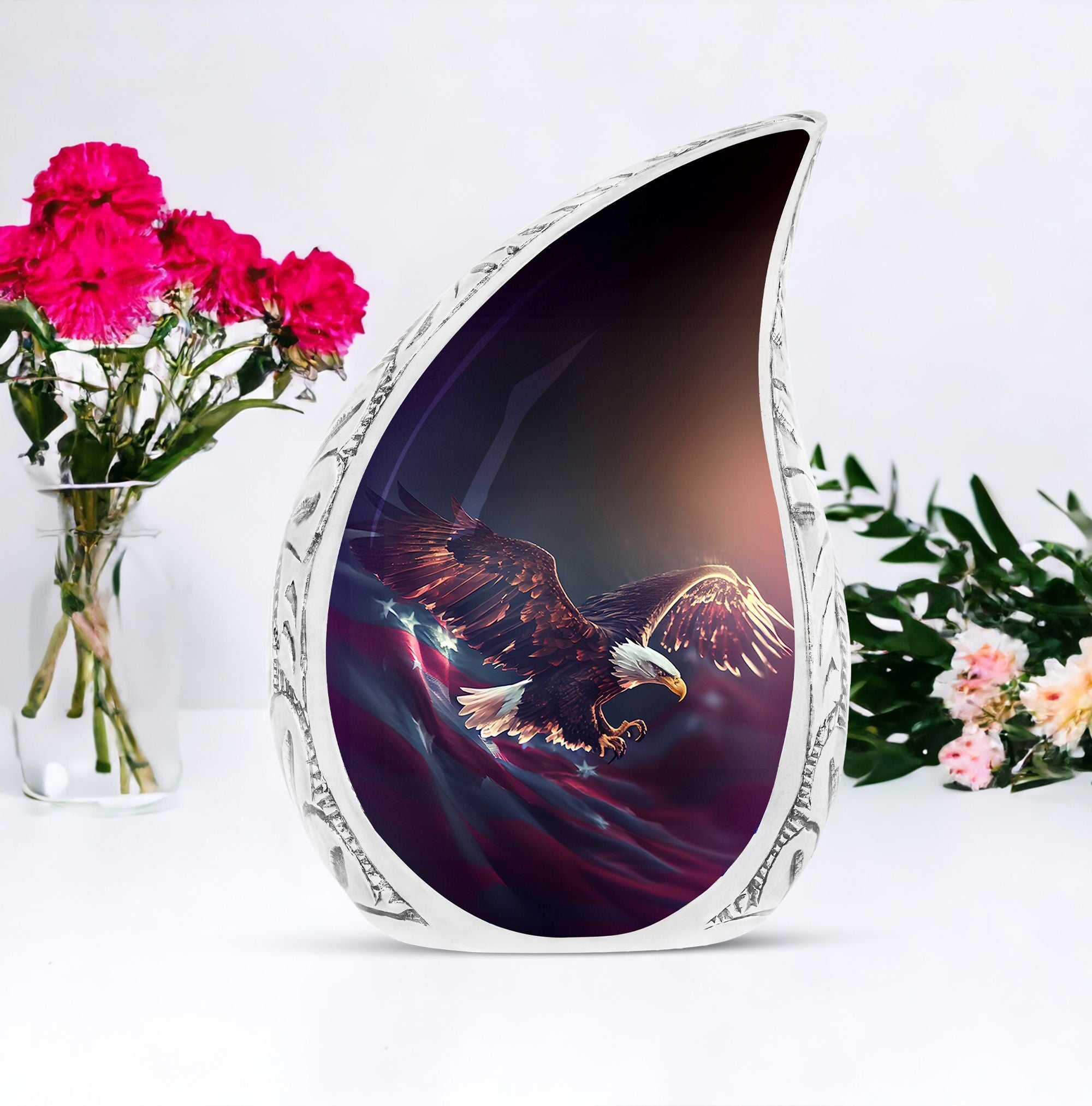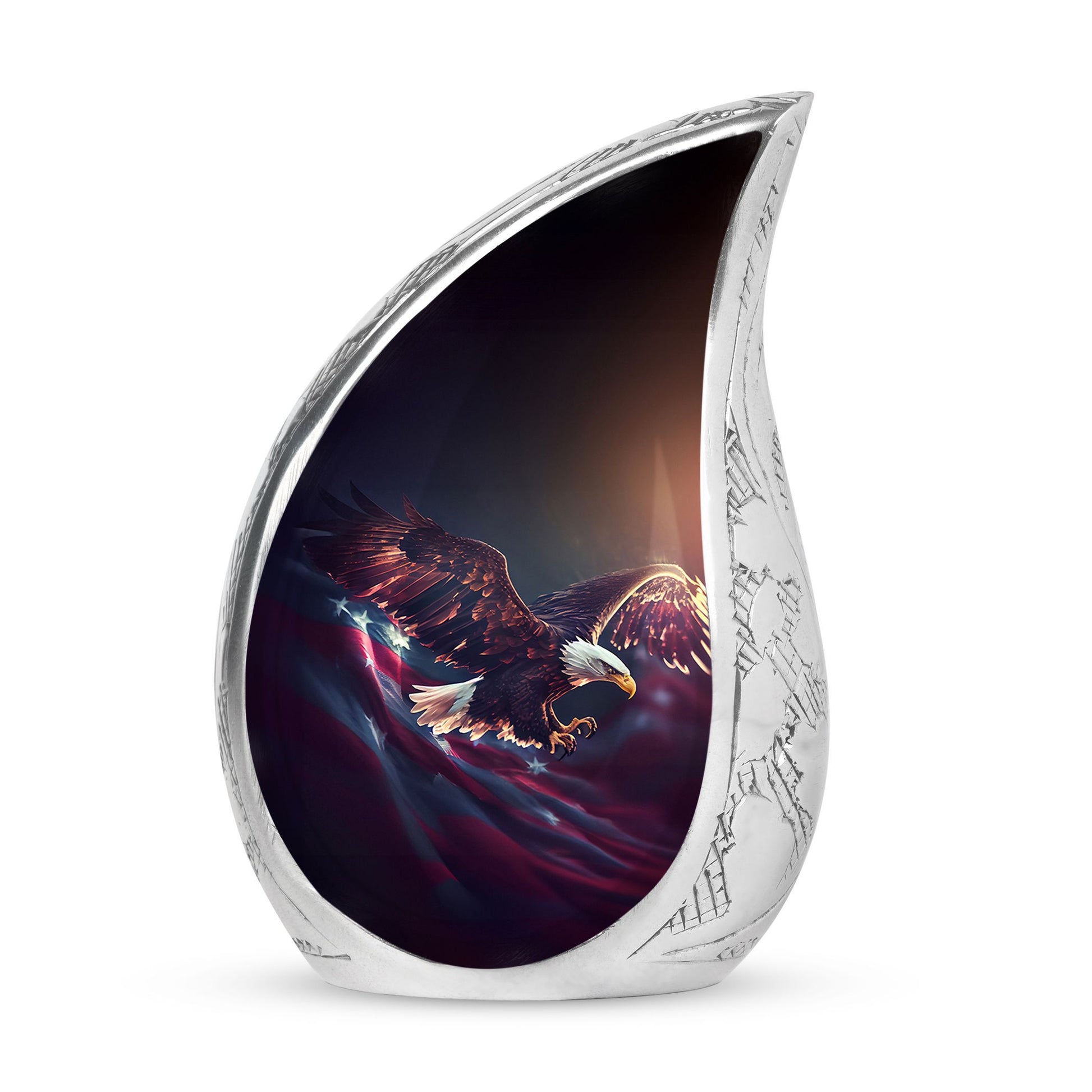 Discover a fitting tribute to your departed with a beautifully constructed Flying Eagle Urn for Ashes. These large-sized, aluminium urns epitomize a grandeur befitting an unforgettable legacy. Each urn measures 10 inches in height, with a spacious capacity of 200 cubic inches suitable for containment of ashes. Despite the large size, the urn is lightweight at only 3.3 pounds, making it convenient to relocate if needed. The package's unique addition, a velvet pouch, adds an extra layer of protection and elegance to your loved ones' ashes. As a personal touch, customization is offered, allowing you to engrave names and send forth a lasting memory. Remember the ones who have flown away with an urn that equates their irreplaceable presence. Breathtaking in design and supreme in make, these urns speak volumes in silent remembrance. Bestow honor upon honor, with our Flying Eagle Urn for Ashes—symbolizing ascension, freedom and an unforgettable memory.