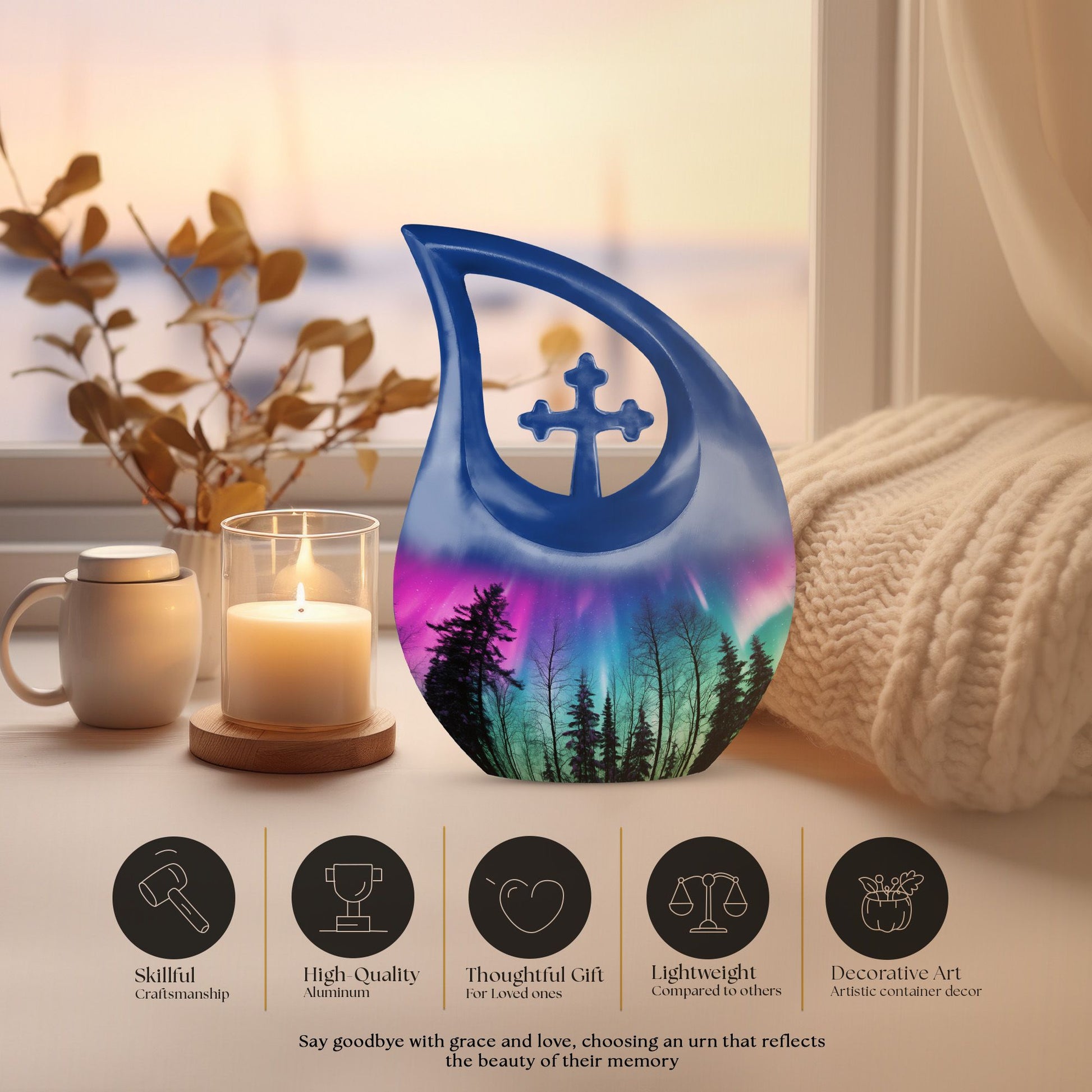 The Northern Lights Funeral Urn is a touching tribute to a cherished life, reflecting the beauty and serenity of the night sky. Crafted with compassion and care, this urn symbolizes everlasting peace — a fitting memorial for those we hold close to our hearts. Designed for dignity and strength, it serves as one of the most beautiful large cremation urns for celebrating a remarkable life.