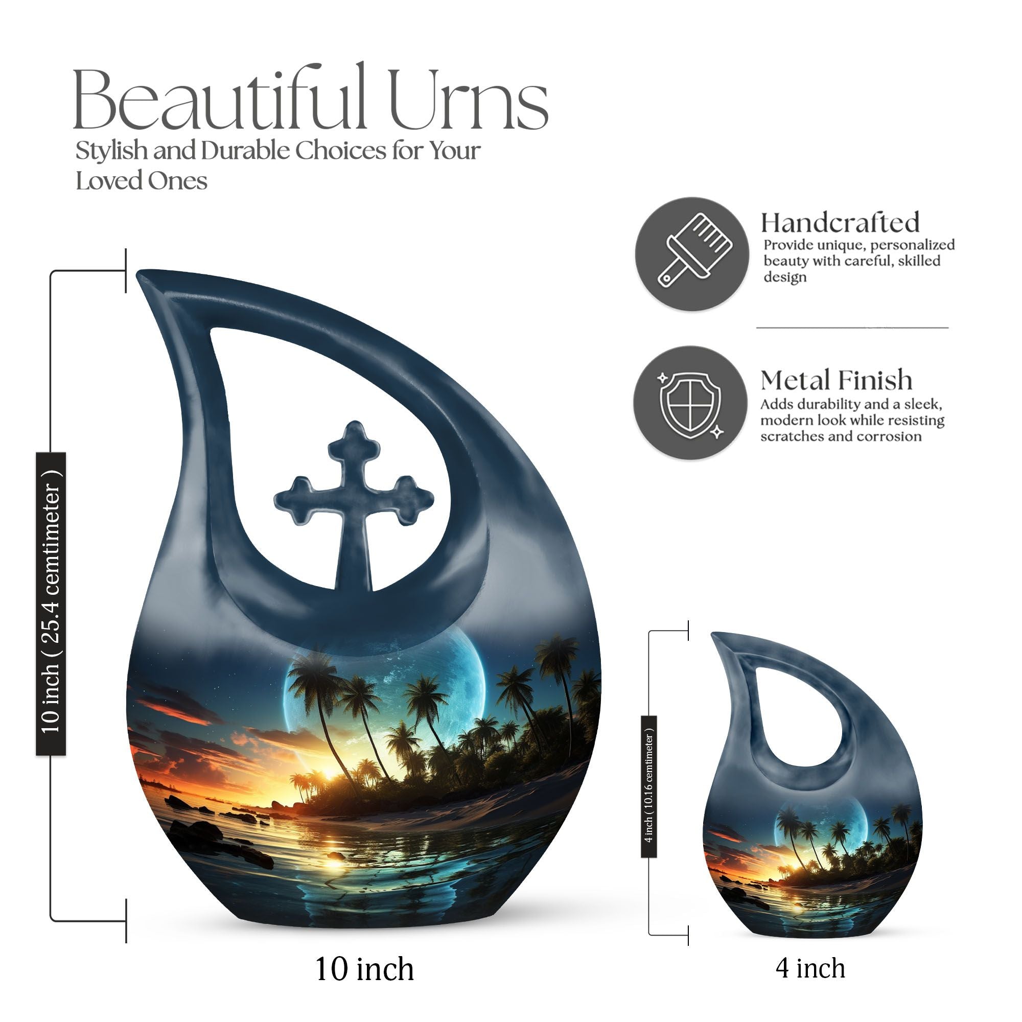 Crafted with care from durable aluminum, this funeral urn for men and women features a radiant hand-painted beach sunset with soft orange and blue tones. Its polished surface and refined detailing create a tranquil focal point for any memorial display. The secure screw-top lid ensures ashes remain safe and protected, while the 10-inch design offers ample capacity for adults. Whether chosen as a burial urn for ashes for women or a funeral urn for men, its artistry and craftsmanship convey dignity and peace.