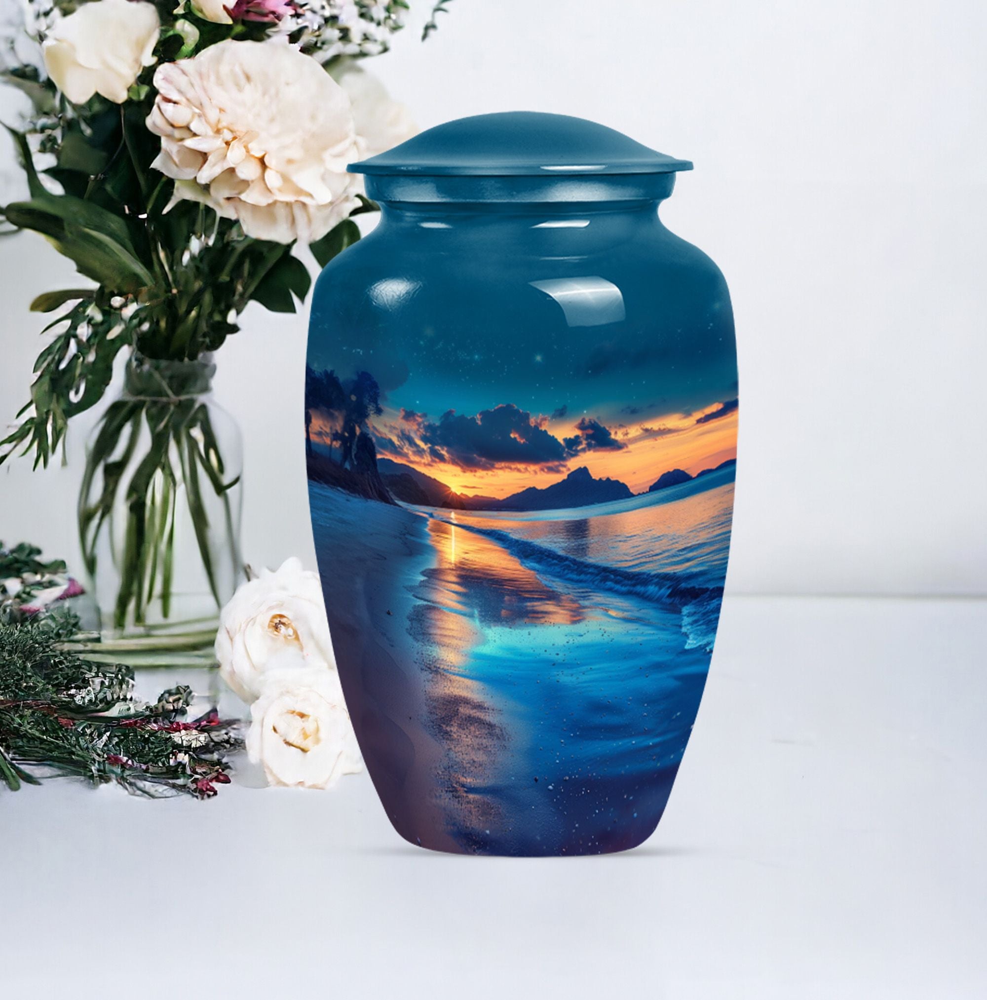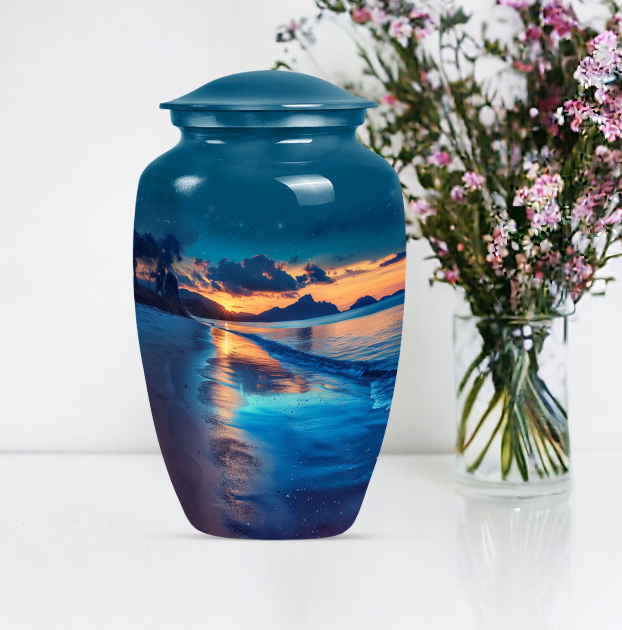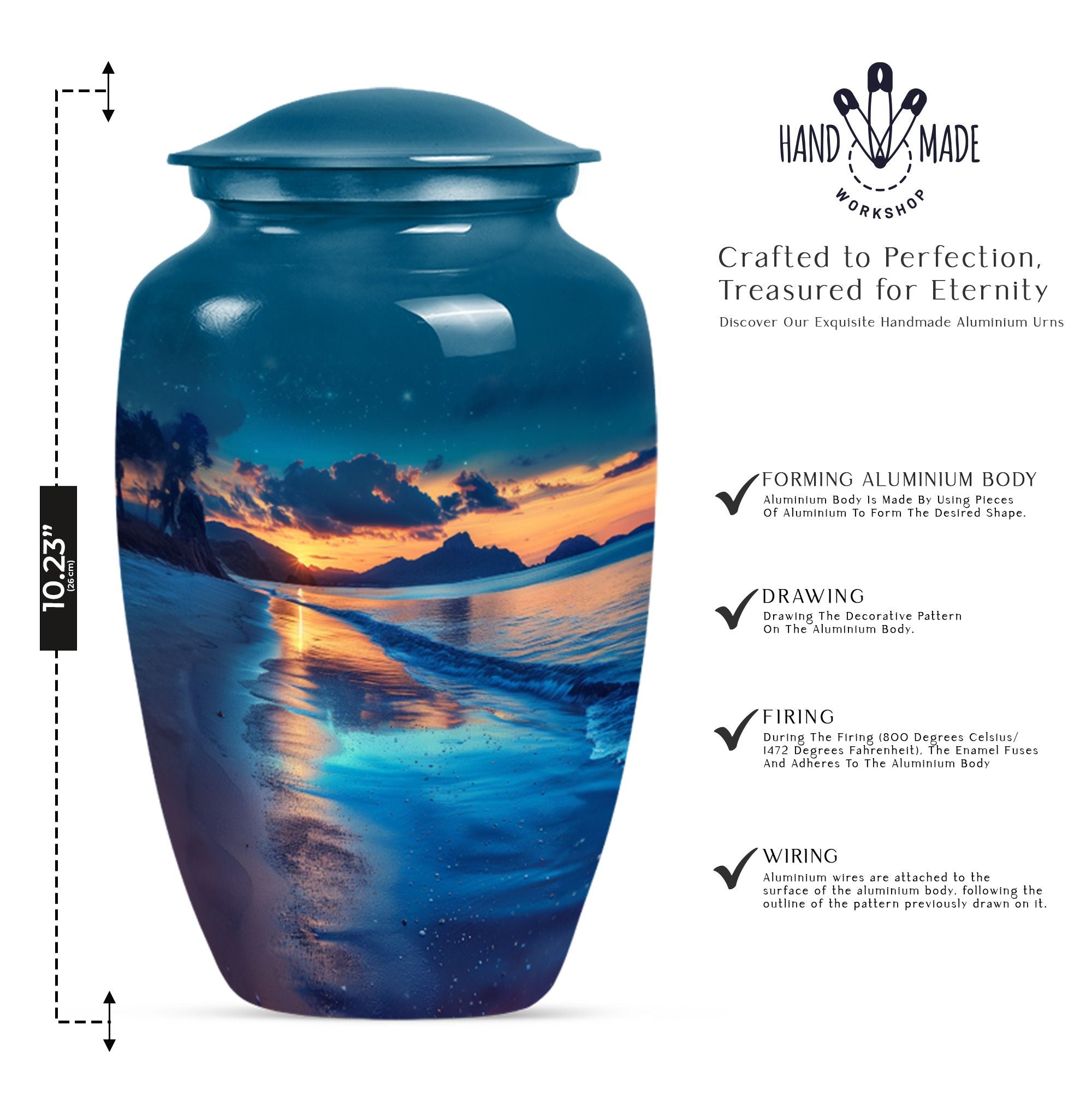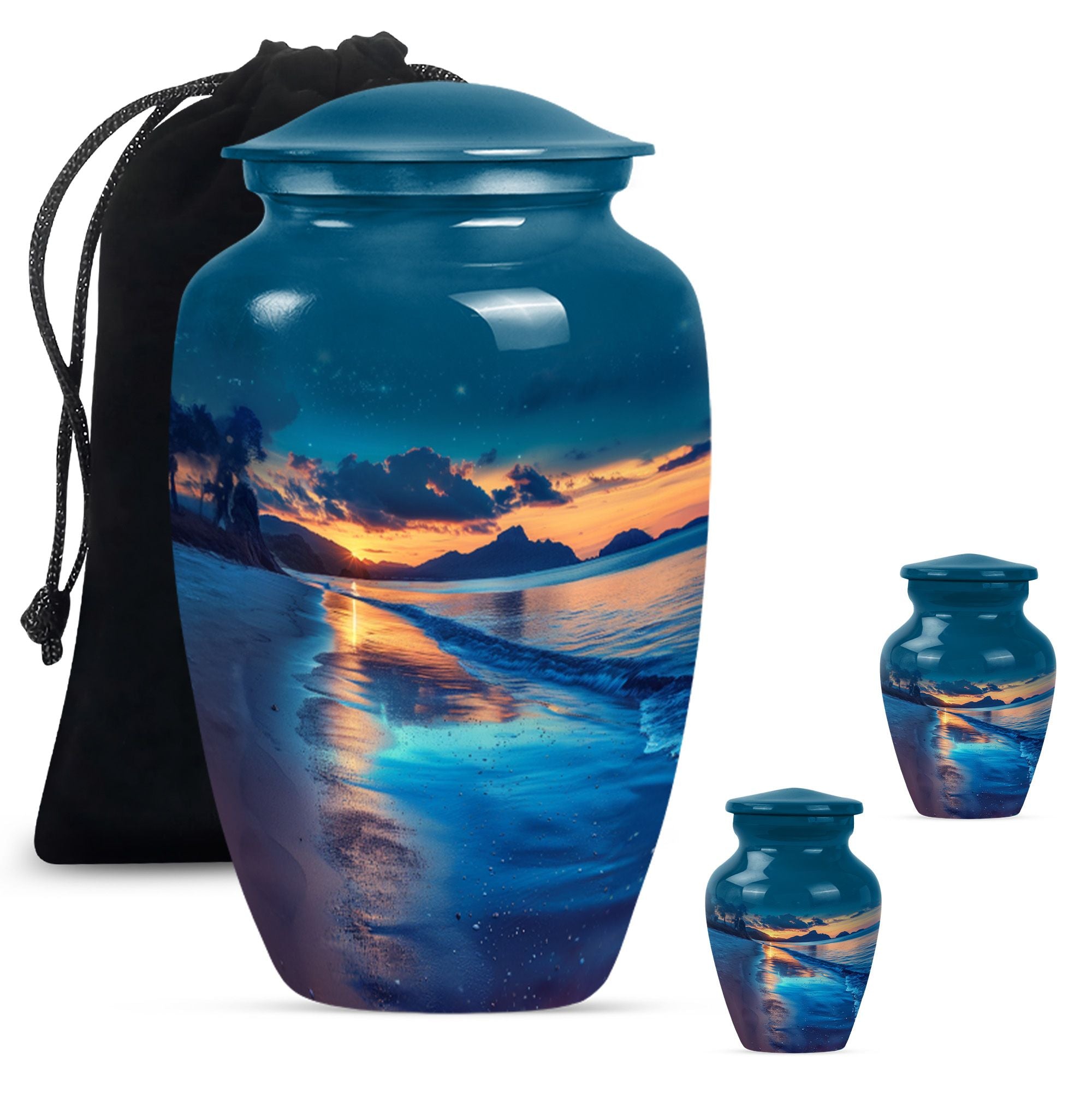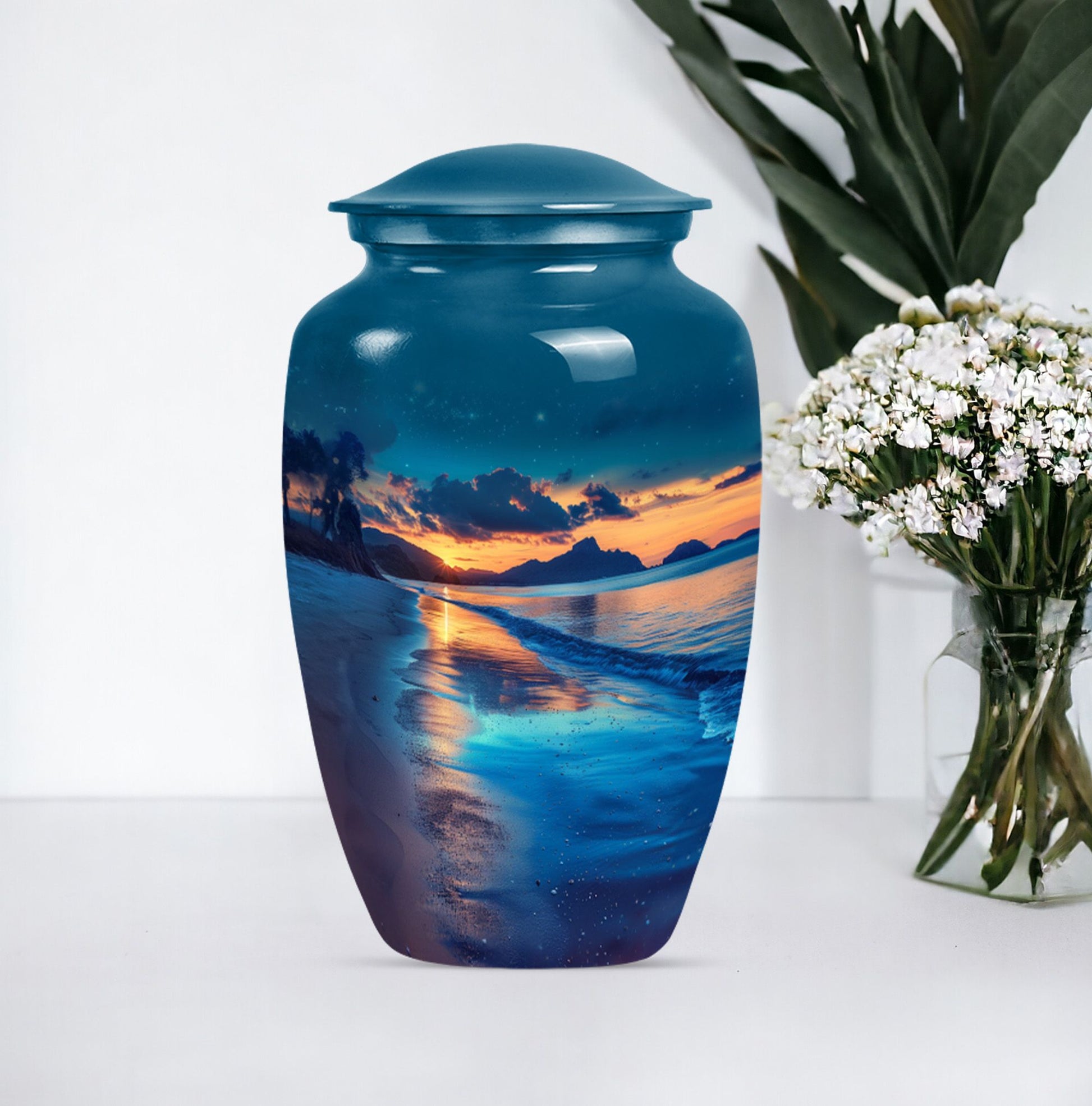 Honor your cherished one with our refined Galaxy Urn, meticulously crafted for preserving adult human ashes in a dignified way. This large funeral burial urn, elegantly designed with an abstract theme, stands 10 inches tall and offers a capacity of 200 cubic inches, making it ideal for containing ashes of your loved one. Manufactured from high-grade aluminium, our cremation urn assures robustness and durability. Weighing 3.3 pounds, it ensures stability on your mantelpiece or shelf, providing a profound presence. The concealed customization feature adds an intimate touch, allowing the personalization of the urn with engraved names. To further dignify this memorial ritual, the large urn comes with a velvet pouch for secure containment of ashes, preserving their sanctity. The Galaxy Urn, with its classic design, offers a serene resting place, a comforting symbol of the life and love you shared. This is a unique memento that combines timeless appeal and personal significance for those looking to commemorate their loved one.