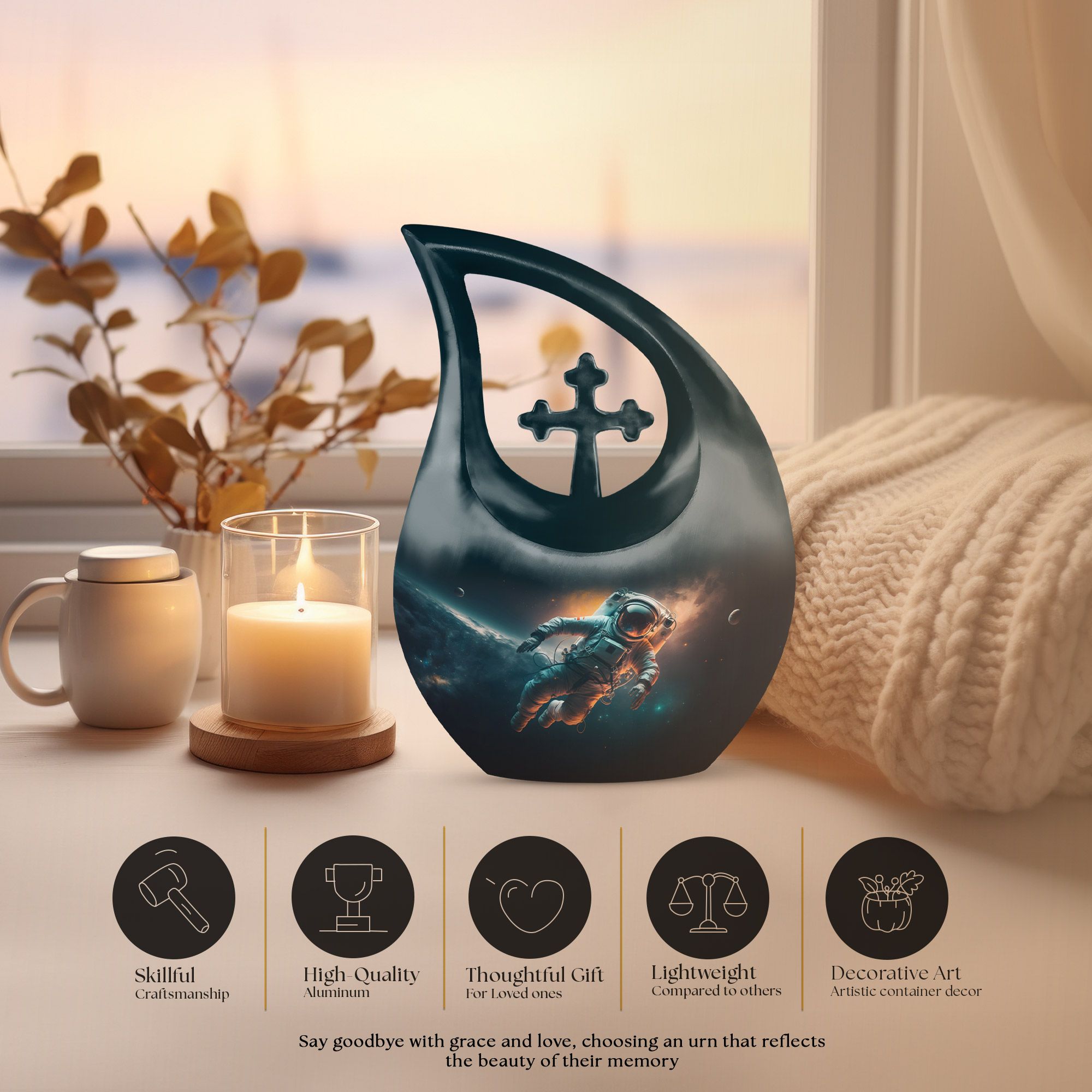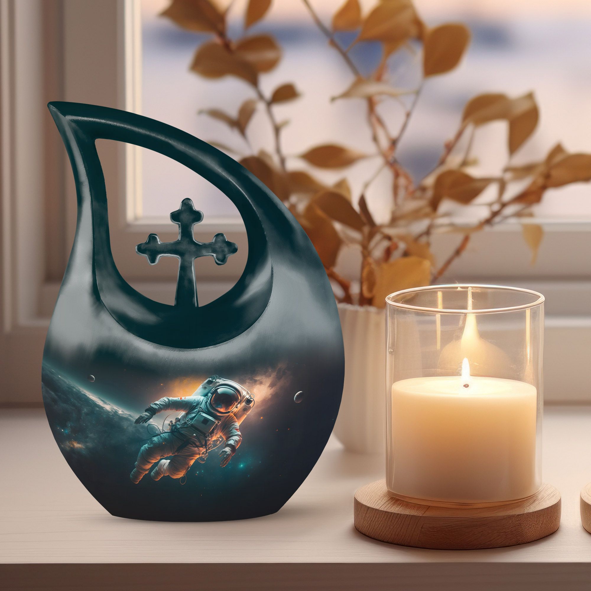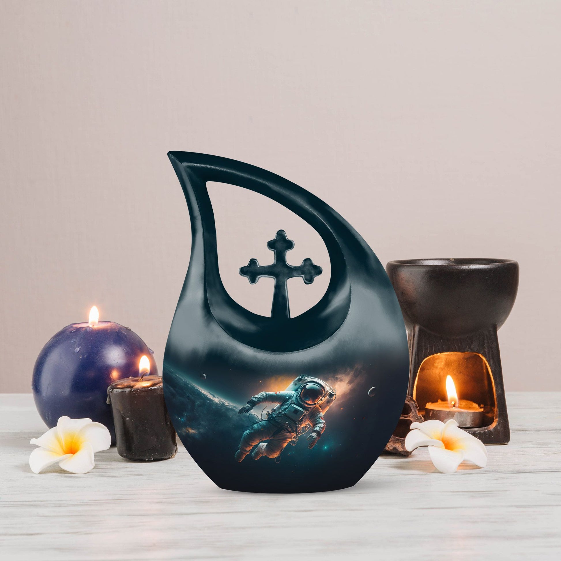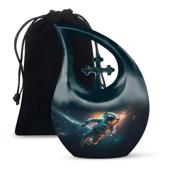 The Spacewalk Cremation Urn for Human Ashes celebrates a life of adventure, curiosity, and love that continues to shine across the universe. Its celestial design reflects the wonder of the cosmos, making it a touching tribute for a beloved parent. Ideal for families seeking adult cremation urns or cremation urns for ashes for men, it represents peace, love, and infinite remembrance.