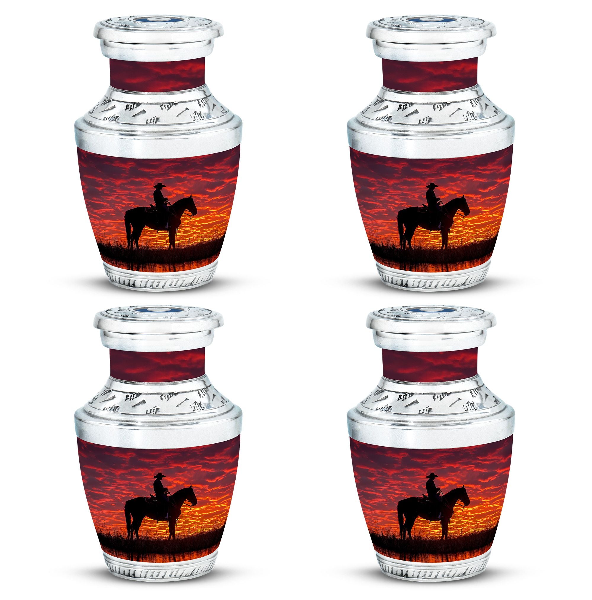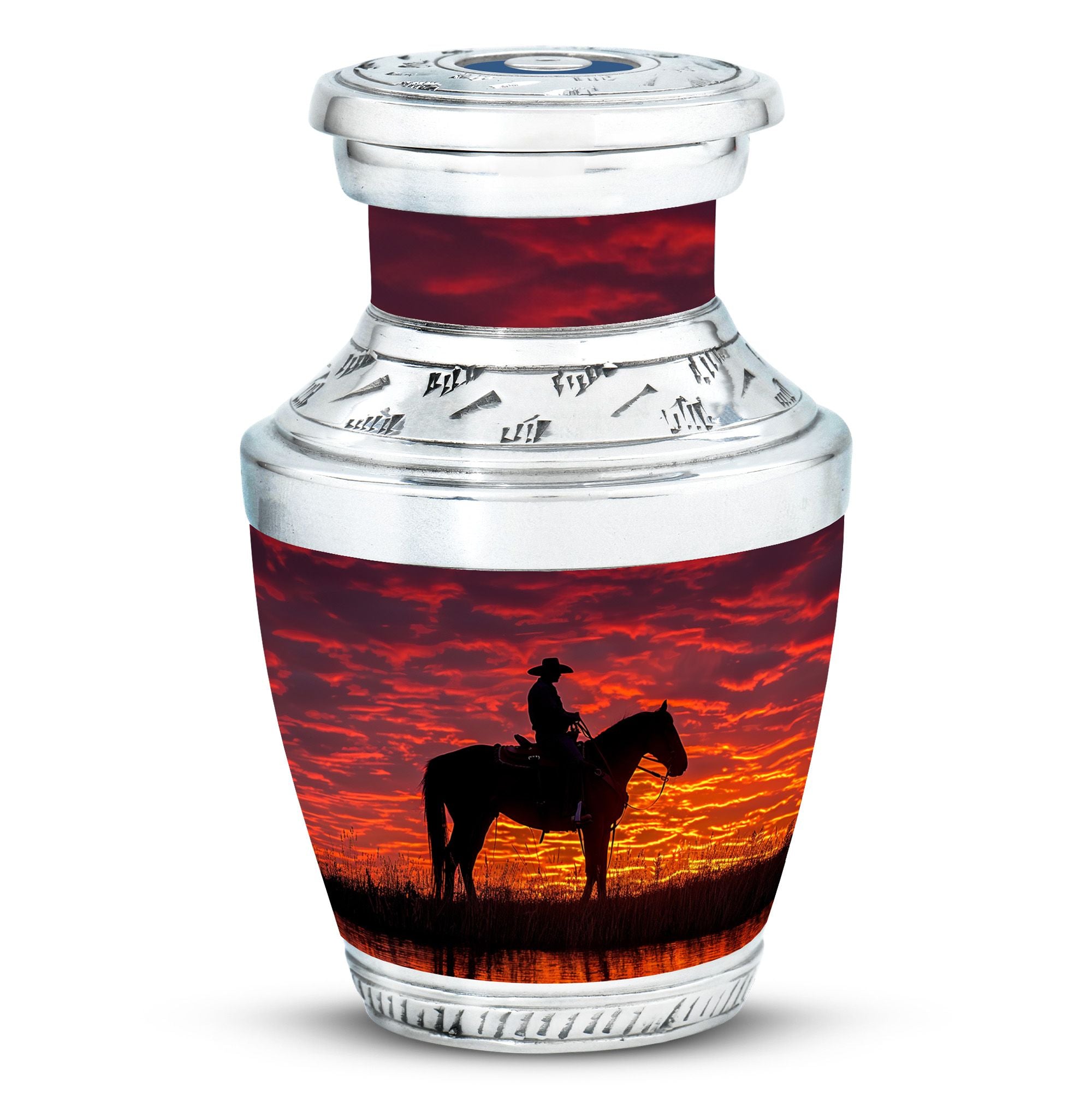 This urn is carefully crafted from durable aluminum to provide both strength and elegance. The colorful cowboy sunset design symbolizes resilience and spirit, making it a fitting tribute for fathers, brothers, or any beloved family member. With a secure screw-top lid, this adult funeral urn keeps ashes safe while its bold design ensures it stands out as one of the most unique urns for human ashes. Families also pair it with keepsake funeral urns or mini keepsake funeral urns to share smaller portions of ashes among relatives.