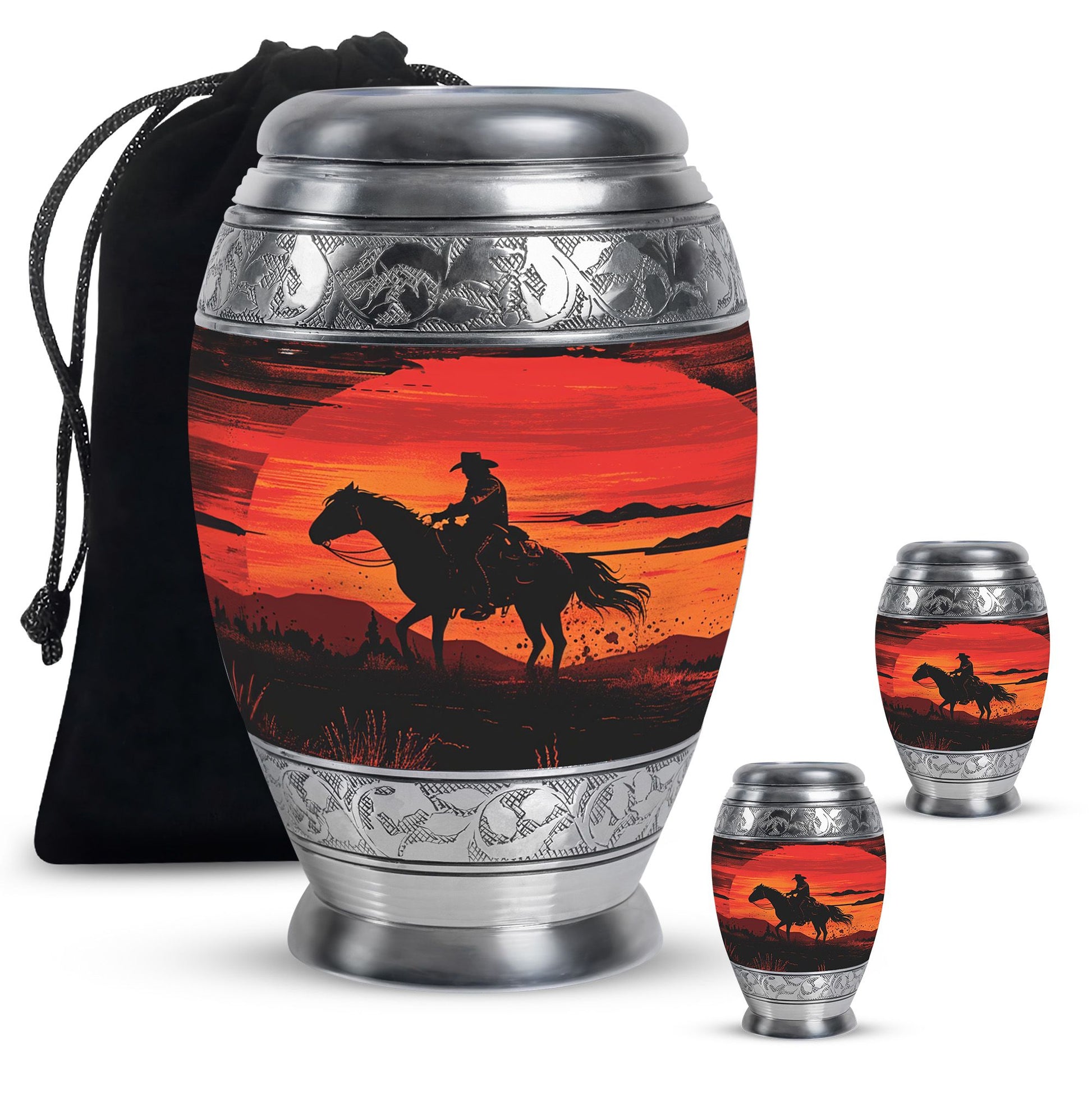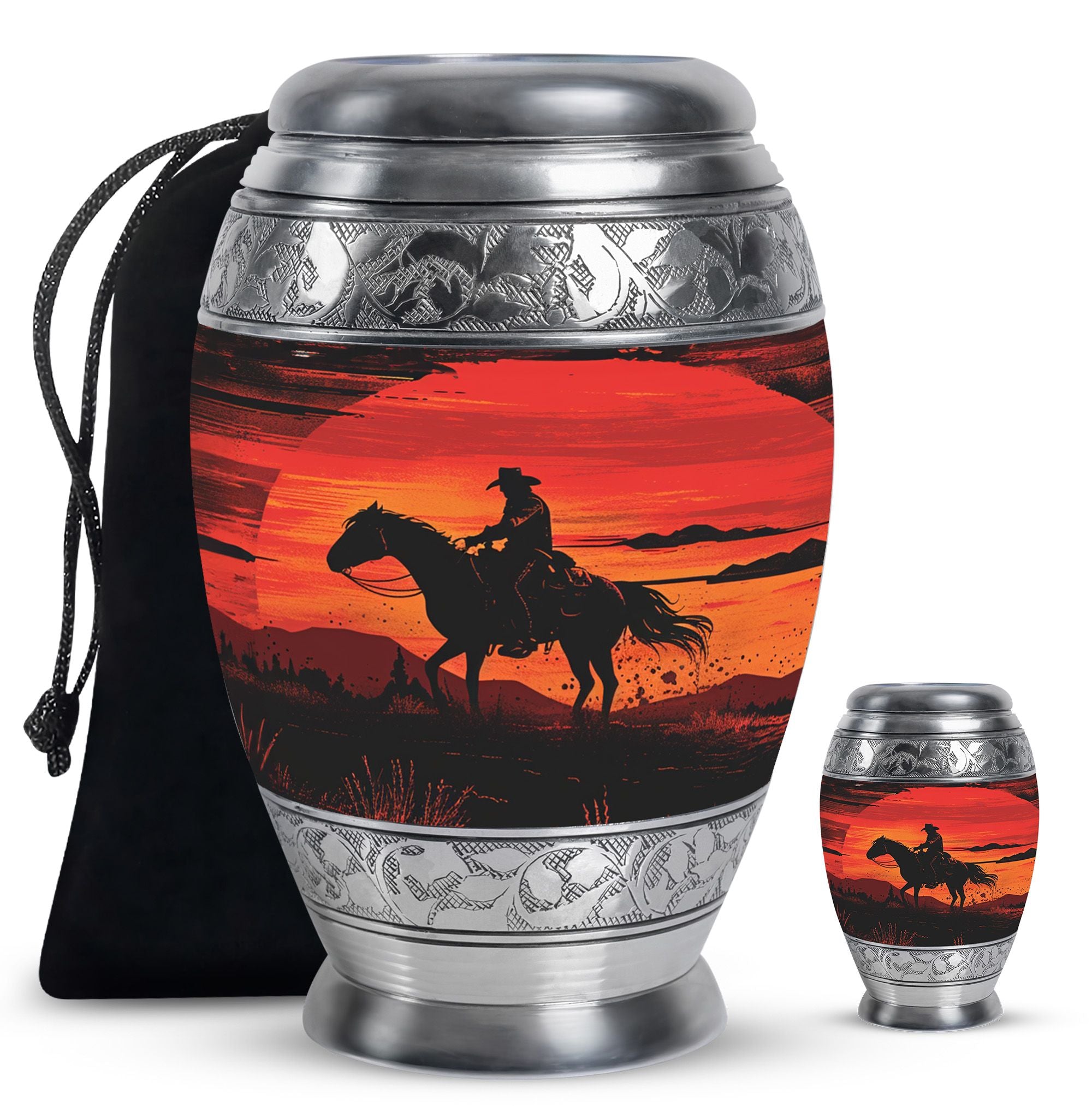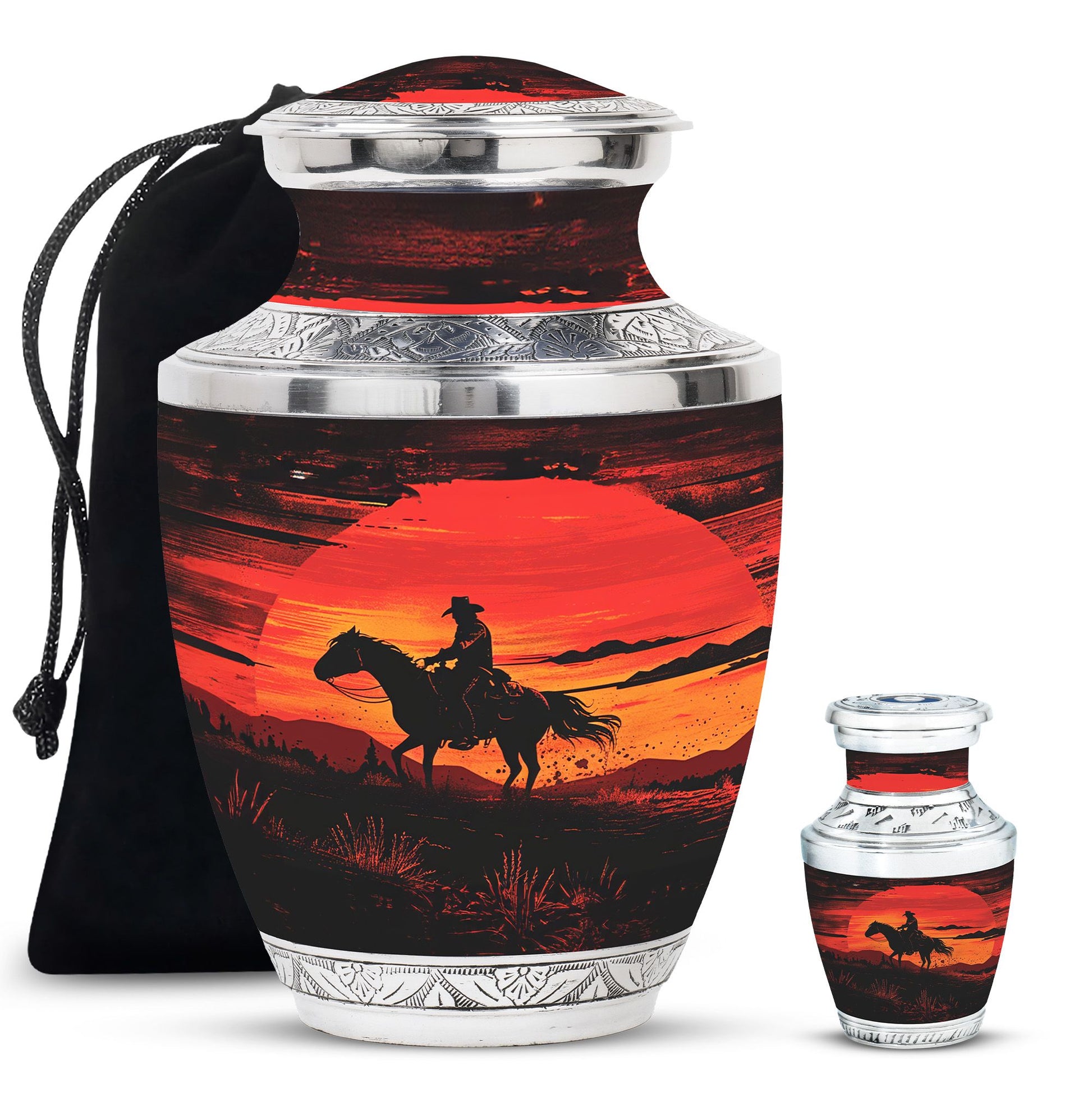 Handcrafted from durable aluminum, this urn set offers both strength and elegance. The rich sunset cowboy design symbolizes resilience, freedom, and love, making it a meaningful tribute for fathers, mothers, or any family member. The large cremation urn holds the full capacity of adult remains, while the smaller keepsake urn allows families to preserve a portion of ashes as a personal remembrance. With secure screw-top lids, both urns provide safety and peace of mind. Whether you are seeking large urns for human ashes adult female, urns for ashes adult male large, or simply a large human ashes urn with timeless design, this combo offers versatility and comfort.