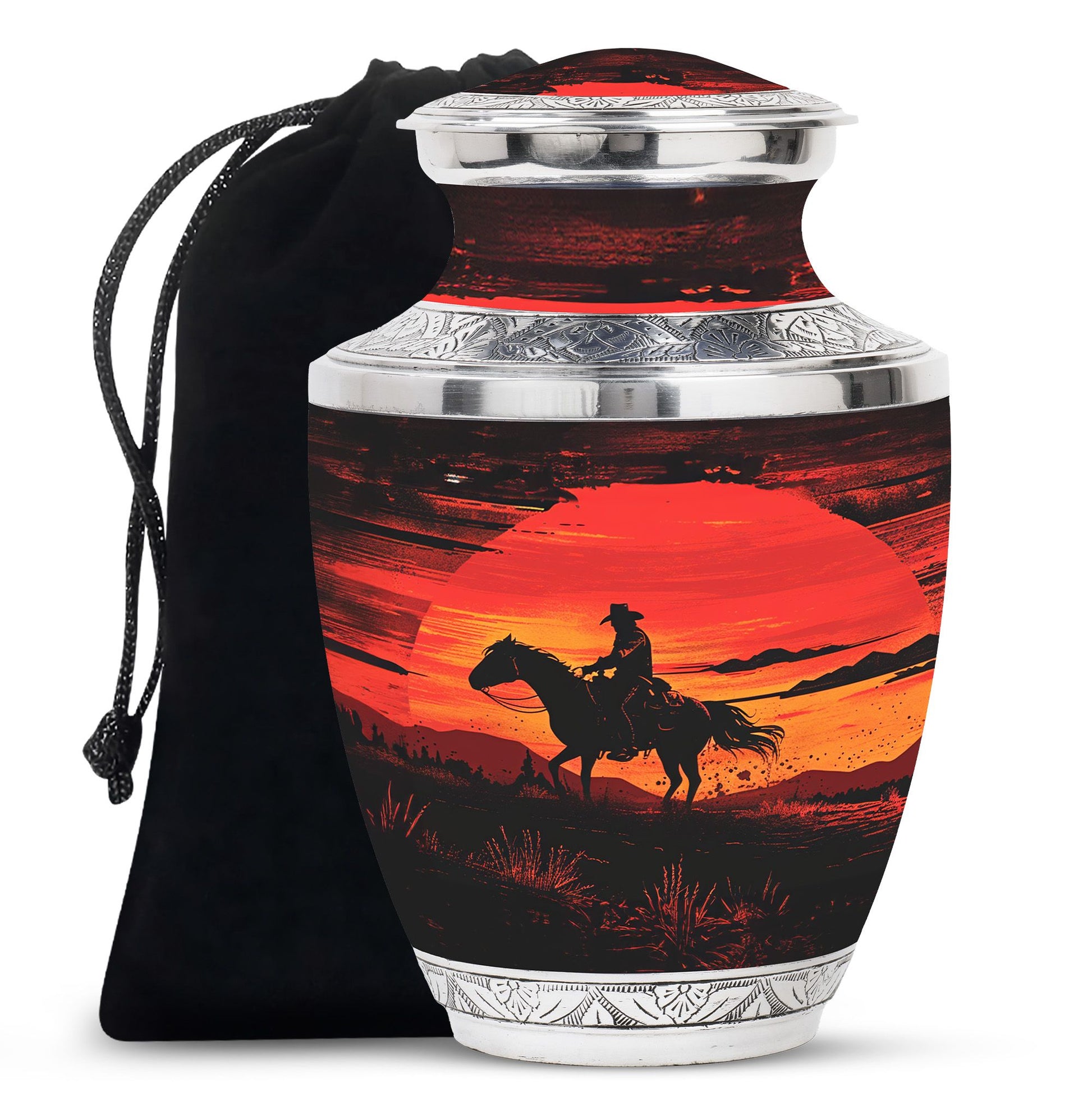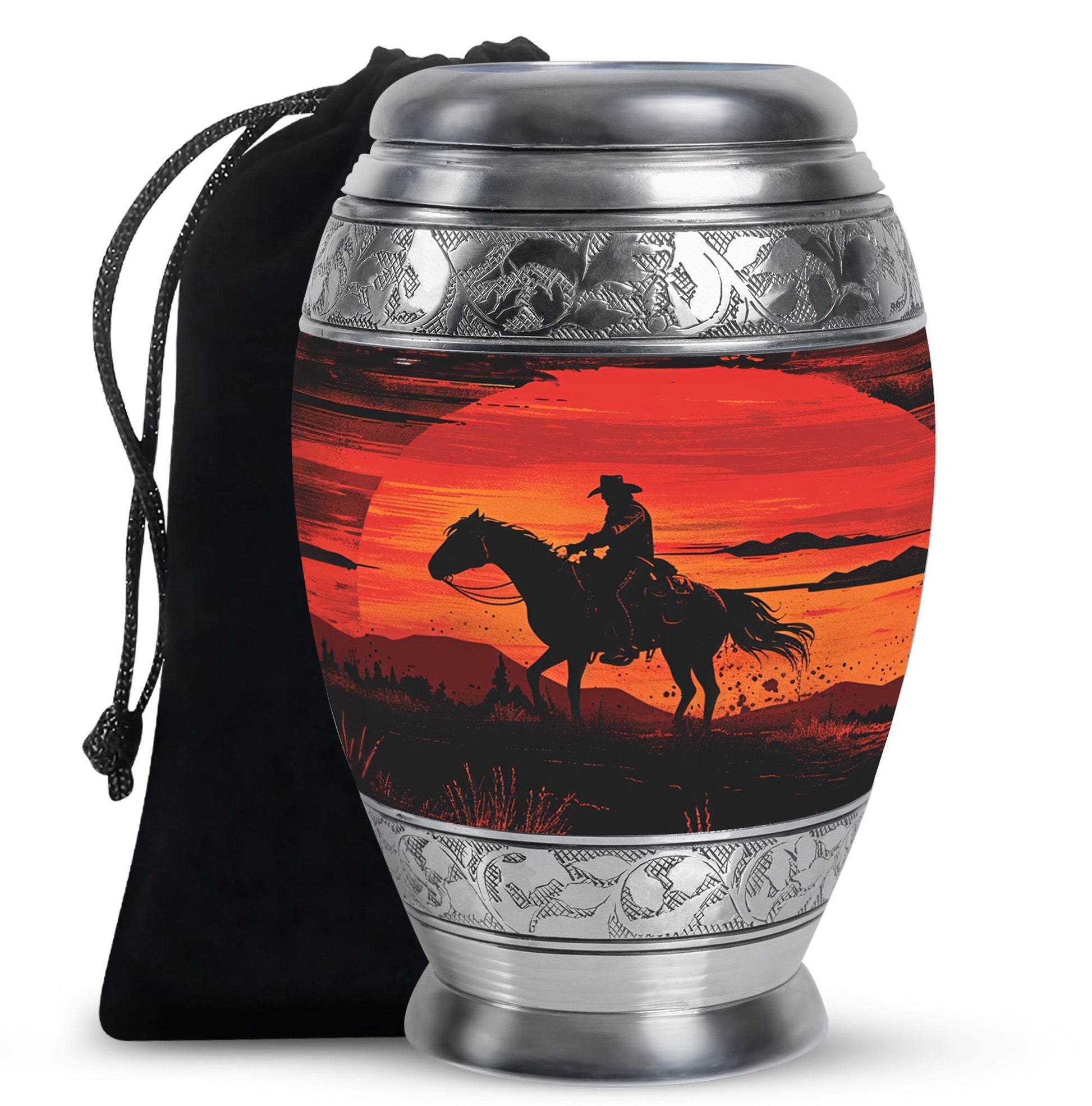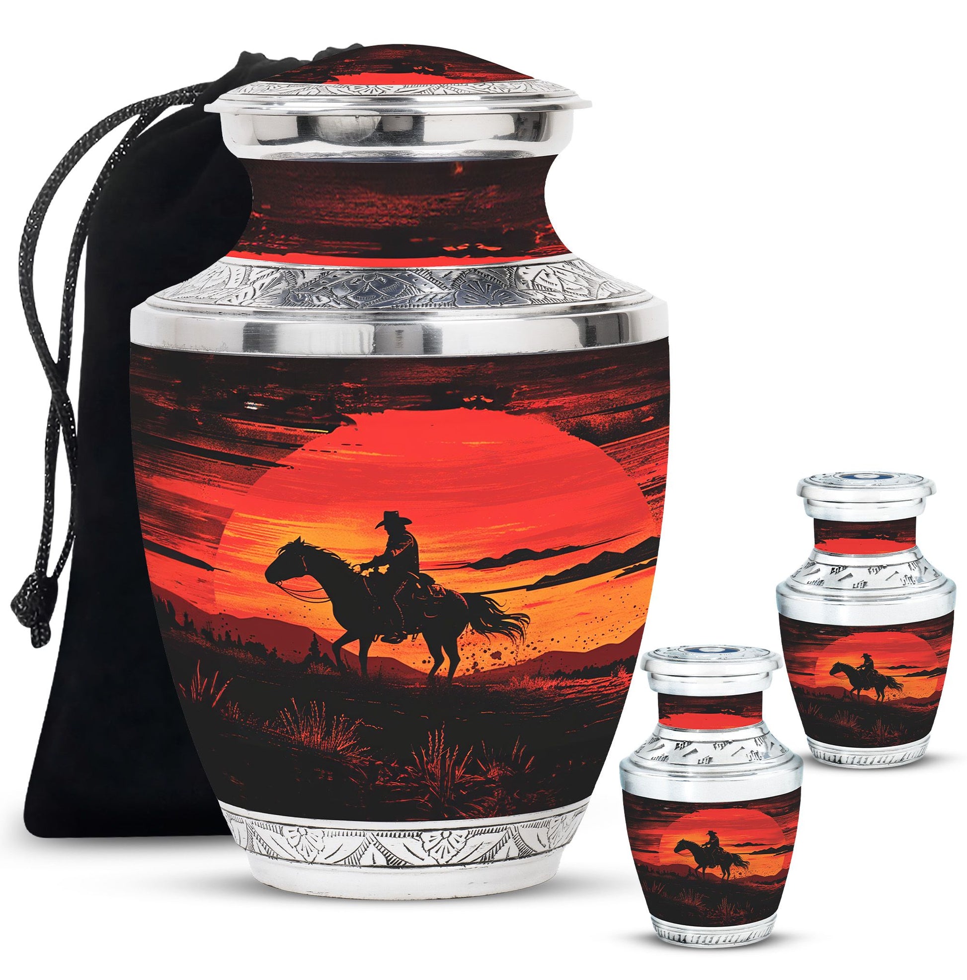 Handcrafted from durable aluminum, this urn set offers both strength and elegance. The rich sunset cowboy design symbolizes resilience, freedom, and love, making it a meaningful tribute for fathers, mothers, or any family member. The large cremation urn holds the full capacity of adult remains, while the smaller keepsake urn allows families to preserve a portion of ashes as a personal remembrance. With secure screw-top lids, both urns provide safety and peace of mind. Whether you are seeking large urns for human ashes adult female, urns for ashes adult male large, or simply a large human ashes urn with timeless design, this combo offers versatility and comfort.