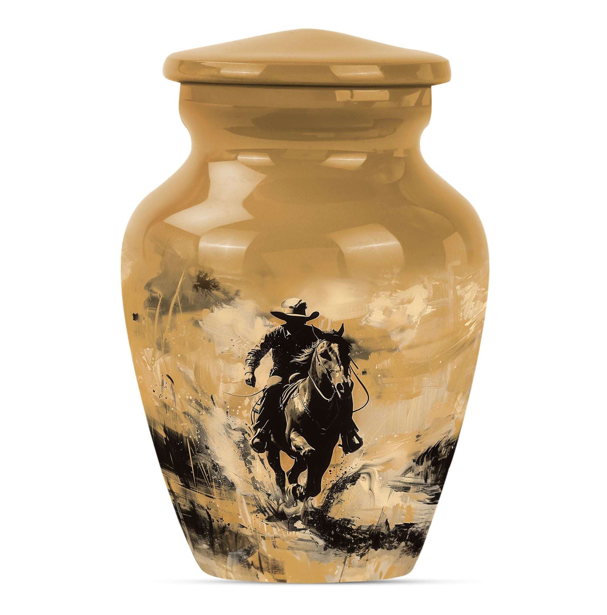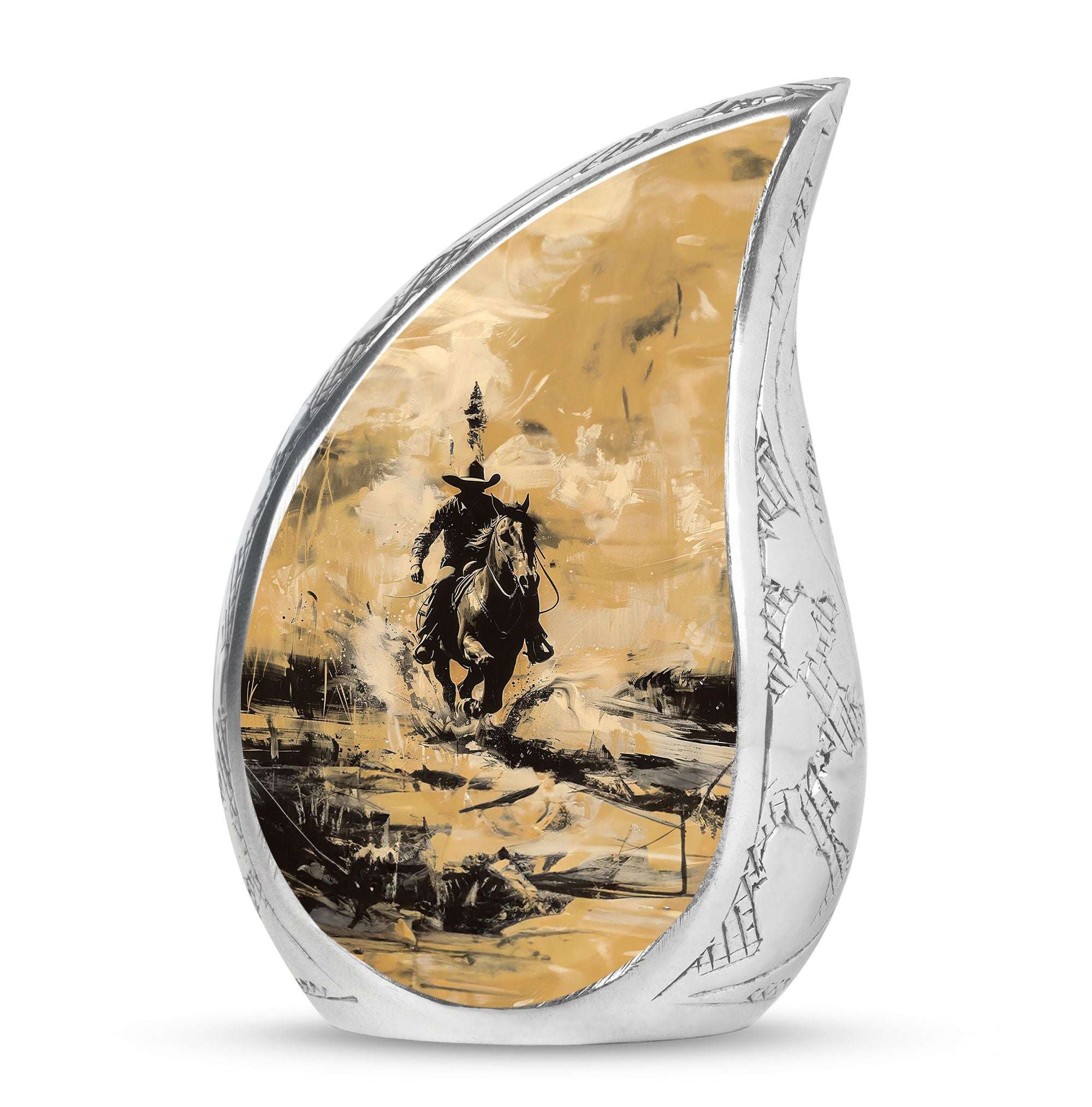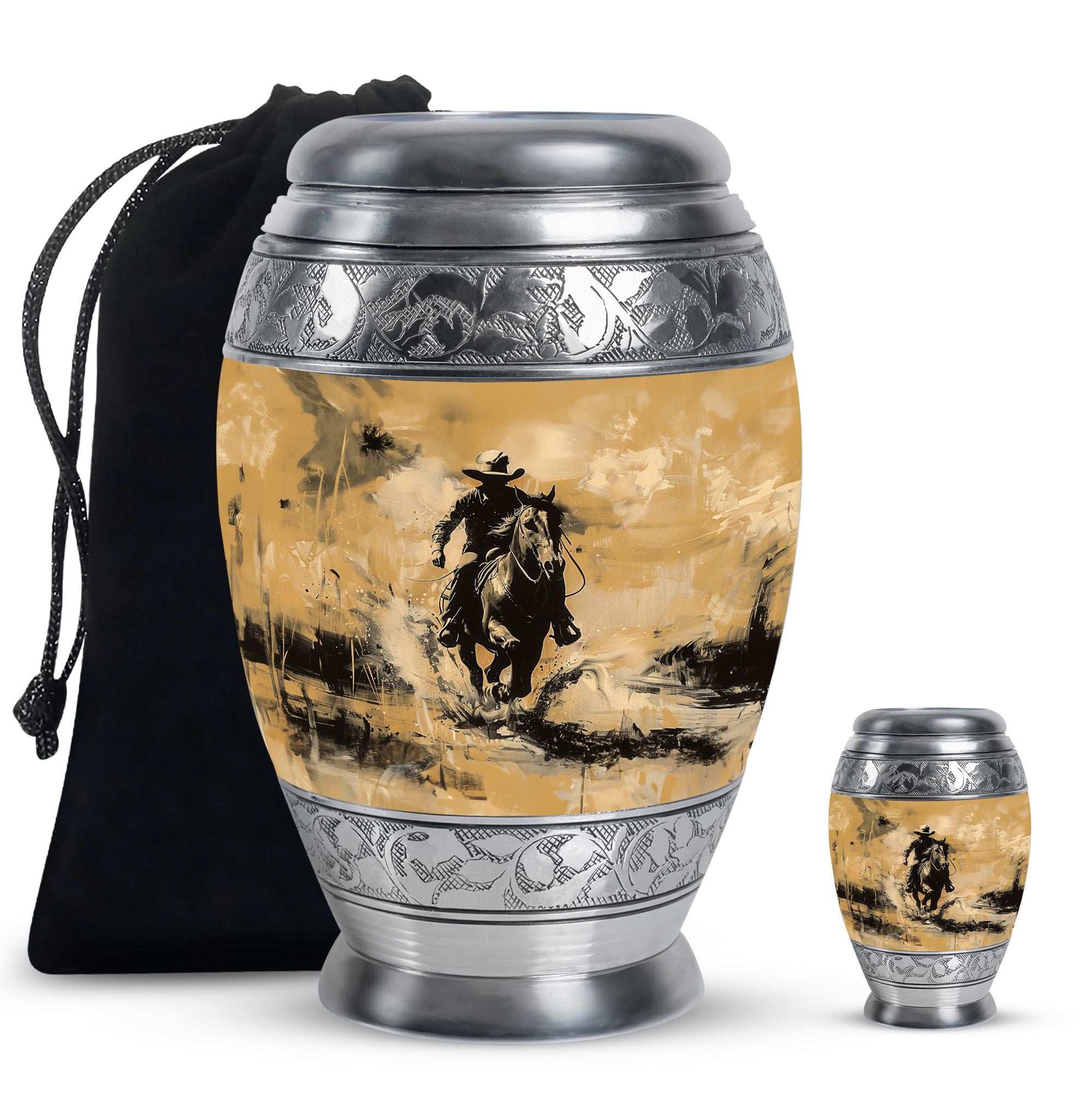 Made from durable aluminum, this large cremation urn combines resilience with timeless artistry. The vivid cowboy sunset design symbolizes freedom, independence, and spirit—making it a heartfelt choice for families. Its secure screw-top lid ensures ashes remain safely protected, while the polished Western-inspired finish allows it to serve as a striking display in the home or at memorial services. Families often select this design as cremation urns for large human ashes adult, adult urns for human ashes large, or large adult urns for human ashes.