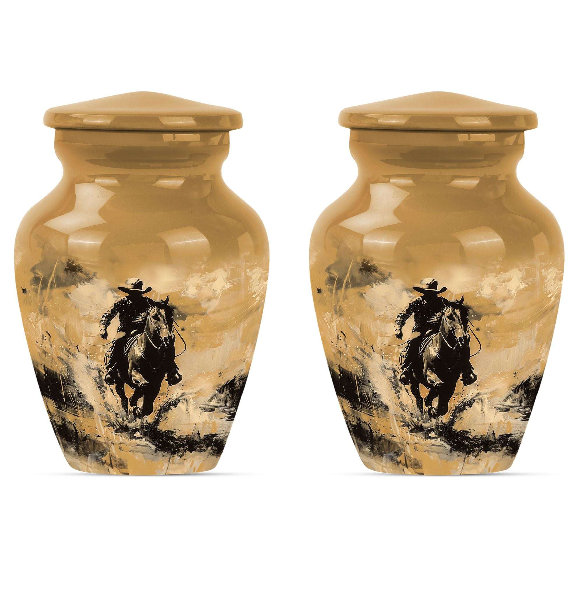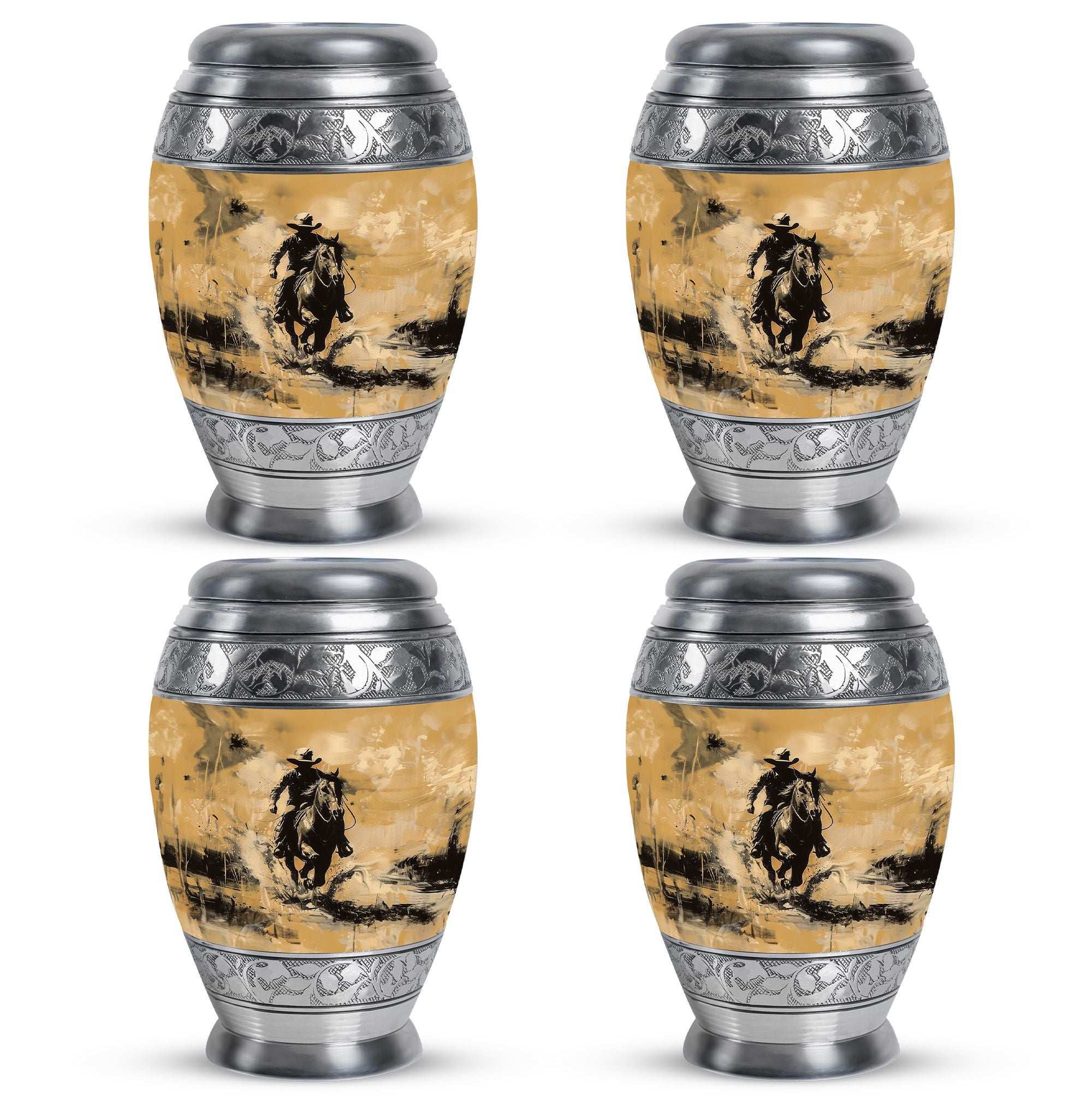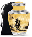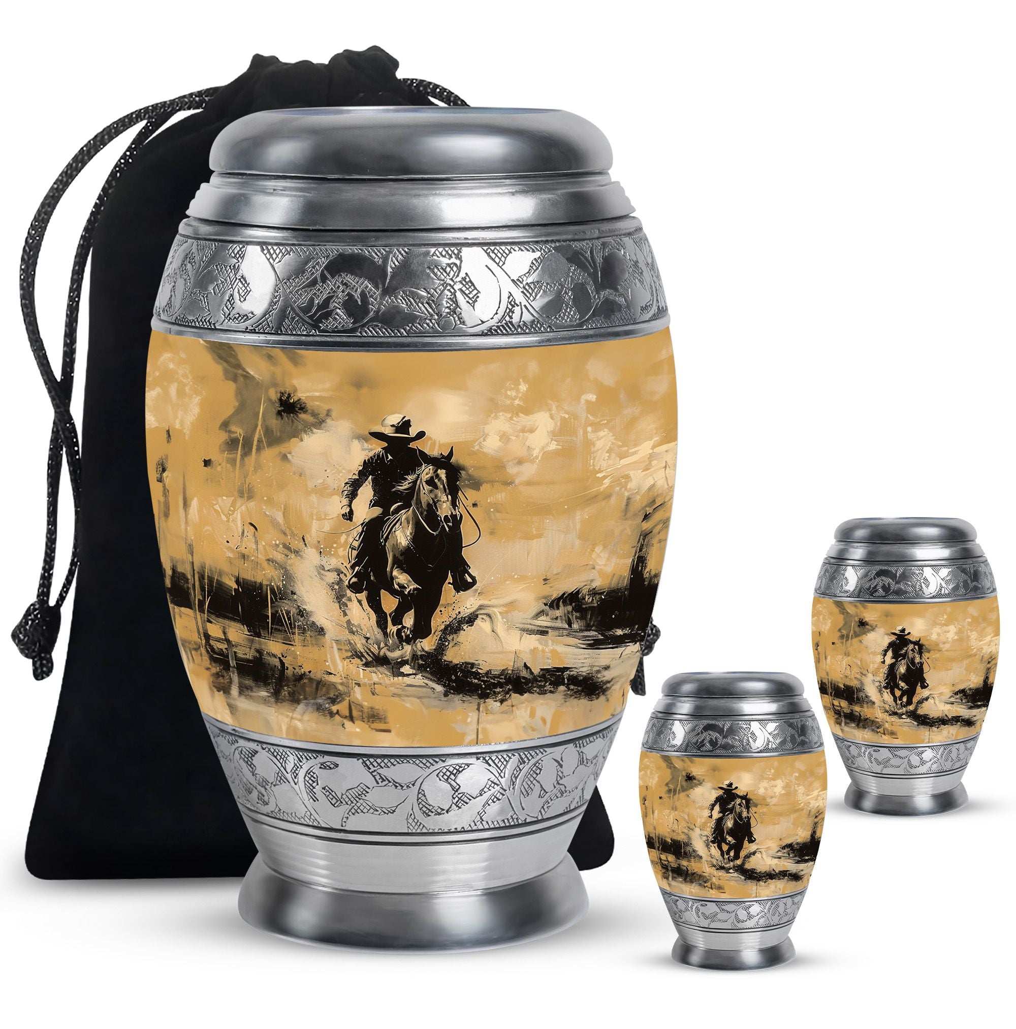 Made from durable aluminum, this large cremation urn combines resilience with timeless artistry. The vivid cowboy sunset design symbolizes freedom, independence, and spirit—making it a heartfelt choice for families. Its secure screw-top lid ensures ashes remain safely protected, while the polished Western-inspired finish allows it to serve as a striking display in the home or at memorial services. Families often select this design as cremation urns for large human ashes adult, adult urns for human ashes large, or large adult urns for human ashes.
