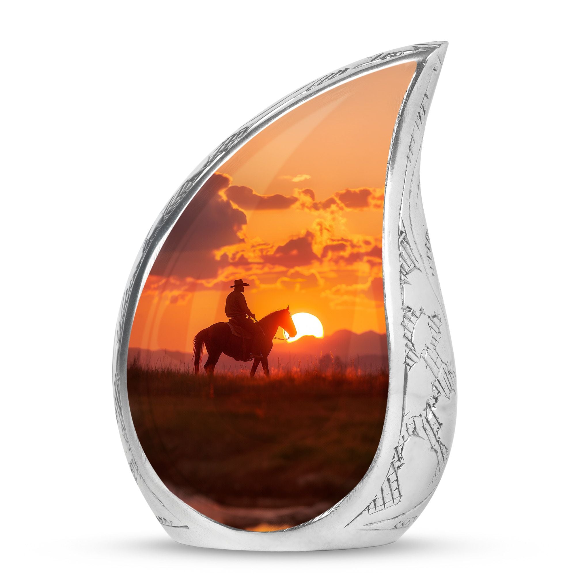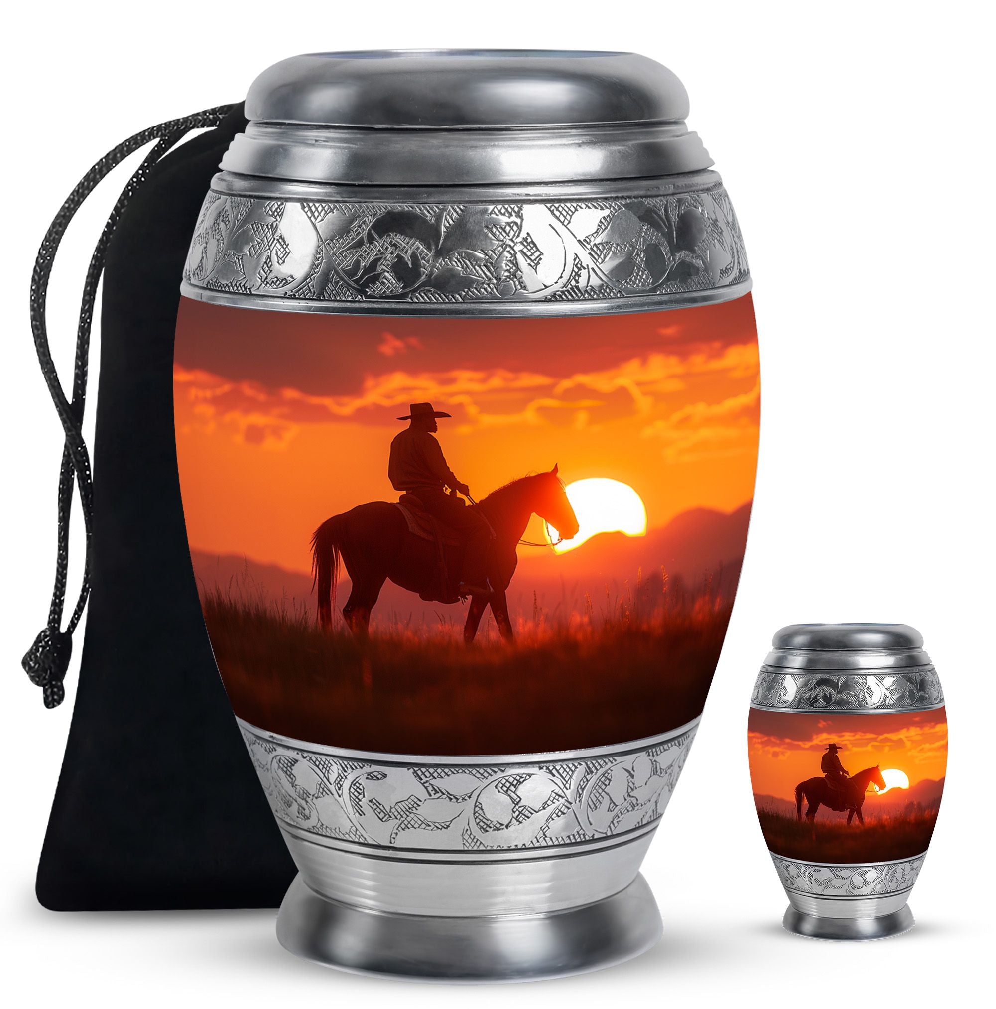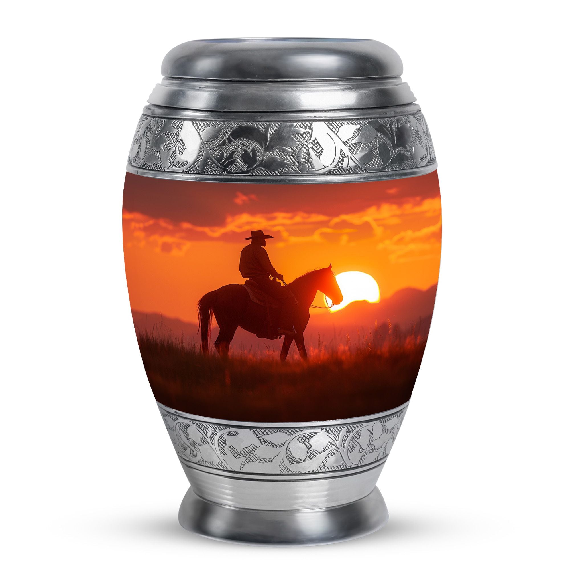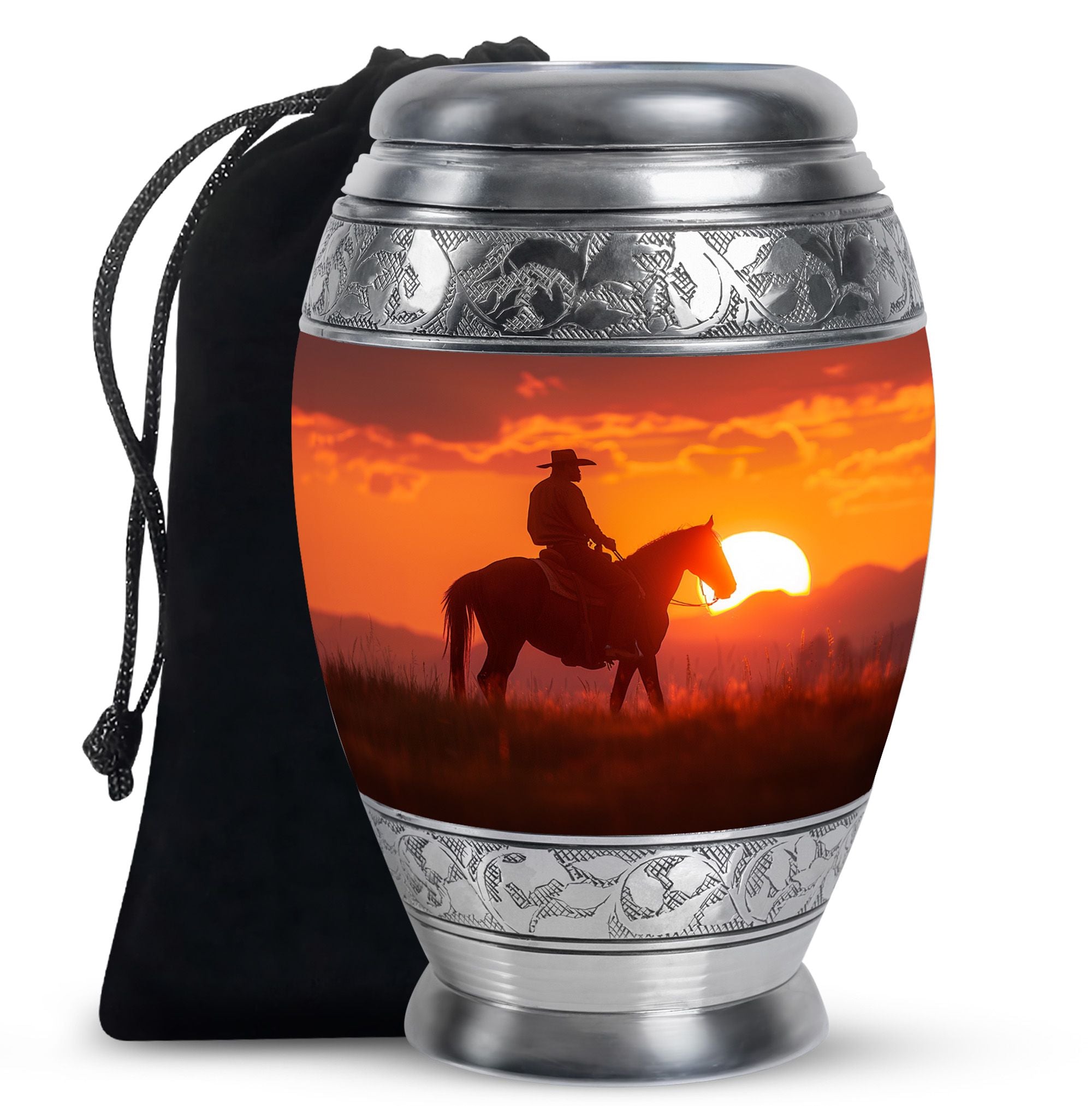 Every life leaves behind a legacy of love, and finding the right memorial is an important part of honoring that journey. Our Cowboy cremation keepsake urns for human ashes adult – Sunset Large Urn – are designed to bring comfort, strength, and beauty to your remembrance. Whether chosen as a cremation urn for adults, a cremation urn mom, or a family keepsake, this urn reflects courage, warmth, and eternal love.