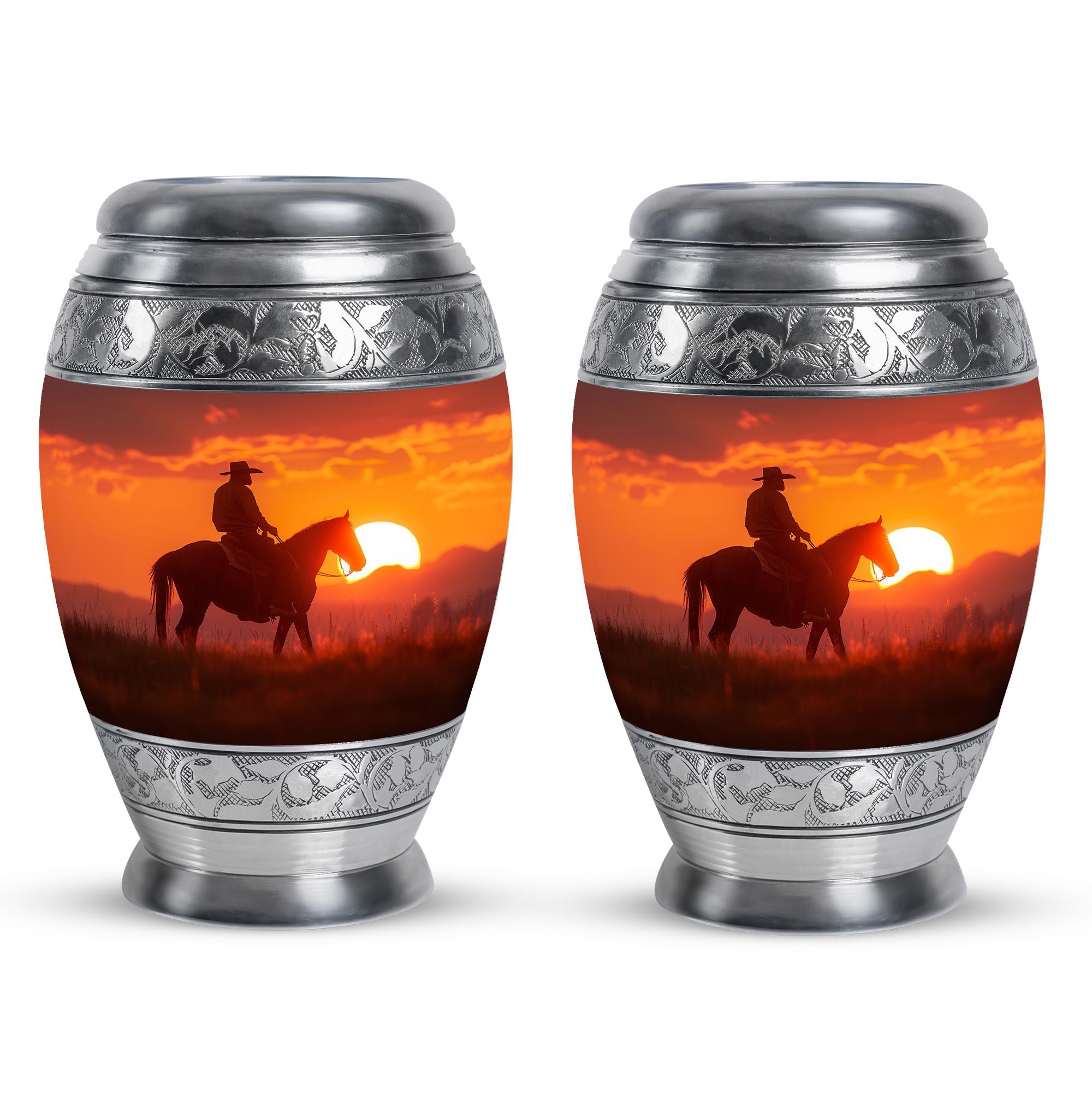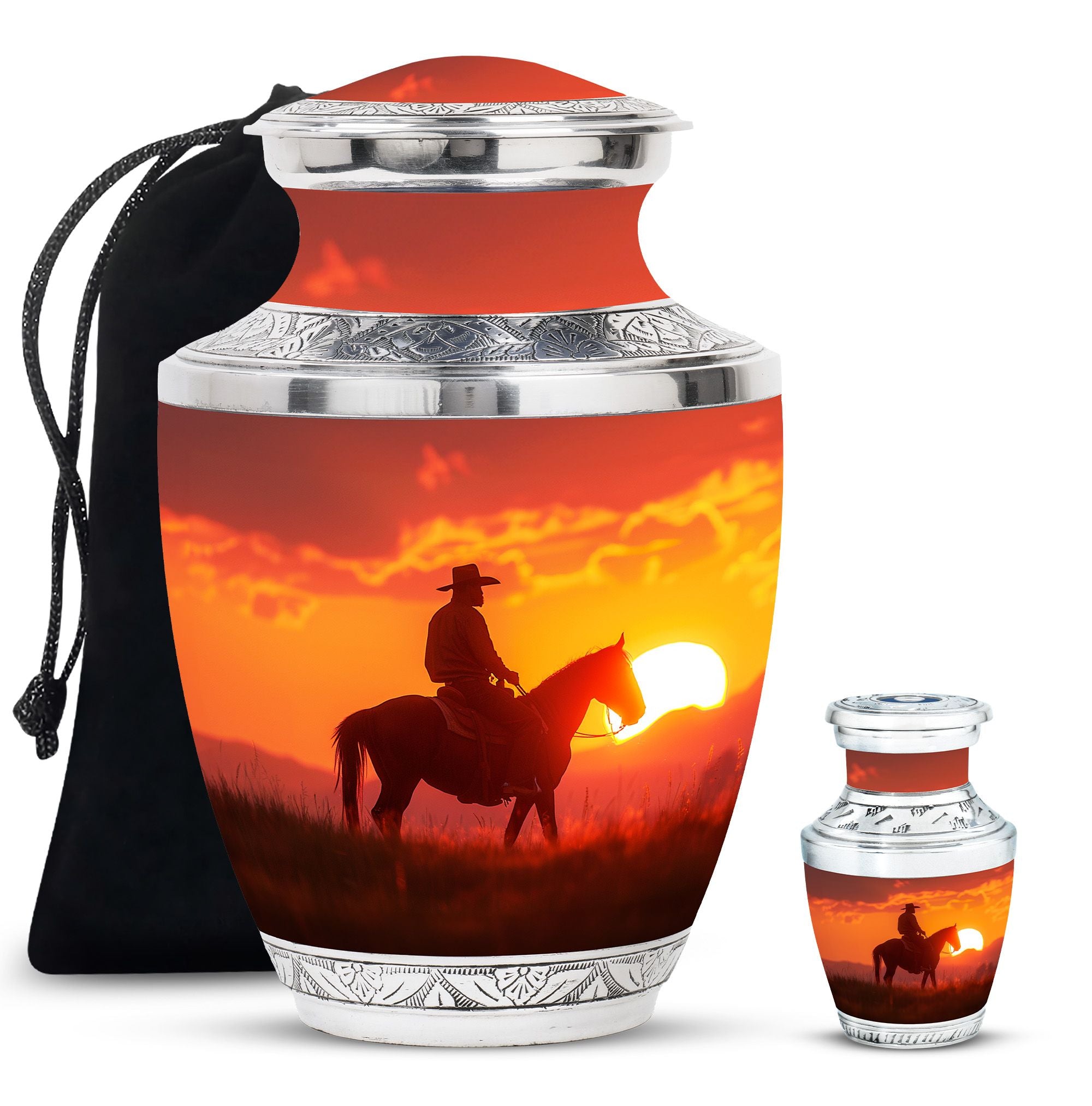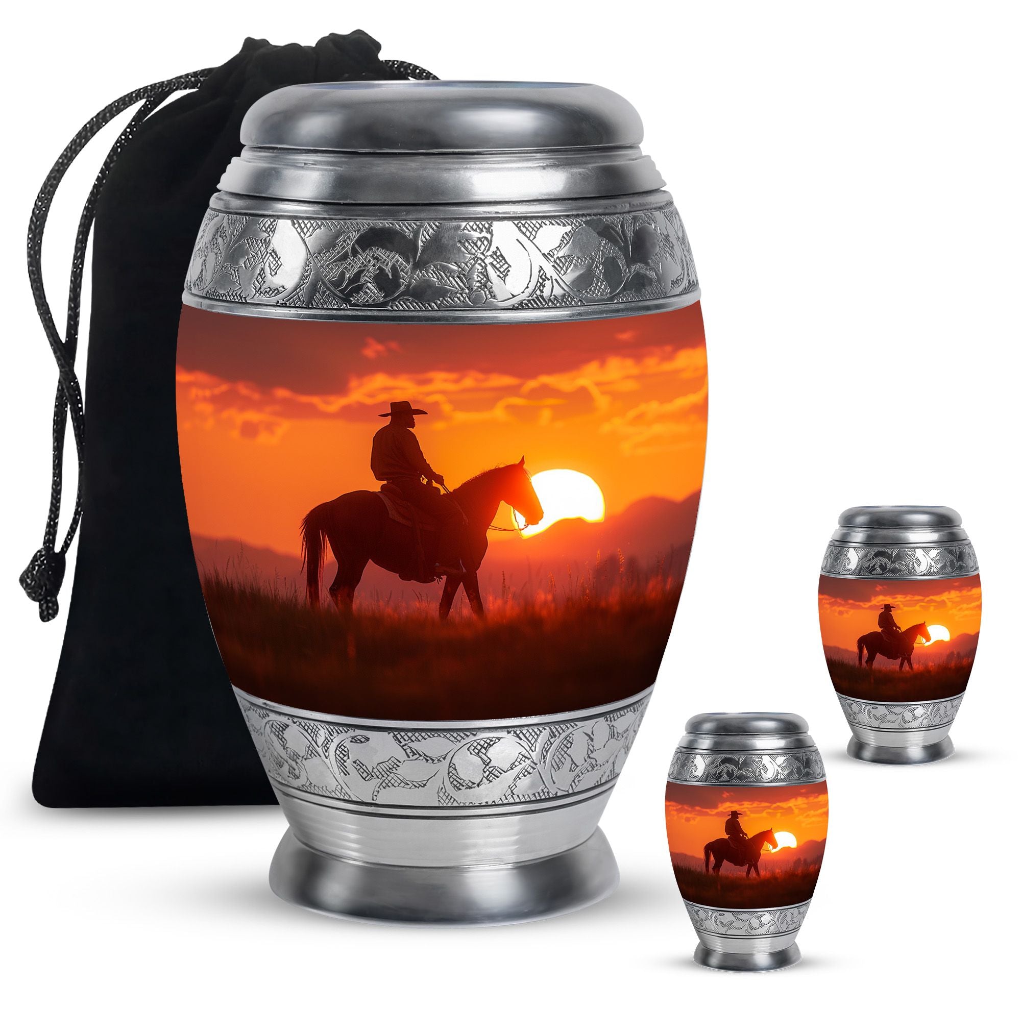 Every life leaves behind a legacy of love, and finding the right memorial is an important part of honoring that journey. Our Cowboy cremation keepsake urns for human ashes adult – Sunset Large Urn – are designed to bring comfort, strength, and beauty to your remembrance. Whether chosen as a cremation urn for adults, a cremation urn mom, or a family keepsake, this urn reflects courage, warmth, and eternal love.