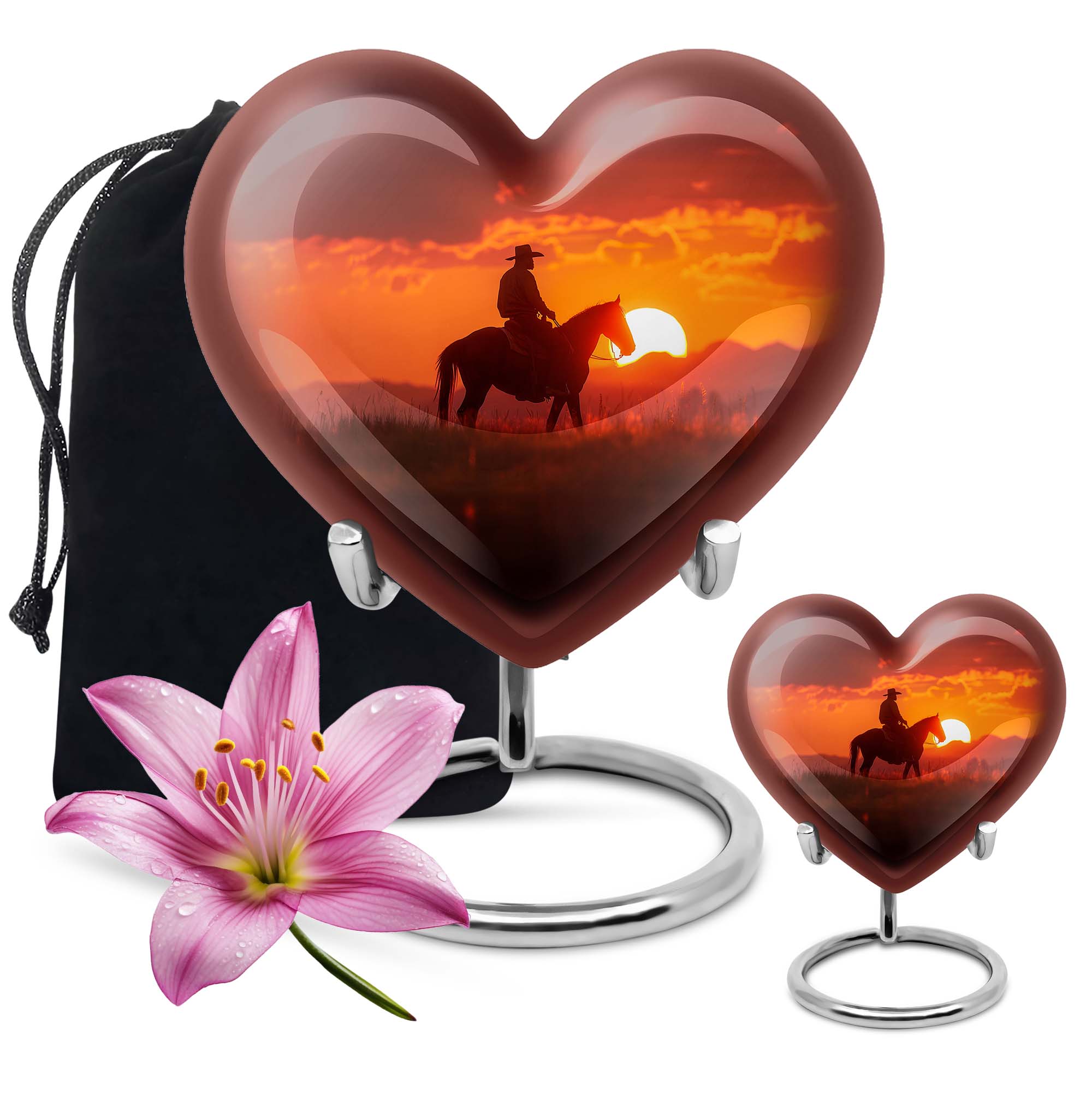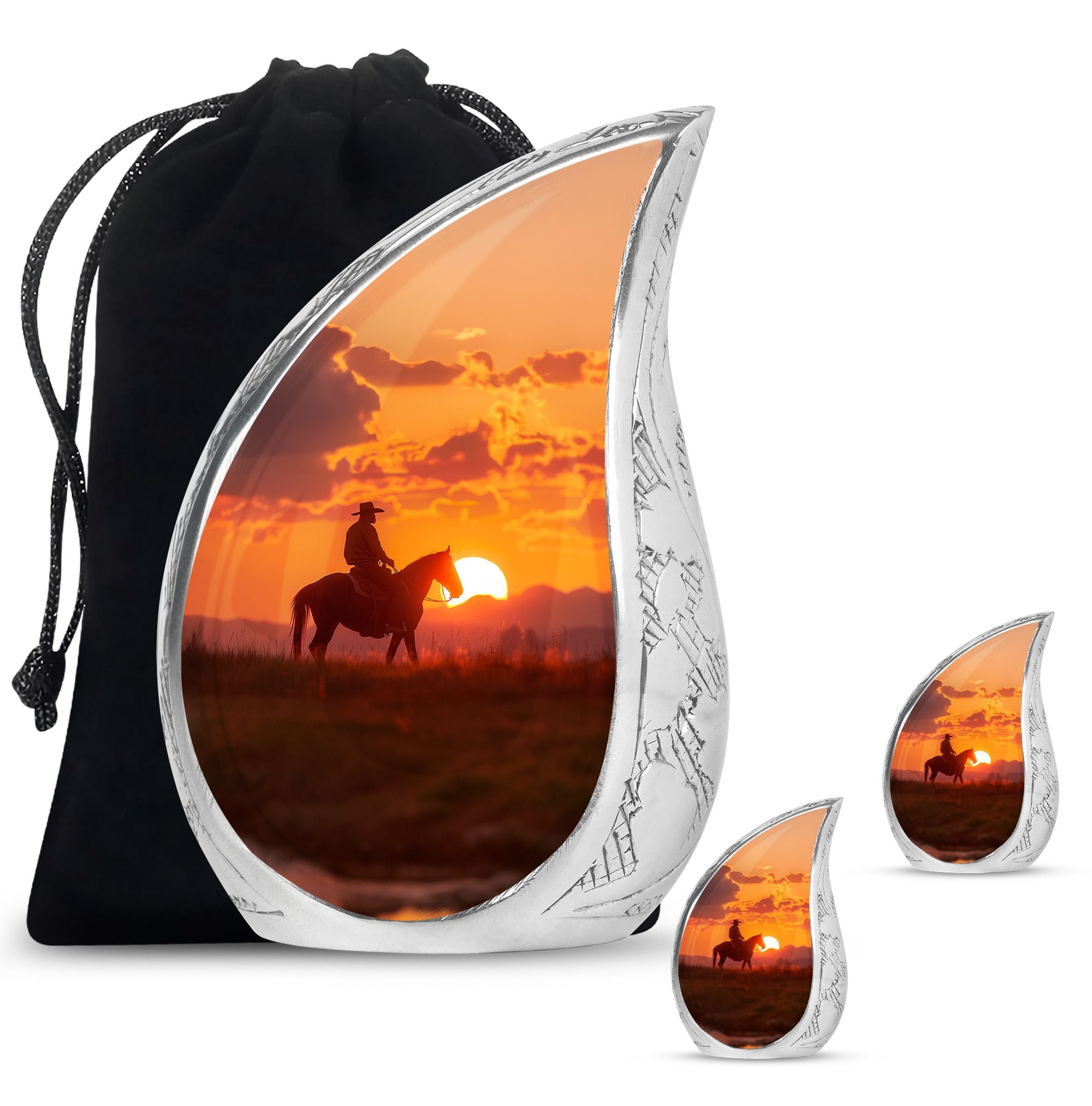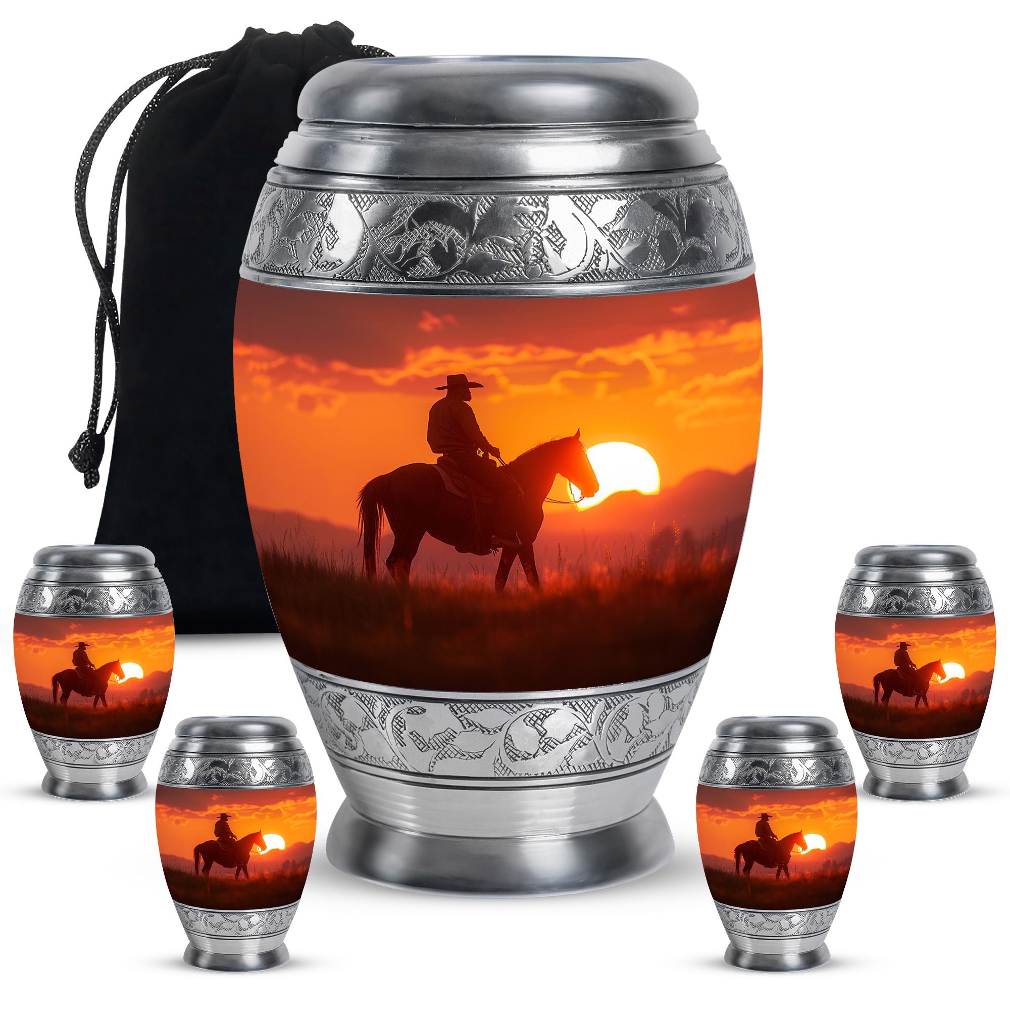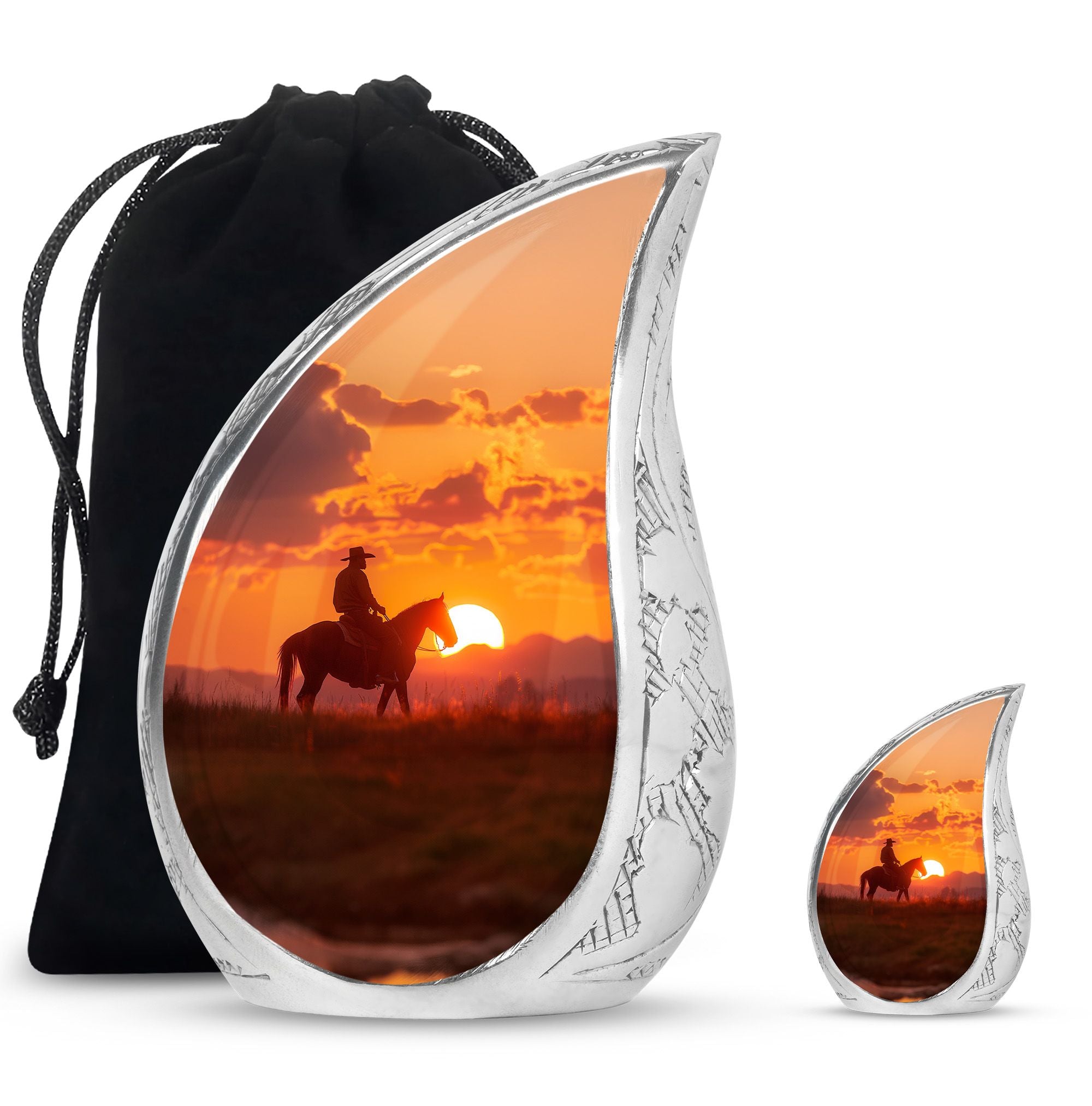 Every life leaves behind a legacy of love, and finding the right memorial is an important part of honoring that journey. Our Cowboy cremation keepsake urns for human ashes adult – Sunset Large Urn – are designed to bring comfort, strength, and beauty to your remembrance. Whether chosen as a cremation urn for adults, a cremation urn mom, or a family keepsake, this urn reflects courage, warmth, and eternal love.