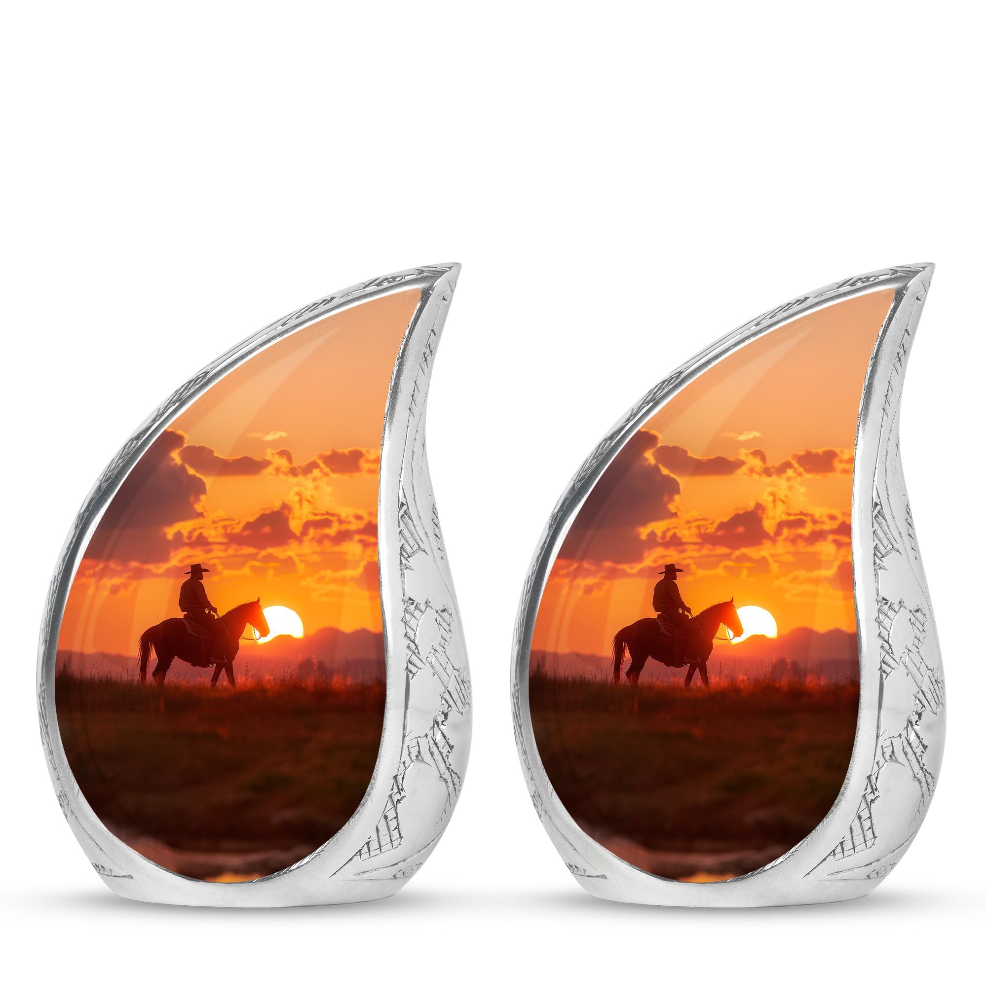 The Cowboy Sunset urn honors a legacy of strength and independence, offering a lasting tribute that brings comfort and peace. It stands not only as a container but as a symbol of eternal connection between family and memory.