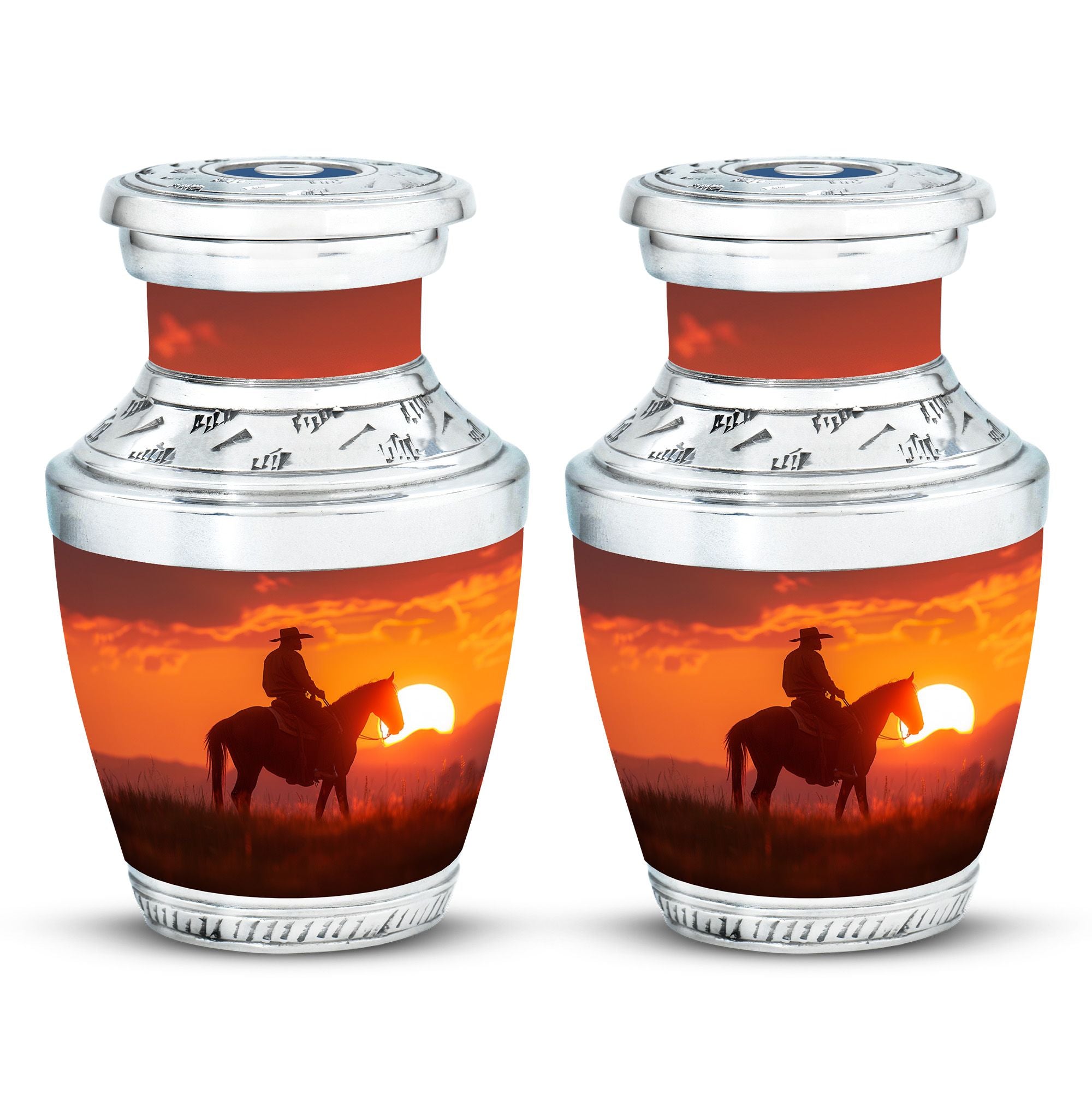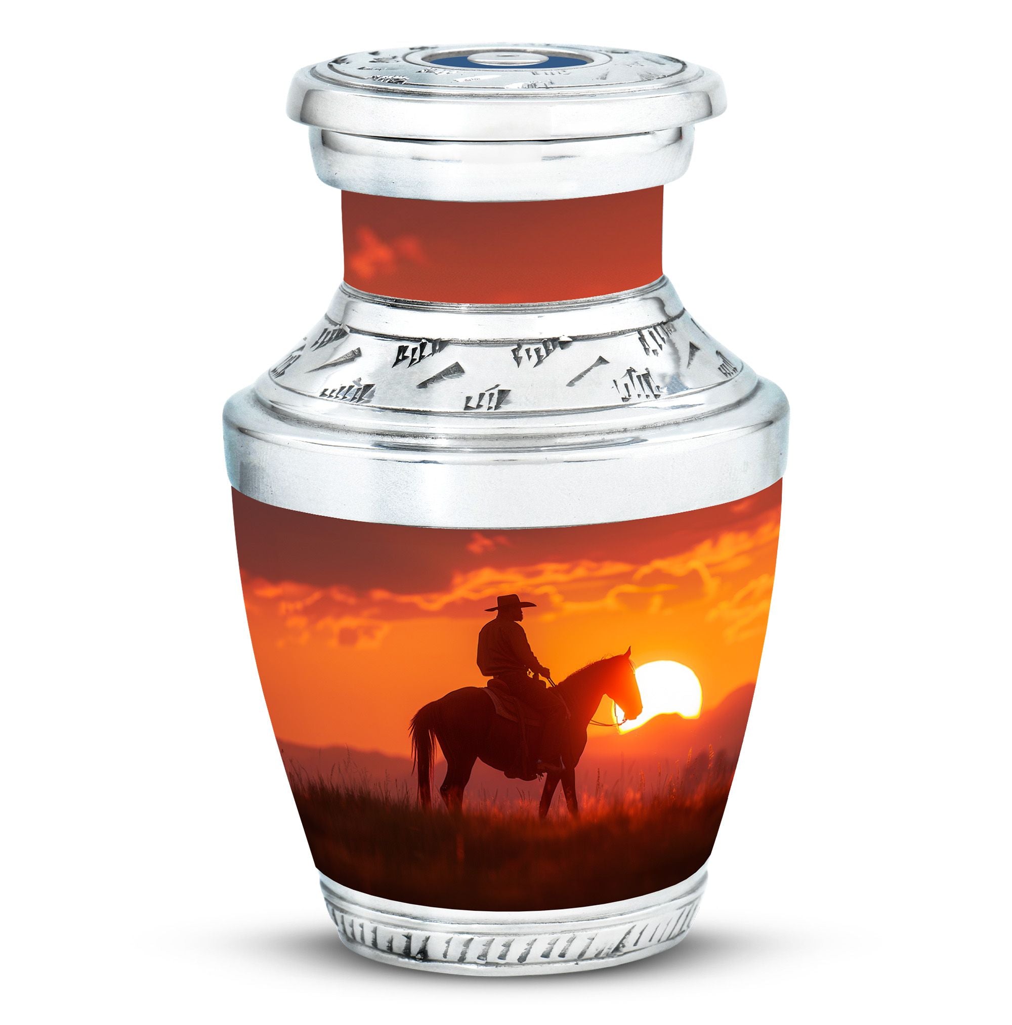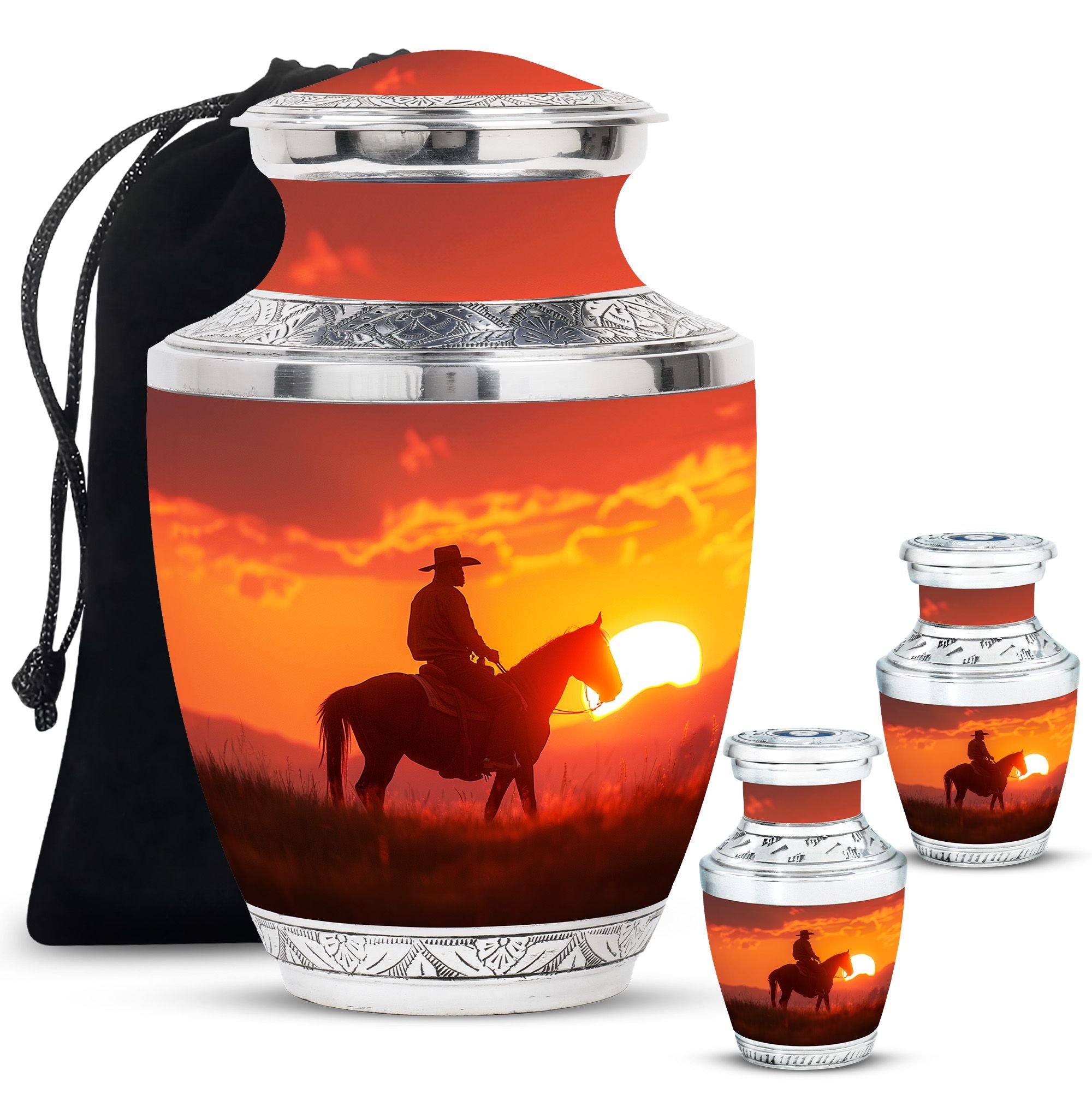 Handcrafted from durable aluminum, this urn combines timeless craftsmanship with a meaningful design. The colorful cowboy sunset theme represents freedom, resilience, and spirit, making it a fitting tribute for loved ones. With a secure screw-top lid, it ensures ashes remain safe. Families often select it as cremation urns for ashes, cremation urns for adult ashes, or cremation keepsake urns for human ashes adult when seeking both a central urn and smaller matching keepsakes.
