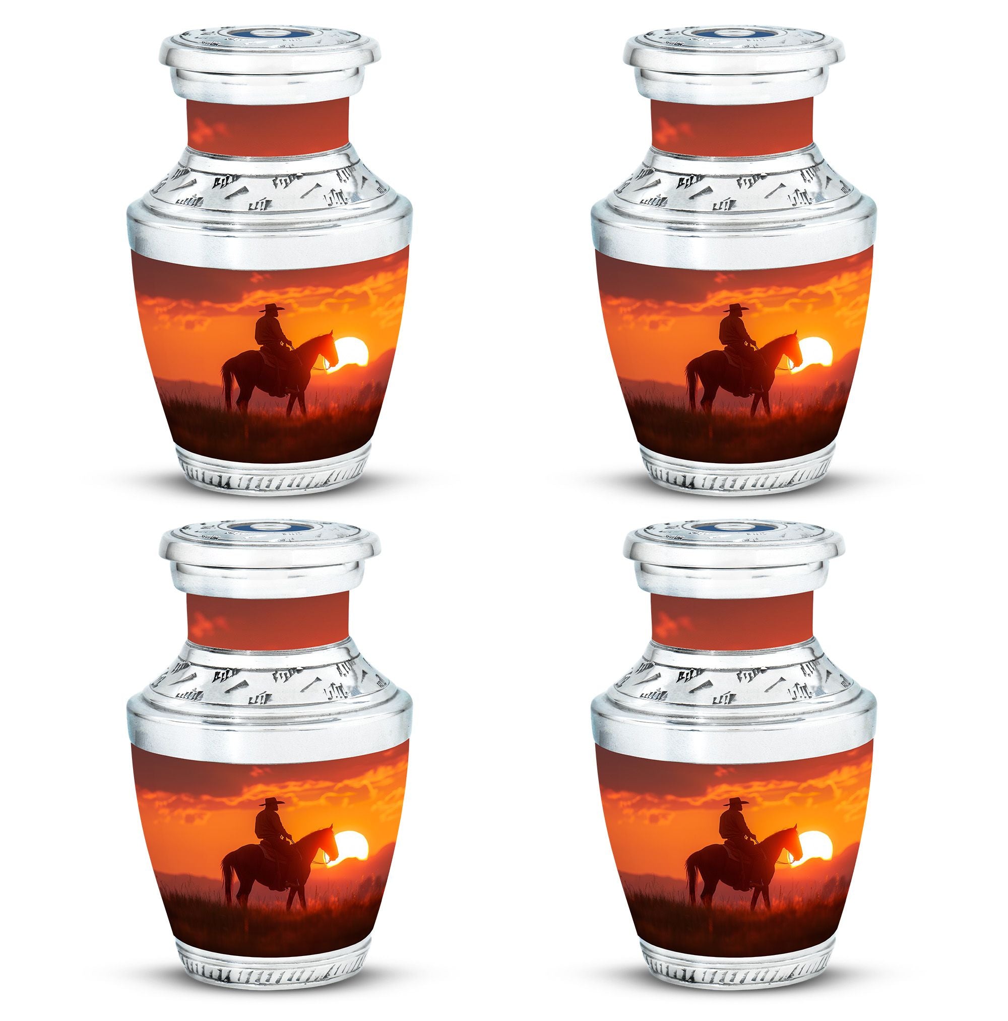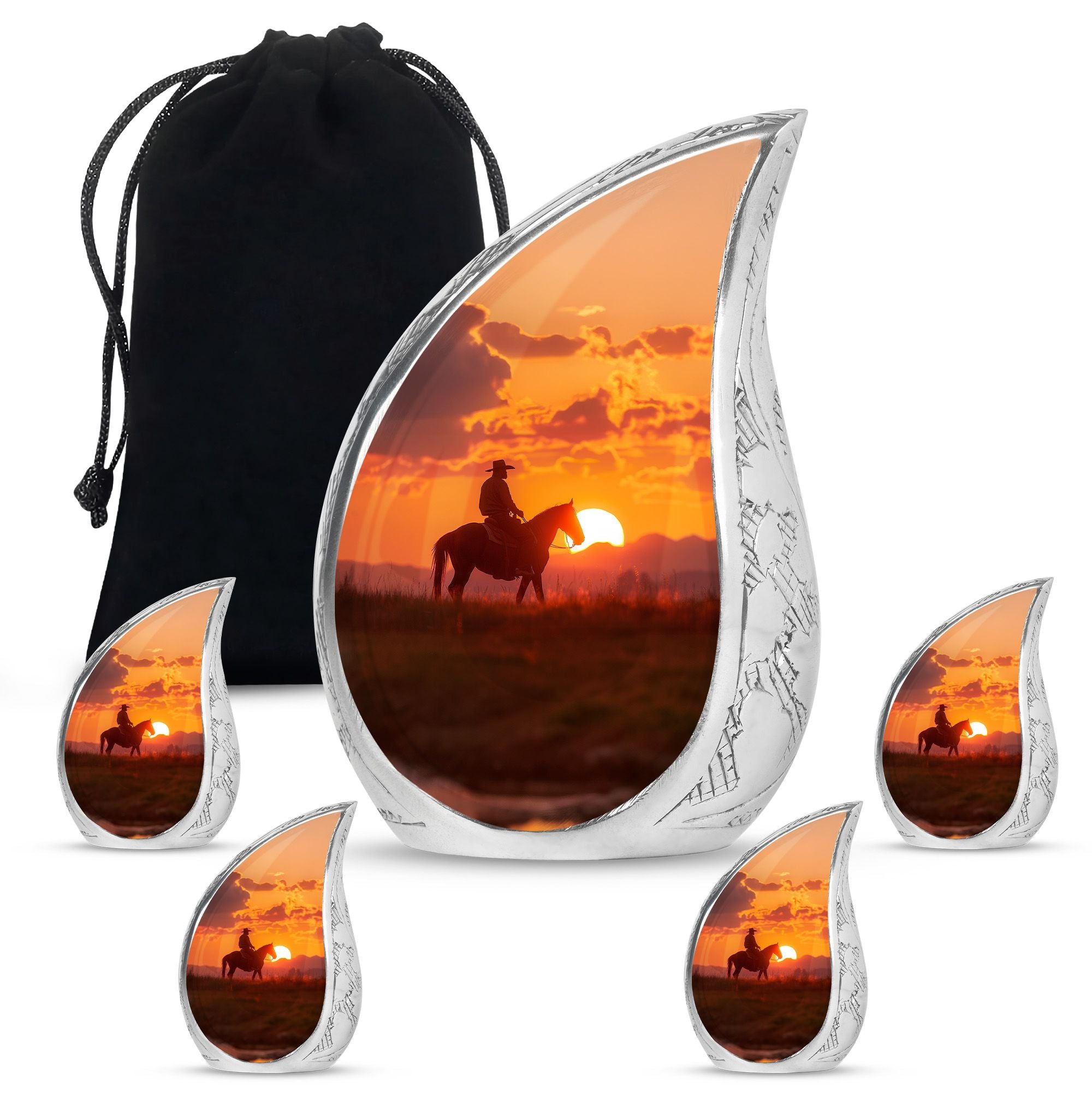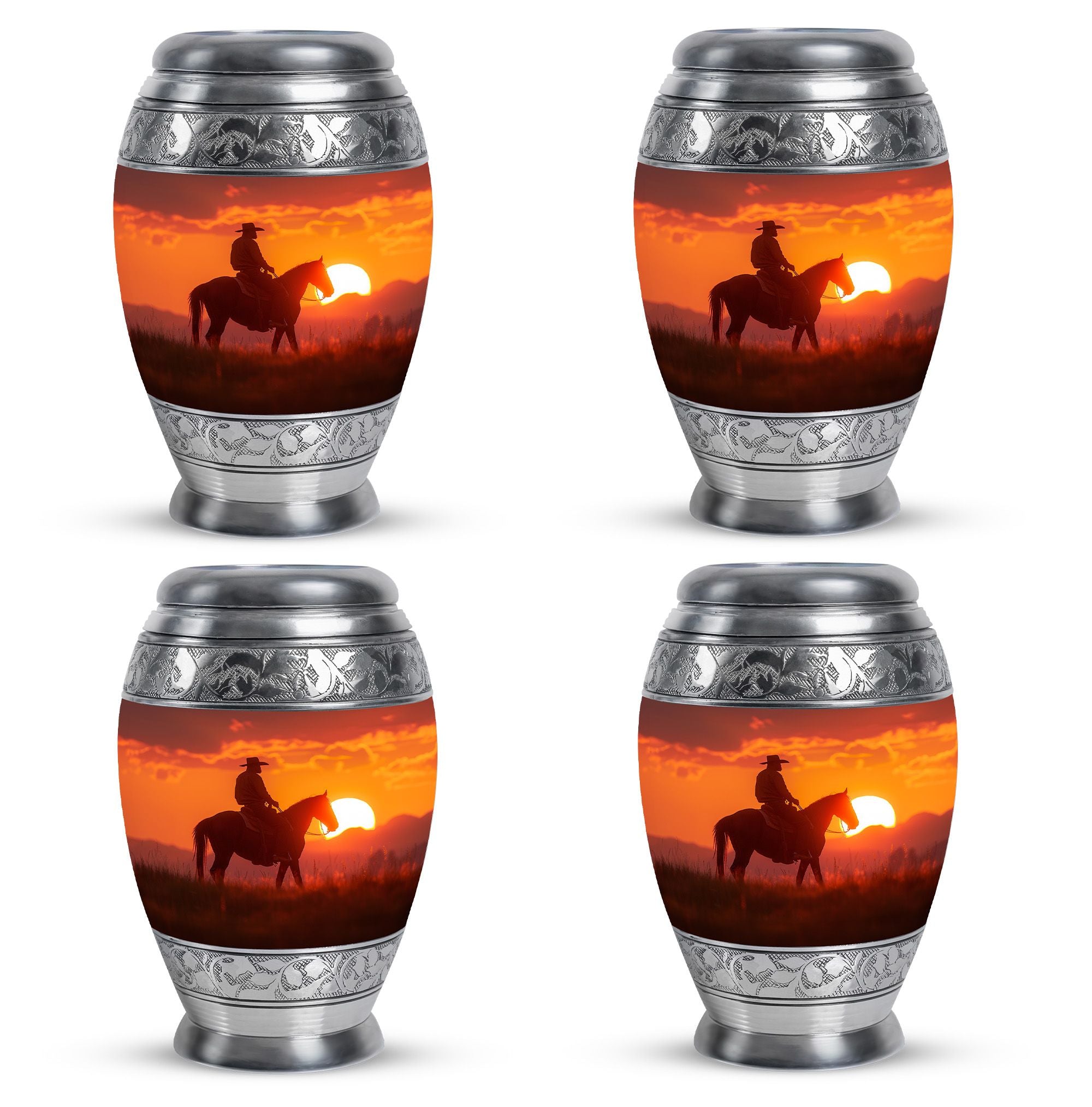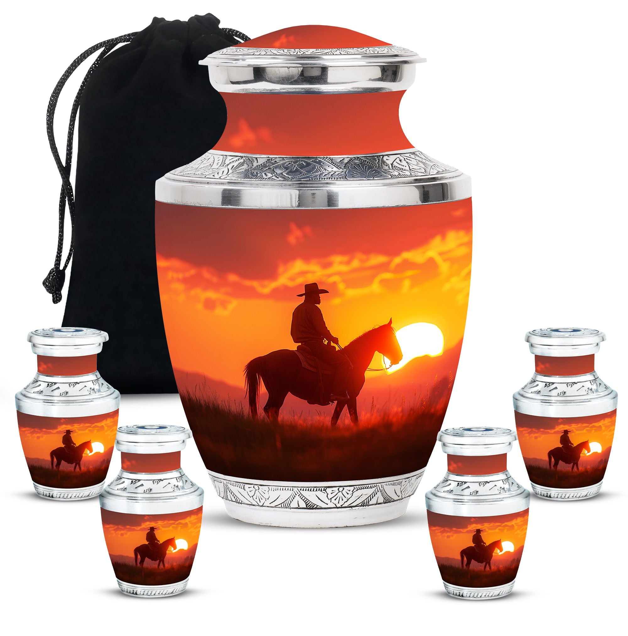 Handcrafted from durable aluminum, this urn combines timeless craftsmanship with a meaningful design. The colorful cowboy sunset theme represents freedom, resilience, and spirit, making it a fitting tribute for loved ones. With a secure screw-top lid, it ensures ashes remain safe. Families often select it as cremation urns for ashes, cremation urns for adult ashes, or cremation keepsake urns for human ashes adult when seeking both a central urn and smaller matching keepsakes.
