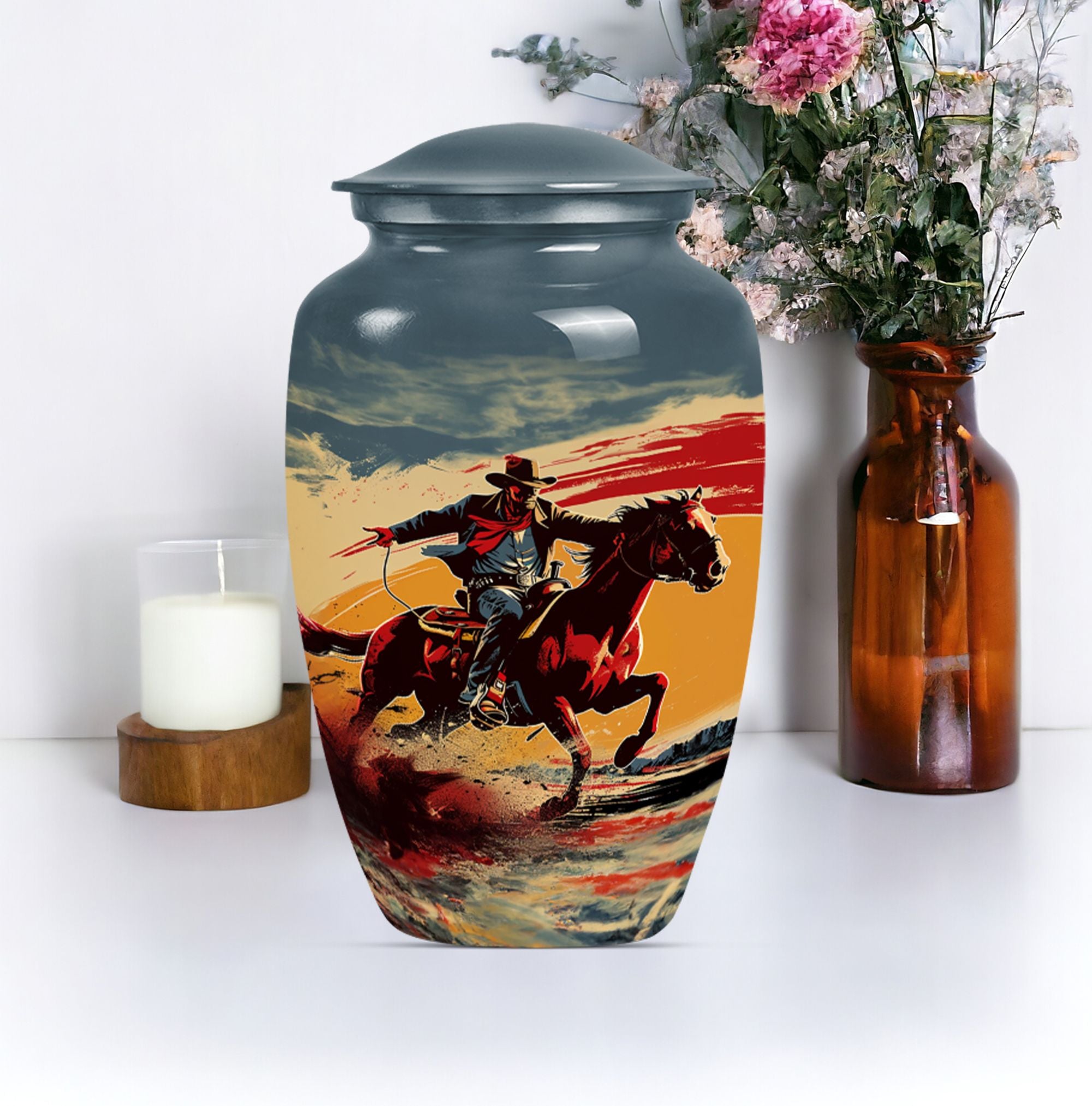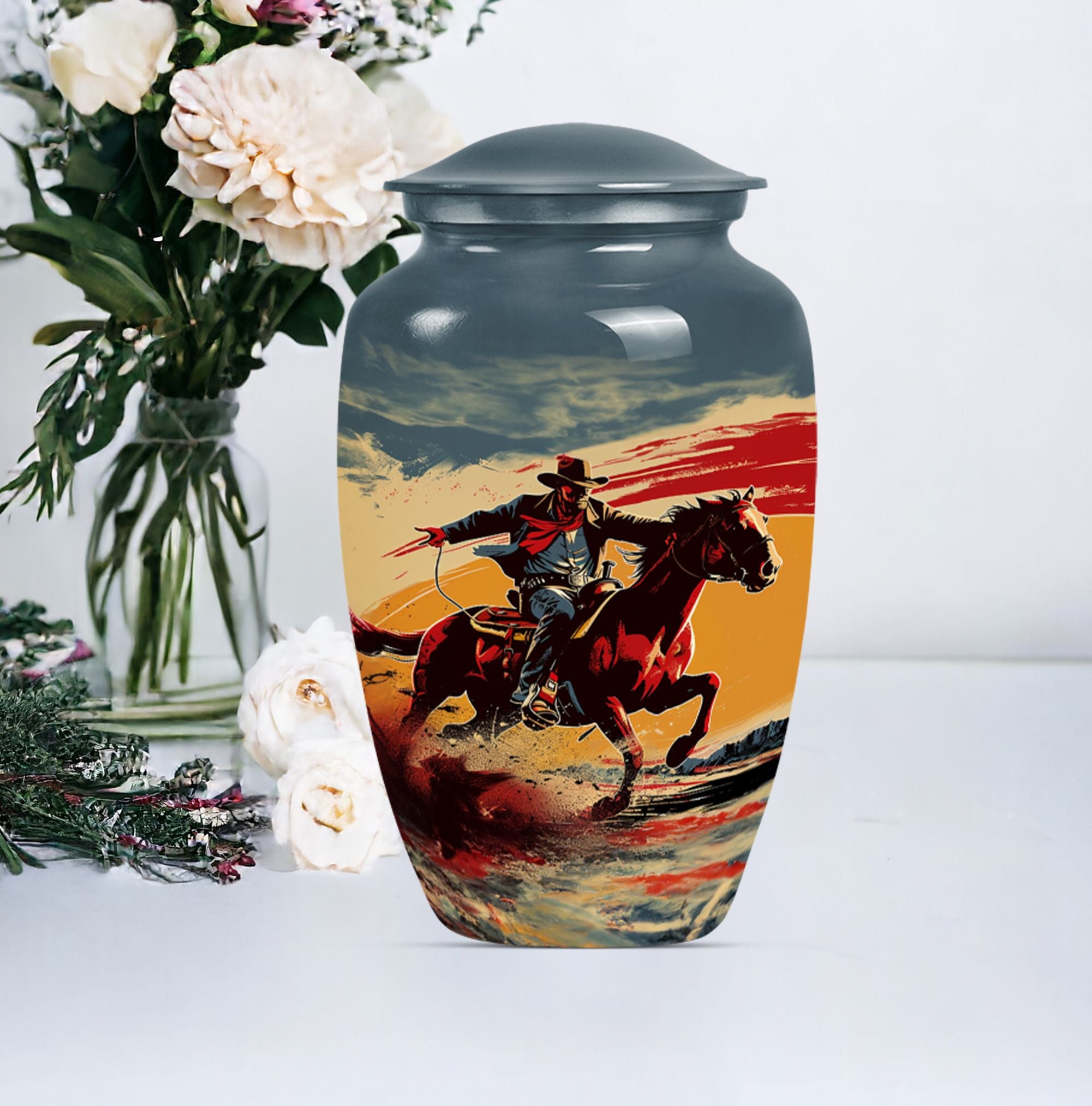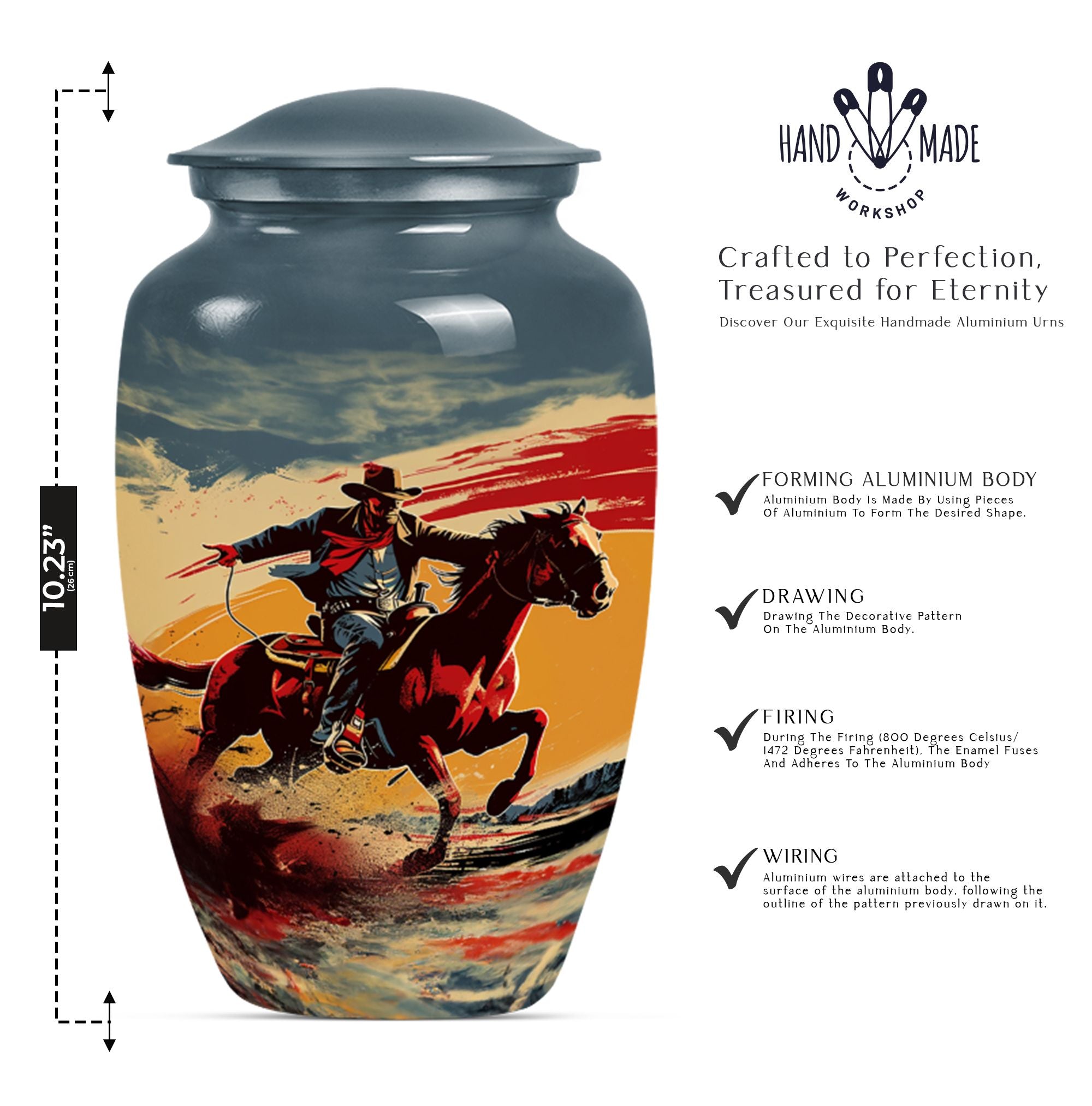 Embrace the eternal resting place for your loved ones with our classic cowboy urn, a symbol of peace and serenity. This exquisite 10-inch cremation urn crafted in high-quality aluminum offers you a heartfelt way to remember and pay tribute to your dearly departed. With dimensions of 10 inches in height and a weight of 3.3 pounds, this large urn can accommodate up to 200 cubic inches of ashes. Each cremation personalized urn includes a velvet pouch for the dignified containment and preservation of ashes. Its original butterfly theme emanates a sense of freedom, leaving a soothing impact on grieved hearts. For a more personal touch, engrave the name of your loved one on the urn, making it a unique and profoundly touching memorial. With the capability to serve as urns for cremation ashes for men and personalized urns for cremation ashes mother, this ash burial urn becomes a perfect expression of love and remembrance.