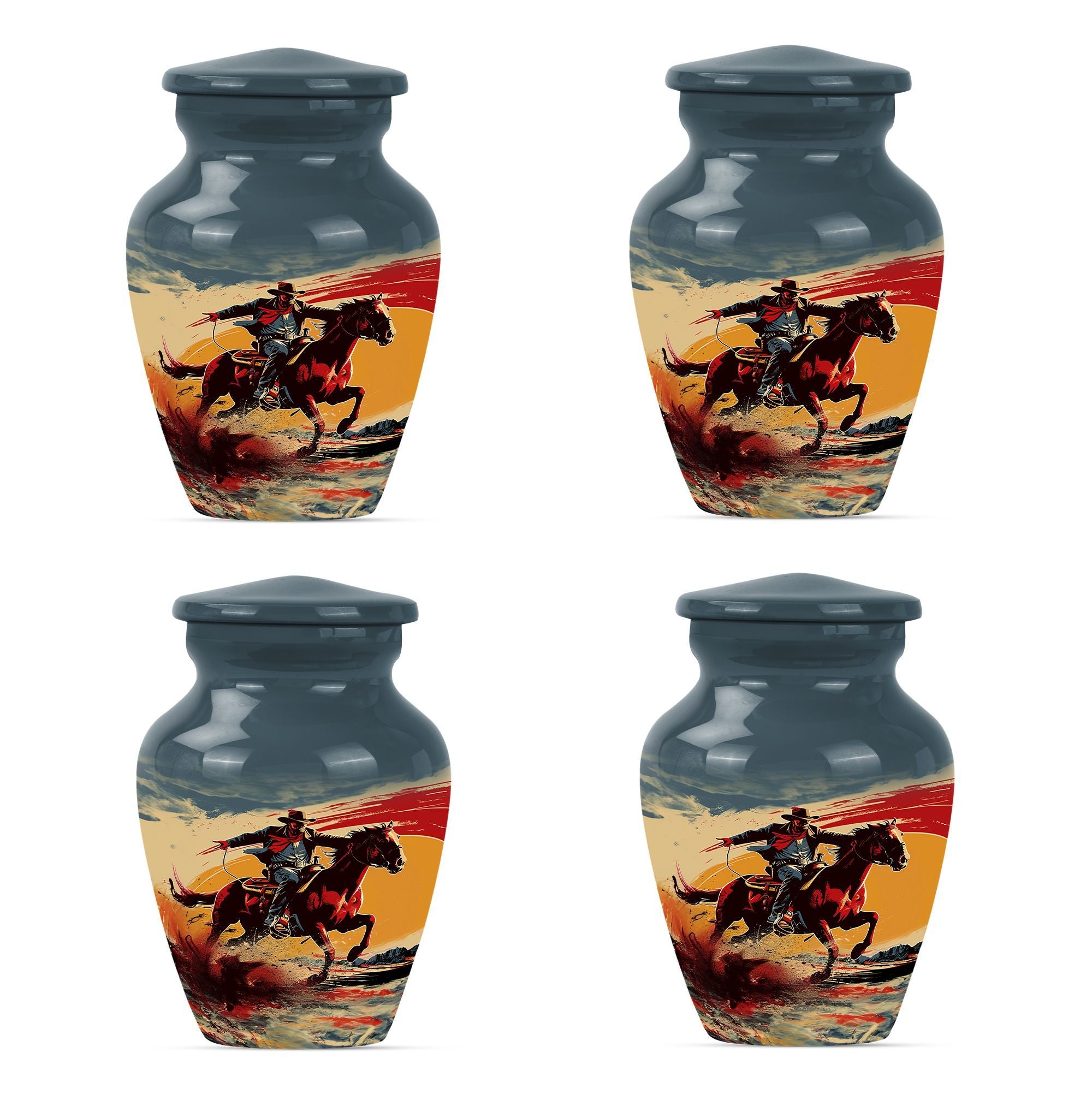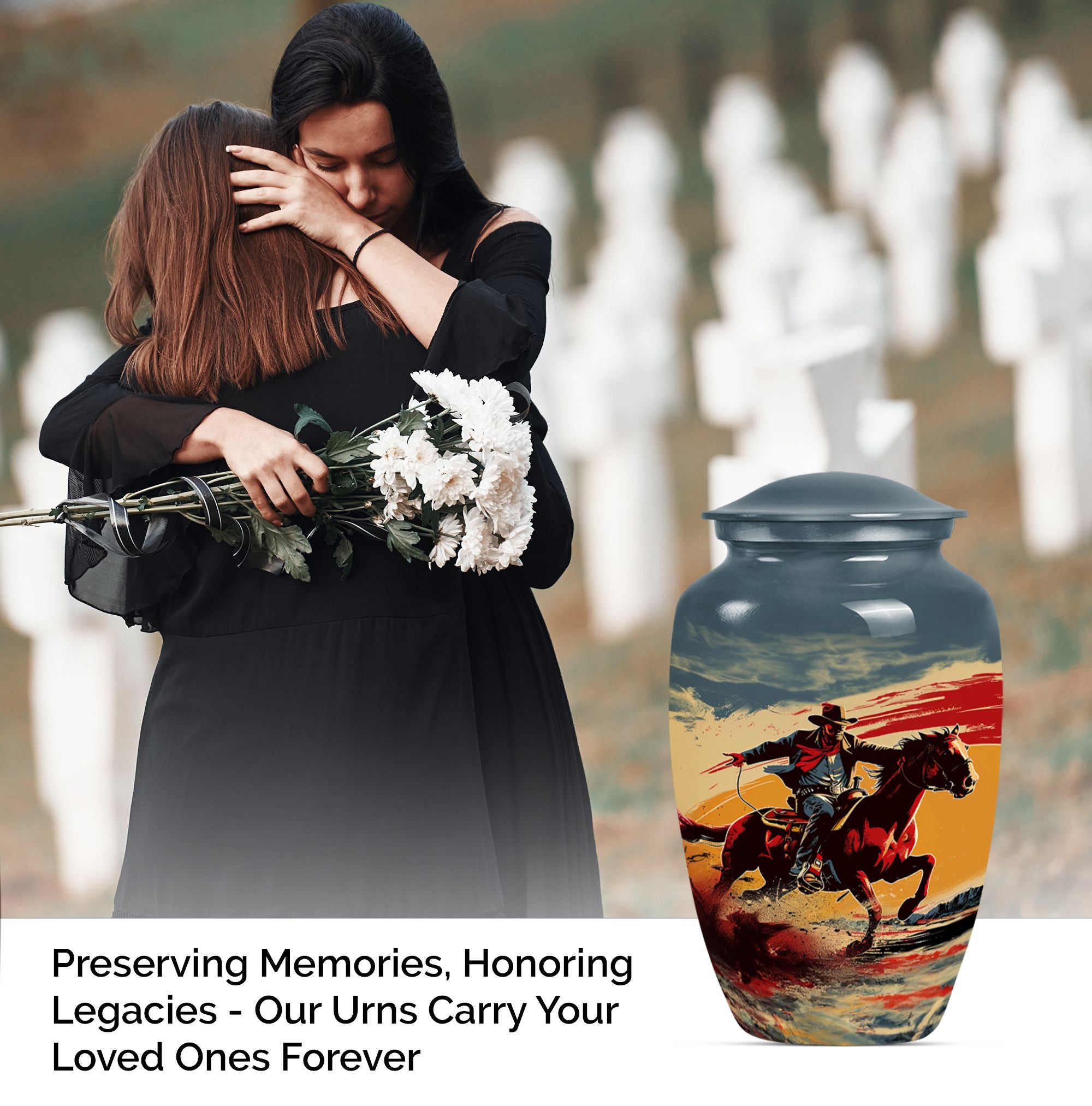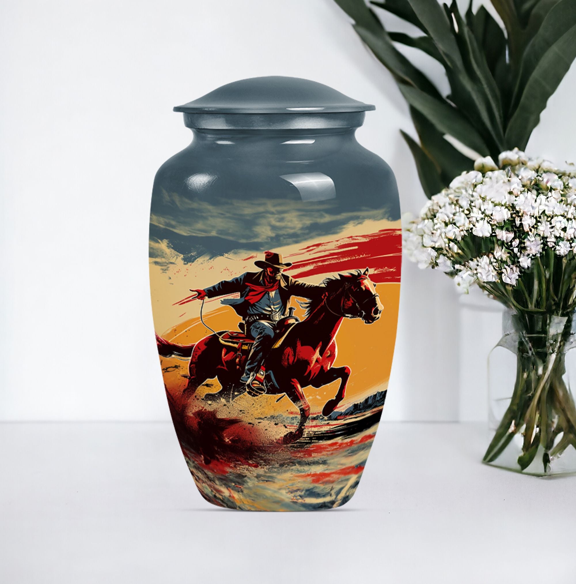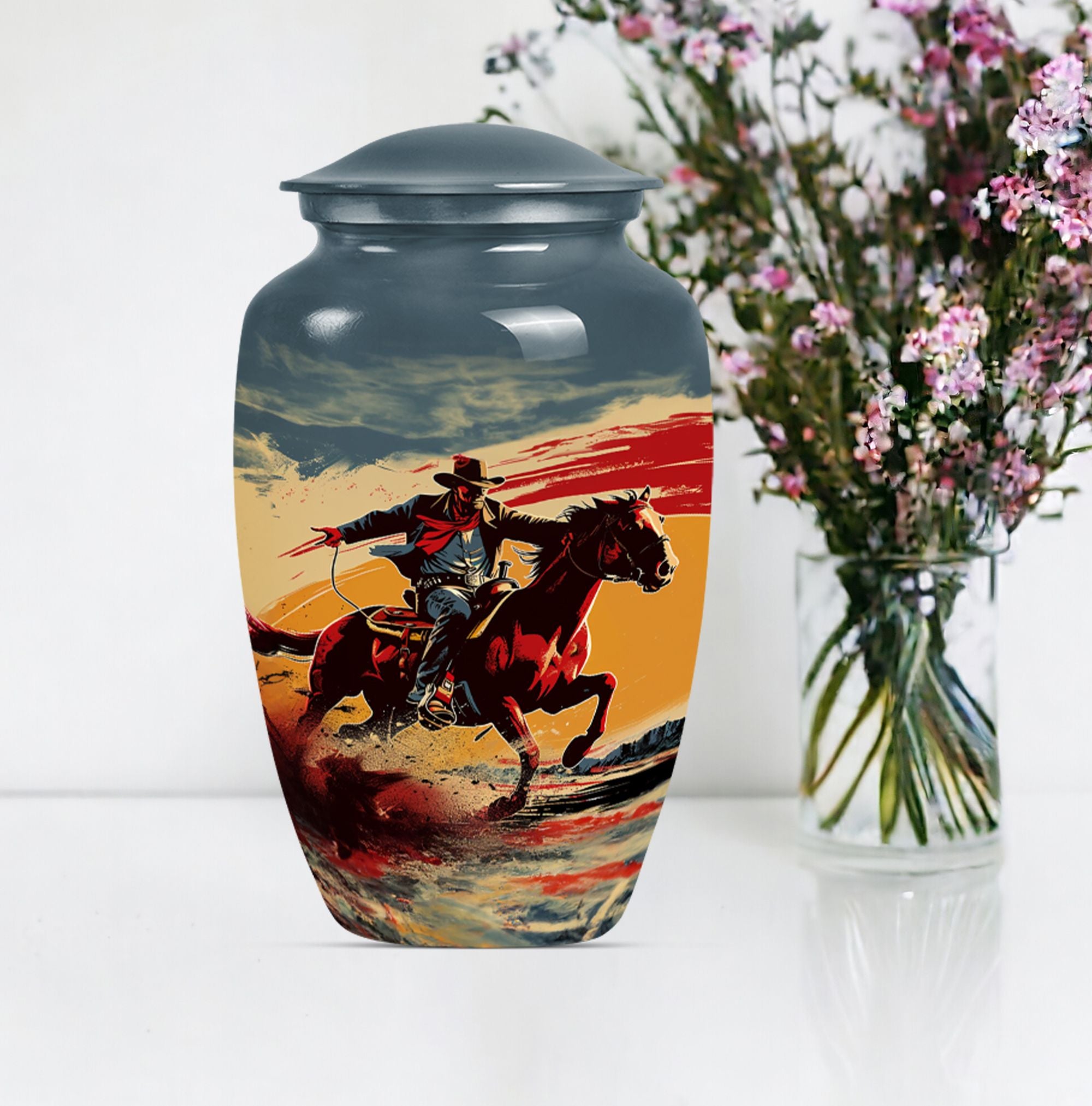 Embrace the eternal resting place for your loved ones with our classic cowboy urn, a symbol of peace and serenity. This exquisite 10-inch cremation urn crafted in high-quality aluminum offers you a heartfelt way to remember and pay tribute to your dearly departed. With dimensions of 10 inches in height and a weight of 3.3 pounds, this large urn can accommodate up to 200 cubic inches of ashes. Each cremation personalized urn includes a velvet pouch for the dignified containment and preservation of ashes. Its original butterfly theme emanates a sense of freedom, leaving a soothing impact on grieved hearts. For a more personal touch, engrave the name of your loved one on the urn, making it a unique and profoundly touching memorial. With the capability to serve as urns for cremation ashes for men and personalized urns for cremation ashes mother, this ash burial urn becomes a perfect expression of love and remembrance.