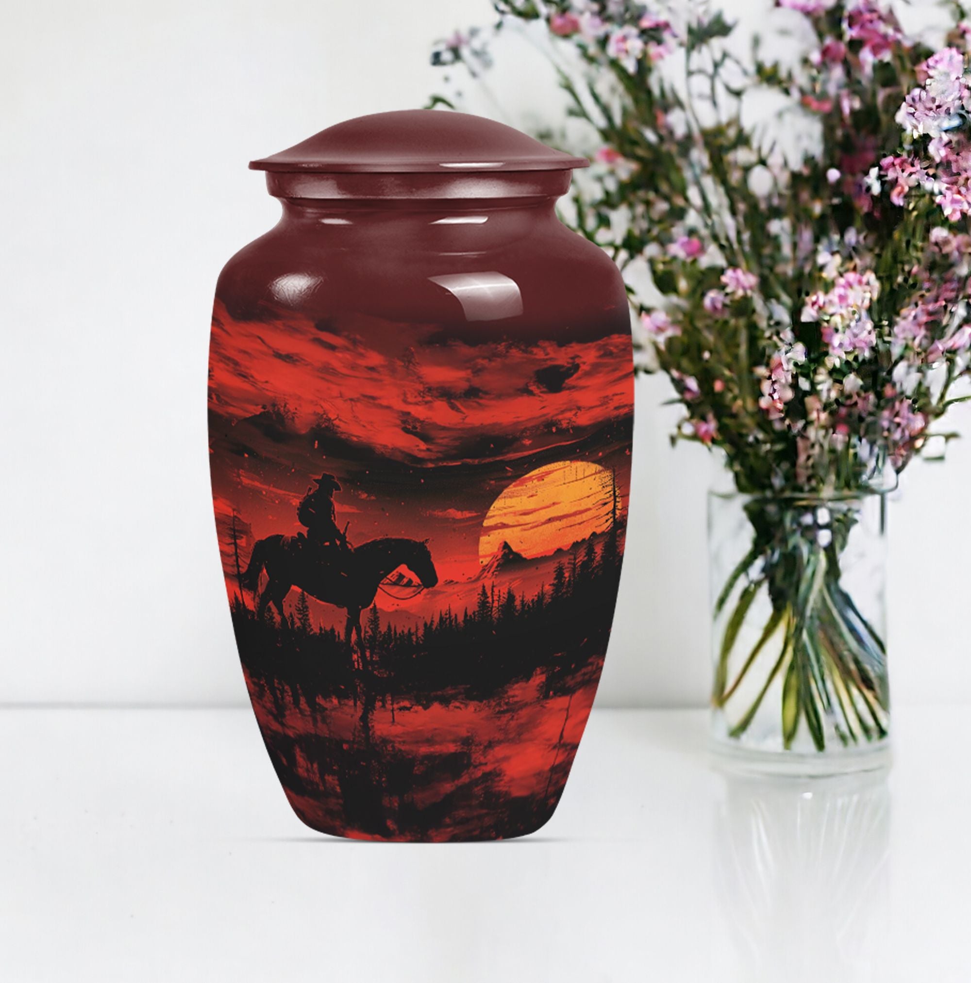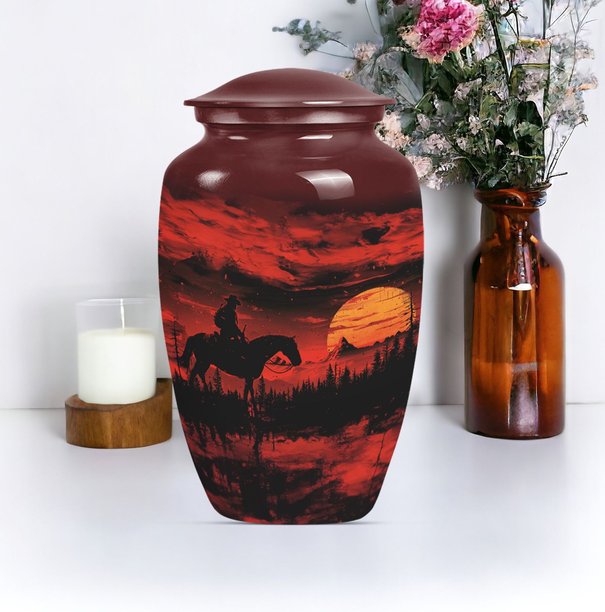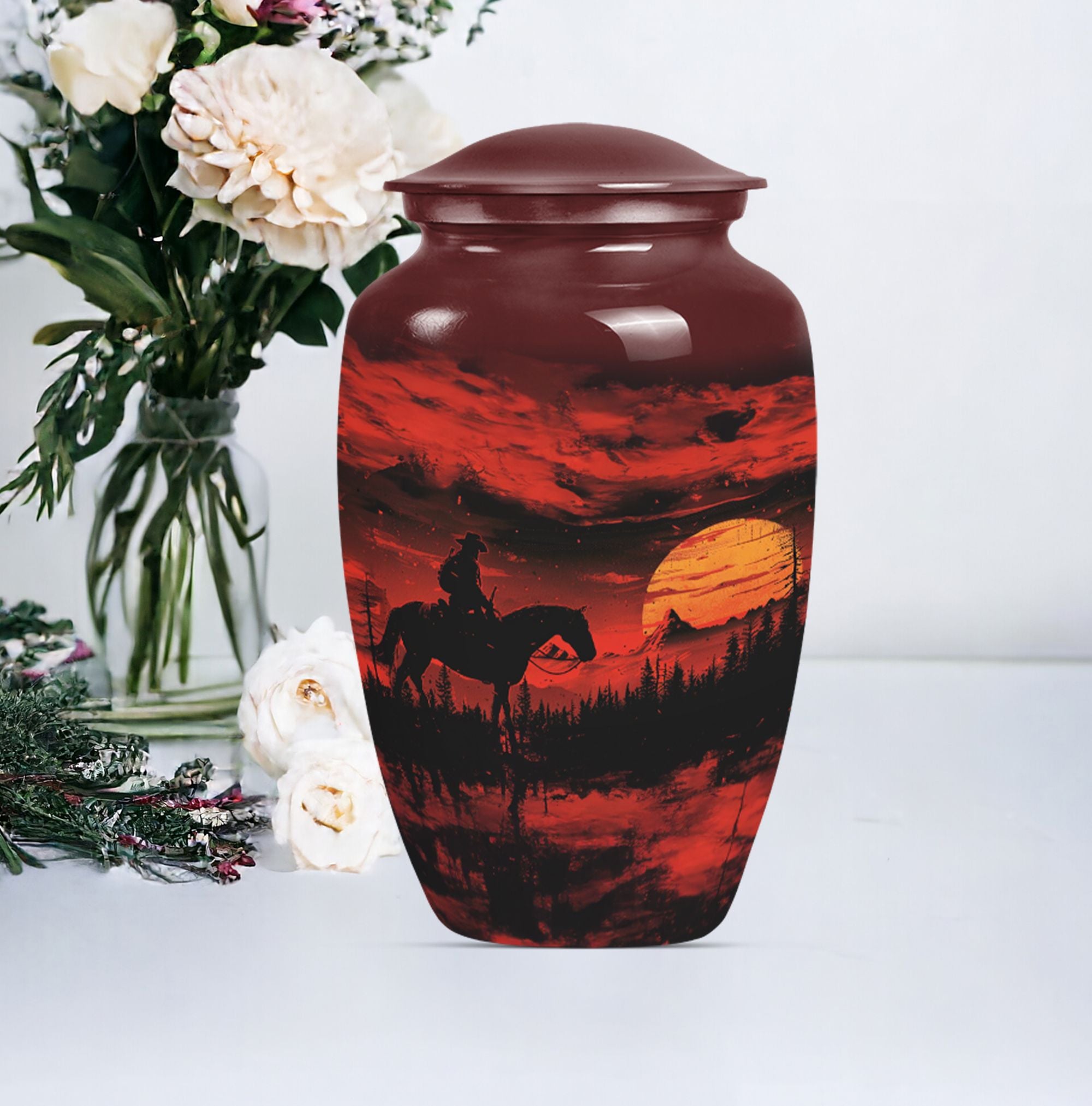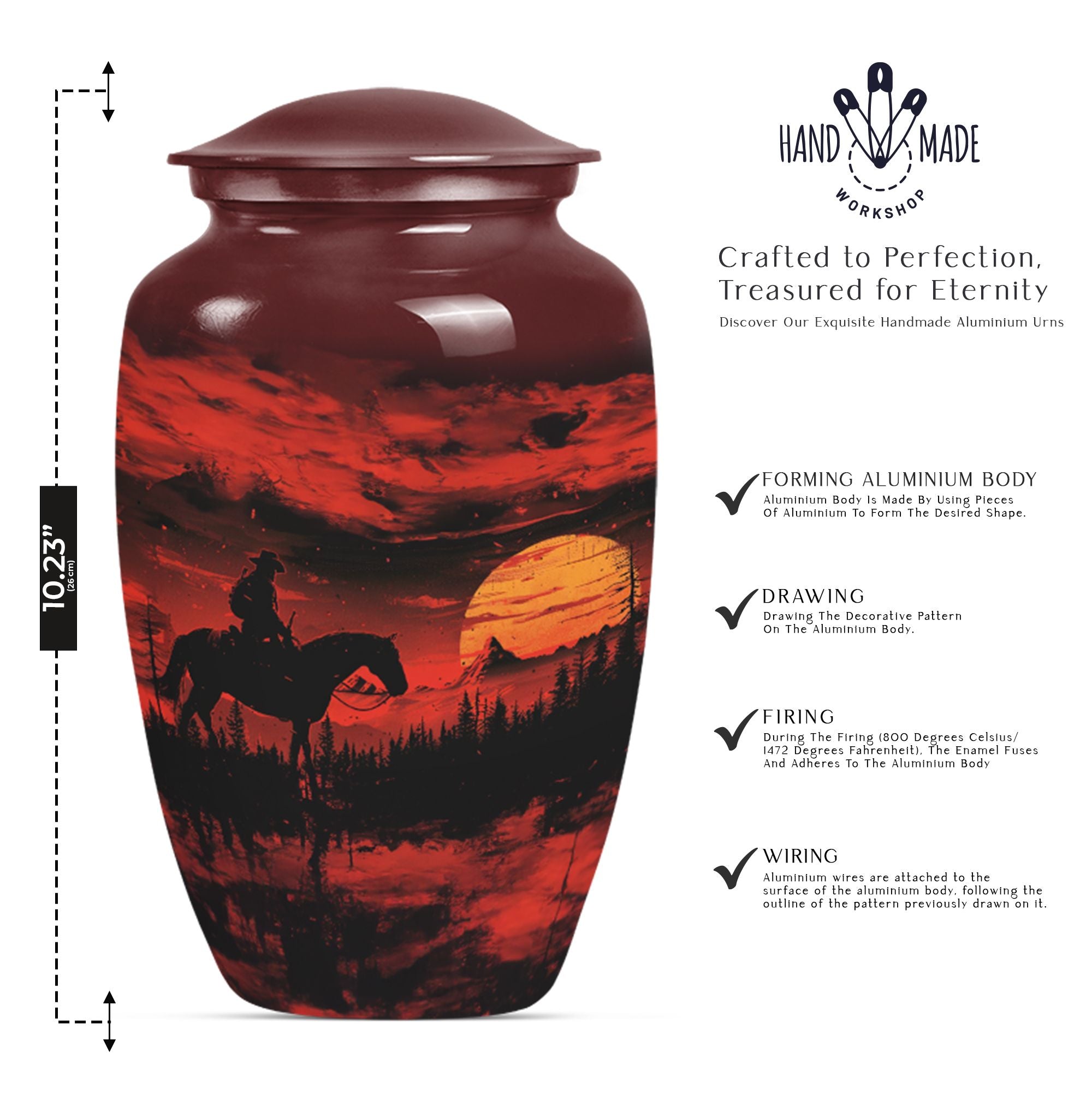 Memorialize your loved ones with a dignified and lasting tribute with our Large Cowboy Urn. This cremation urn is crafted from durable Aluminium, deftly made to weigh 3.3 pounds, signifying strength and permanence. Generously proportioned with a height of 10 inches and a capacity of 200 cubic inches, this urn can accommodate the ashes of adults. Enclosed in a soft velvet pouch, the contents are protected and presented with grace and respect. The urn exudes a comforting presence with a delightful Butterfly theme, representative of transformation and renewed life. Our urns allow personalization by engraving names, adding a unique and special touch to each memorial. Built to transcend time, this urn brings a sense of peace to your home. Suitable for both men and women, this cremation memorial urn can be used as a burial urn or kept at home. Bring serenity with this symbol of eternal care.