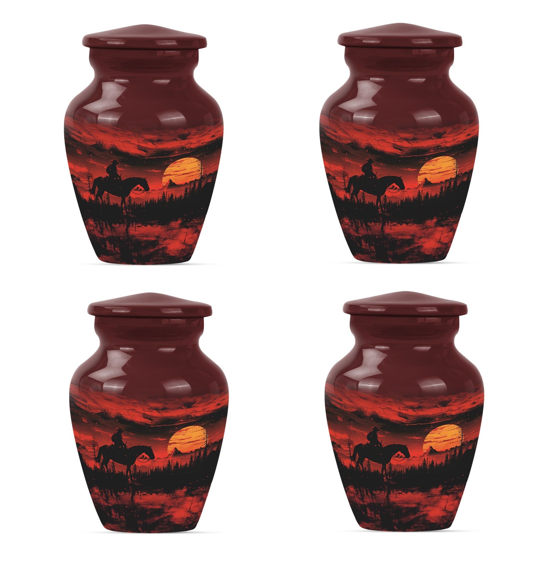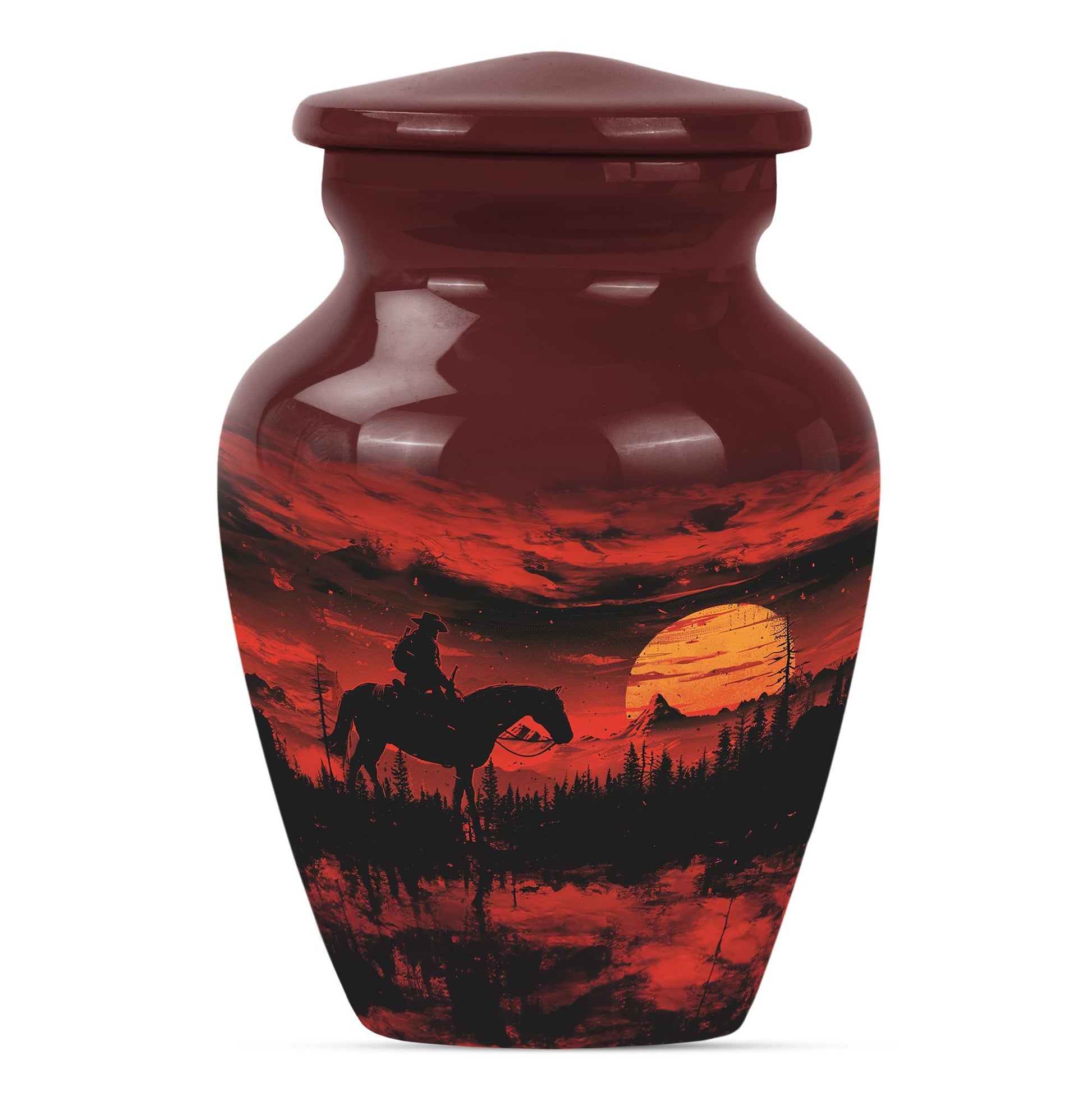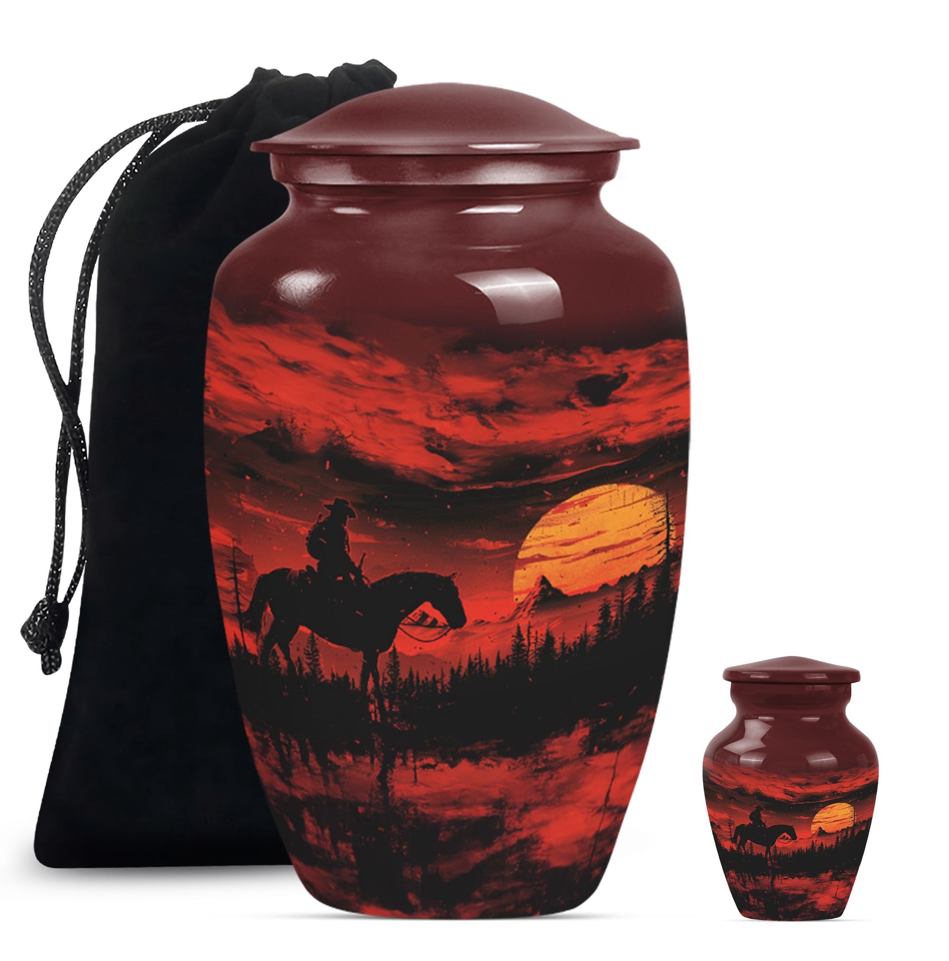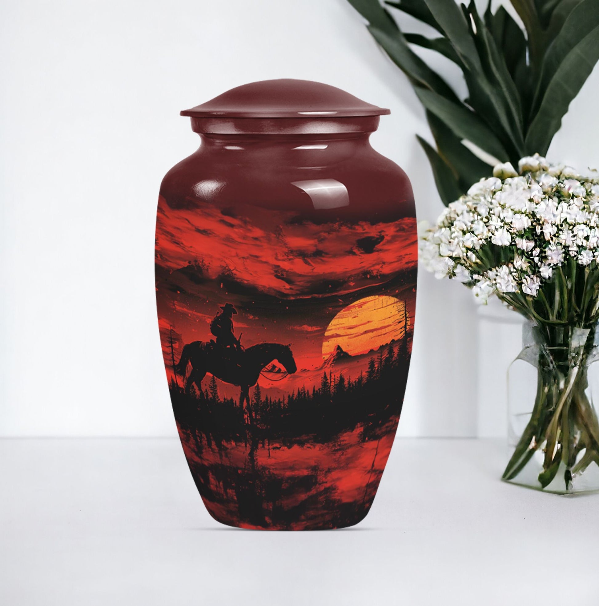 Memorialize your loved ones with a dignified and lasting tribute with our Large Cowboy Urn. This cremation urn is crafted from durable Aluminium, deftly made to weigh 3.3 pounds, signifying strength and permanence. Generously proportioned with a height of 10 inches and a capacity of 200 cubic inches, this urn can accommodate the ashes of adults. Enclosed in a soft velvet pouch, the contents are protected and presented with grace and respect. The urn exudes a comforting presence with a delightful Butterfly theme, representative of transformation and renewed life. Our urns allow personalization by engraving names, adding a unique and special touch to each memorial. Built to transcend time, this urn brings a sense of peace to your home. Suitable for both men and women, this cremation memorial urn can be used as a burial urn or kept at home. Bring serenity with this symbol of eternal care.