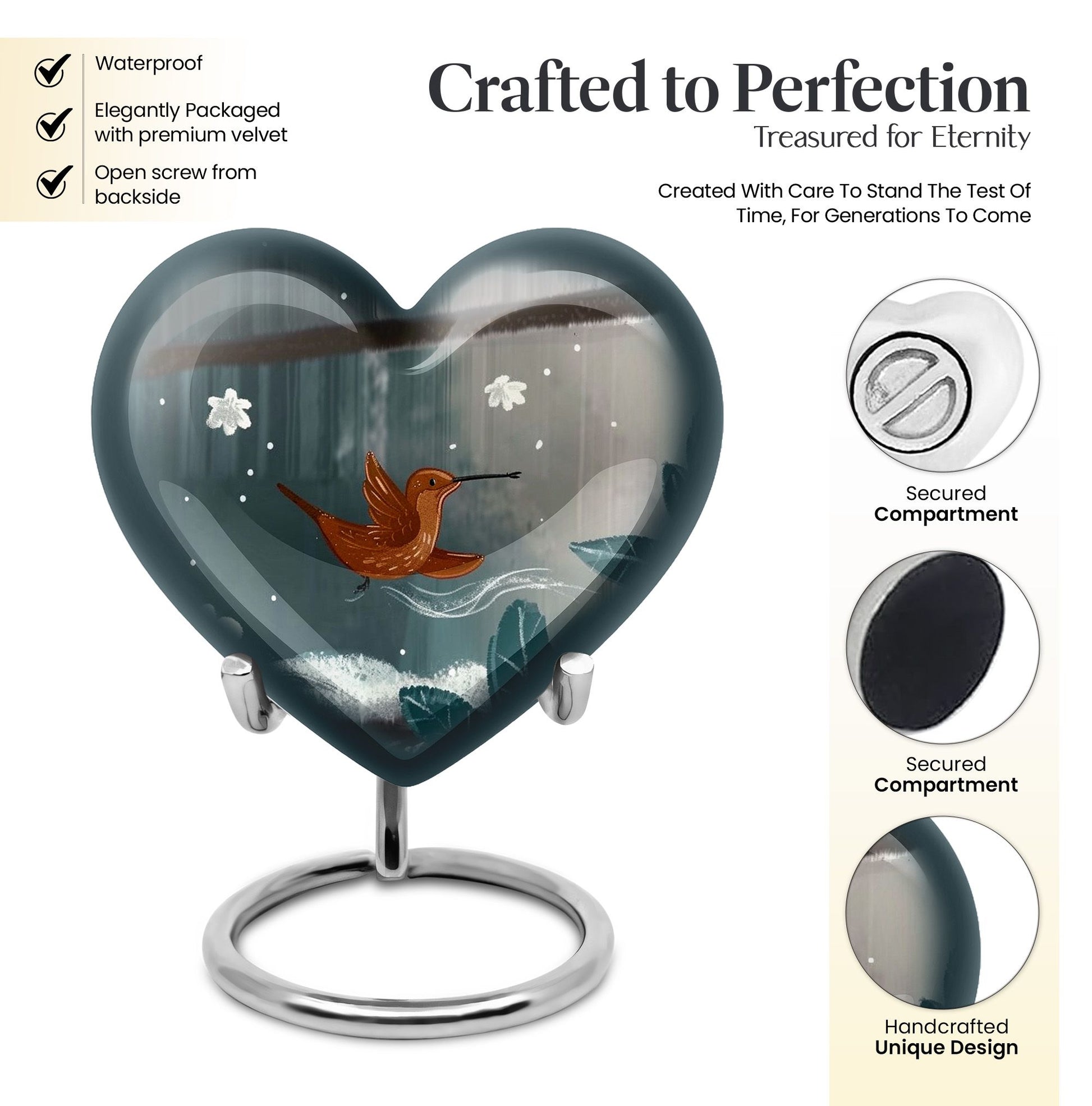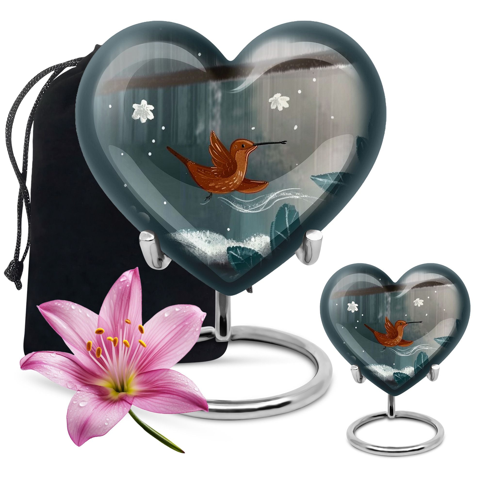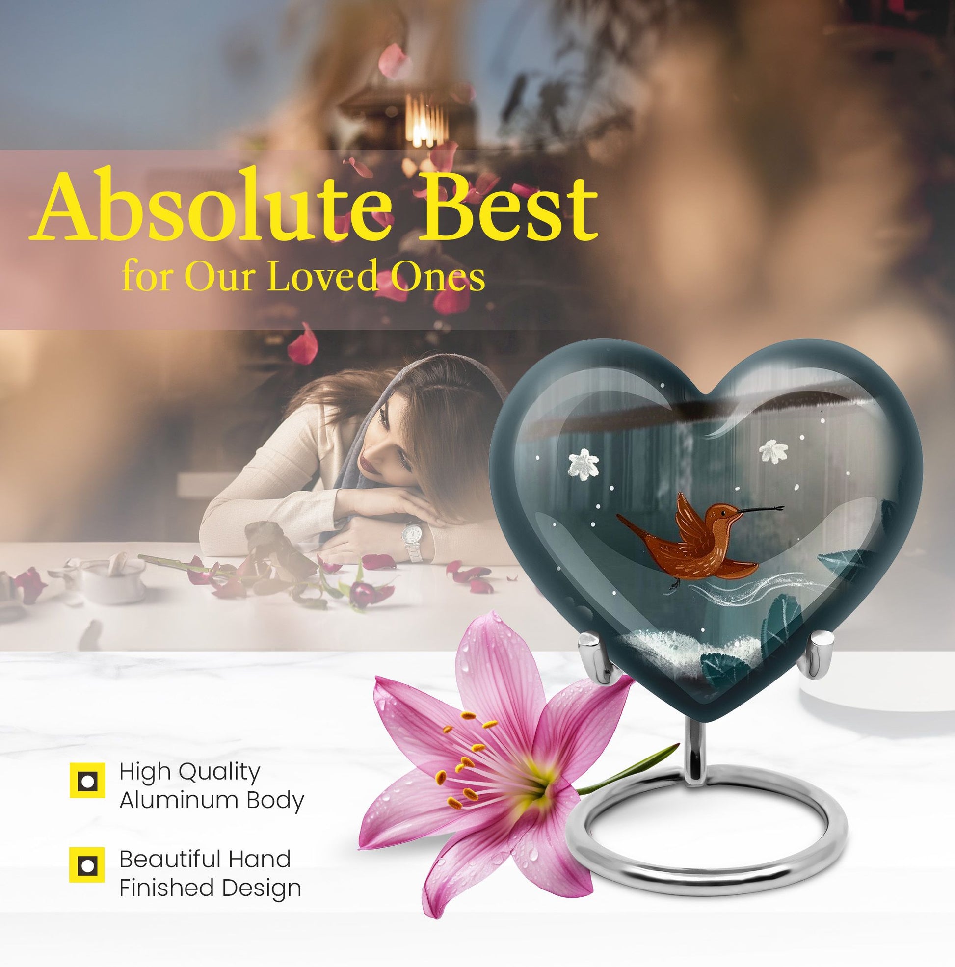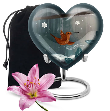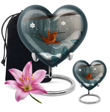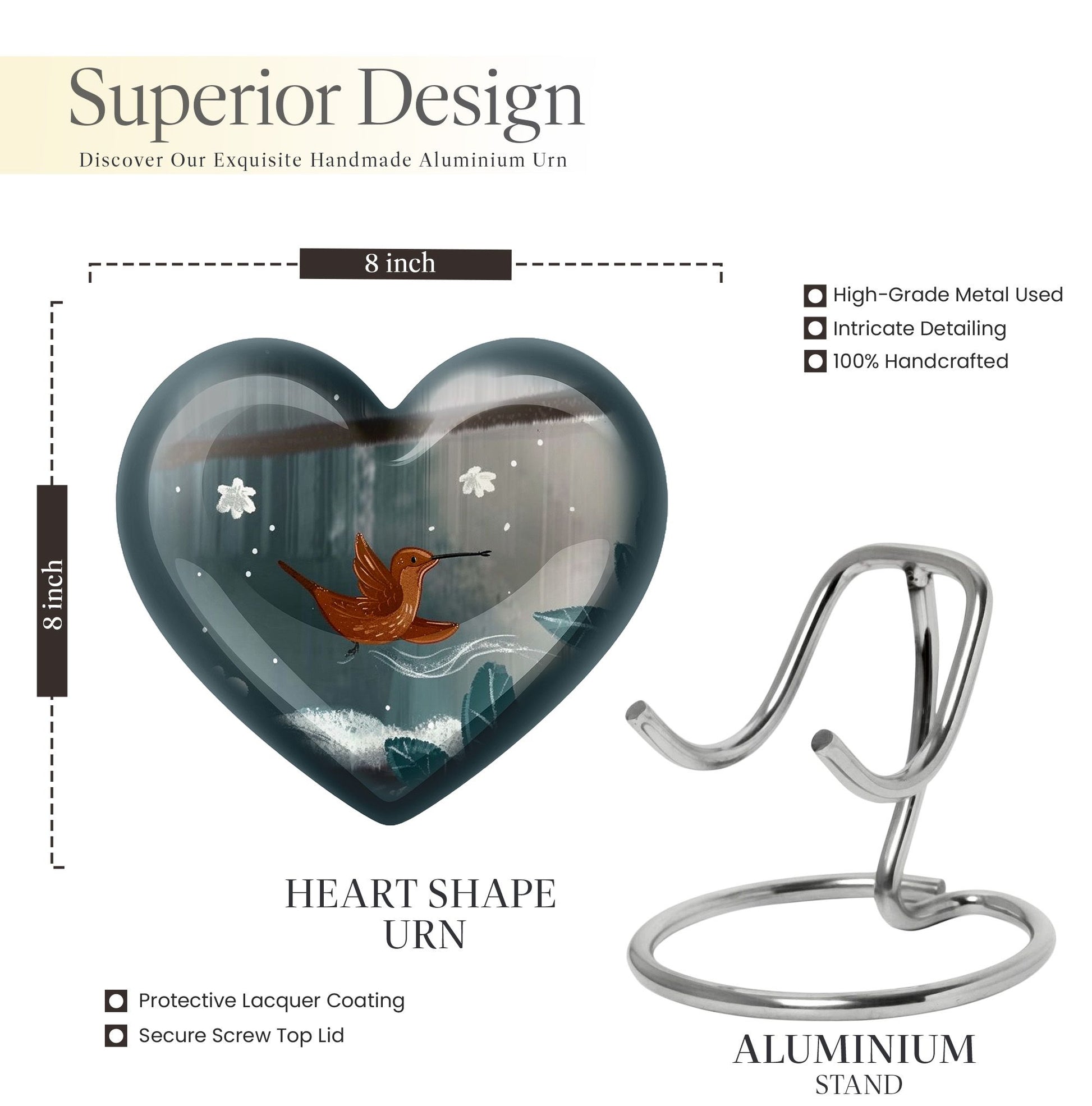 Embrace the everlasting memory of your beloved with our unique humming bird urn, an elegant tribute and final resting place. Our high-quality memorial burial urn is delicately crafted from aluminium, ensuring its longevity and durability with a weight of 3.3 pounds. Standing at 10 inches in height, the capacity of this large urn is approximately 200 cubic inches, ample space to safeguard the precious ashes of your adored ones. Our urn comes with a convenient velvet pouch for secure containment of ashes. Adding a personal touch, this cremation urn offers customization options with engraved names that emboss their cherished memory. The heart urn portrays an abstract theme, seamlessly merging sentimental value with artistic elegance. This is more than just an urn; it's a heartfelt dedication to a loved one's life journey. Suitably designed for any funeral burial, it's a respectful and fond way to keep your lost ones close to your heart.