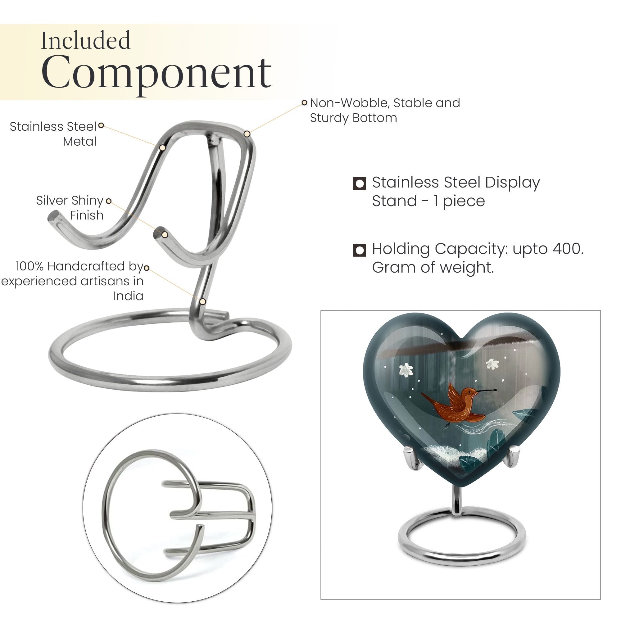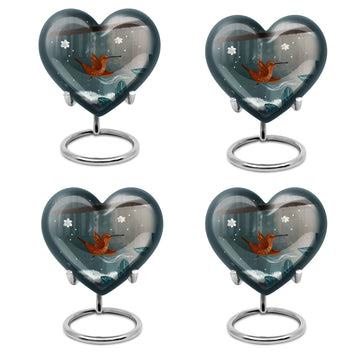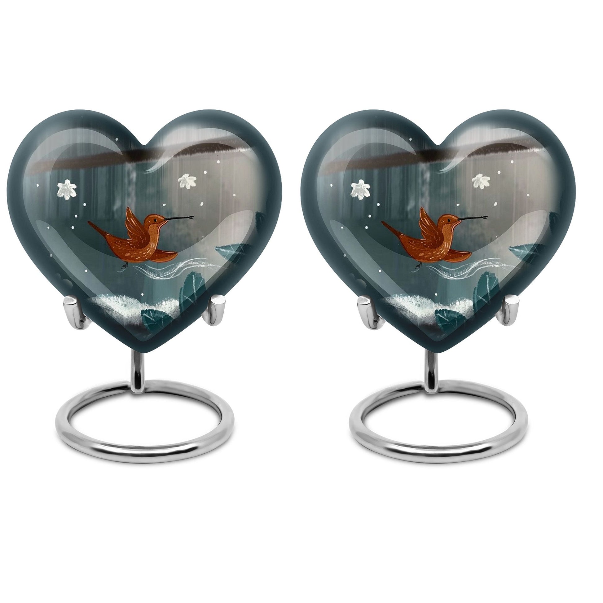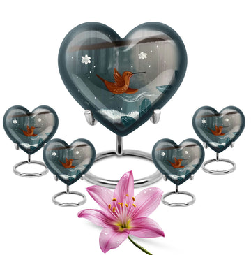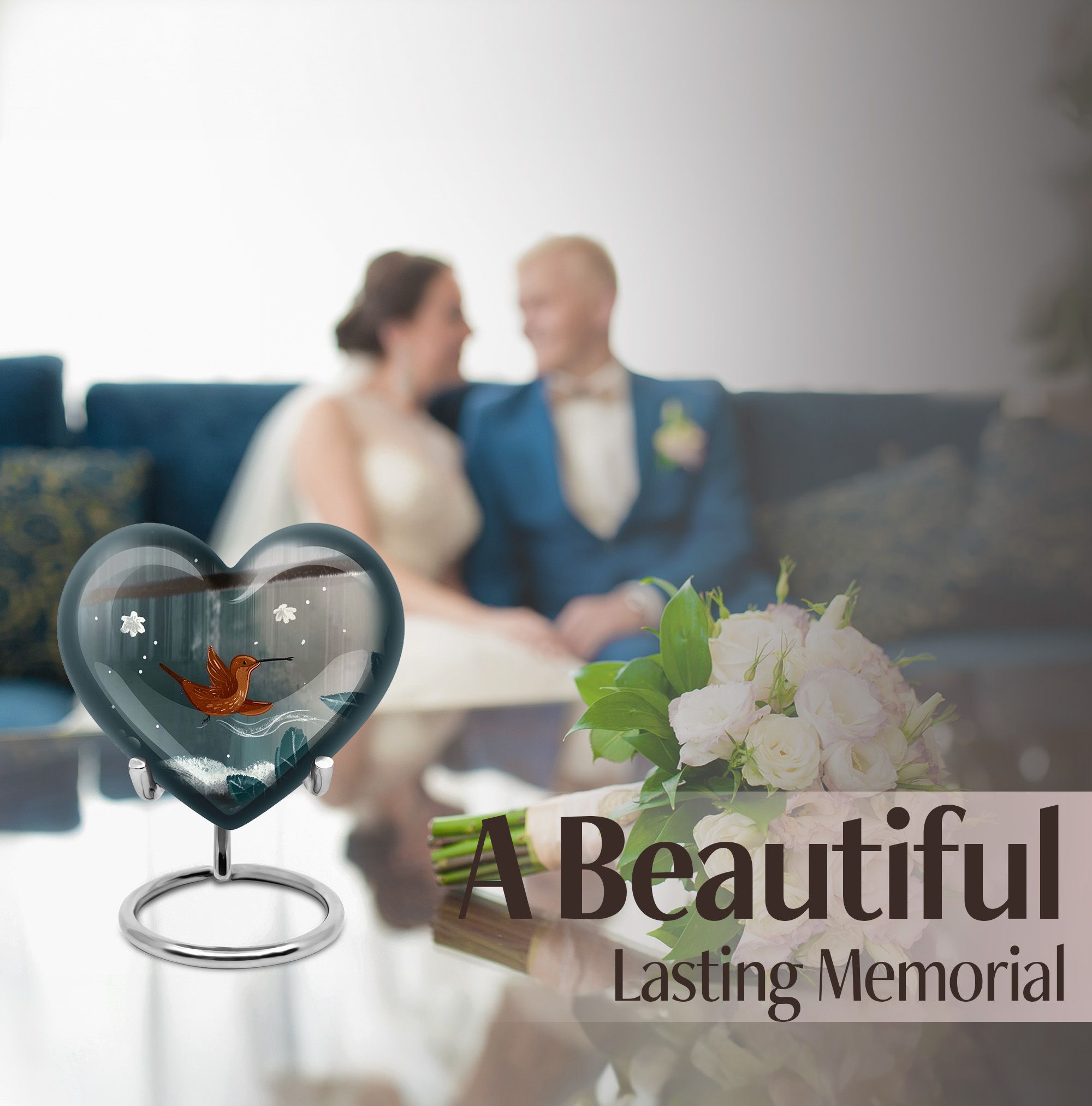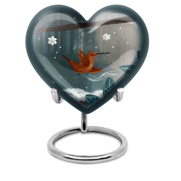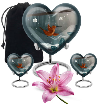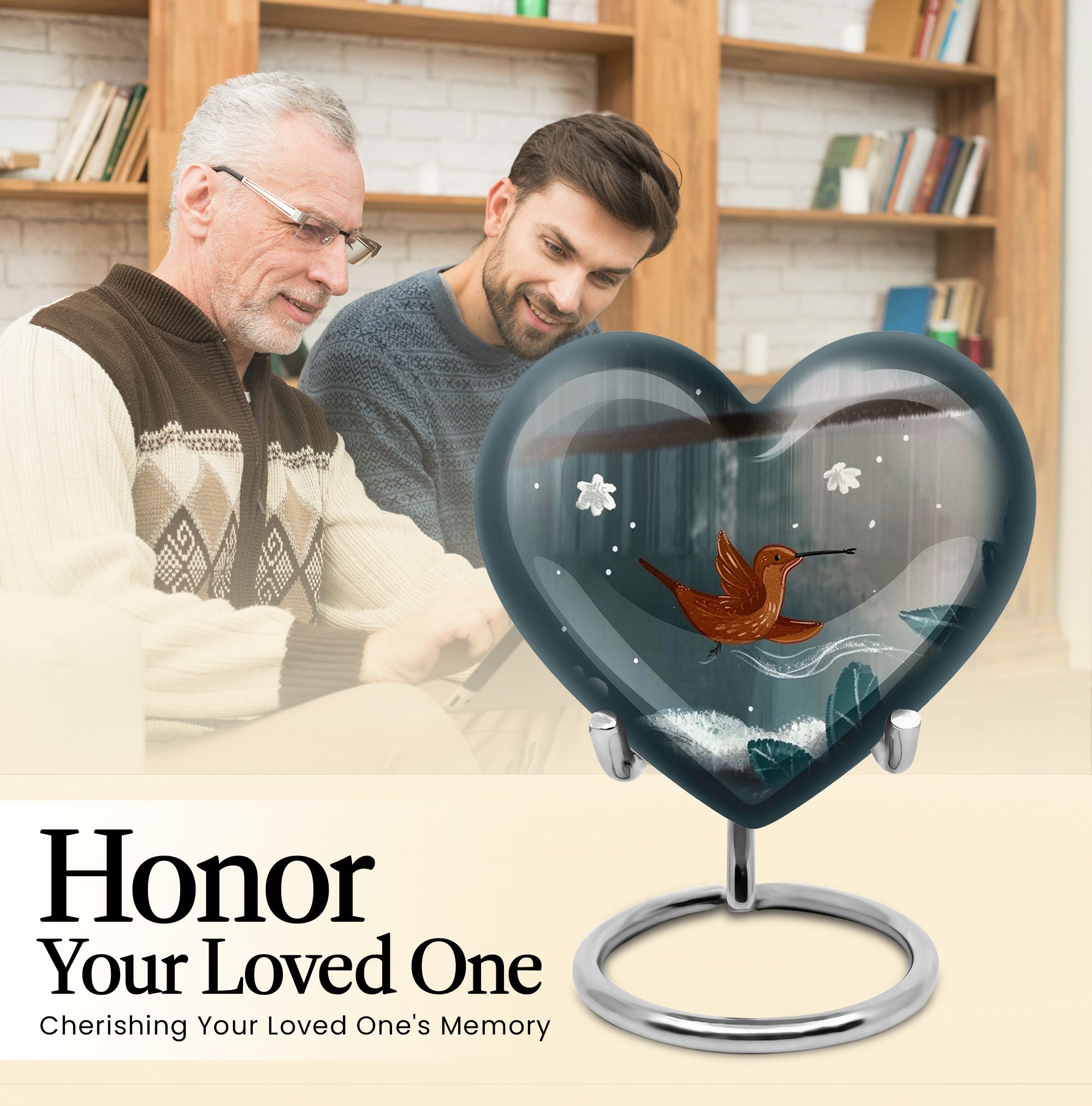 Embrace the everlasting memory of your beloved with our unique humming bird urn, an elegant tribute and final resting place. Our high-quality memorial burial urn is delicately crafted from aluminium, ensuring its longevity and durability with a weight of 3.3 pounds. Standing at 10 inches in height, the capacity of this large urn is approximately 200 cubic inches, ample space to safeguard the precious ashes of your adored ones. Our urn comes with a convenient velvet pouch for secure containment of ashes. Adding a personal touch, this cremation urn offers customization options with engraved names that emboss their cherished memory. The heart urn portrays an abstract theme, seamlessly merging sentimental value with artistic elegance. This is more than just an urn; it's a heartfelt dedication to a loved one's life journey. Suitably designed for any funeral burial, it's a respectful and fond way to keep your lost ones close to your heart.