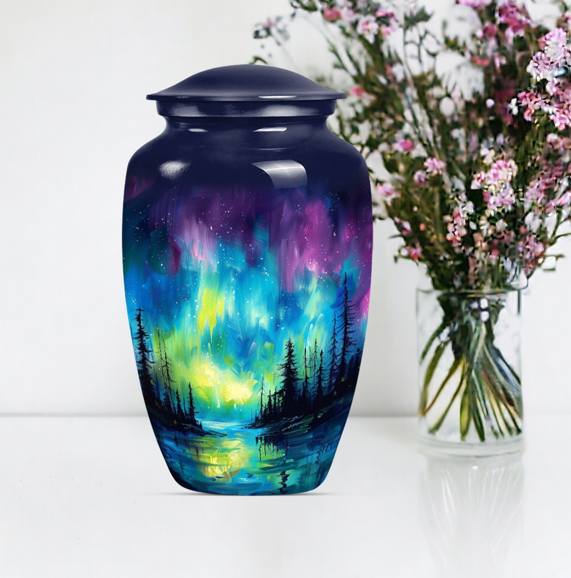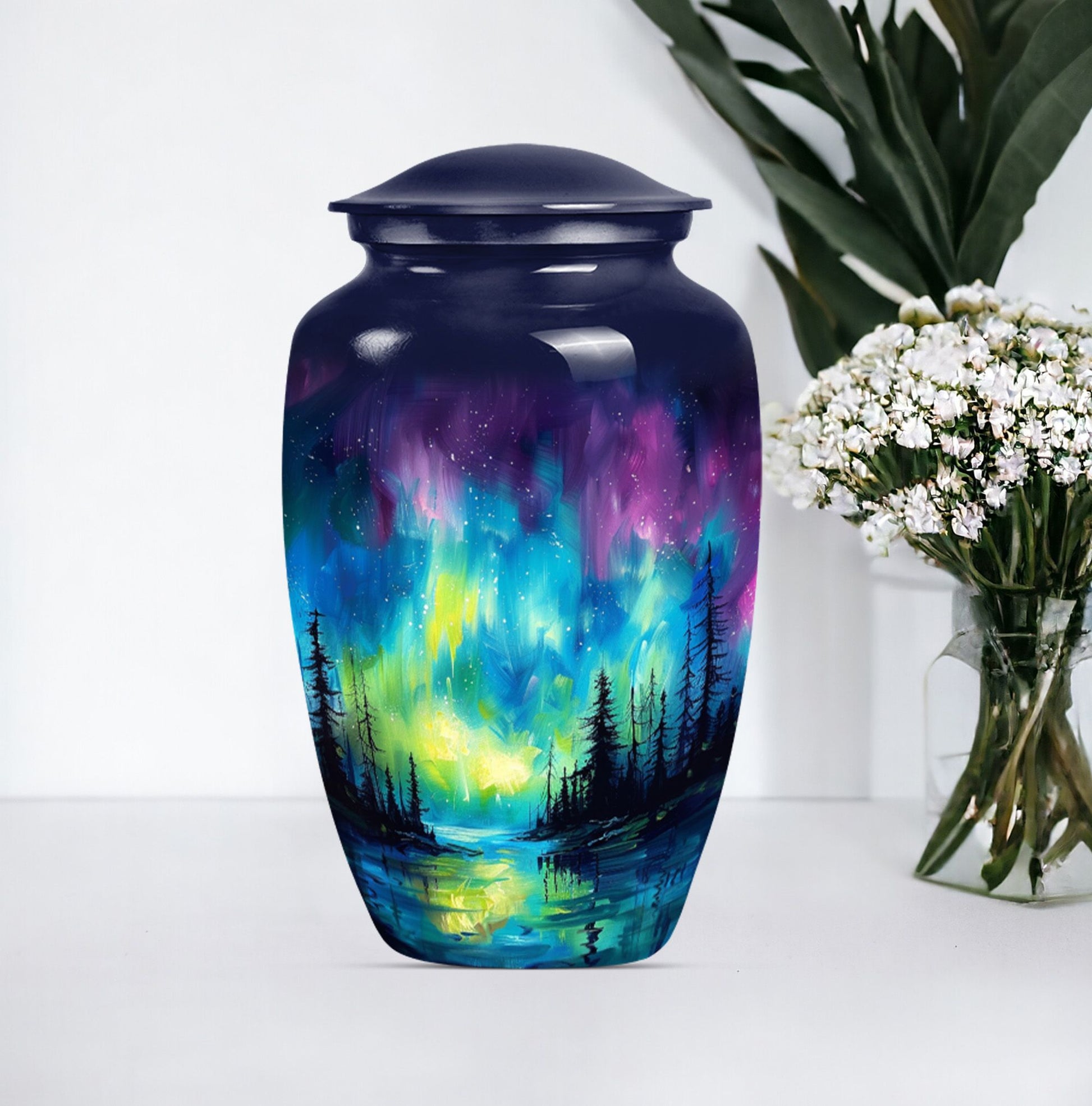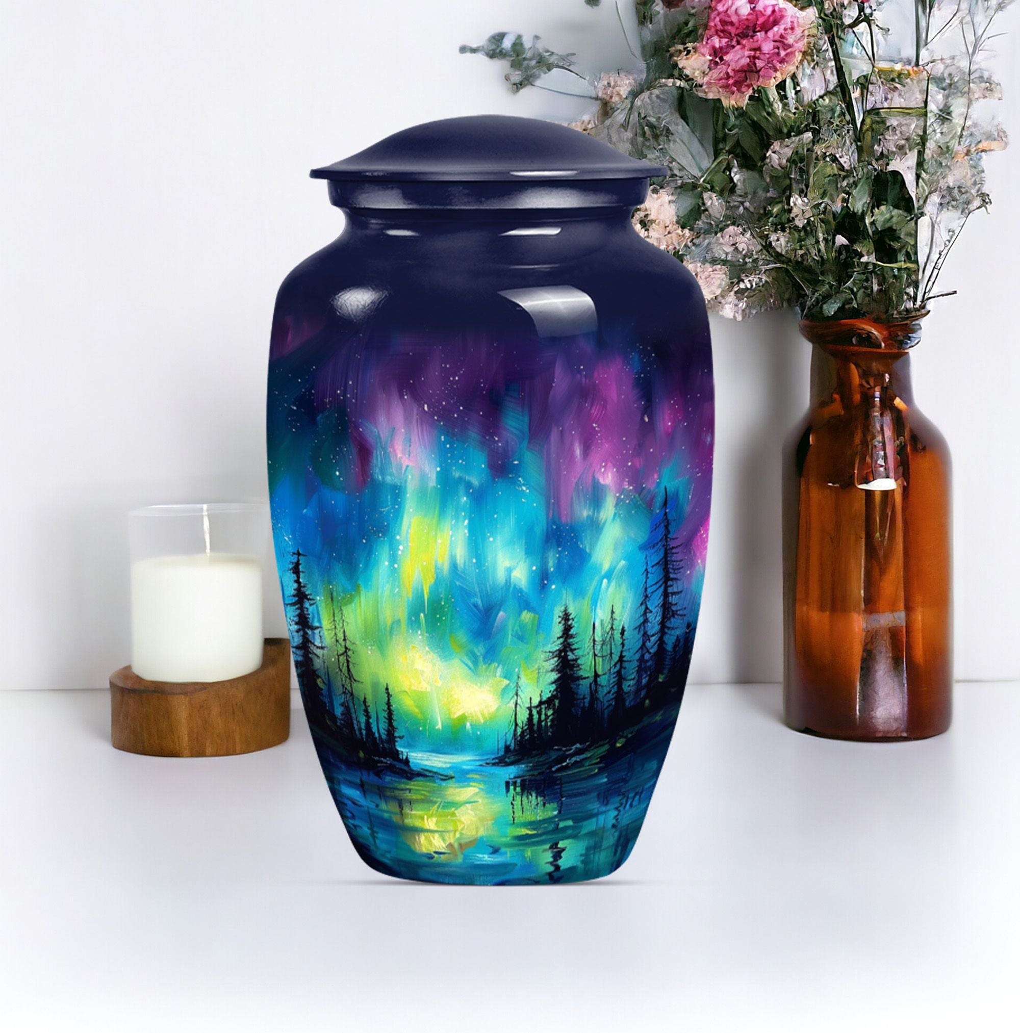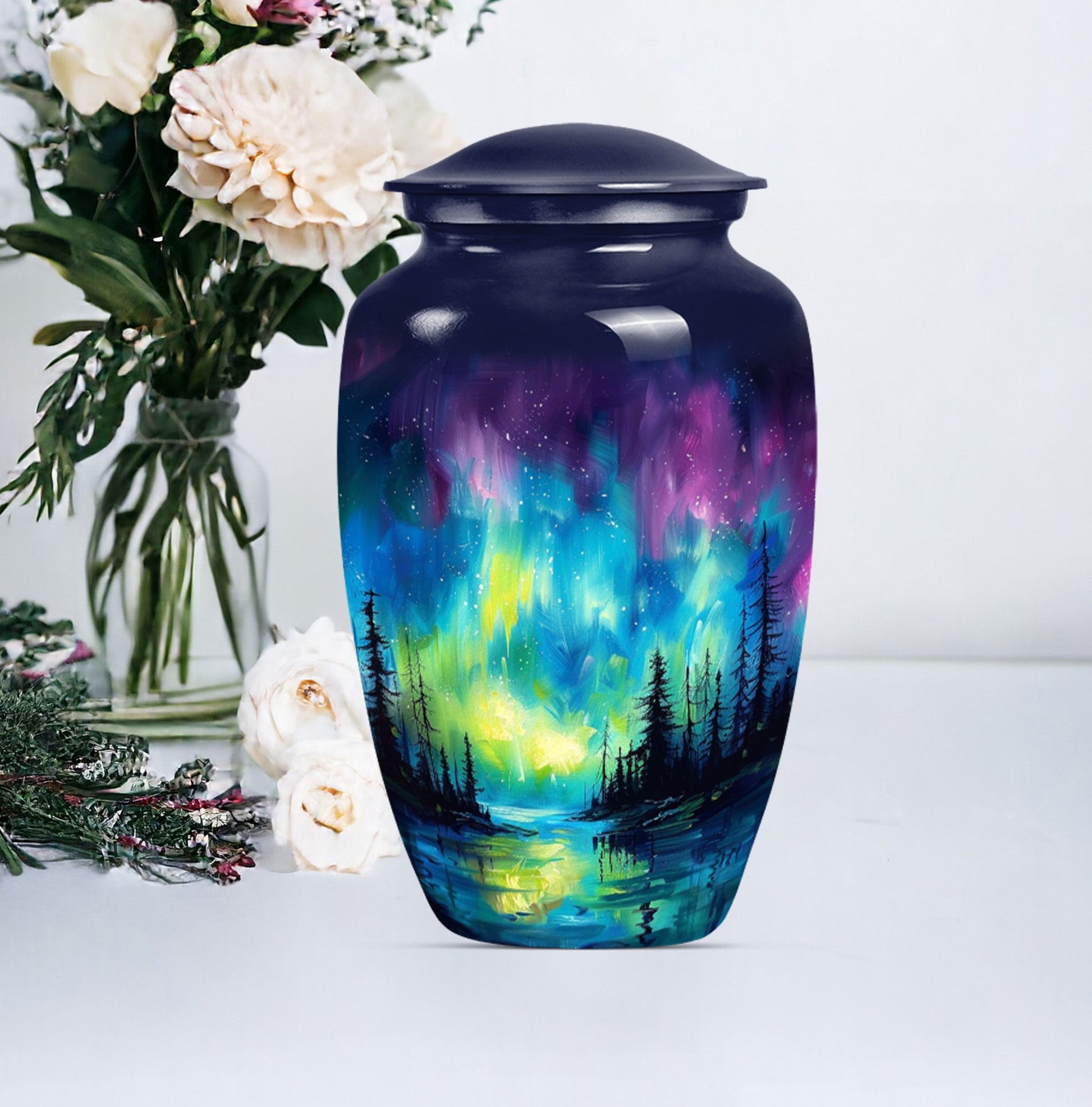 Immerse yourself in the serene memory of your loved ones with this 'Purple Meadow' themed cremation urn. A harmonious blend of beauty and tranquillity, this 10-inch 'Northern Lights Urn', offers a spacious capacity of 200 cubic inches and a weight of a mere 3.3 pounds. Crafted from premium quality aluminium, this urn characterized by its resiliency and vibrancy, is admirable in large urns sector. The classic urn design extends an elegant, yet simple look making it a perfect memorial burial urn for your beloved. Furthermore, we offer an opportunity to personalize this urn with engraved names fostering an irreplaceable connection. In the package, you will find a plush velvet pouch, thoughtfully included for the safe containment of your treasured ashes. With keywords such as 'Funeral ash urn', 'funeral burial', 'cremation urns for humans', and 'funeral urns for adult ashes men', remember that your search for meaningful memorials ends here. Lay your hands on our soothing Purple Meadow urn, a tribute as unique and remarkable as your loved one.