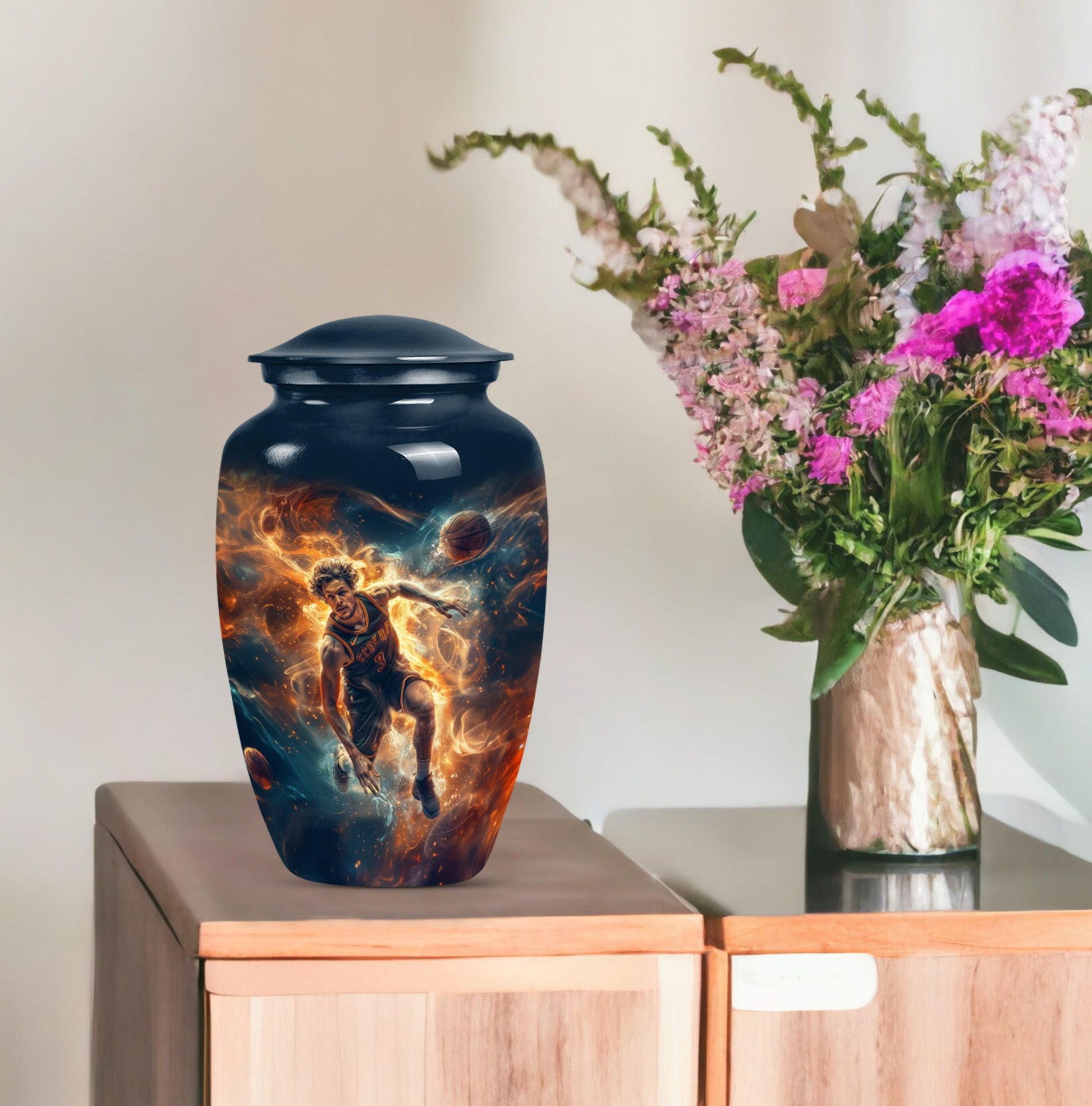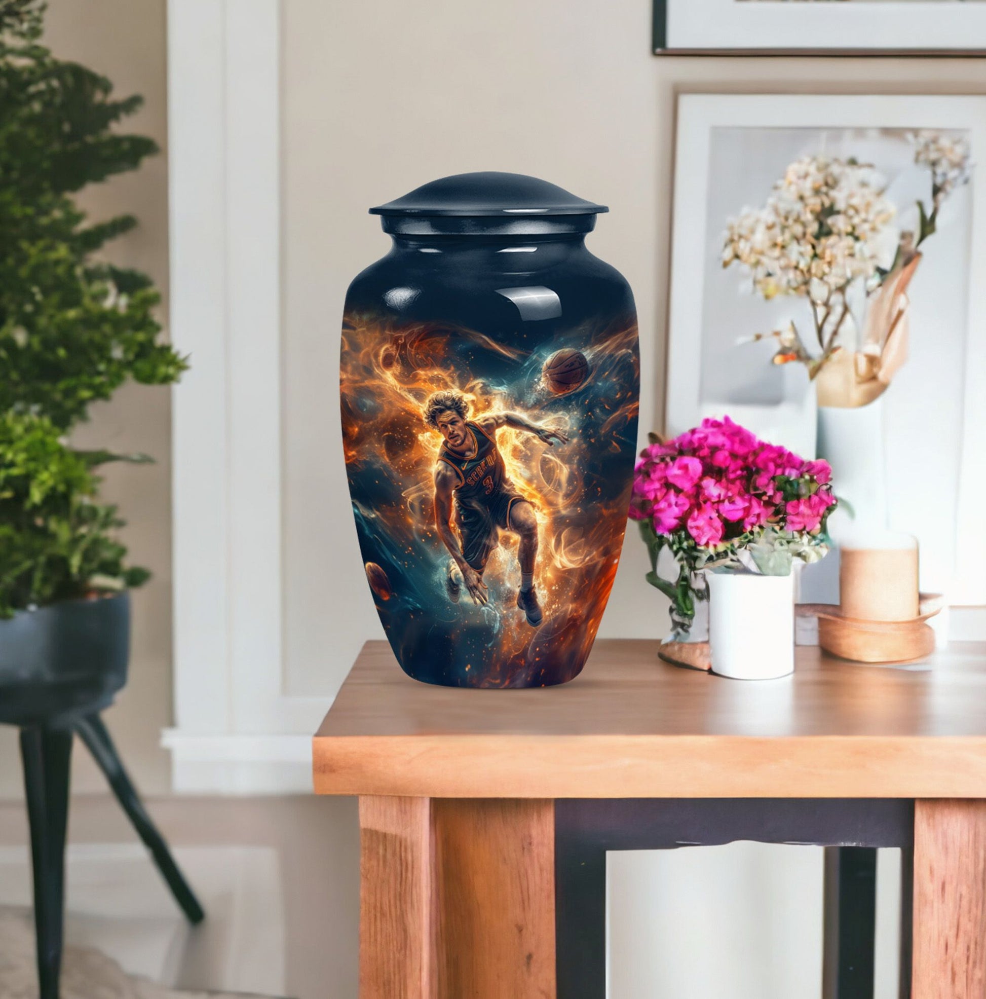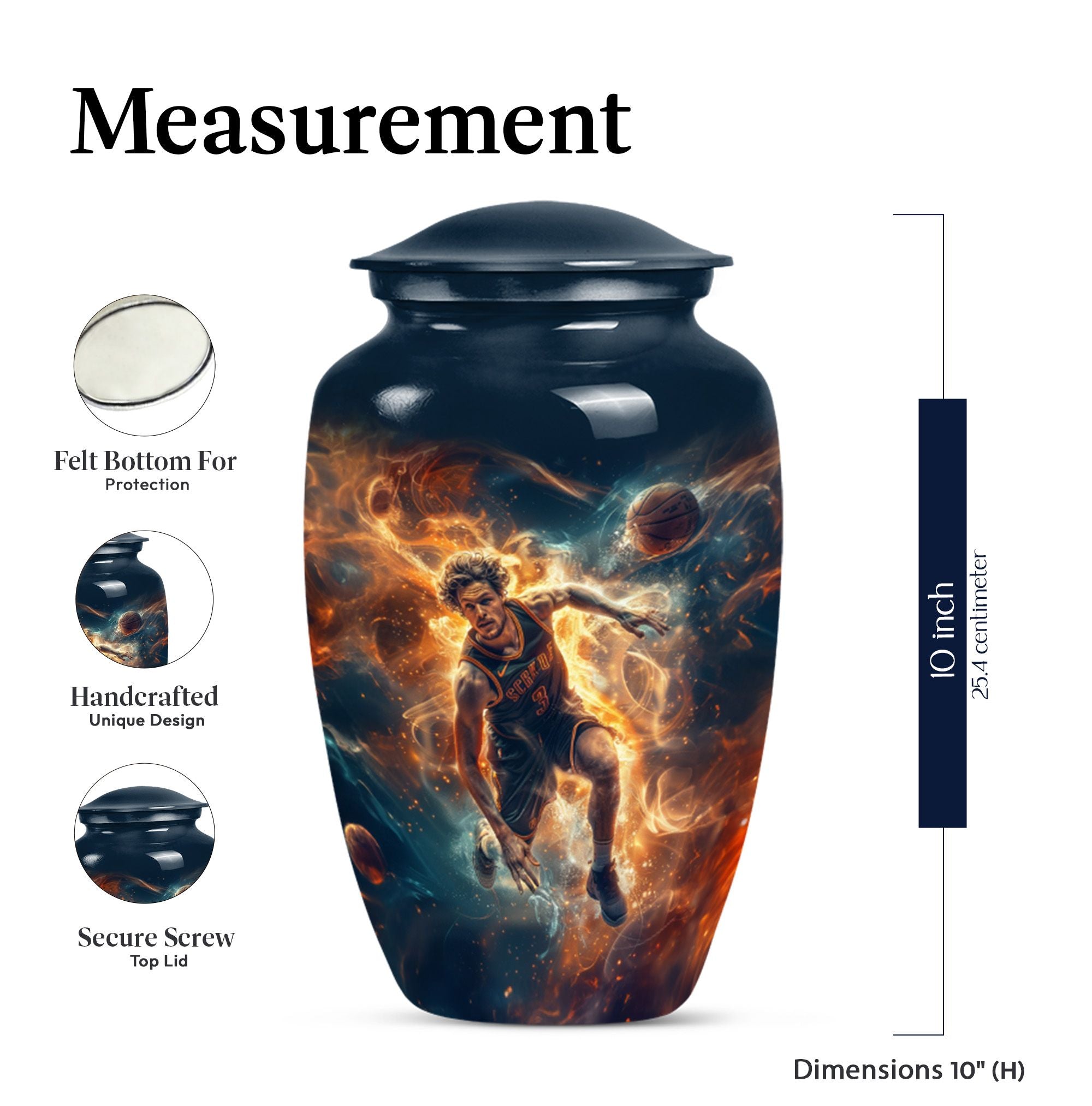 Preserving the memory of your loved ones, our basketball-urn for adults, is a tangible reminder of the sports-enthused persons’ eternal spirit. This expertly crafted large urn, encompassing dimensions of 10 inches in height and weighing about 3.3 pounds, is made of resilient, long-lasting aluminium. Enhanced with a tasteful gramophone theme, it adds a unique aesthetic feel that complements its purpose. This burial-custom-urn has an impressive capacity of 200 cubic inches making it amply spacious for holding contents securely. It comes with a soft velvet pouch suitable for sensitive containment of ashes. Moreover, it allows you to personalize it with engraved names, adding a touch of intimacy to this cherished memorial. Ideal for both 'urn human ash women' and 'cremation dad urn', this product stands out in the 'funeral urns for human ashes adult' category. Note: The size is 10”, the apt reminder of our unending connection with the departed.