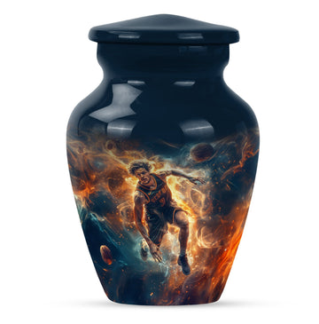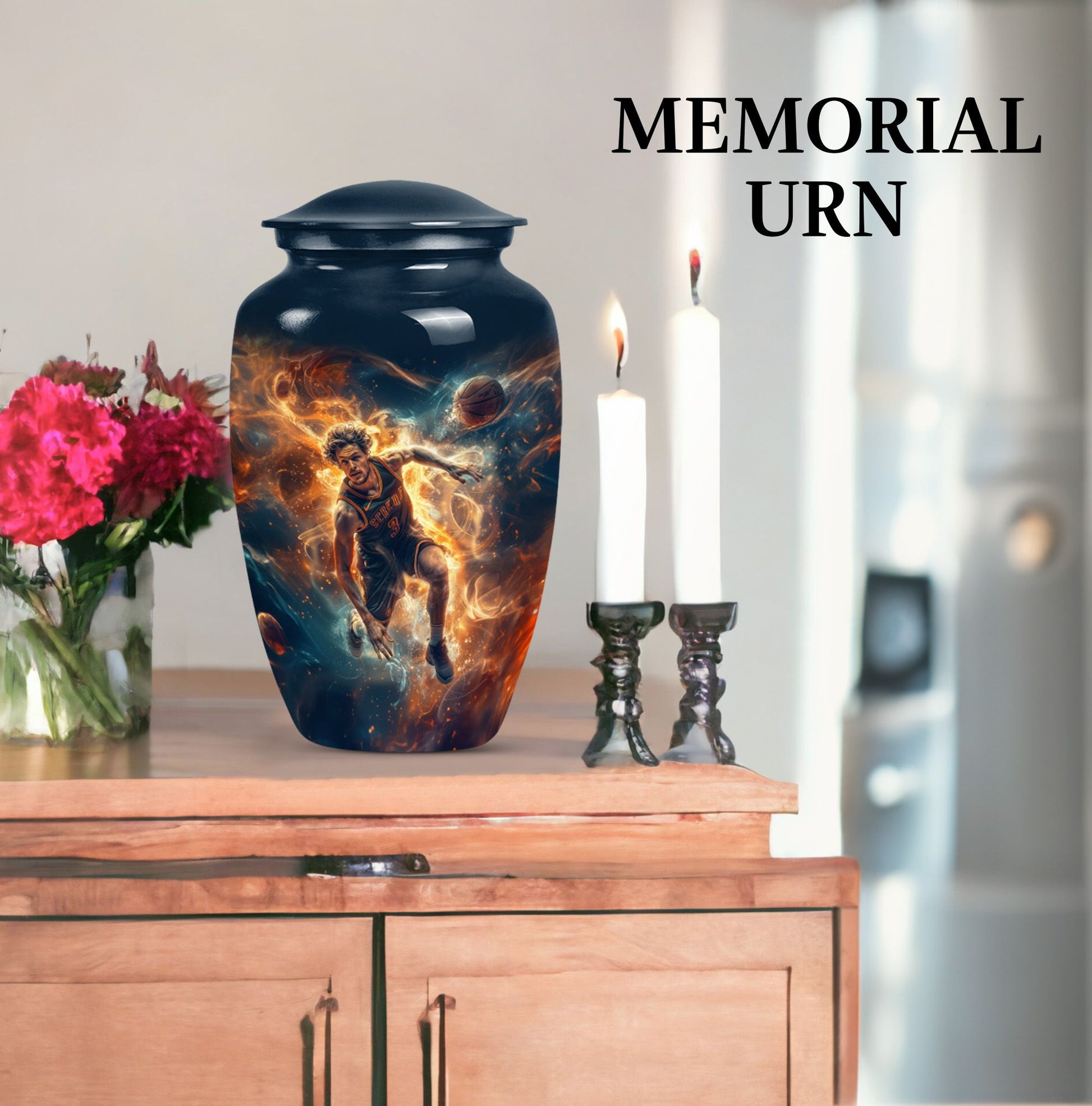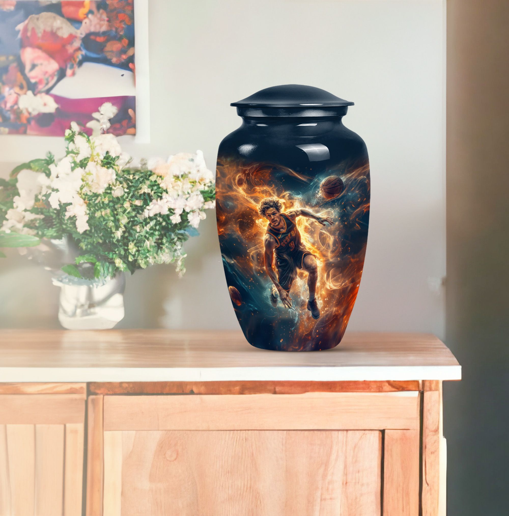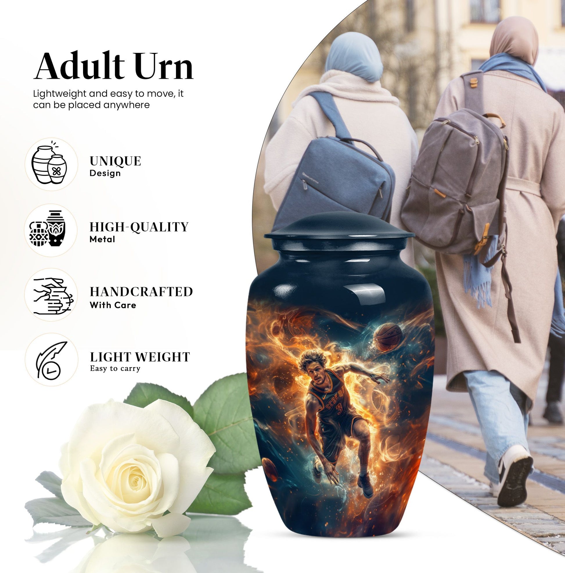 Preserving the memory of your loved ones, our basketball-urn for adults, is a tangible reminder of the sports-enthused persons’ eternal spirit. This expertly crafted large urn, encompassing dimensions of 10 inches in height and weighing about 3.3 pounds, is made of resilient, long-lasting aluminium. Enhanced with a tasteful gramophone theme, it adds a unique aesthetic feel that complements its purpose. This burial-custom-urn has an impressive capacity of 200 cubic inches making it amply spacious for holding contents securely. It comes with a soft velvet pouch suitable for sensitive containment of ashes. Moreover, it allows you to personalize it with engraved names, adding a touch of intimacy to this cherished memorial. Ideal for both 'urn human ash women' and 'cremation dad urn', this product stands out in the 'funeral urns for human ashes adult' category. Note: The size is 10”, the apt reminder of our unending connection with the departed.