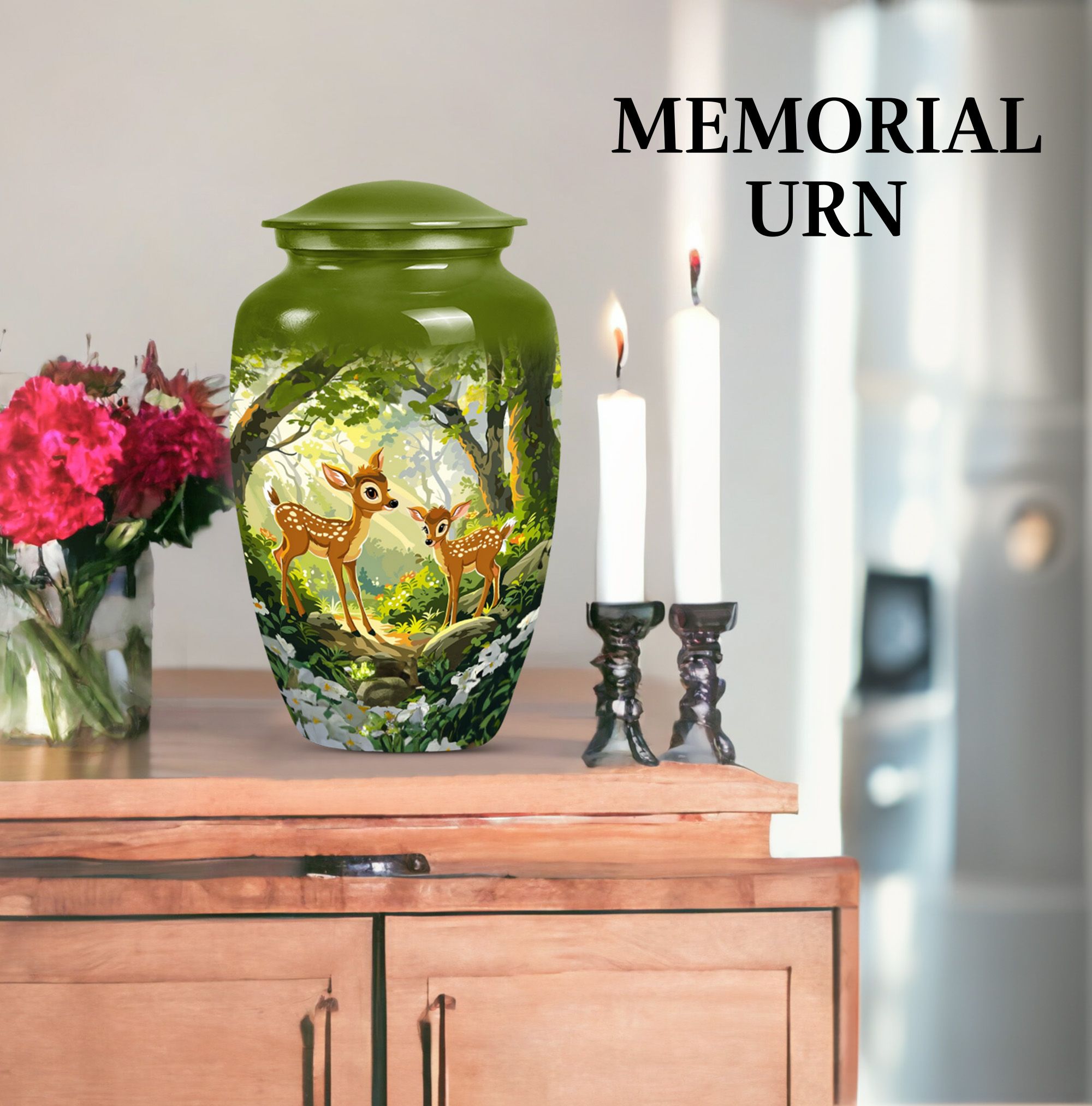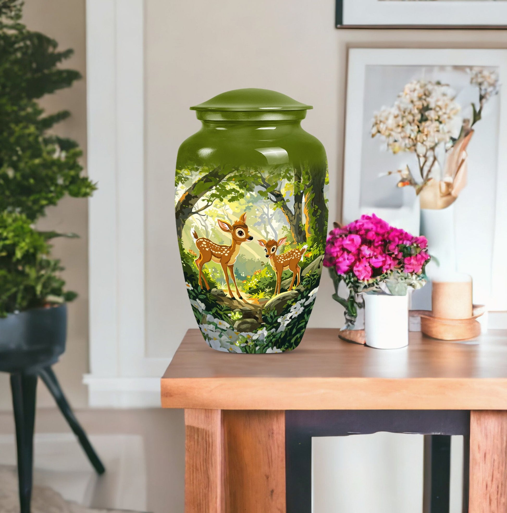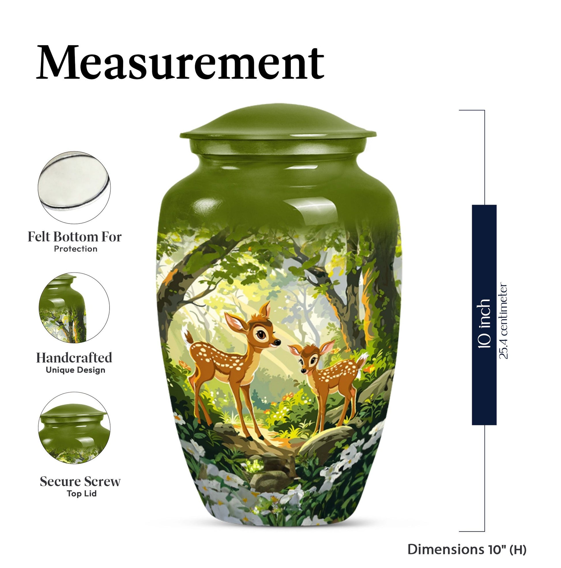 Honor and remember your loved ones with the Classic Gramophone Deer Urn. Crafted with utmost care from high-quality aluminum, this funeral urn for men ashes showcases a timeless appeal that transcends generations. The 10-inch height and weight of 3.3 pounds give this large urn a substantial and robust feel. Yet, despite its size, it conceals its true purpose with its gramophone theme, acting as an elegantly discreet tribute. The cremation urn comes with a capacity of 200 cubic inches, sufficient to hold the ashes of an adult. Packaged with a sophisticated velvet pouch for safe containment of ashes, this urn keeps your dearly departed close to your heart. Apart from its awe-inspiring appearance, this urn offers an opportunity for customization with engraved names, letting you personalize this sacred keepsake. Highly recommended as a tasteful, considerate choice among decorative human ashes urns, this metal urn adds a touch of grace to any surrounding. Celebrate your loved one's memory with this distinguished urn, a tribute as unique as they are.