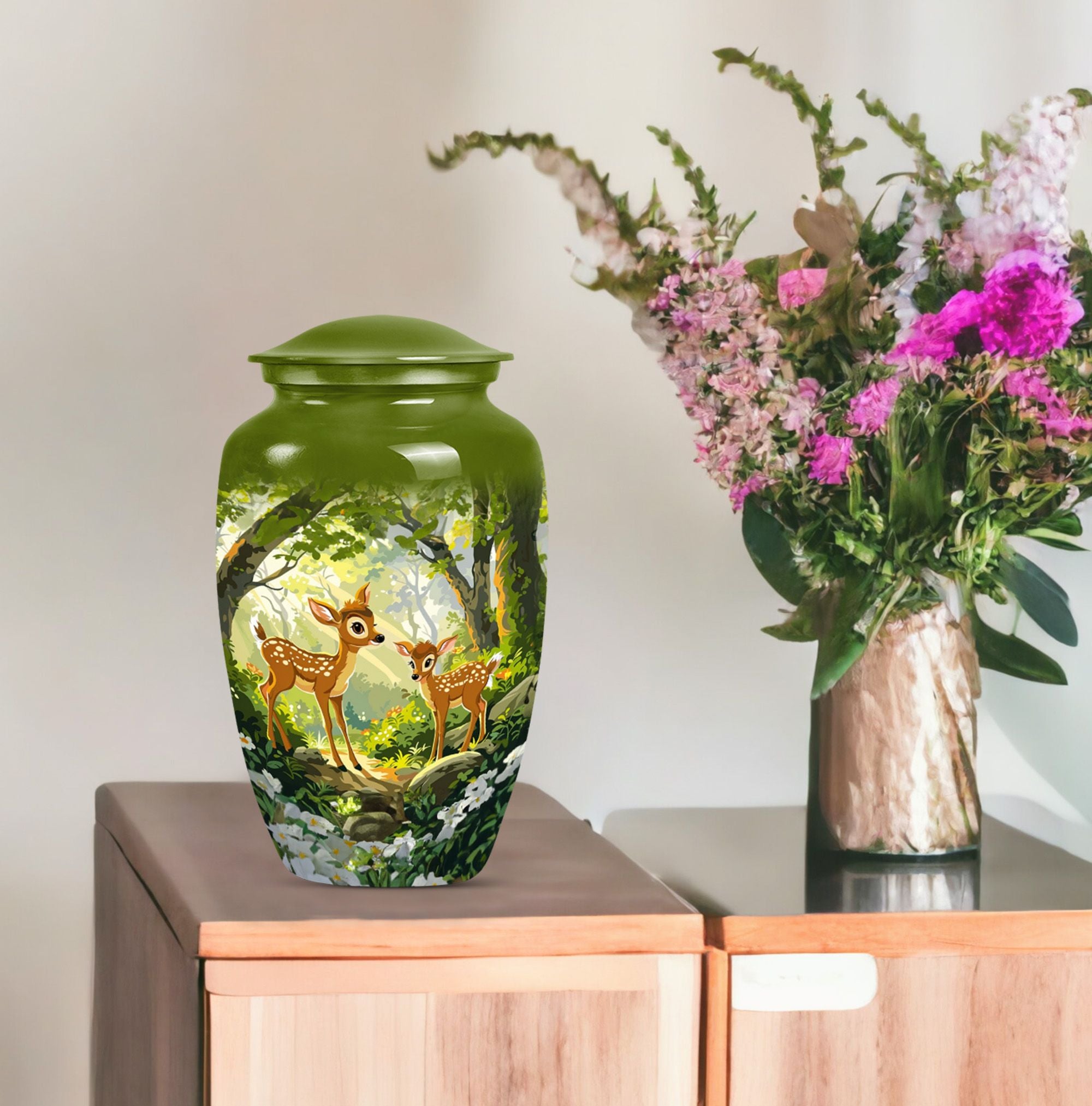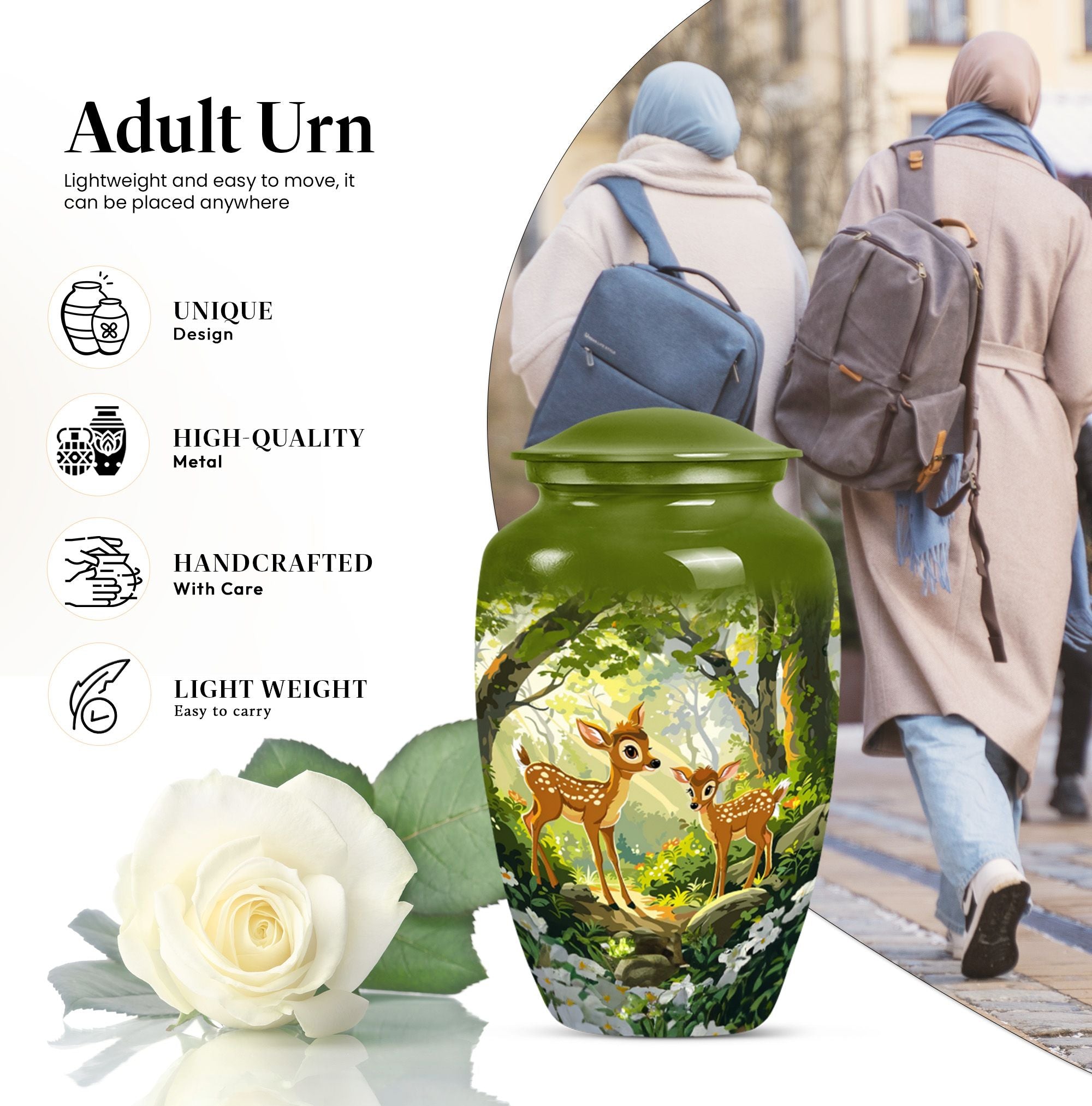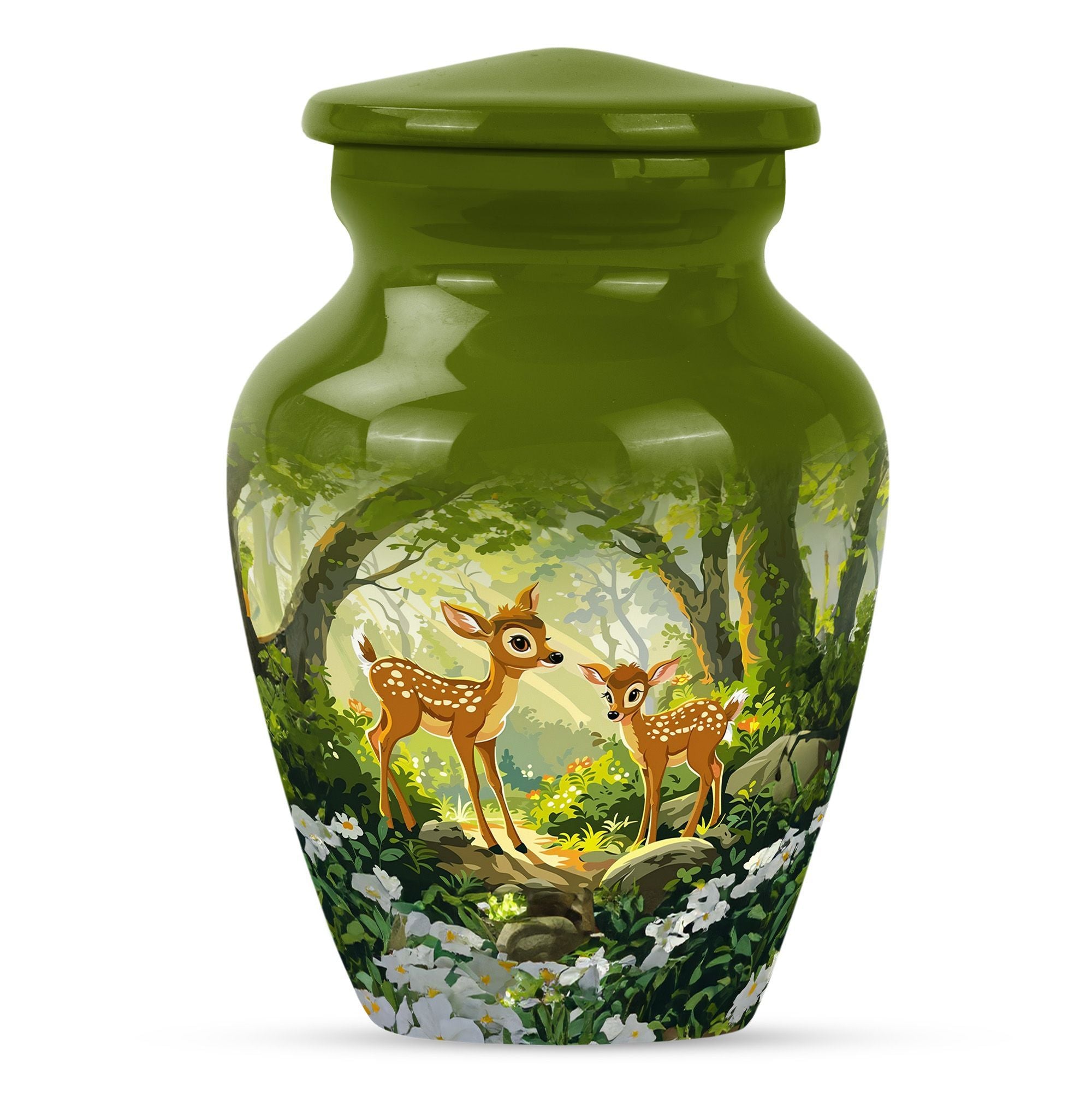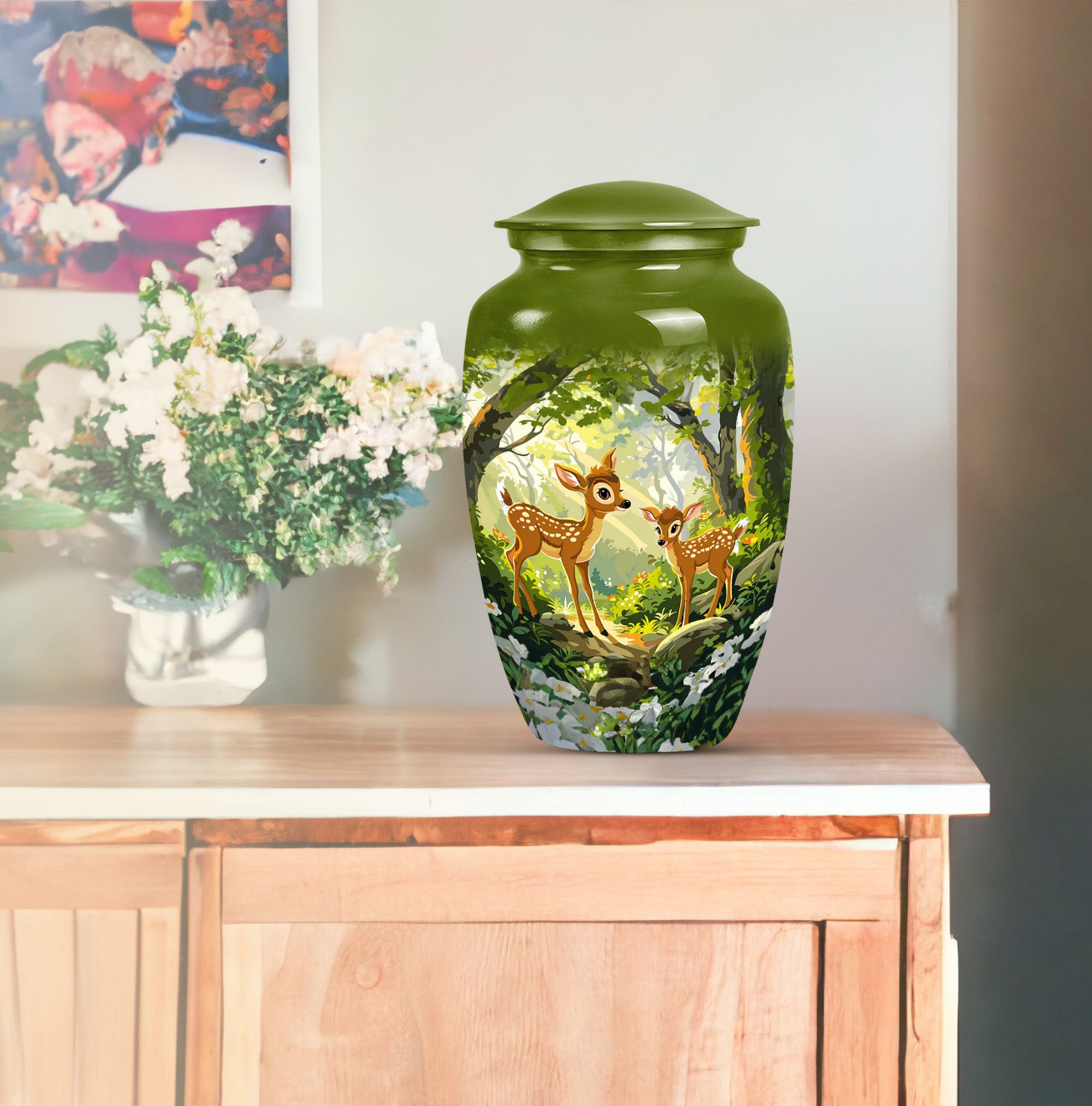 Honor and remember your loved ones with the Classic Gramophone Deer Urn. Crafted with utmost care from high-quality aluminum, this funeral urn for men ashes showcases a timeless appeal that transcends generations. The 10-inch height and weight of 3.3 pounds give this large urn a substantial and robust feel. Yet, despite its size, it conceals its true purpose with its gramophone theme, acting as an elegantly discreet tribute. The cremation urn comes with a capacity of 200 cubic inches, sufficient to hold the ashes of an adult. Packaged with a sophisticated velvet pouch for safe containment of ashes, this urn keeps your dearly departed close to your heart. Apart from its awe-inspiring appearance, this urn offers an opportunity for customization with engraved names, letting you personalize this sacred keepsake. Highly recommended as a tasteful, considerate choice among decorative human ashes urns, this metal urn adds a touch of grace to any surrounding. Celebrate your loved one's memory with this distinguished urn, a tribute as unique as they are.