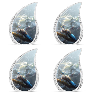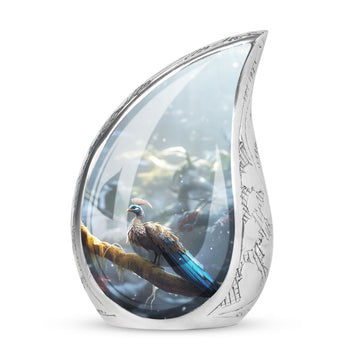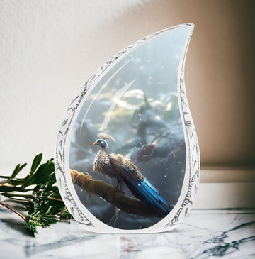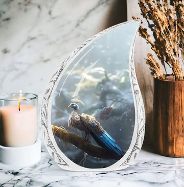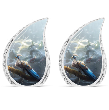 Honor your departed loved ones with the enduring beauty of our Peacock Memorial Urn, a large cremation urn exquisitely crafted from high-quality aluminium. Measuring 3 inches in size and weighing a solid 3.3 pounds, this urn is as robust as it is elegant. The urn stands at an impressive 10 inches in height, boasting a capacity of 200 cubic inches, sufficient to house the ashes of your departed in dignified solace. More than just a funeral urn, this piece doubles as a modern decorative accent, enhancing any space with its classic styling. Attention to detail is evident in our comprehensive package contents that include a plush velvet pouch for smooth containment and respectful presentation of ashes. We offer the additional service of personalizing this urn with engraved names, making it a truly unique tribute to your dearly departed. Whether you're looking for urns for Dad, or require cremation urns for burial, this timelessly aesthetic creation is a worthy choice.