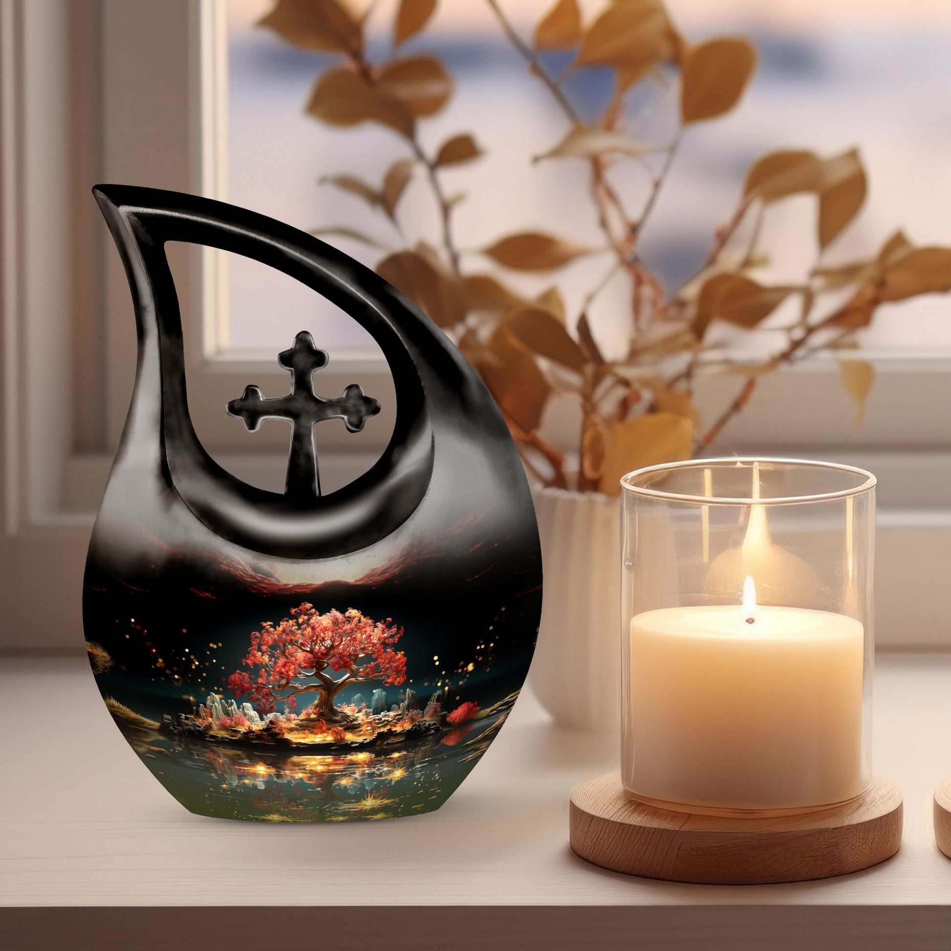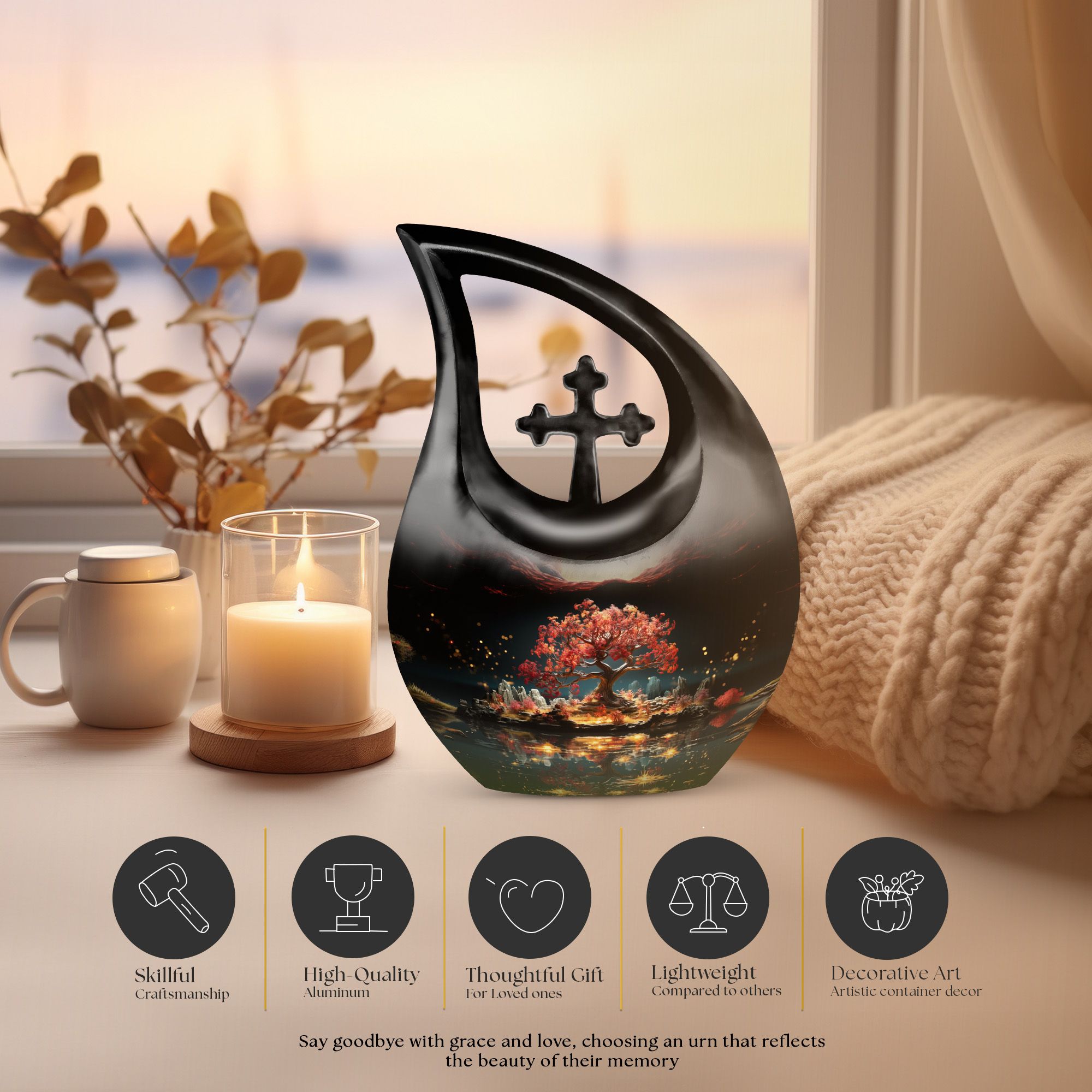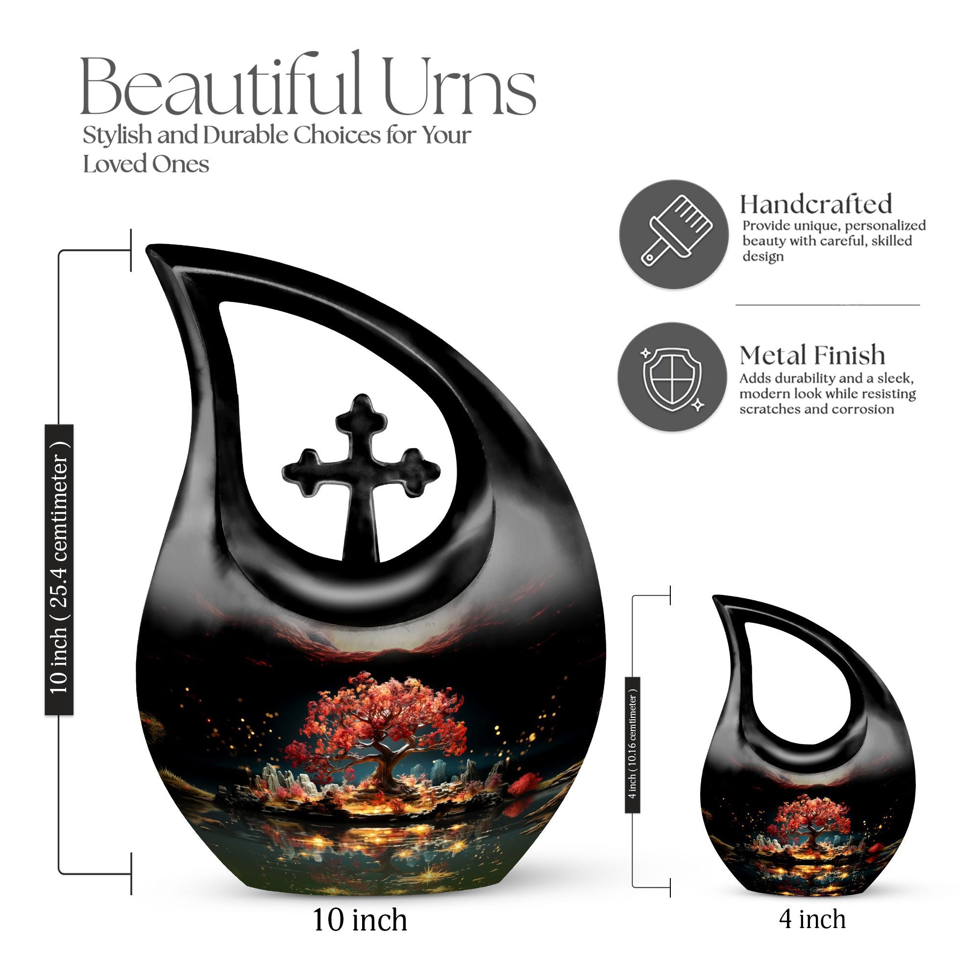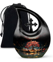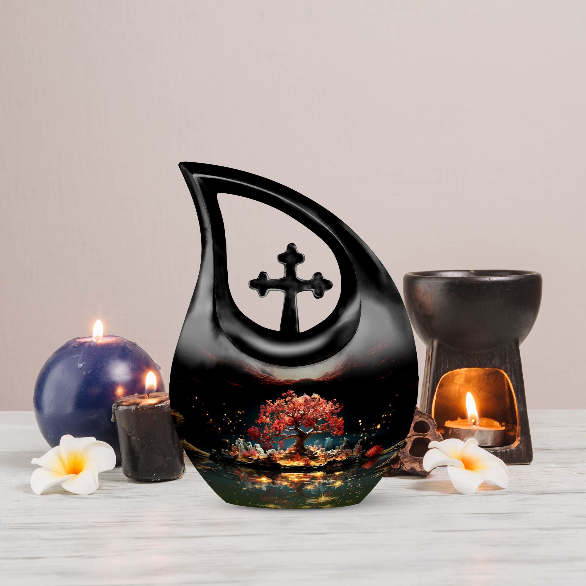 Discover our elegantly refined Crimson Eclipse Sanctuary Urn, a tribute to your cherished ones embodying timeless dignity. Measuring at 10 inches and a weight of a modest 3.3 pounds, this large urn is set to accommodate up to 200 cubic inches. Crafted from superior aluminium, this sophisticated memorial urn showcases the theme of Crimson Eclipse Sanctuary, exuding reverence and tranquility with its intricate details. The sizeable urn comes with a delicate velvet pouch for the containment and safekeeping of ashes, enhancing its sanctity. The urn offers a room for personal touch with the option to engrave names, adding a profound sentiment to this precious keepsake. Characterized by its 'Cross Drop' motif, our urn is subtly impactful, encapsulating indelible memories and honouring a lifetime of love and warmth. Looking for 'Miniature urns', 'Cremation Containers', or 'Square Urn'? Explore 'Precious Memories Urns', your go-to destination for premium grade memorial supplies.