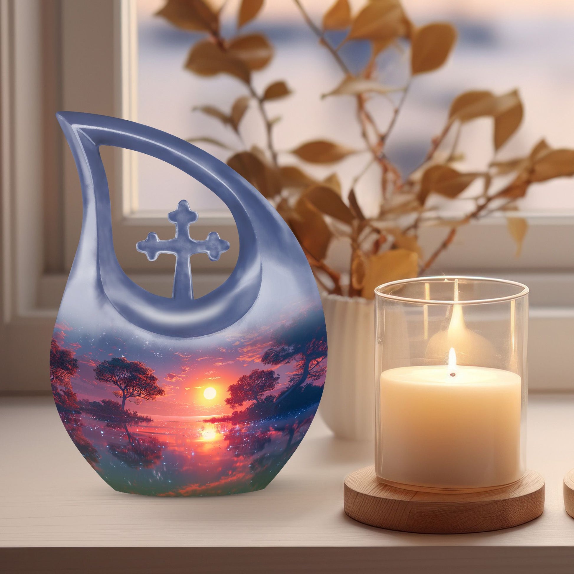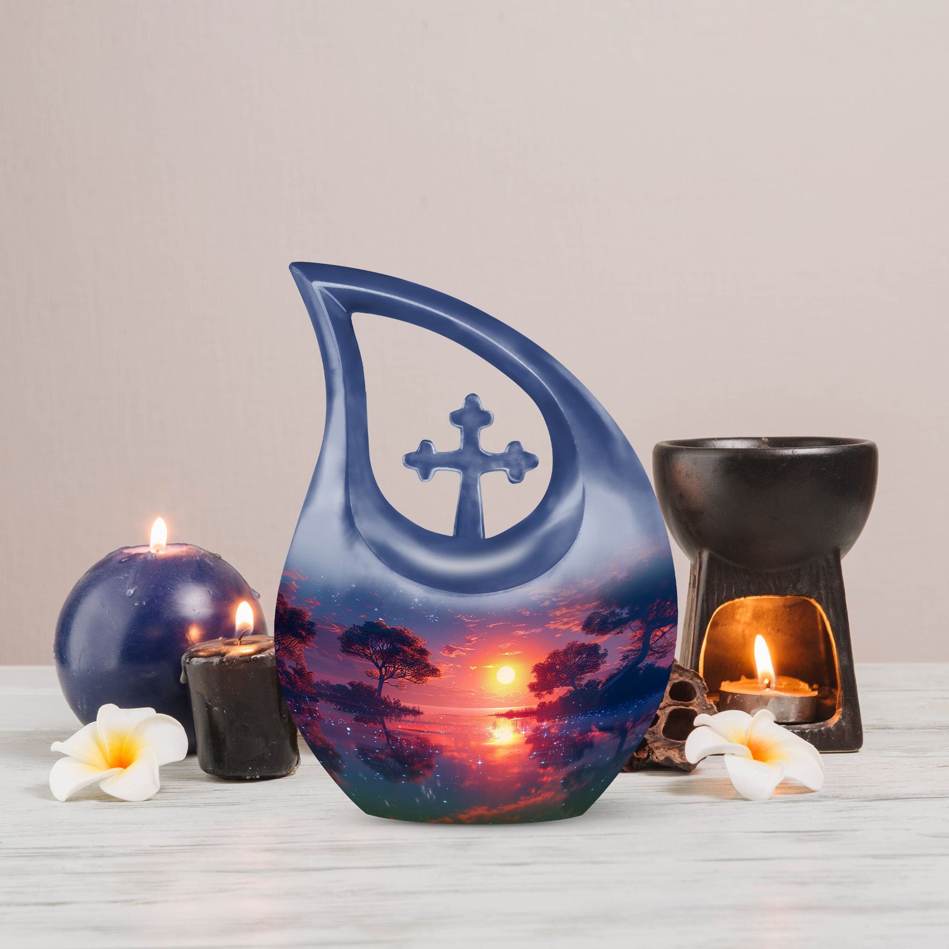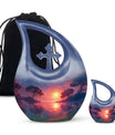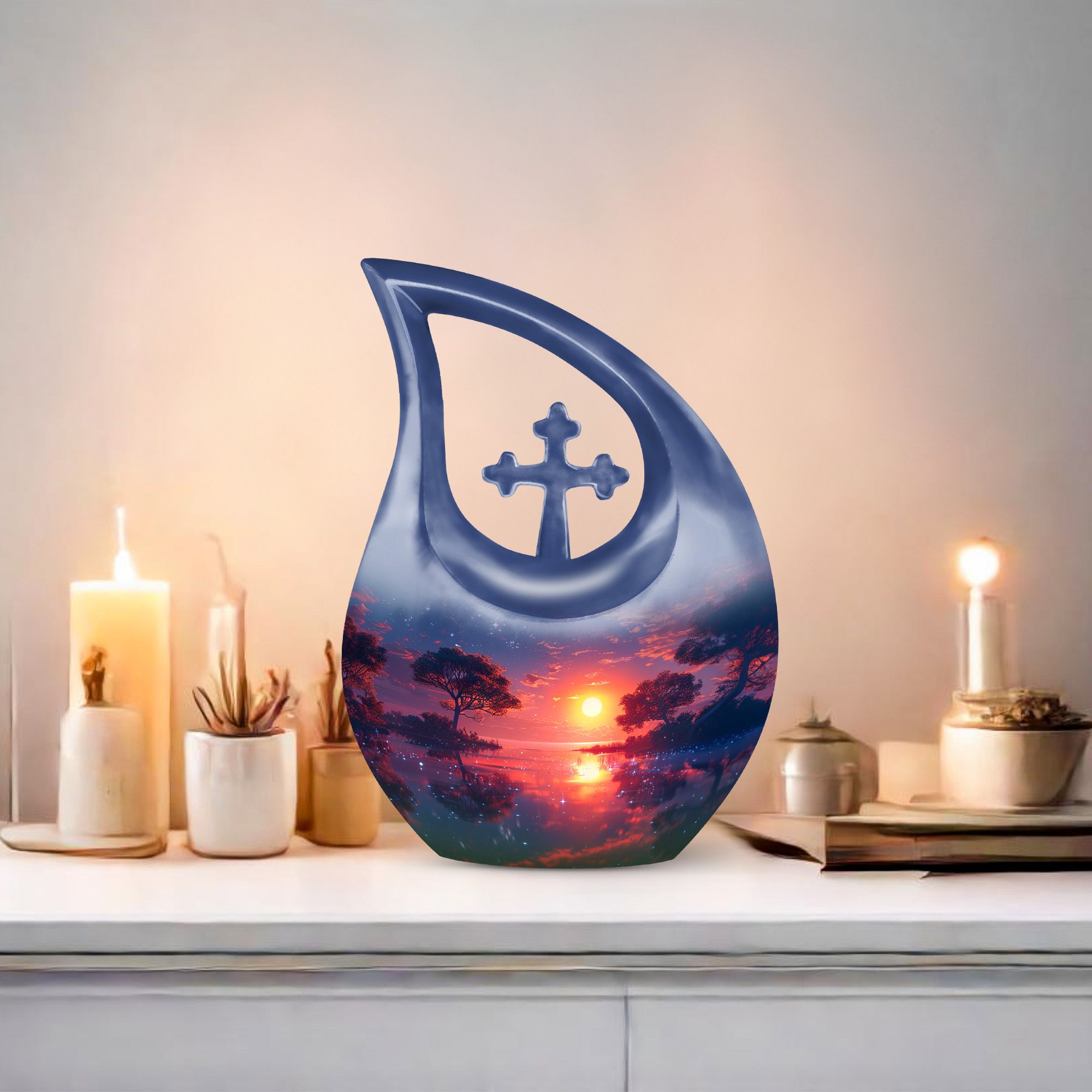 Find solace and tranquility with our Crimson Serenity Urn, a carefully crafted, medium-sized memorial keepsake designed to honour your cherished one. As a perfect accessory for your loved ones' ashes, the urn ensures lasting respect in your home. The sophistication of the cross drop design conveys serenity and integrity in dealing with the memory of a lost loved one. Artfully crafted in sturdy aluminum and standing at 10 inches in height, this crimson urn weighs 3.3 pounds and has a capacity to hold up to 200 cubic inches of ashes. Customize this one-of-a-kind remembrance urn with personalized engraved names, creating a unique tribute for your loved one. In addition, each urn comes with a soft velvet pouch, providing a beautiful enclosure for the containment of ashes. Ideal for adults and seniors, this urn is a fitting choice for a cremation box or companion urn. Embodying the concept of cherished memories, choose our Crimson Serenity Urn as a timeless way to honor your loved one.