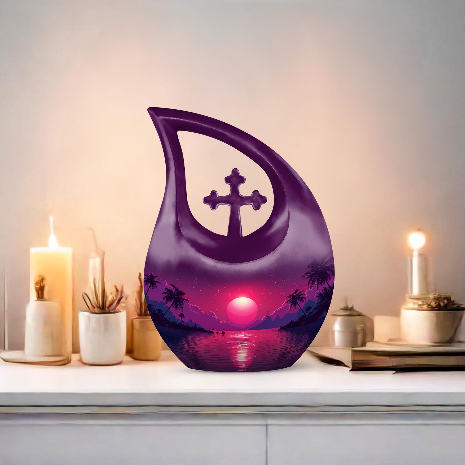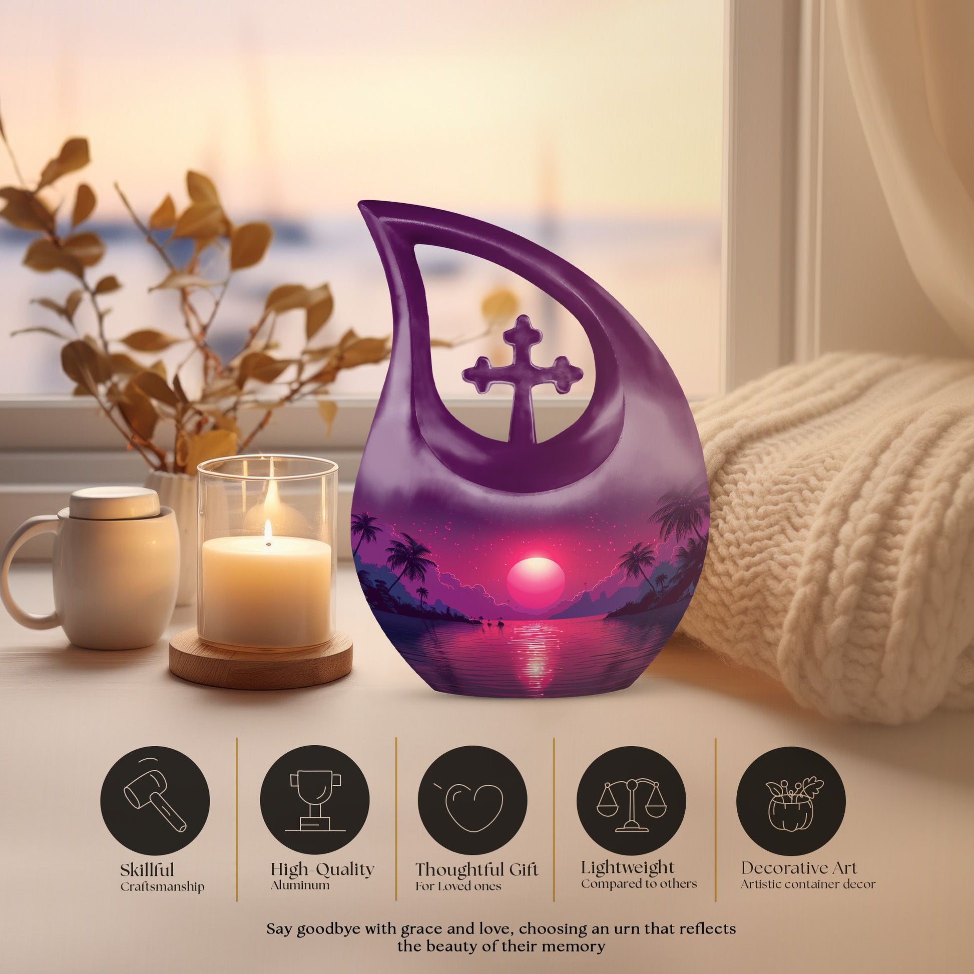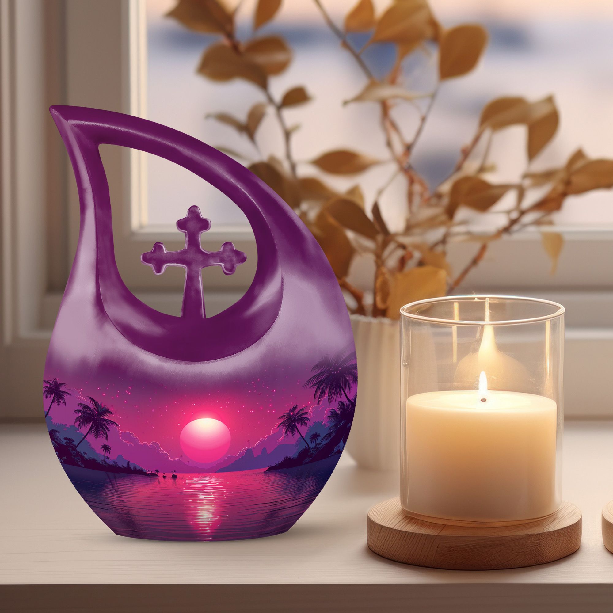 Crafted from premium aluminium, this urn features a radiant purple and crimson gradient accented by gentle beach silhouettes. Its durable construction ensures long-term preservation, while the secure screw-top lid keeps remains safe. Whether chosen as a primary cremation urn human ashes or paired alongside small cremation urns and keepsakes, it brings comfort and beauty to any memorial setting.