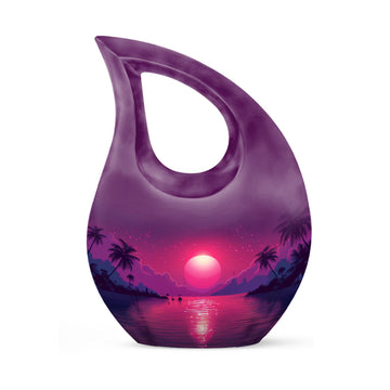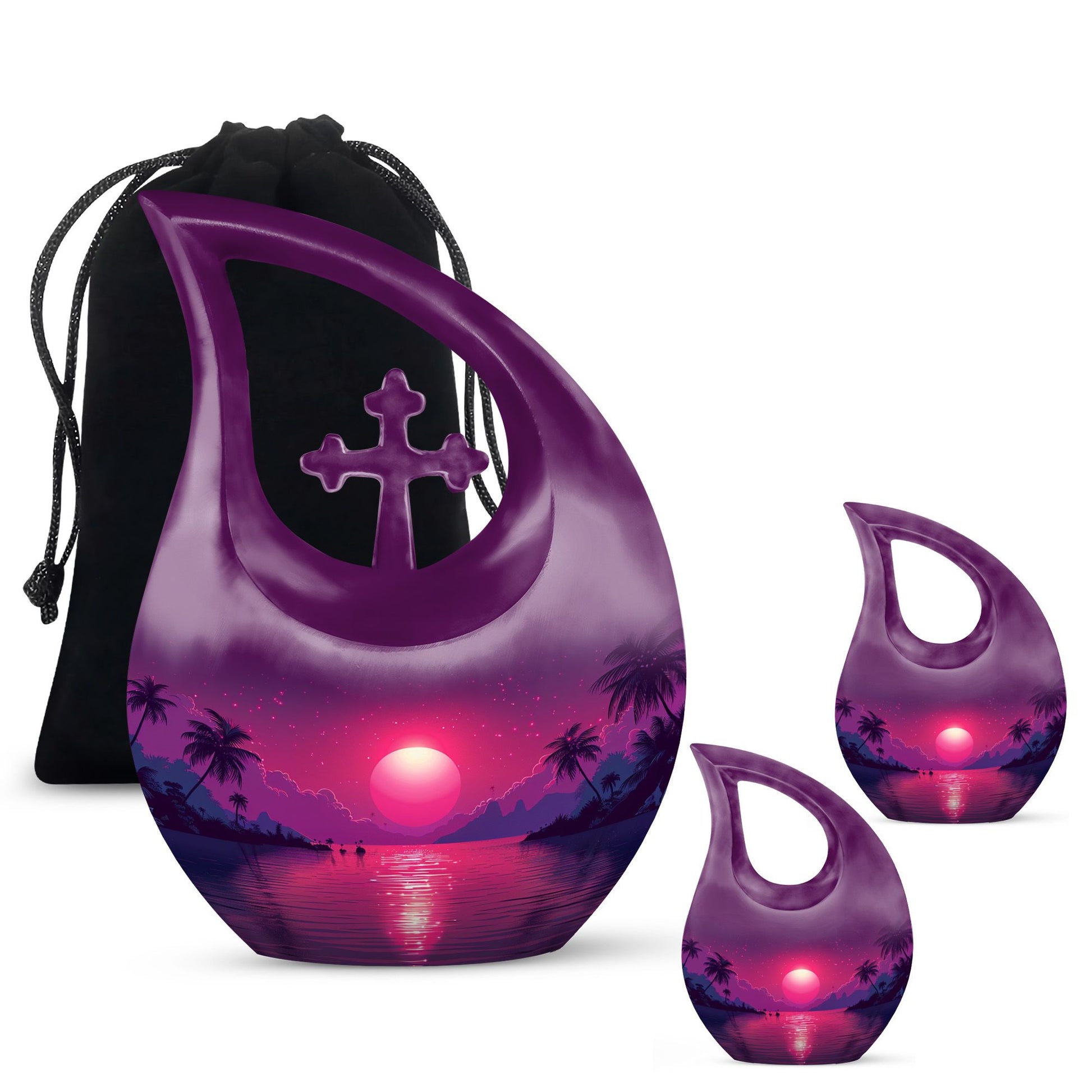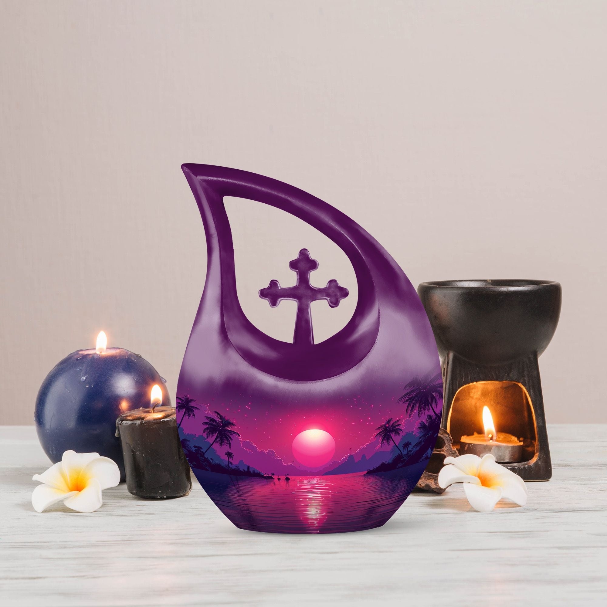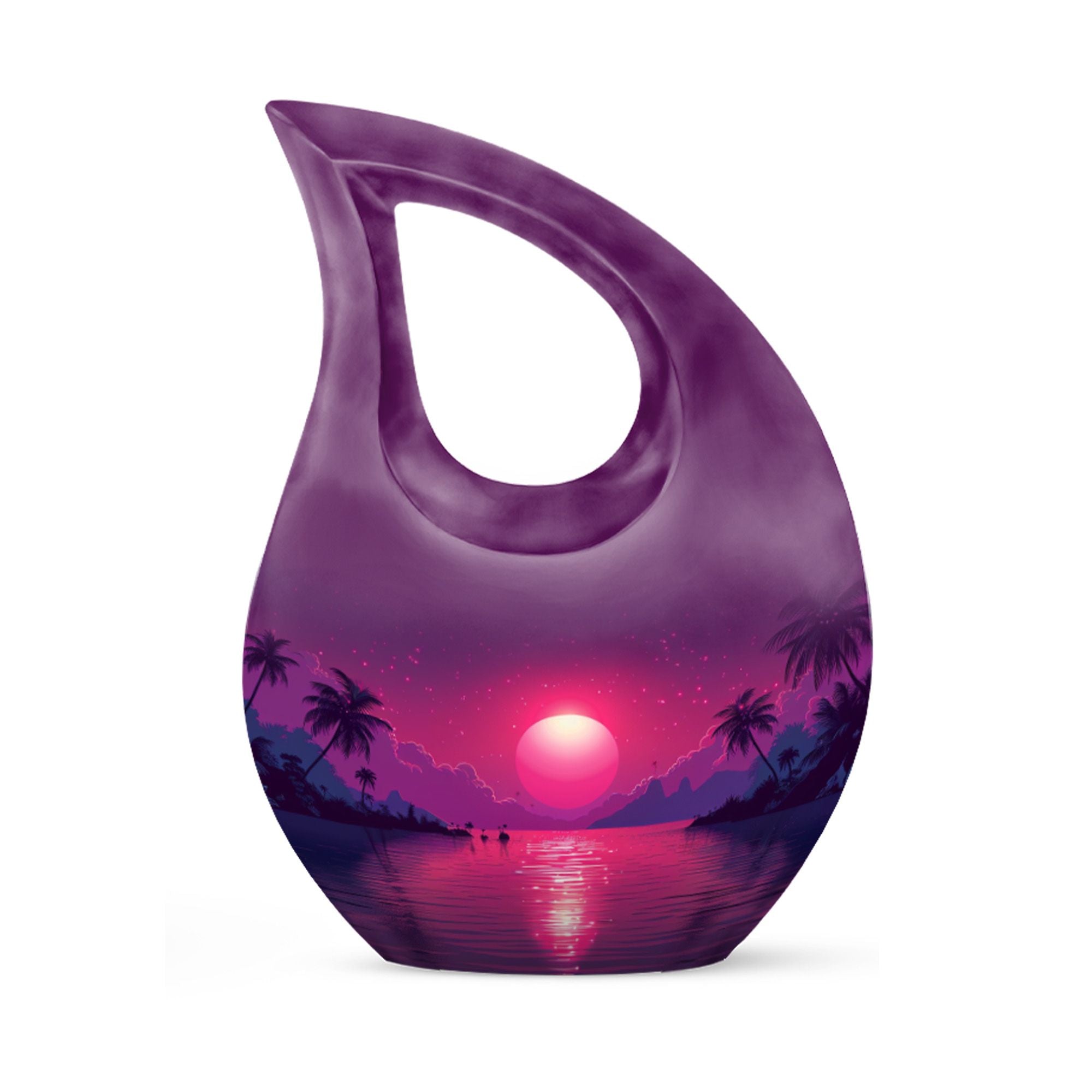 Crafted from premium aluminium, this urn features a radiant purple and crimson gradient accented by gentle beach silhouettes. Its durable construction ensures long-term preservation, while the secure screw-top lid keeps remains safe. Whether chosen as a primary cremation urn human ashes or paired alongside small cremation urns and keepsakes, it brings comfort and beauty to any memorial setting.