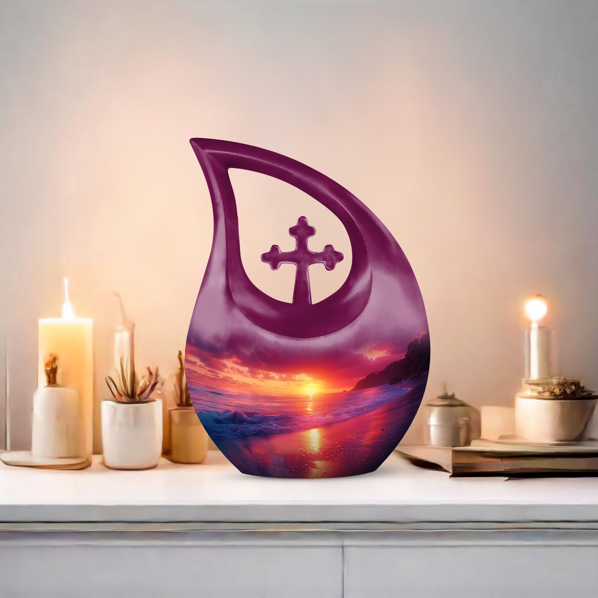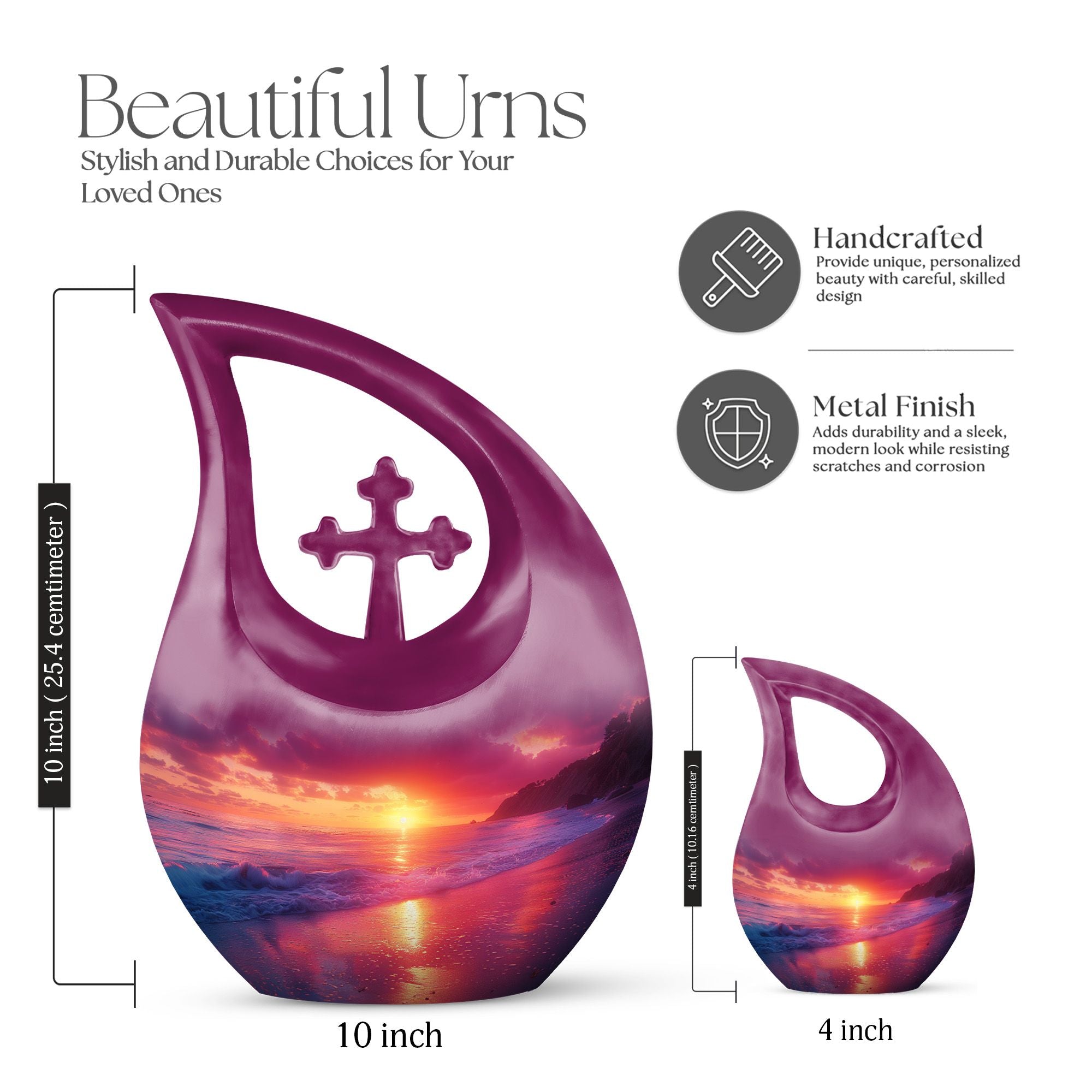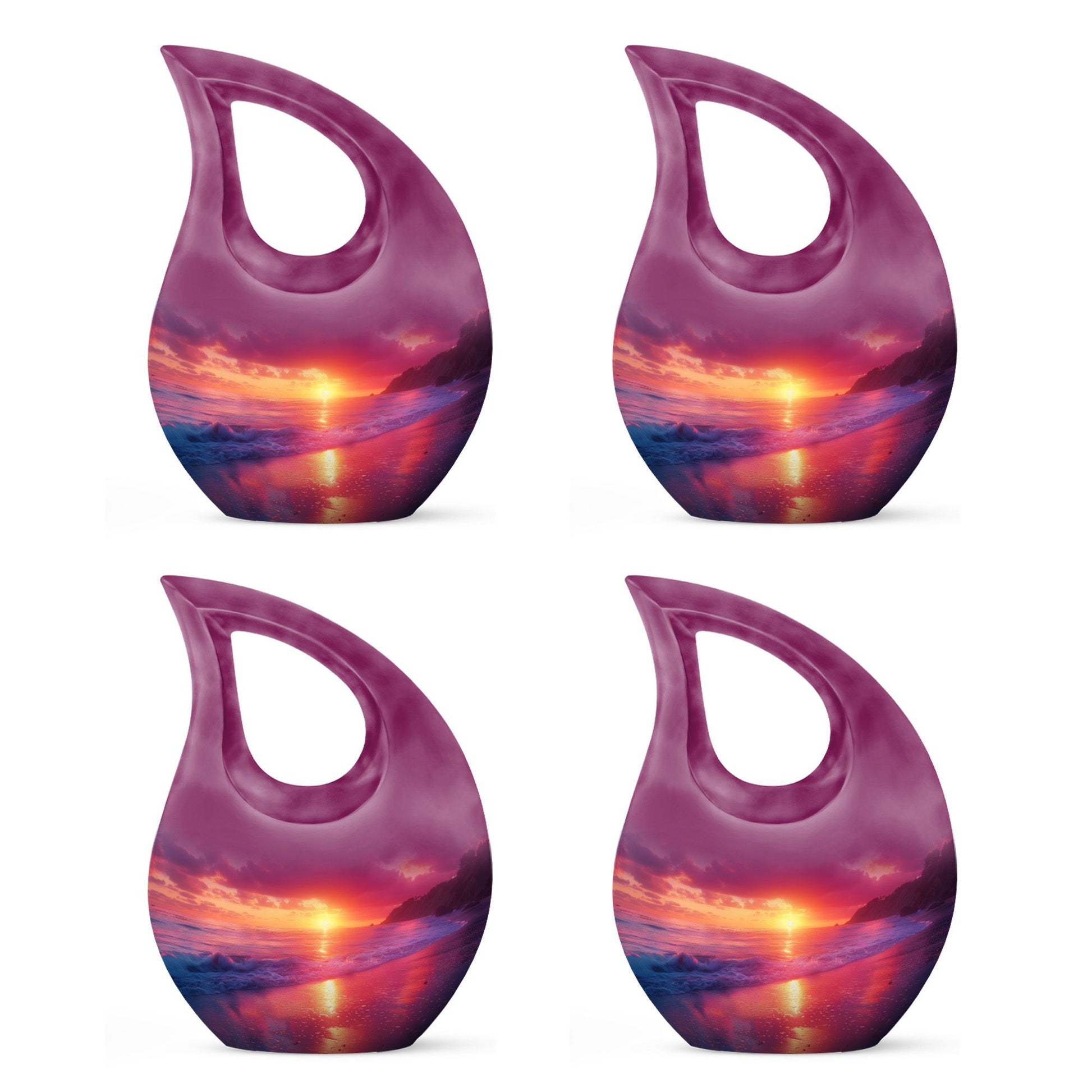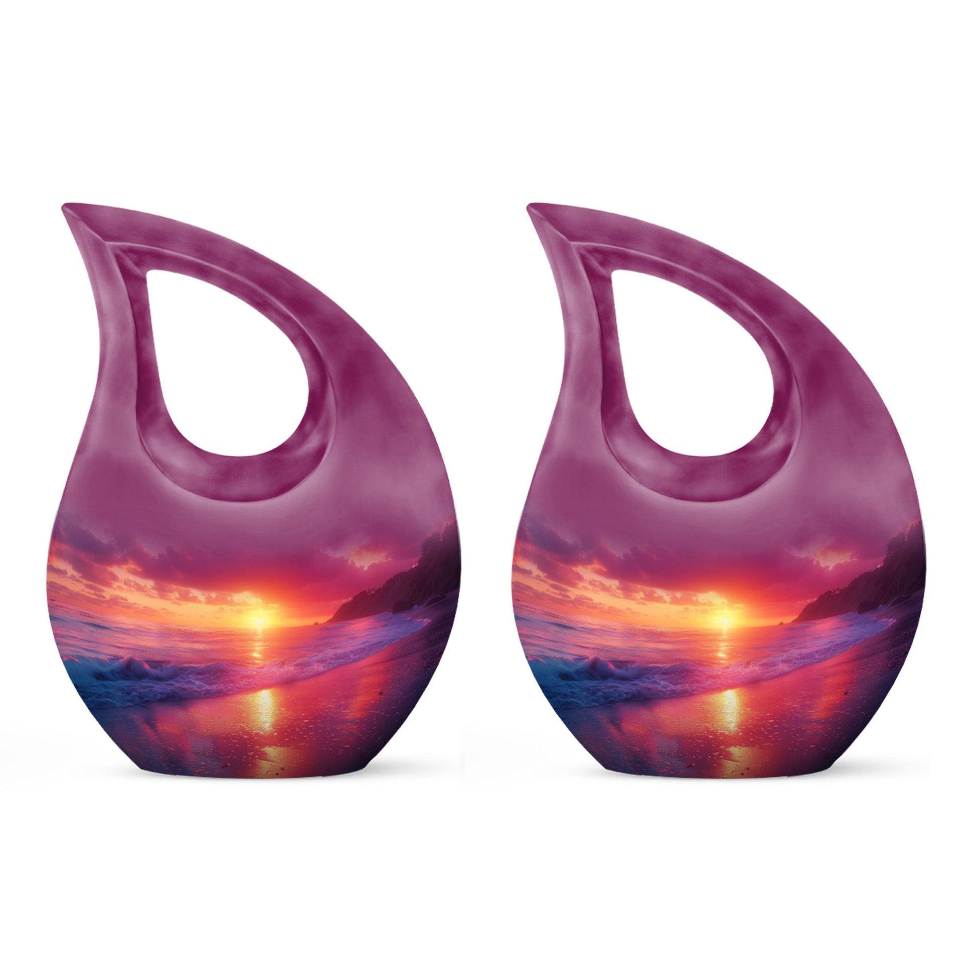 Crafted from durable aluminium, the main adult size cremation urn features a gentle ocean-wave pattern and radiant sunset glow. The coordinating cremation keepsake urns allow families to share ashes or keep a small portion close. A secure screw-top lid ensures safe preservation, while the smooth finish brings elegance to any memorial display. This set is ideal for those seeking urns for cremation ashes, urns for cremation, or beautifully crafted cremation urns for ashes.