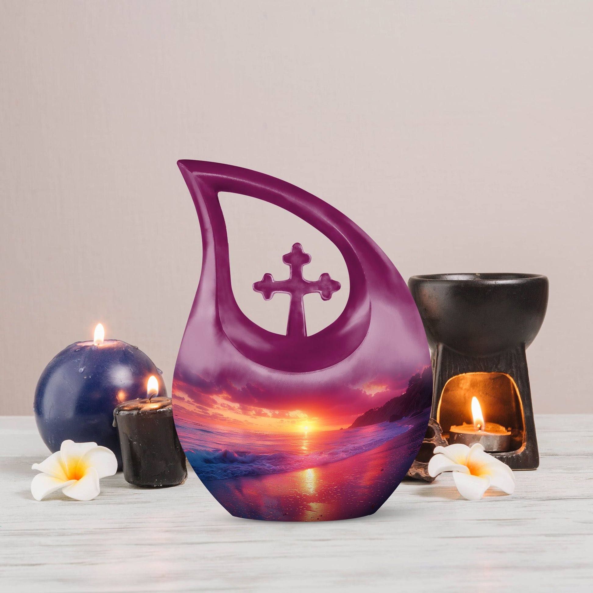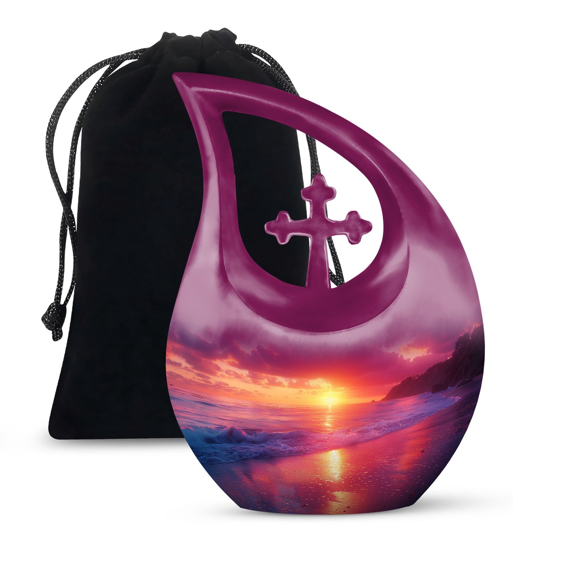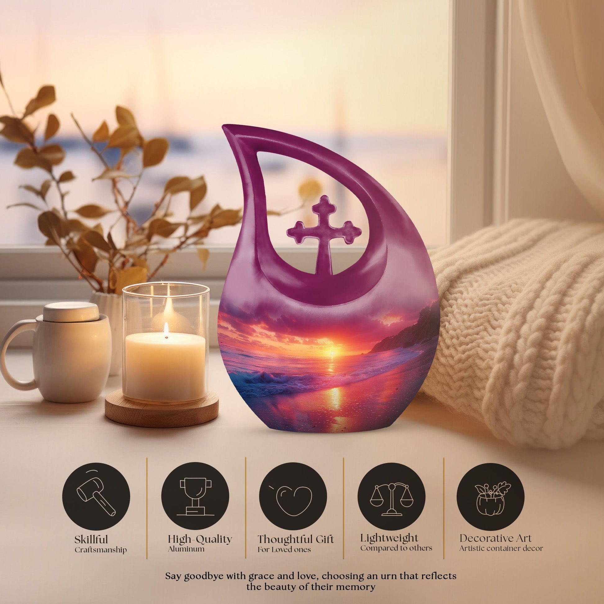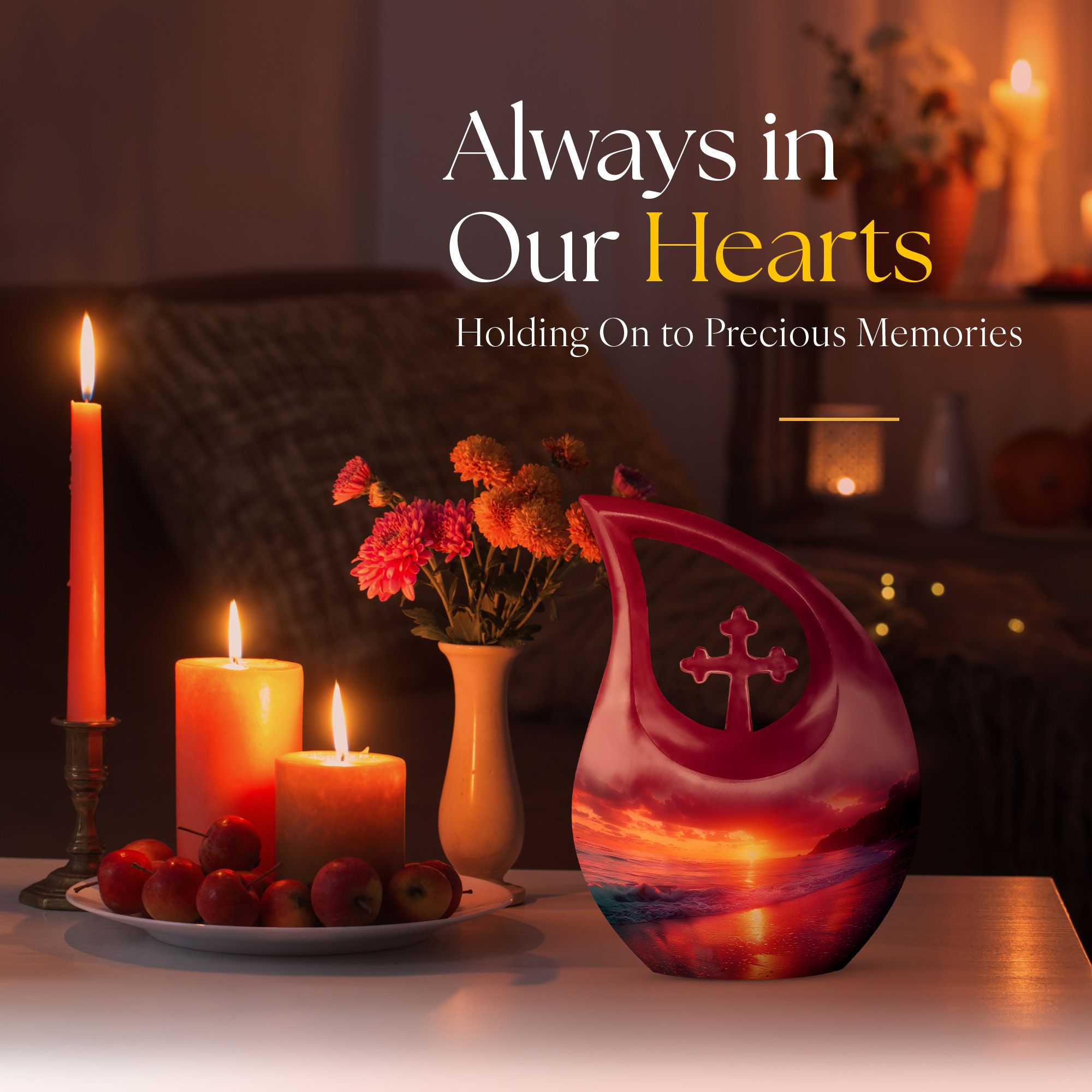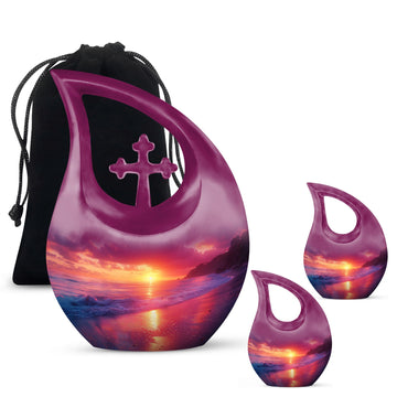 Crafted from durable aluminium, the main adult size cremation urn features a gentle ocean-wave pattern and radiant sunset glow. The coordinating cremation keepsake urns allow families to share ashes or keep a small portion close. A secure screw-top lid ensures safe preservation, while the smooth finish brings elegance to any memorial display. This set is ideal for those seeking urns for cremation ashes, urns for cremation, or beautifully crafted cremation urns for ashes.