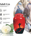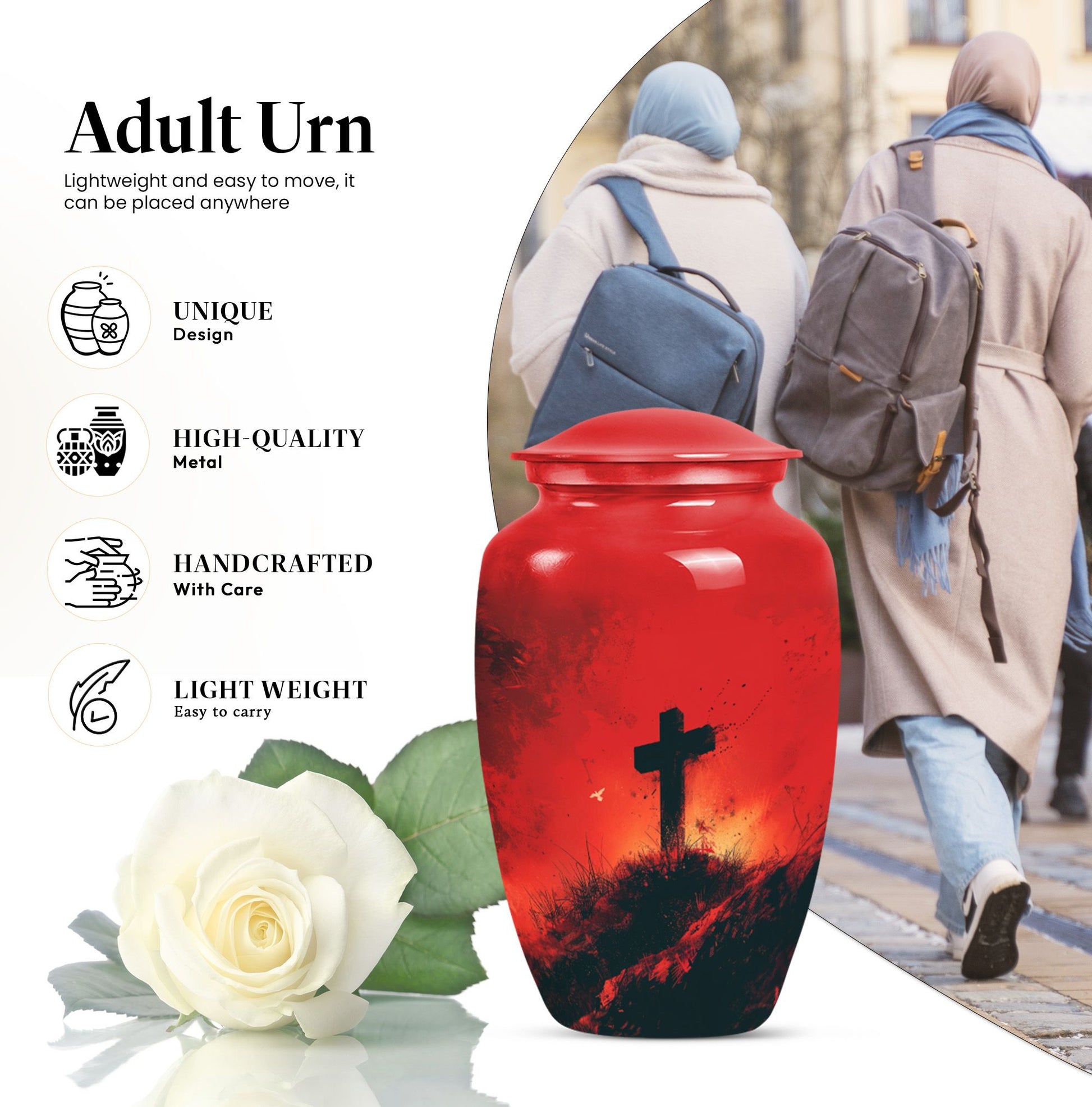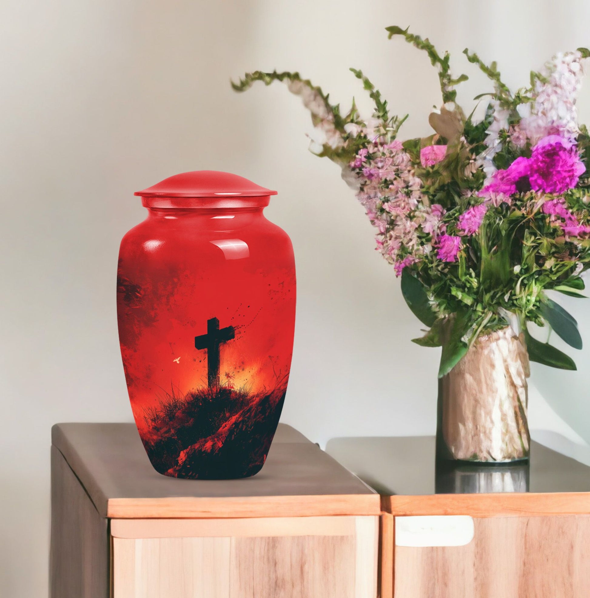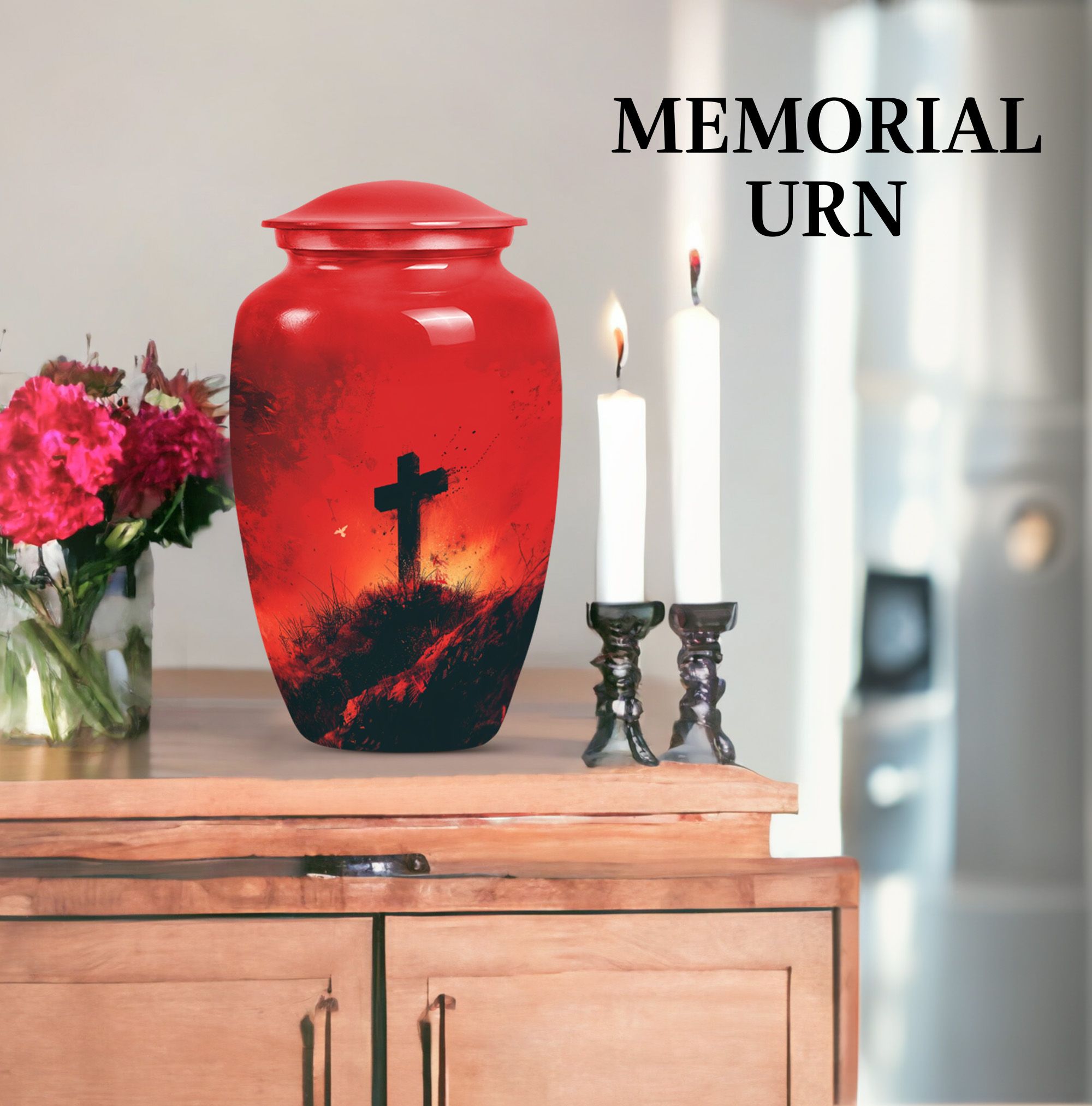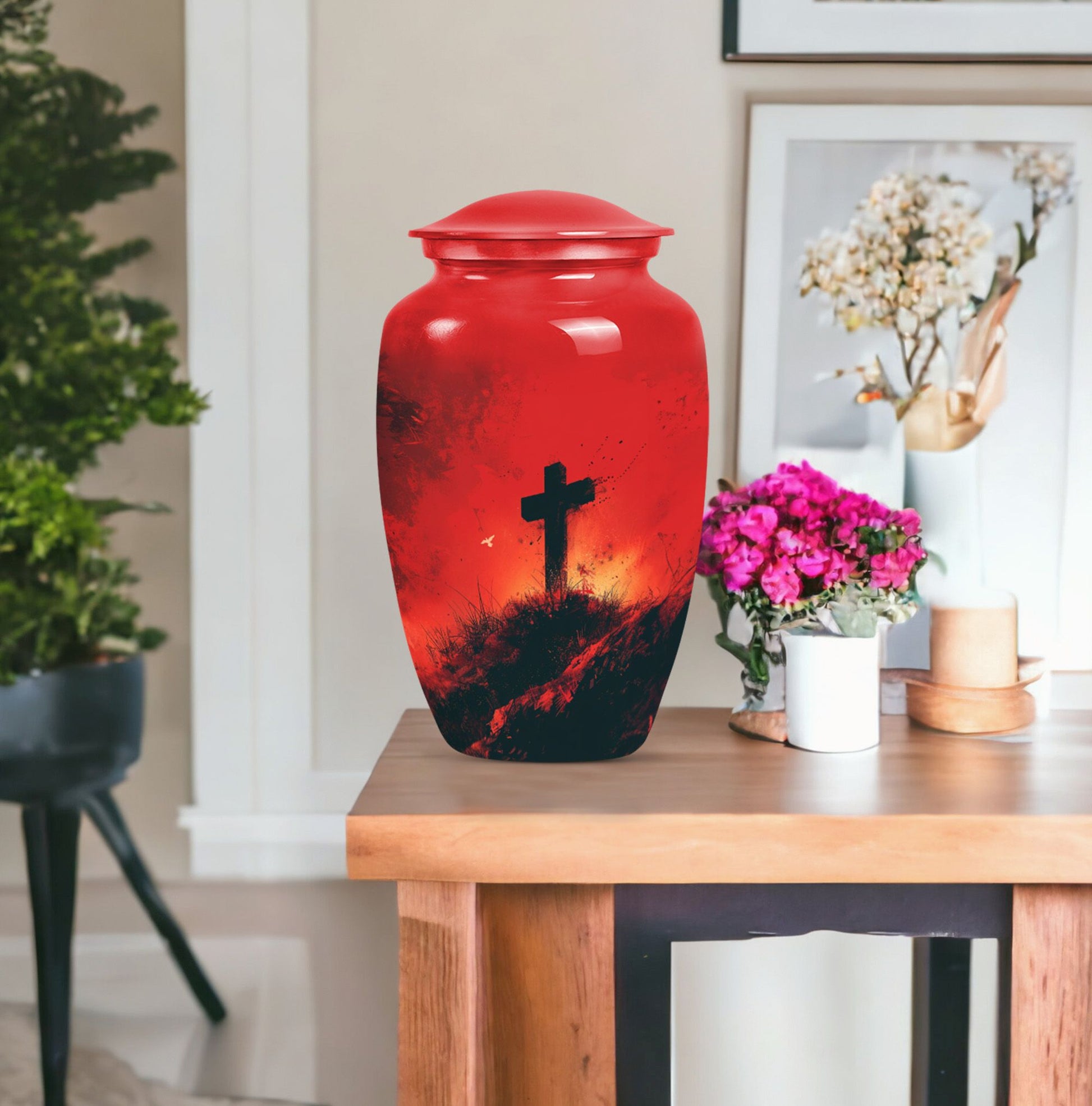 Introducing our 'Cross Urn,' a 10-inch, large aluminium urn crafted for those seeking a burial custom urn or a cremation urn. The urn possesses an impressive space capacity of 200 cubic inches and weighs just 3.3 pounds, showcasing remarkable craftsmanship that locks the ashes securely. The Aurora Borealis theme brings a sense of peace, comfort, and beauty to this fascinating urn. To make it more personal, you can further engrave names or memorable messages. This cremation dad urn or urn for human ash women can become a special, honored space in your home. You'll also find a velvet pouch within the package, where one can keep the cherished ashes of your loved ones. A tastefully aesthetic and profoundly meaningful urn for human ashes adult that embodies love, respect, and memory. Perfect for memorial ceremonies, symbolizing eternal peace and tranquillity for departed souls.