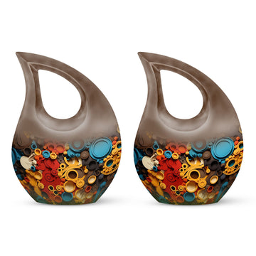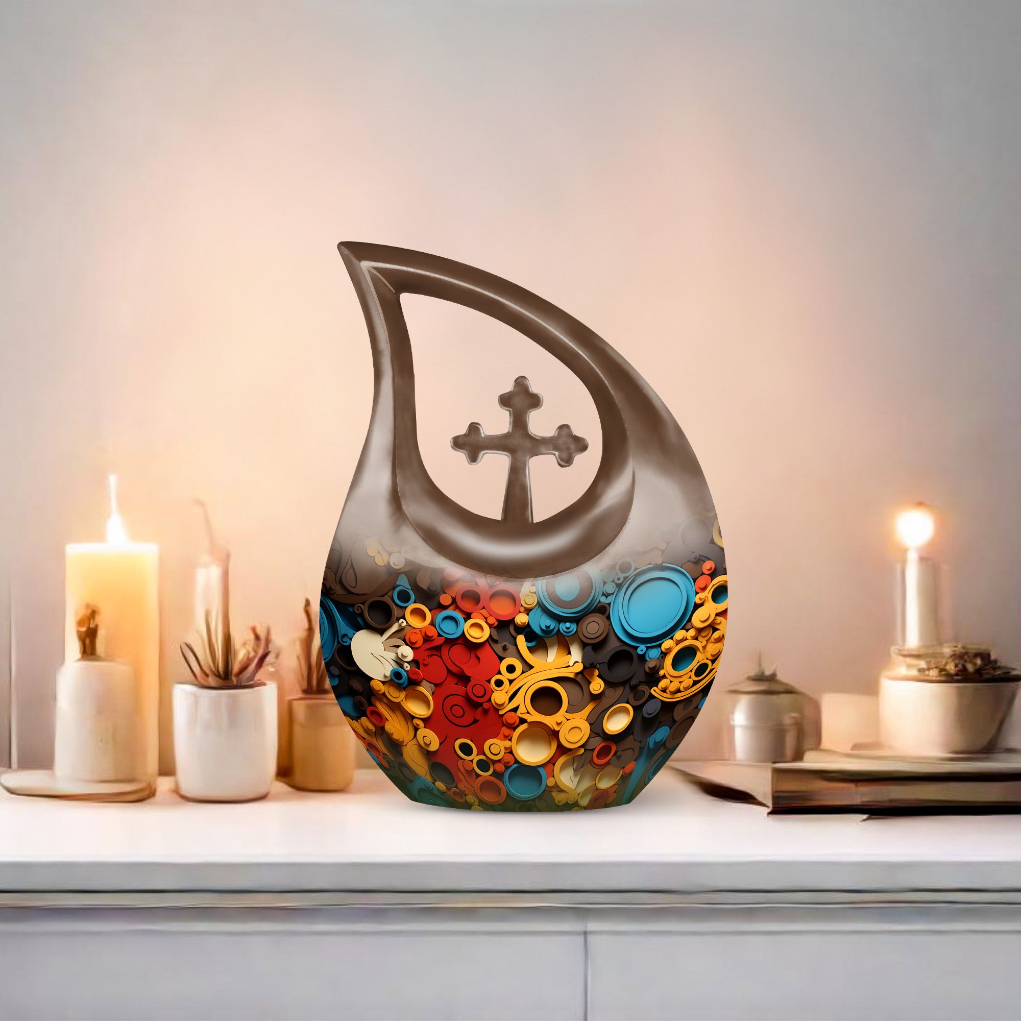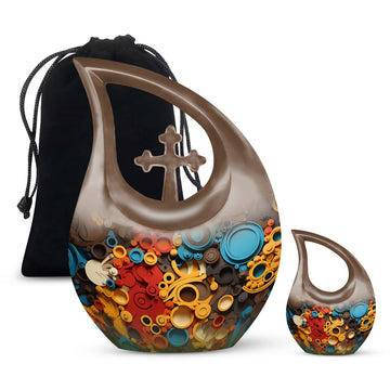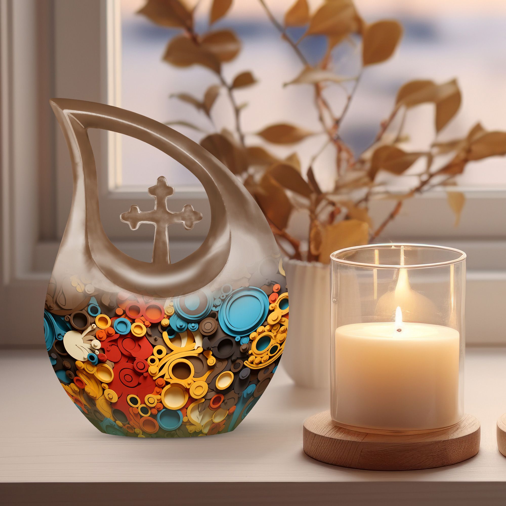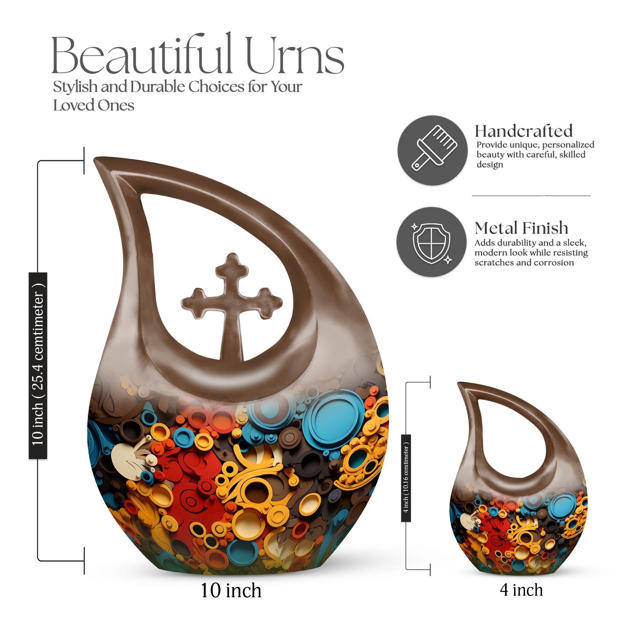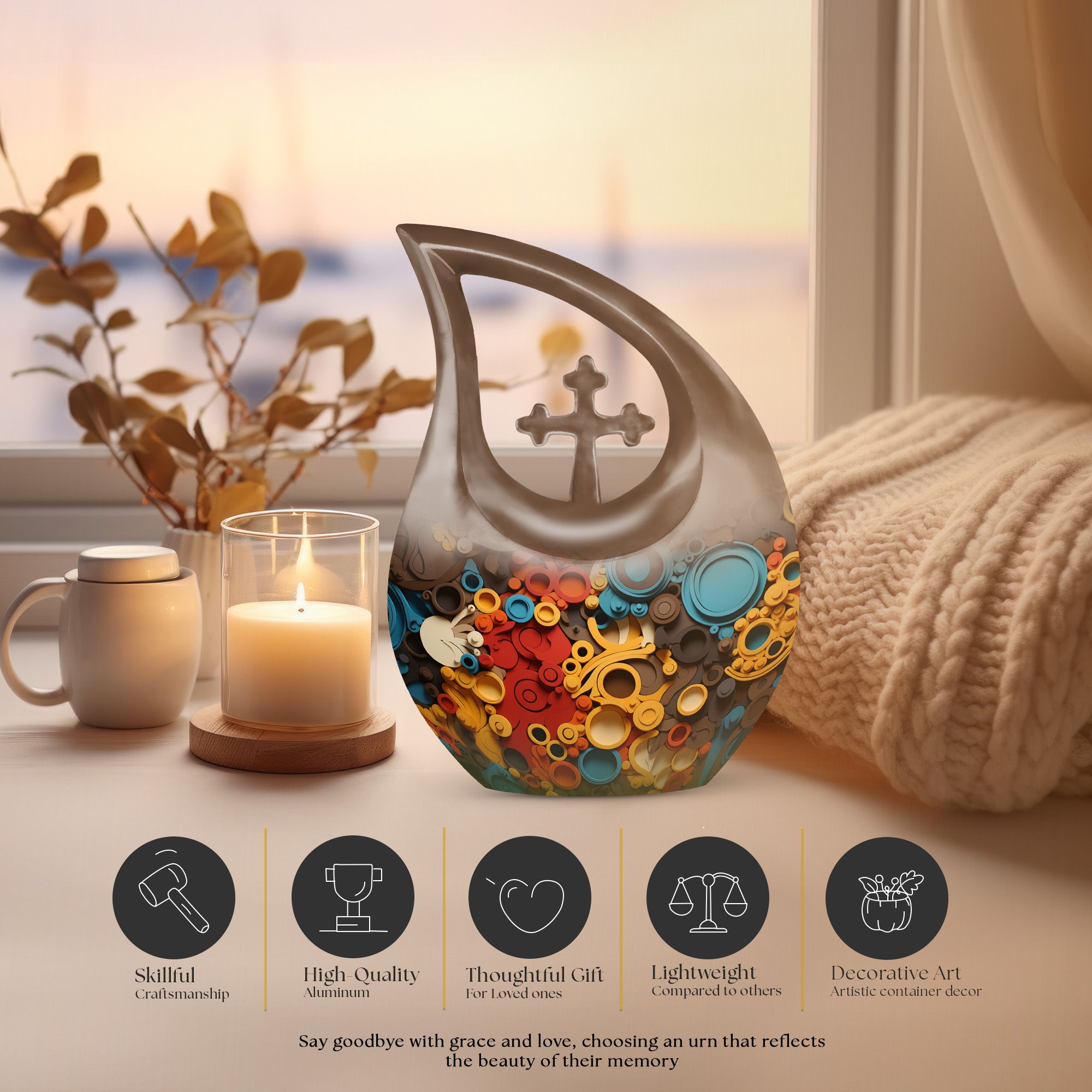 Immerse yourself in the calm and healing essence of the 'Abstract Orbits Mosaic Urn', a work of art celebrating the eternal cycle of life and death. The 10-inch size and roomy 200 cubic inch capacity of this urn offers you the space to preserve the cherished memories of your departed loved one. Weighing 3.3 pounds and etched with a unique 'Cross Drop' pattern, this aluminium custom urn delivers a strong and sturdy rest place for human ashes. The customized engraving feature allows you to personalize the urn with names, ensuring a unique connection with the dearly departed. The urn is delivered with an opulent velvet pouch, meant for safe containment of ashes. This large-sized urn, part of our extensive collection of cremation urns for human ashes, embodies an error-proof biodegradable box for ashes. Sublime and serene, this urn is more than a memorial symbol; it's a reflection of your love and remembrance.