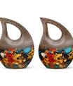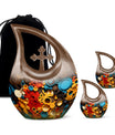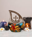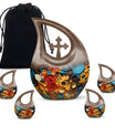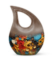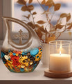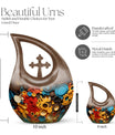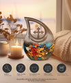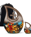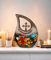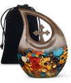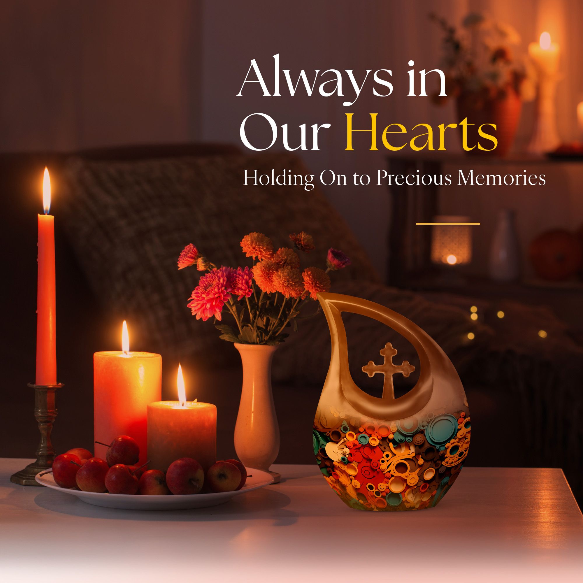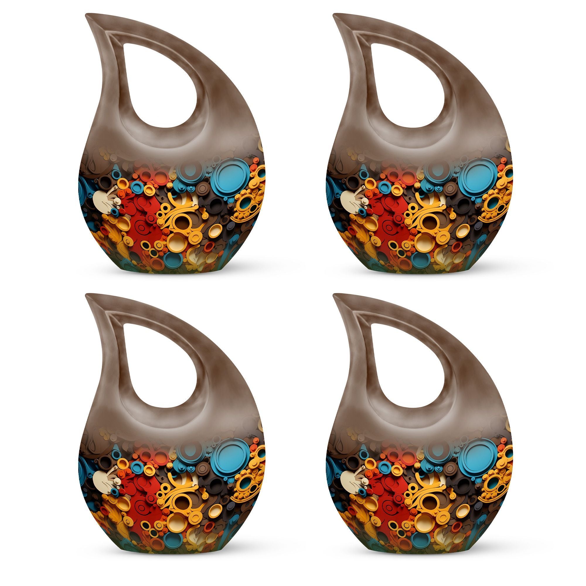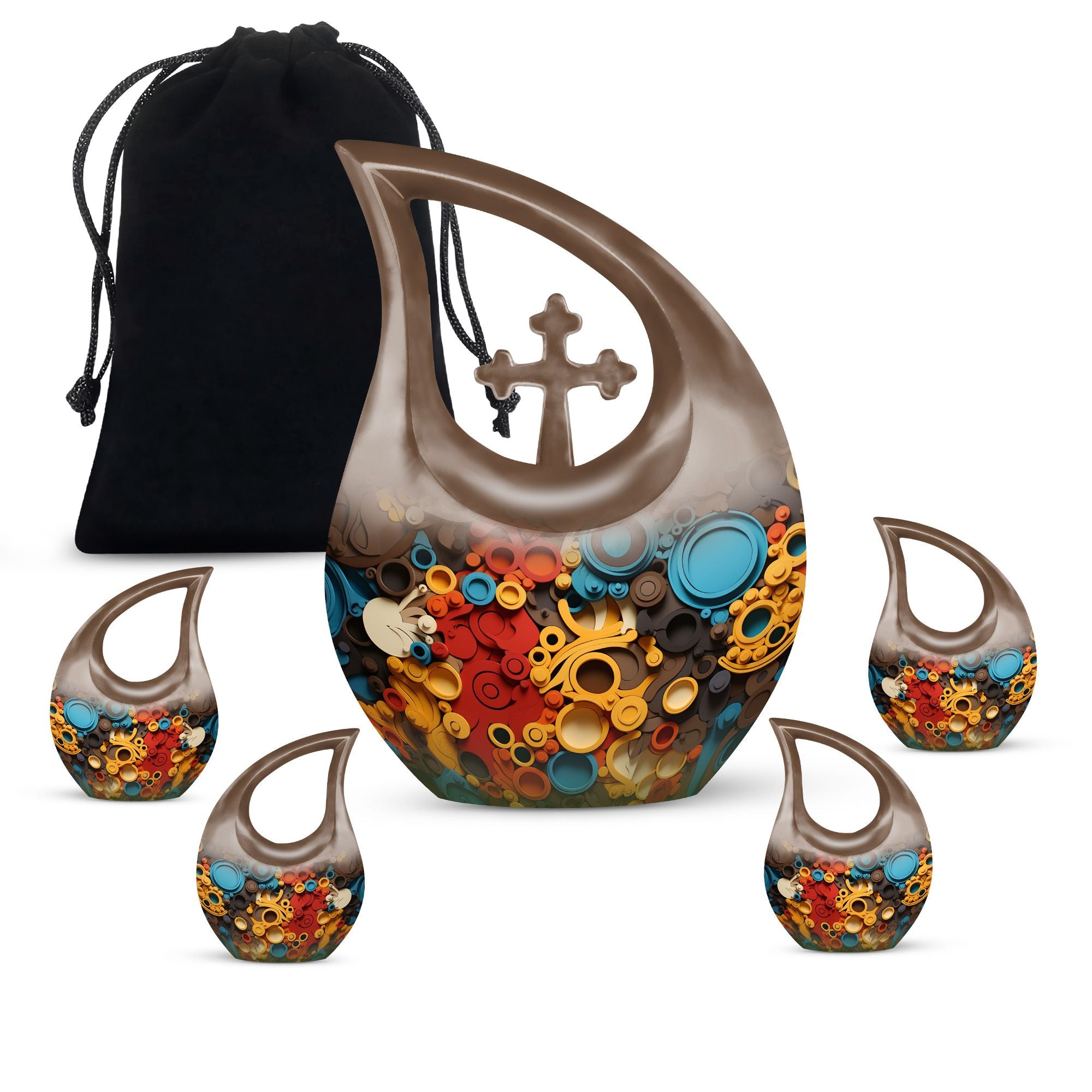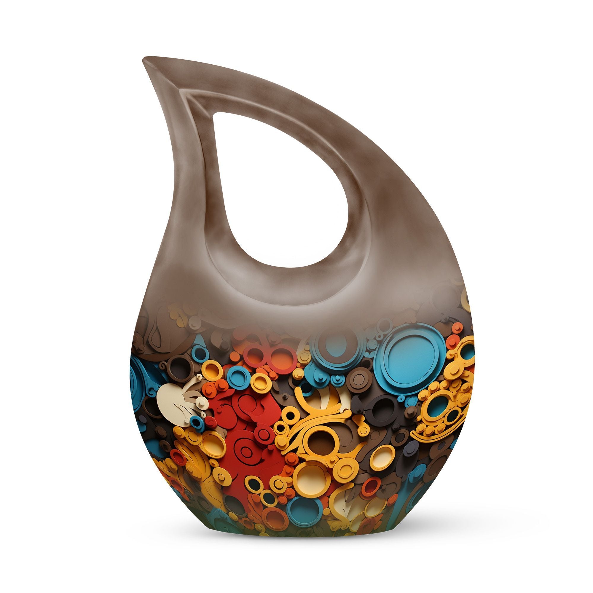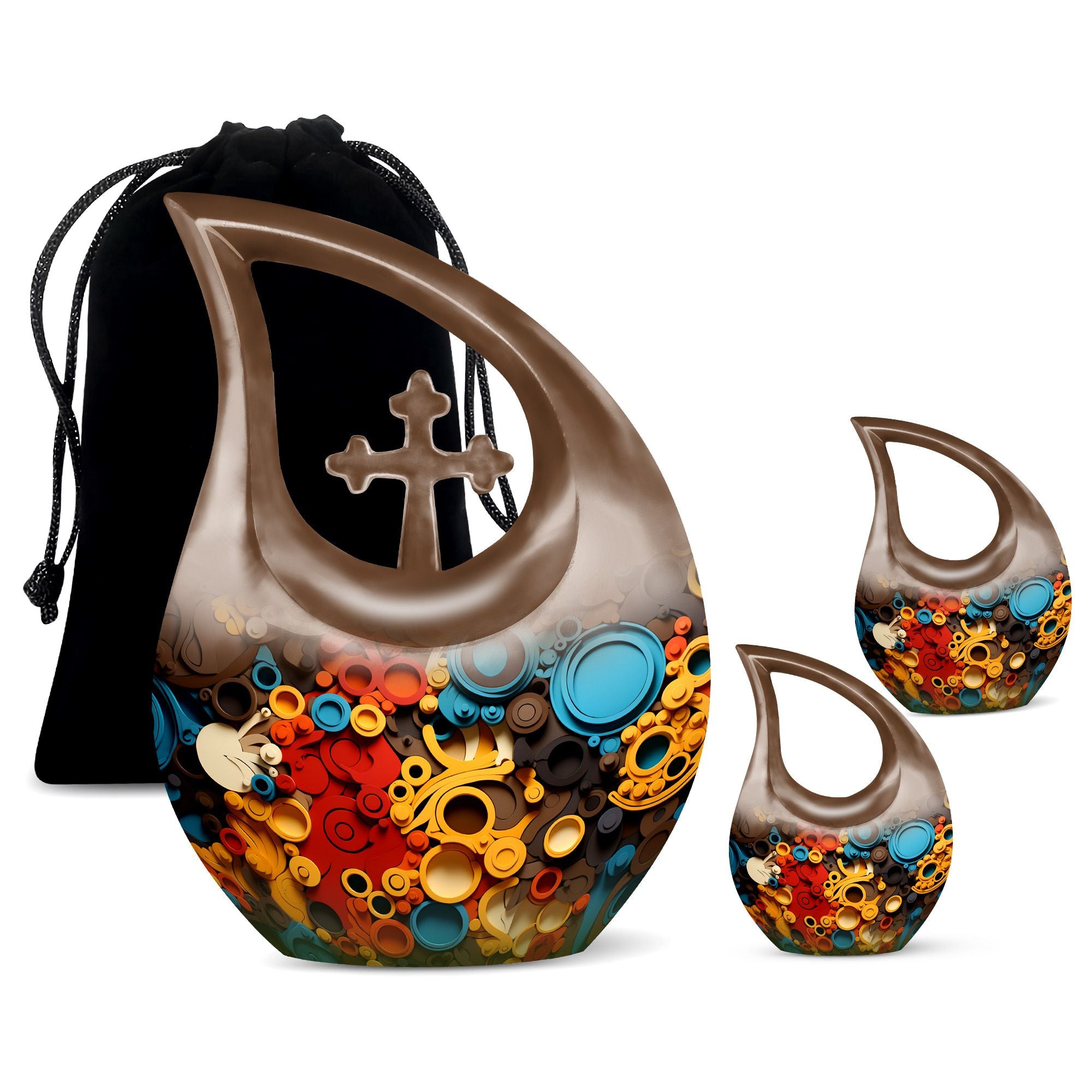 Immerse yourself in the calm and healing essence of the 'Abstract Orbits Mosaic Urn', a work of art celebrating the eternal cycle of life and death. The 10-inch size and roomy 200 cubic inch capacity of this urn offers you the space to preserve the cherished memories of your departed loved one. Weighing 3.3 pounds and etched with a unique 'Cross Drop' pattern, this aluminium custom urn delivers a strong and sturdy rest place for human ashes. The customized engraving feature allows you to personalize the urn with names, ensuring a unique connection with the dearly departed. The urn is delivered with an opulent velvet pouch, meant for safe containment of ashes. This large-sized urn, part of our extensive collection of cremation urns for human ashes, embodies an error-proof biodegradable box for ashes. Sublime and serene, this urn is more than a memorial symbol; it's a reflection of your love and remembrance.