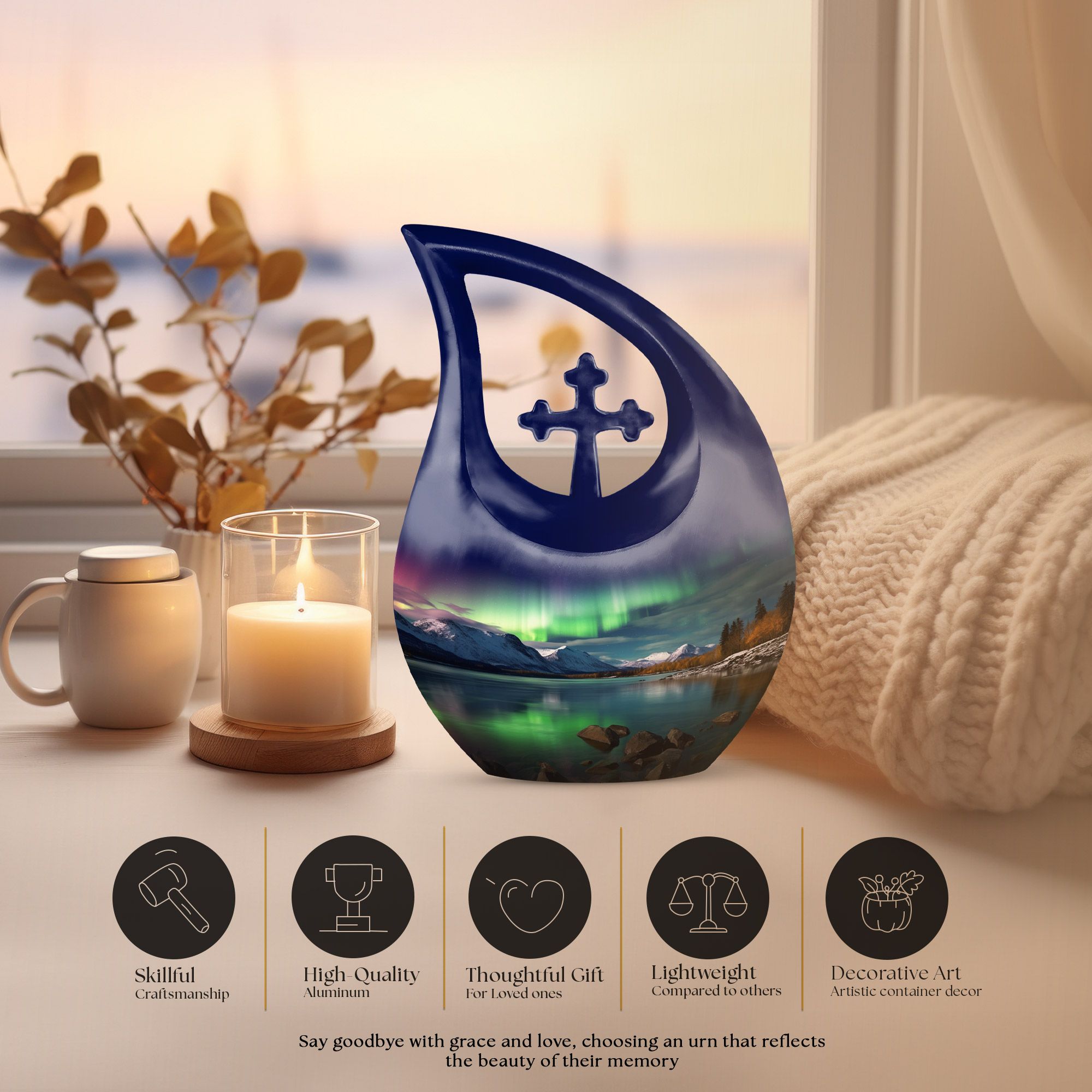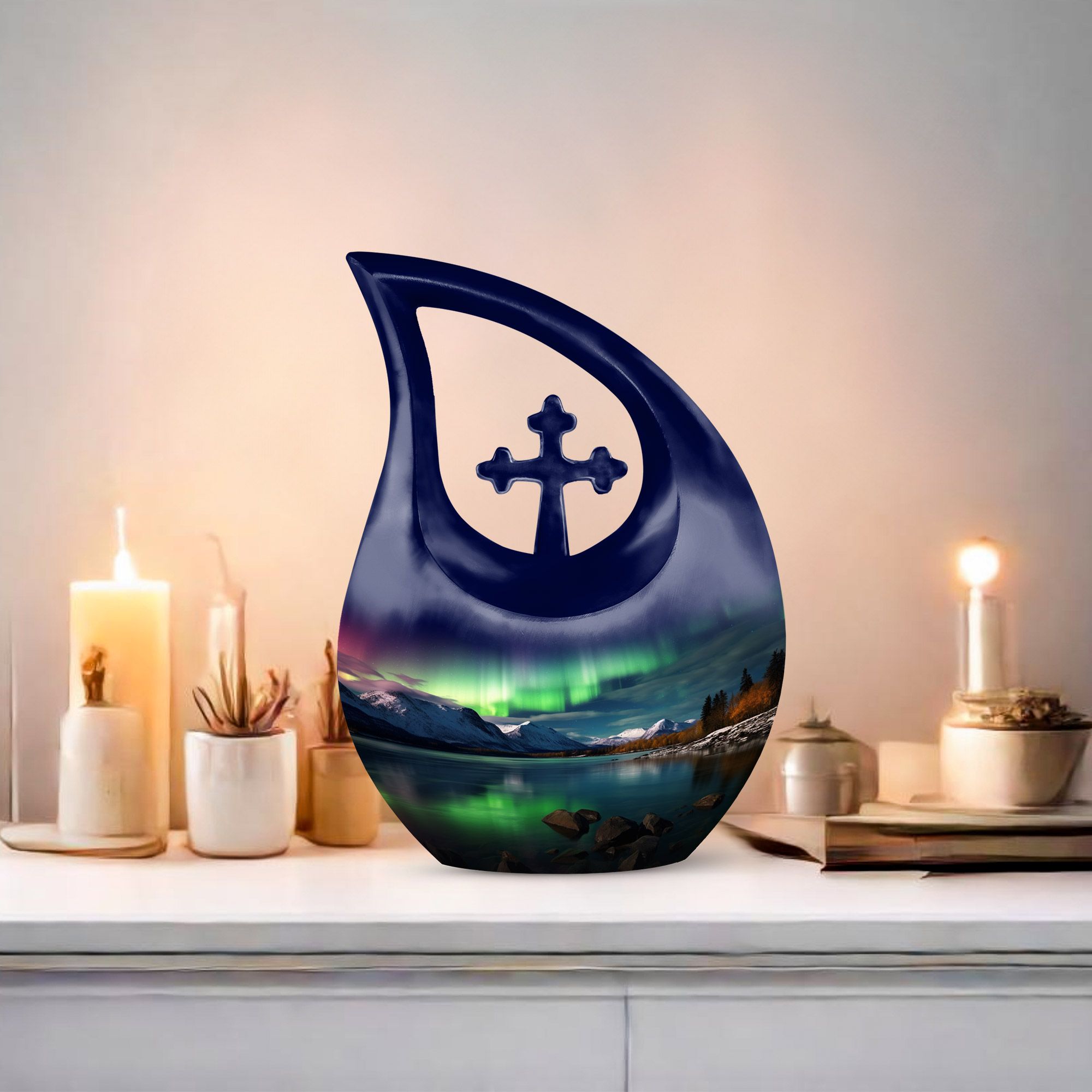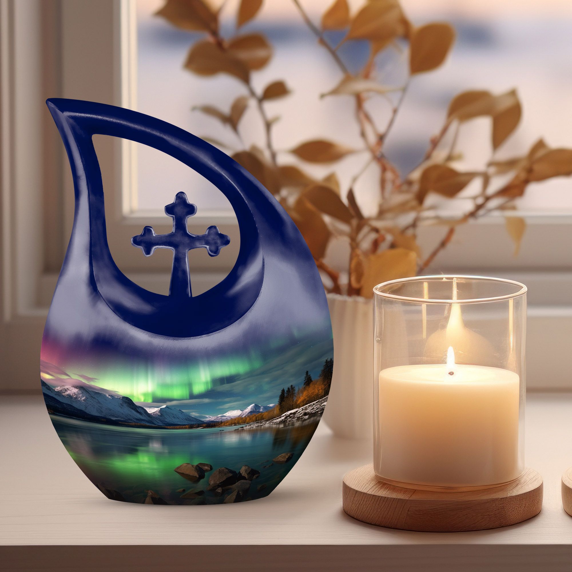The Vivid Northern Lights Cremation Urn for Human Ashes is a breathtaking tribute to a life that continues to shine brightly, even beyond the horizon. Inspired by the stunning colors of the aurora, this urn radiates serenity, hope, and eternal love. Whether chosen as a large urn for ashes for women or a large urn for ashes adult male, it serves as a timeless reminder that love endures through every spectrum of light.