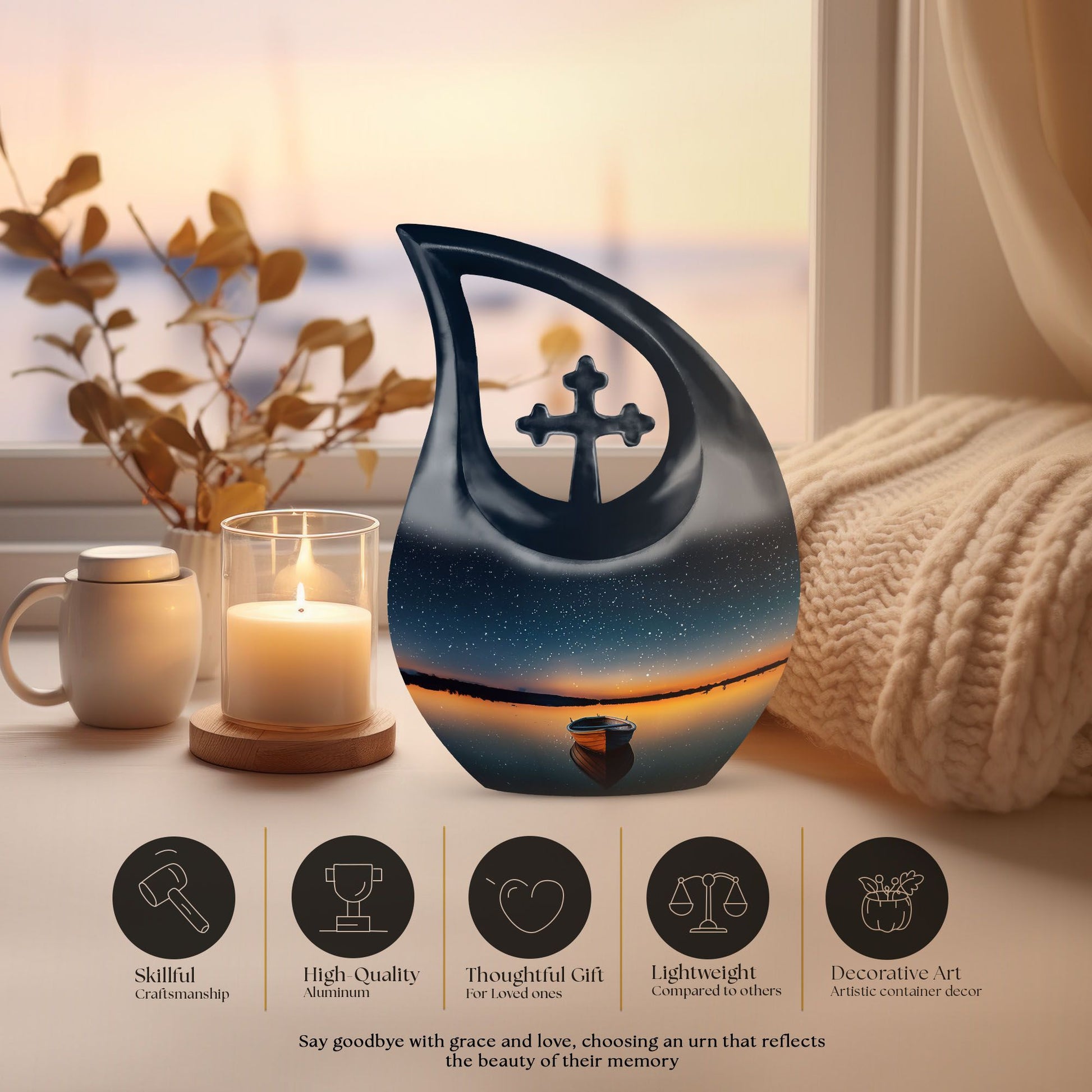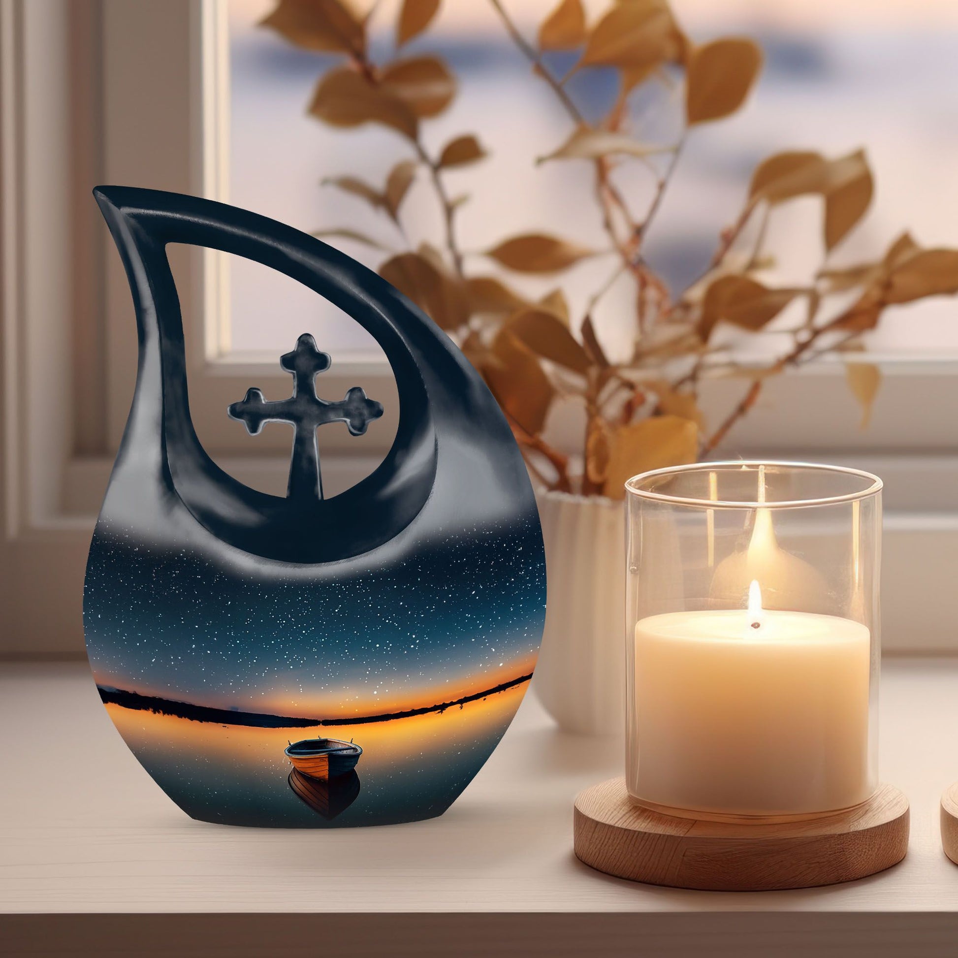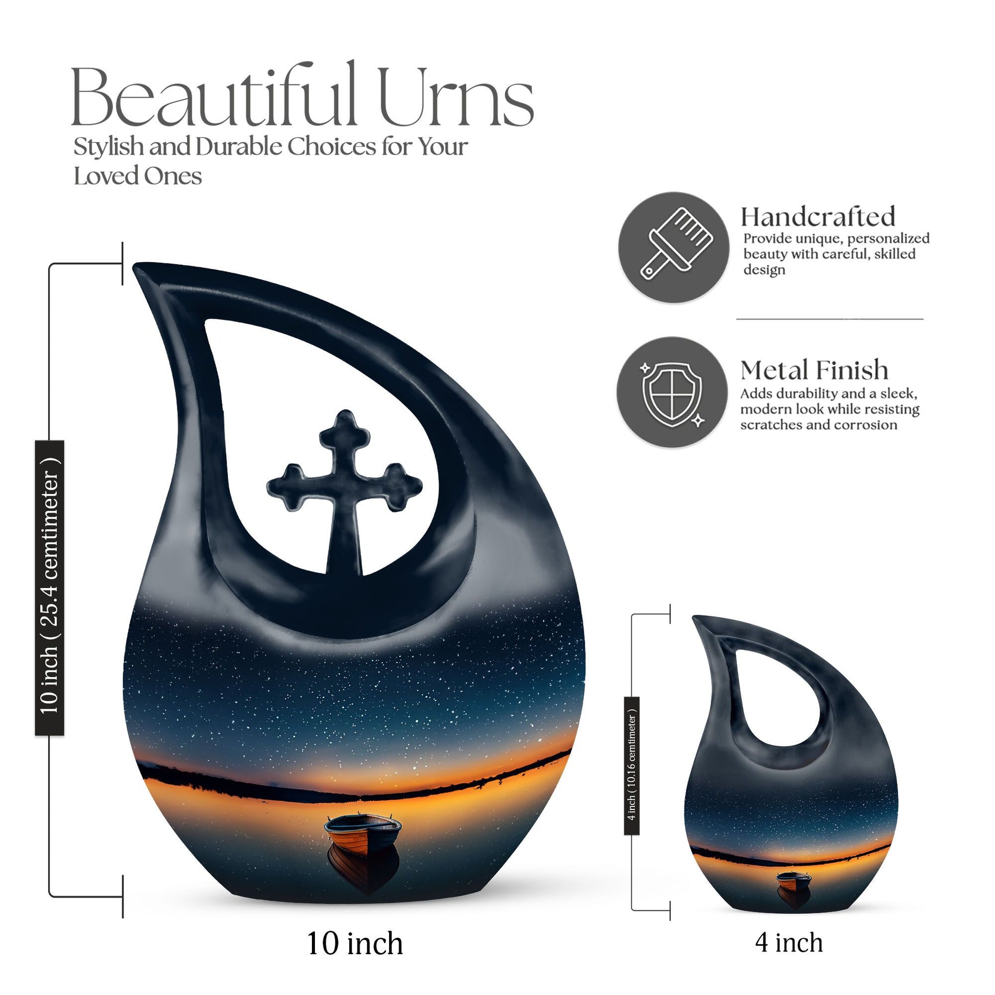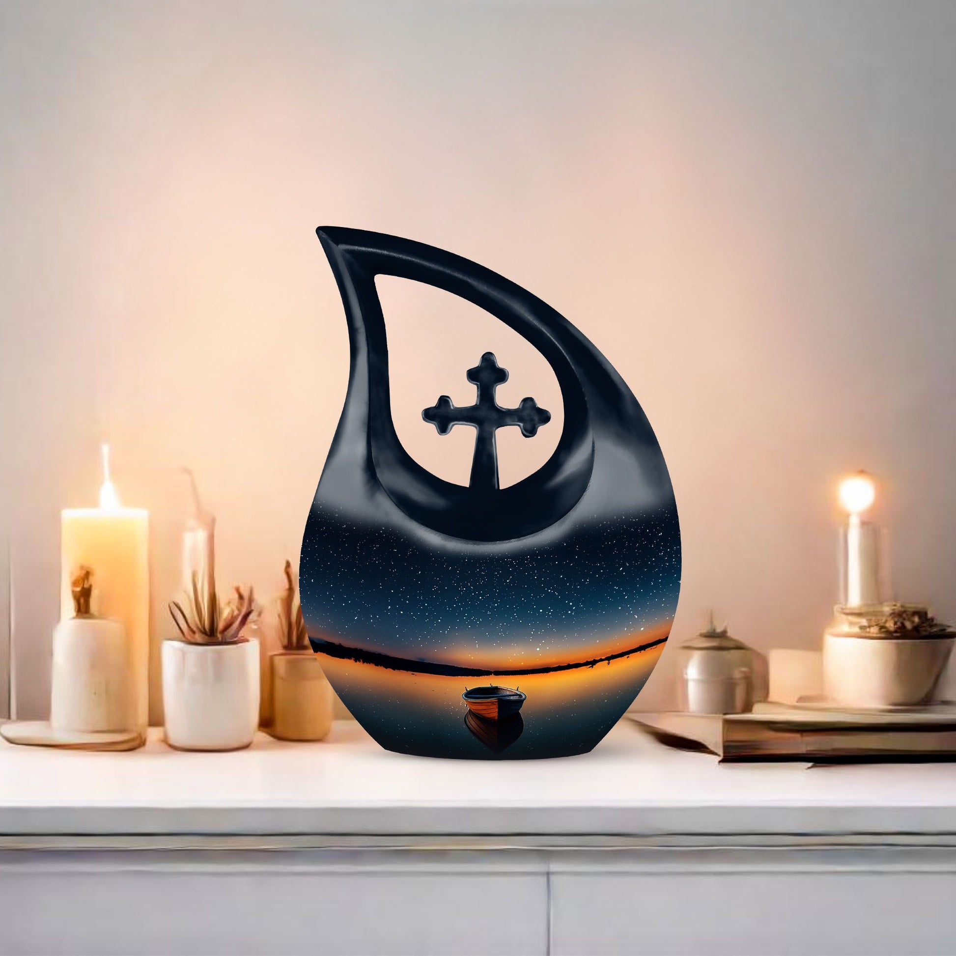 An honor fitting for a treasured loved one, our Boat Urn is a dignified and unique resting place. Crafted from robust aluminium, this piece bears the heartwarming theme of a boat, subtly infusing the symbol of journeying into the eternal serenity. With an imposing height of 10 inches, it's large enough to contain 200 cubic inches of ash, making it a perfect choice among the 'Large Urns' category. For added convenience, the package includes a velvet pouch for the containment of ashes. The Customized Urns For Ashes For Adults weighs only 3.3 pounds, enabling easy positioning or transporting. Increasing the urn's sentimental value, we offer an opportunity to personalize with engraved names. A blend of artistry and function, this Cross Drop Boat Urn encapsulates the spirit of memorial urns authentically and distinctively. It's not just an urn, but a cherished Cremation Monument for your loved one. Pay homage to the departed with our uniquely designed urns, a serene beacon of countless memories and heartfelt feelings.